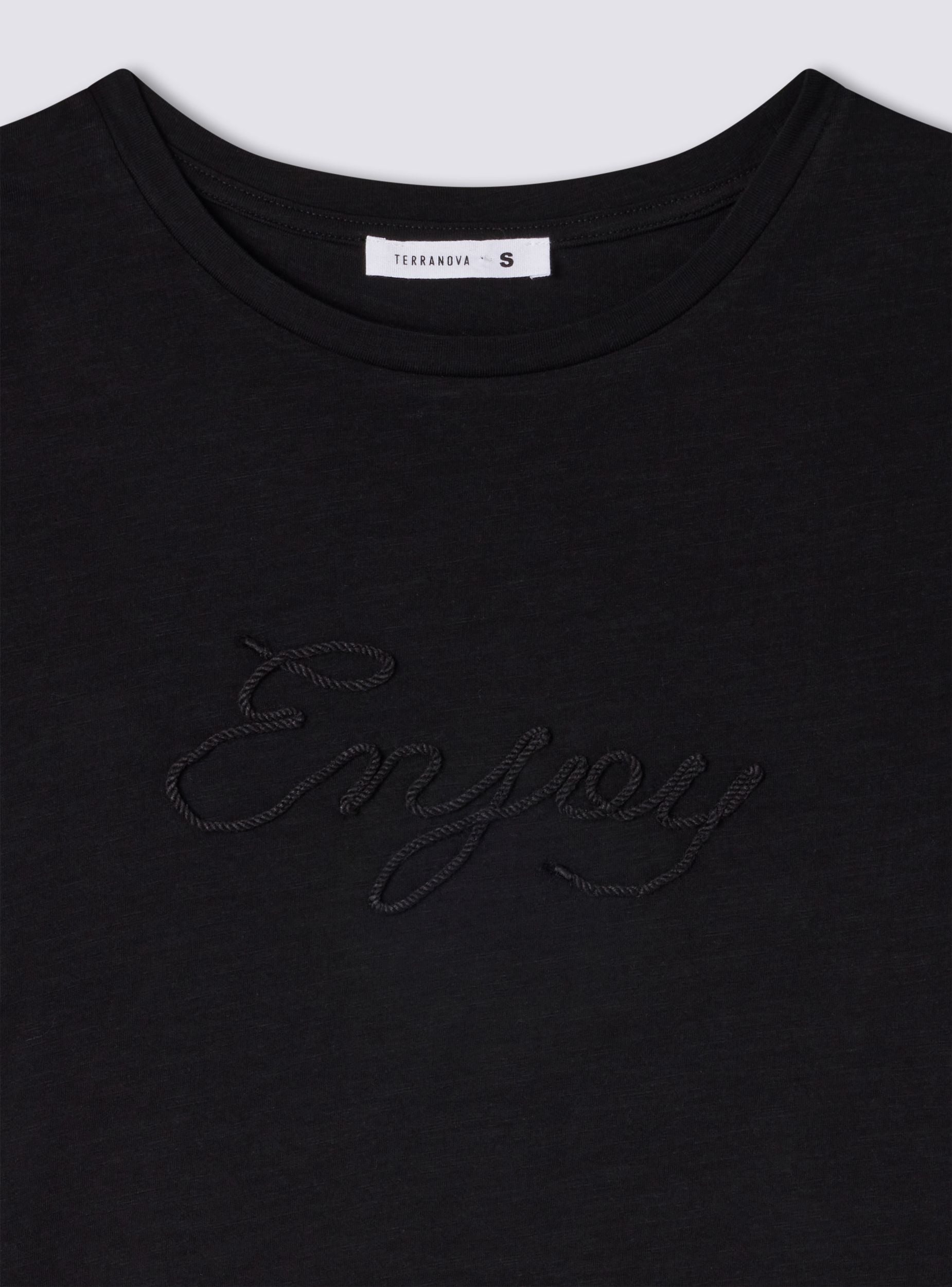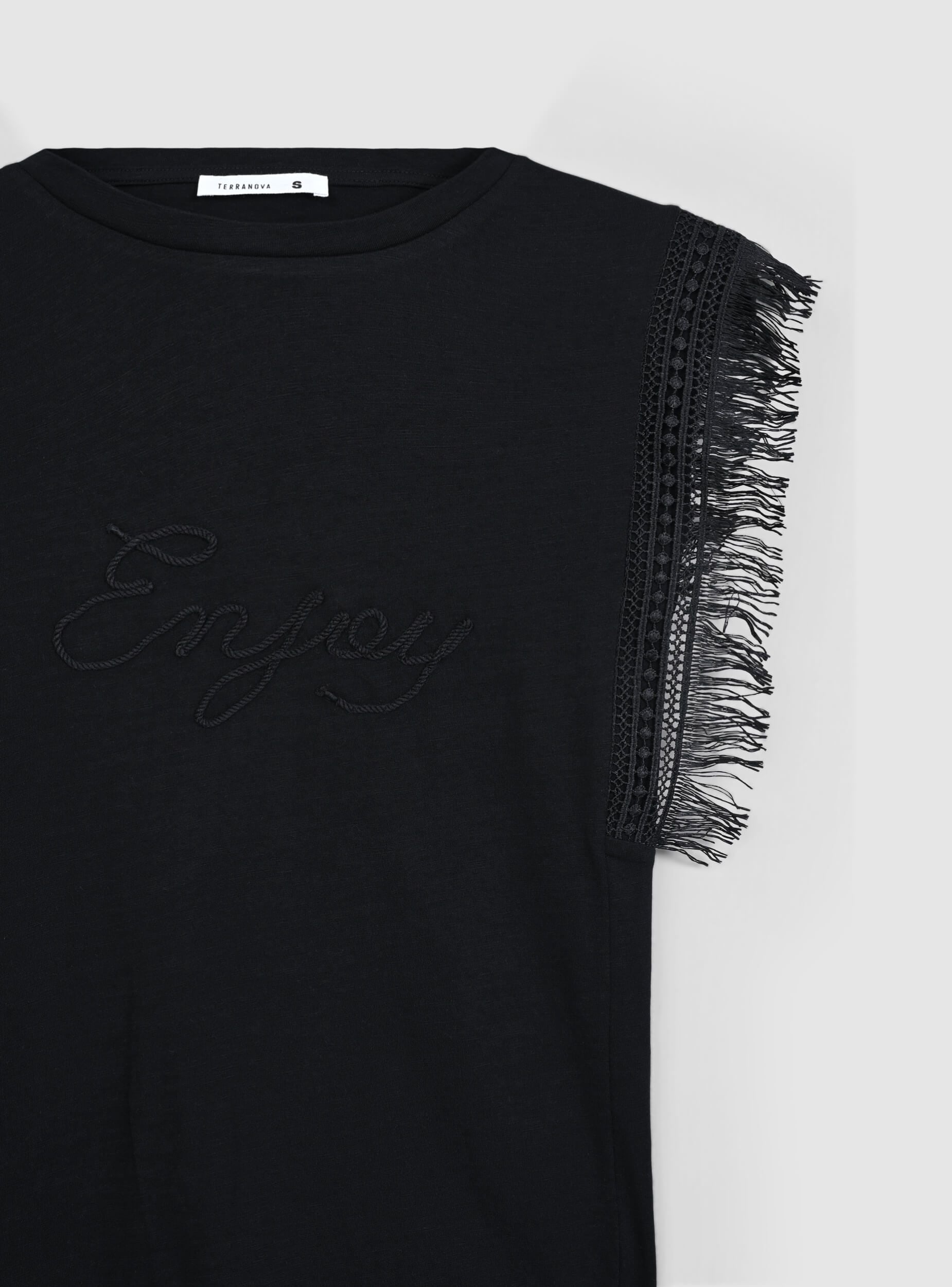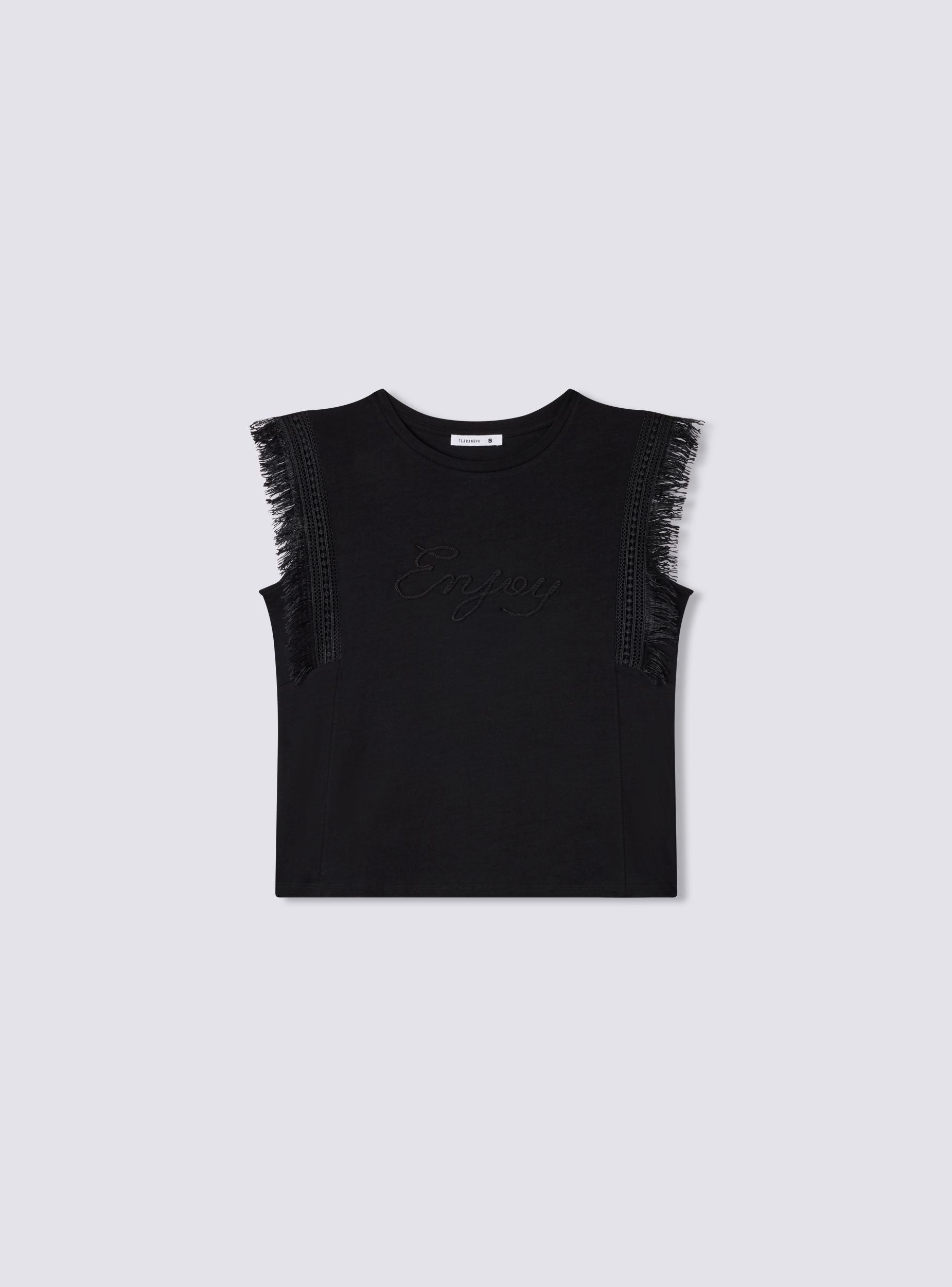 Maglietta da donna senza maniche con dettagli a frange lungo le spalle e i lati. Sul petto è presente la scritta "Enjoy" in caratteri eleganti. Il design è semplice e casual, con uno scollo rotondo e un taglio dritto, perfetto per un look estivo leggero e informale. Le frange aggiungono un tocco di originalità e movimento al capo.Dettagli