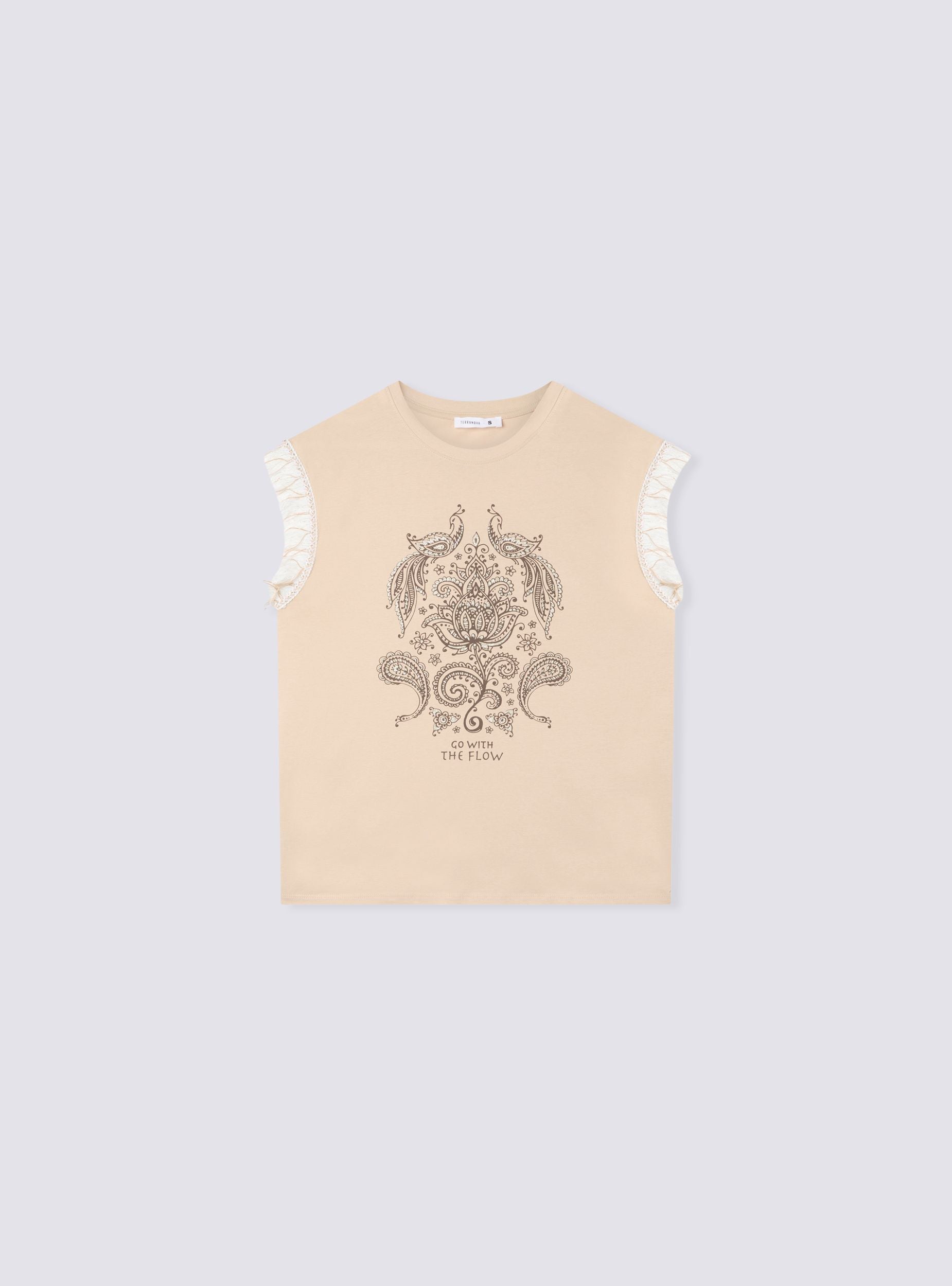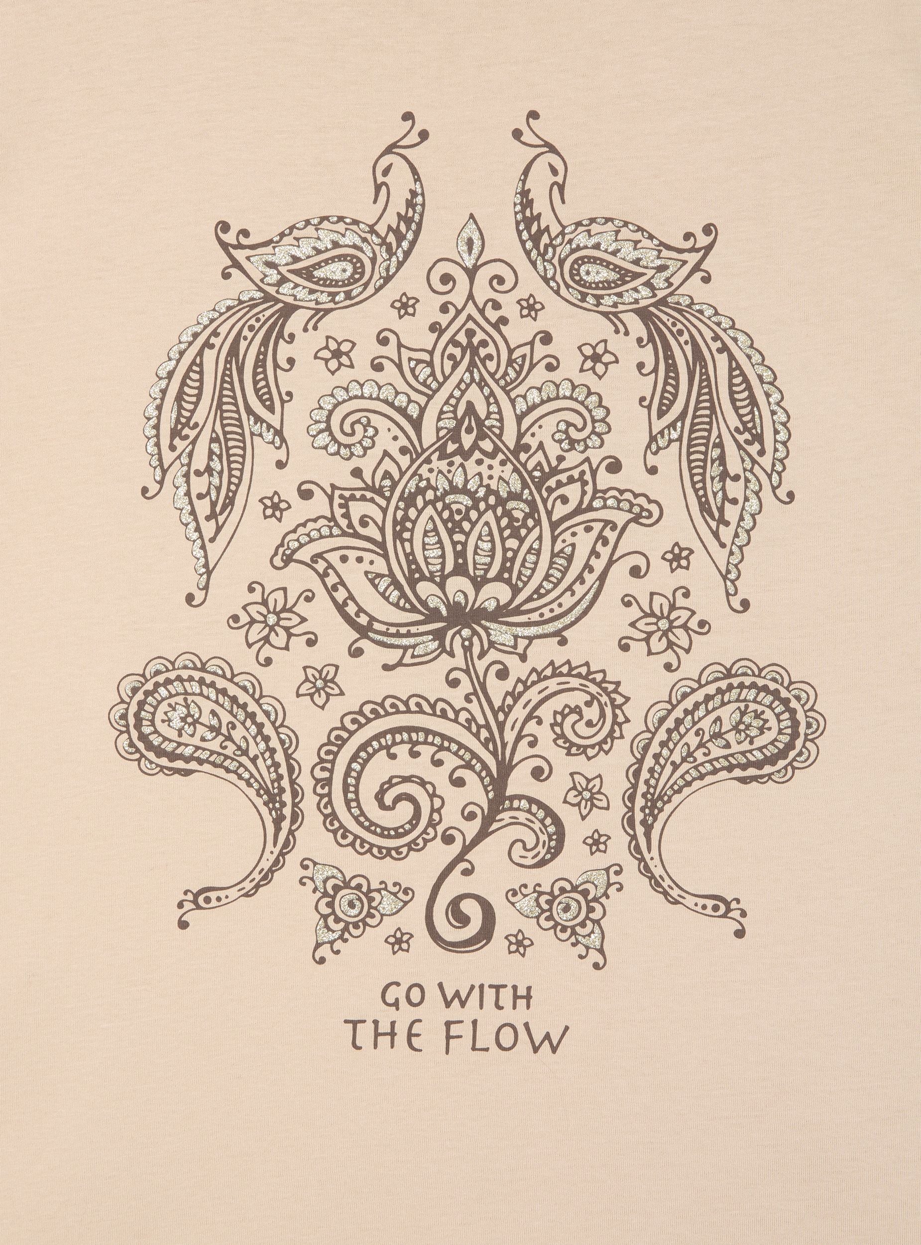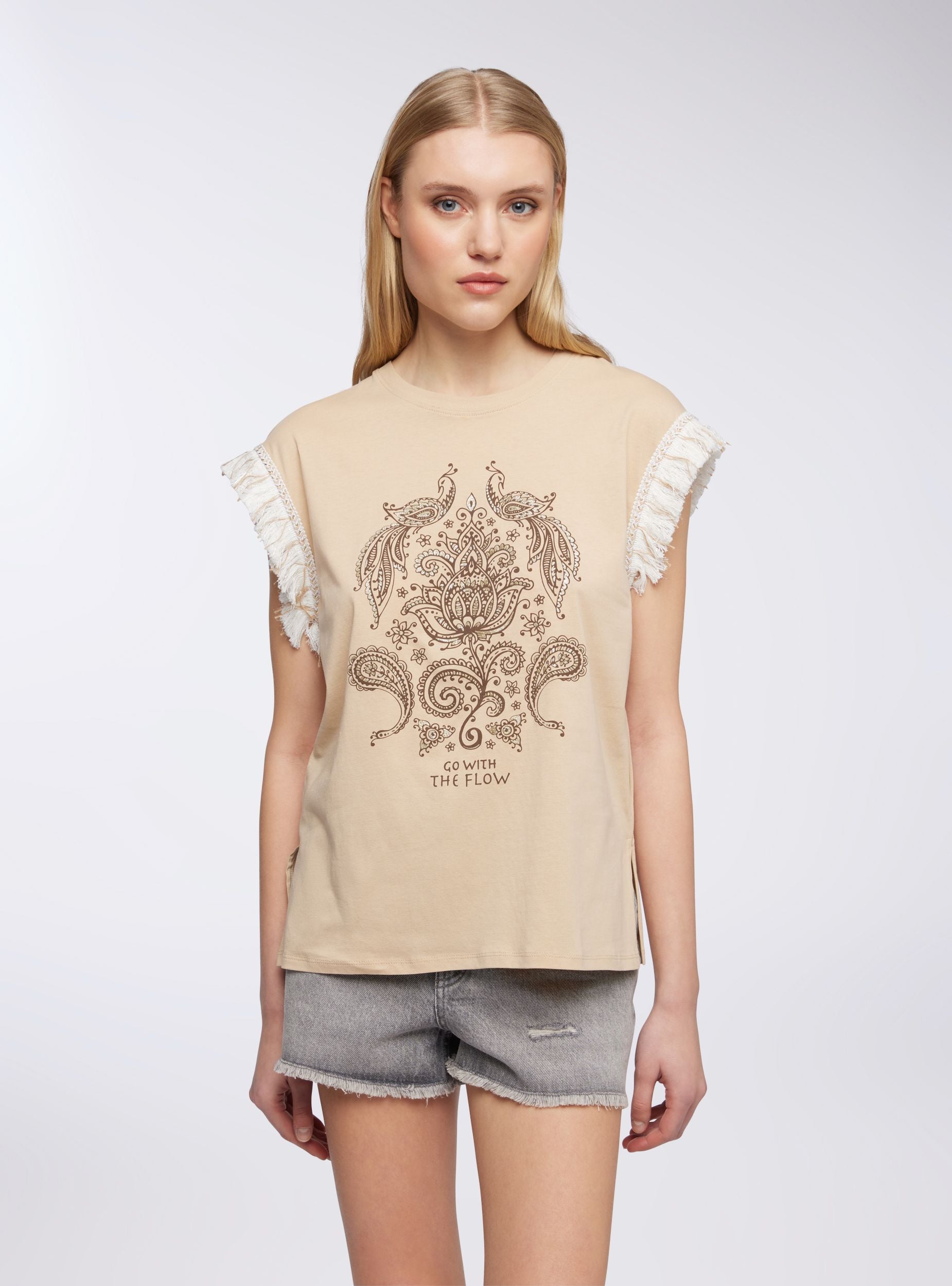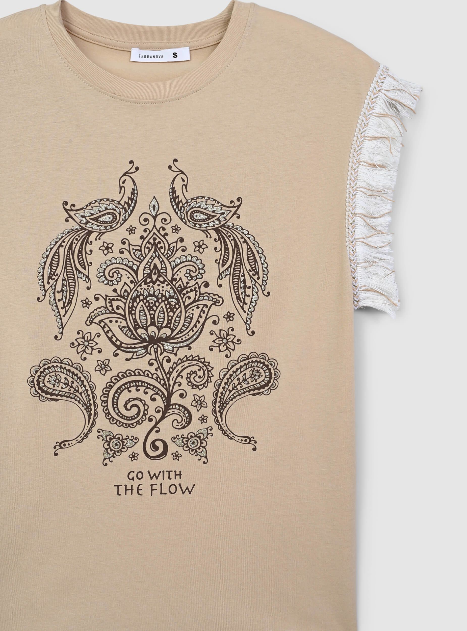Maglietta da donna dallo stile boho-chic, perfetta per un look rilassato ma ricercato. Il design con girocollo e maniche impreziosite da frange aggiunge un tocco di movimento e originalità. La stampa etnica arricchita da glitter dona un effetto luminoso e raffinato, ideale per esaltare outfit casual o festival vibes. I piccoli spacchetti laterali garantiscono una vestibilità comoda e fluida, perfetta su jeans a vita alta o gonne lunghe per un tocco bohémien.Dettagli