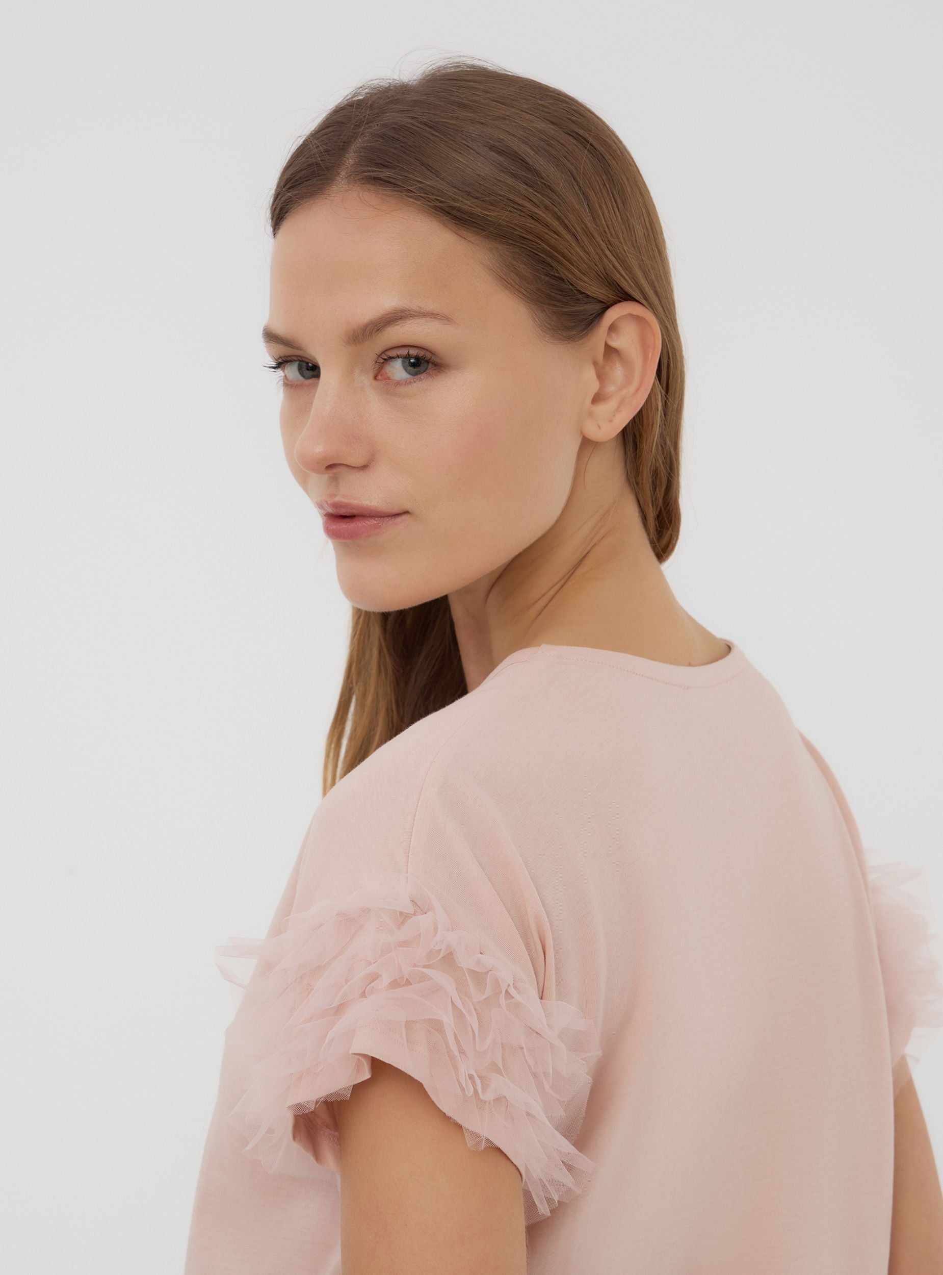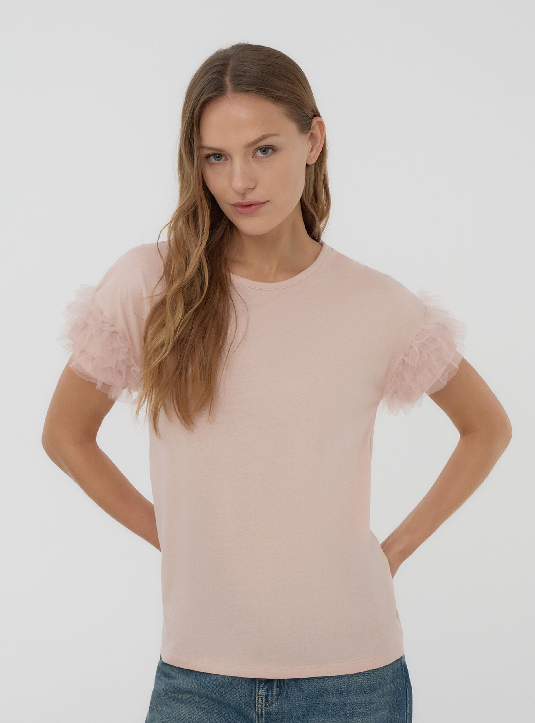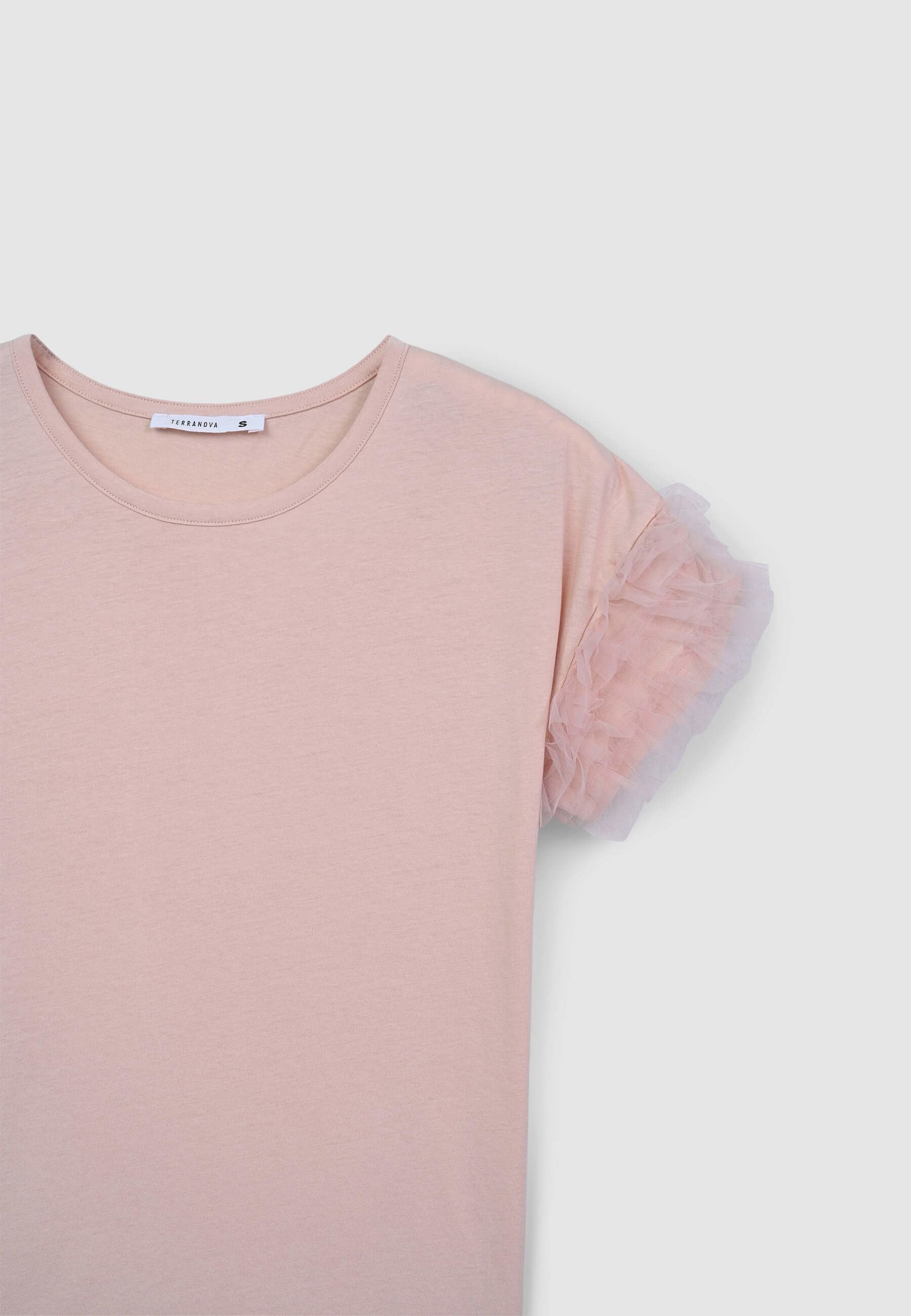 Maglietta da donna con girocollo e maniche corte caratterizzate da eleganti balze in tulle. Il design essenziale del capo si combina con il dettaglio decorativo delle maniche, che aggiunge un tocco romantico e raffinato. Perfetta per un look casual-chic, questa maglietta unisce praticità e stile, risultando ideale sia per outfit quotidiani che per occasioni più eleganti. Le balze in tulle sulle spalle offrono un effetto voluminoso e sofisticato, valorizzando la semplicità del modello.Dettagli