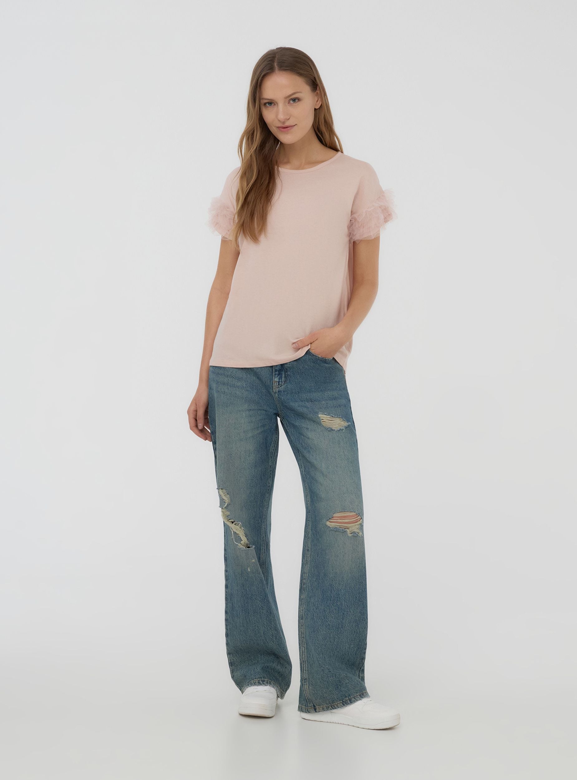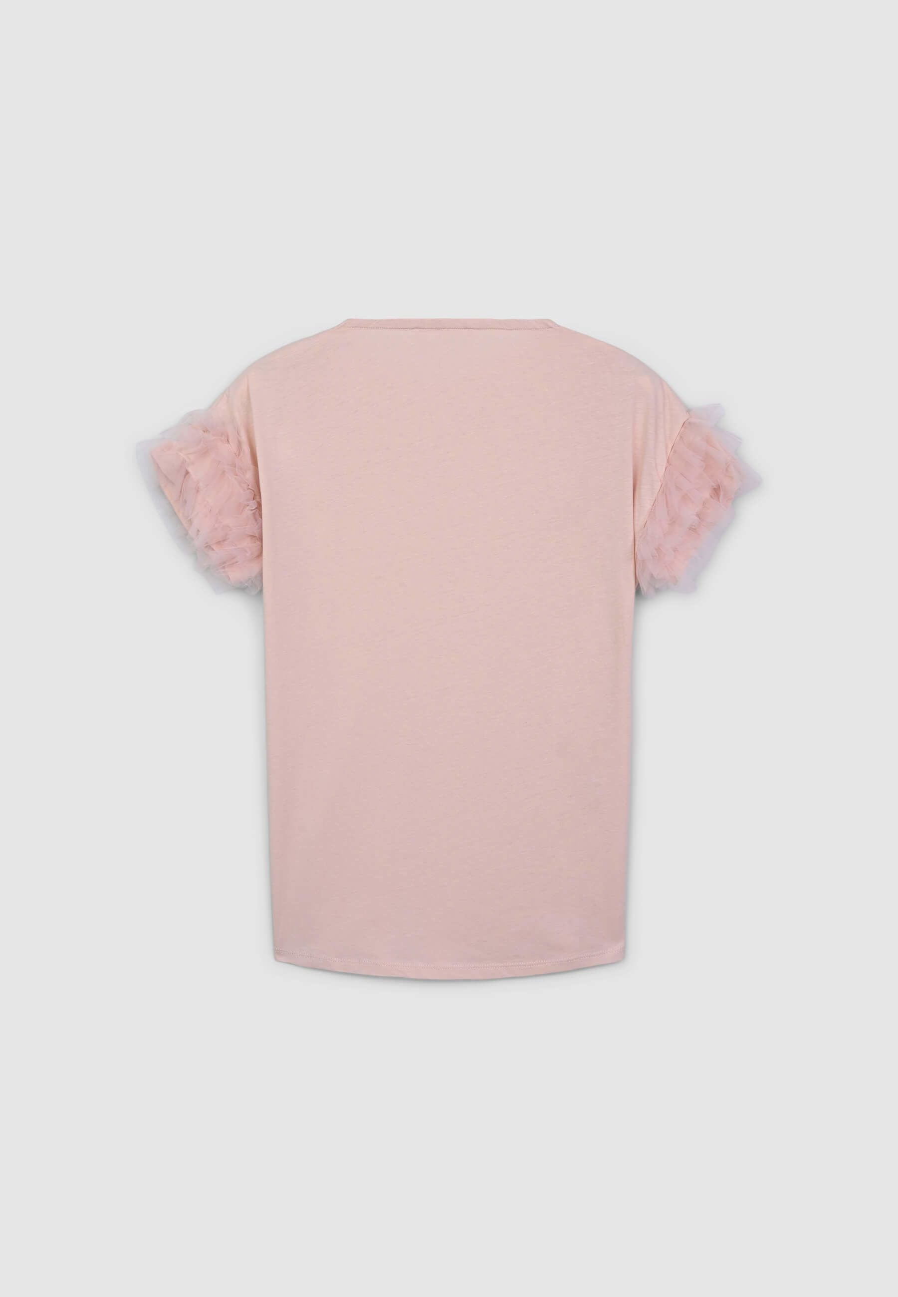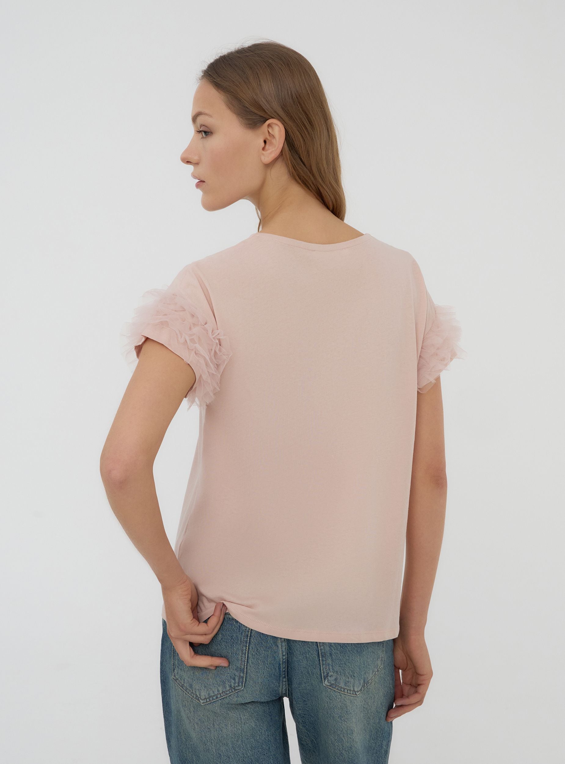 Maglietta da donna con girocollo e maniche corte caratterizzate da eleganti balze in tulle. Il design essenziale del capo si combina con il dettaglio decorativo delle maniche, che aggiunge un tocco romantico e raffinato. Perfetta per un look casual-chic, questa maglietta unisce praticità e stile, risultando ideale sia per outfit quotidiani che per occasioni più eleganti. Le balze in tulle sulle spalle offrono un effetto voluminoso e sofisticato, valorizzando la semplicità del modello.Dettagli