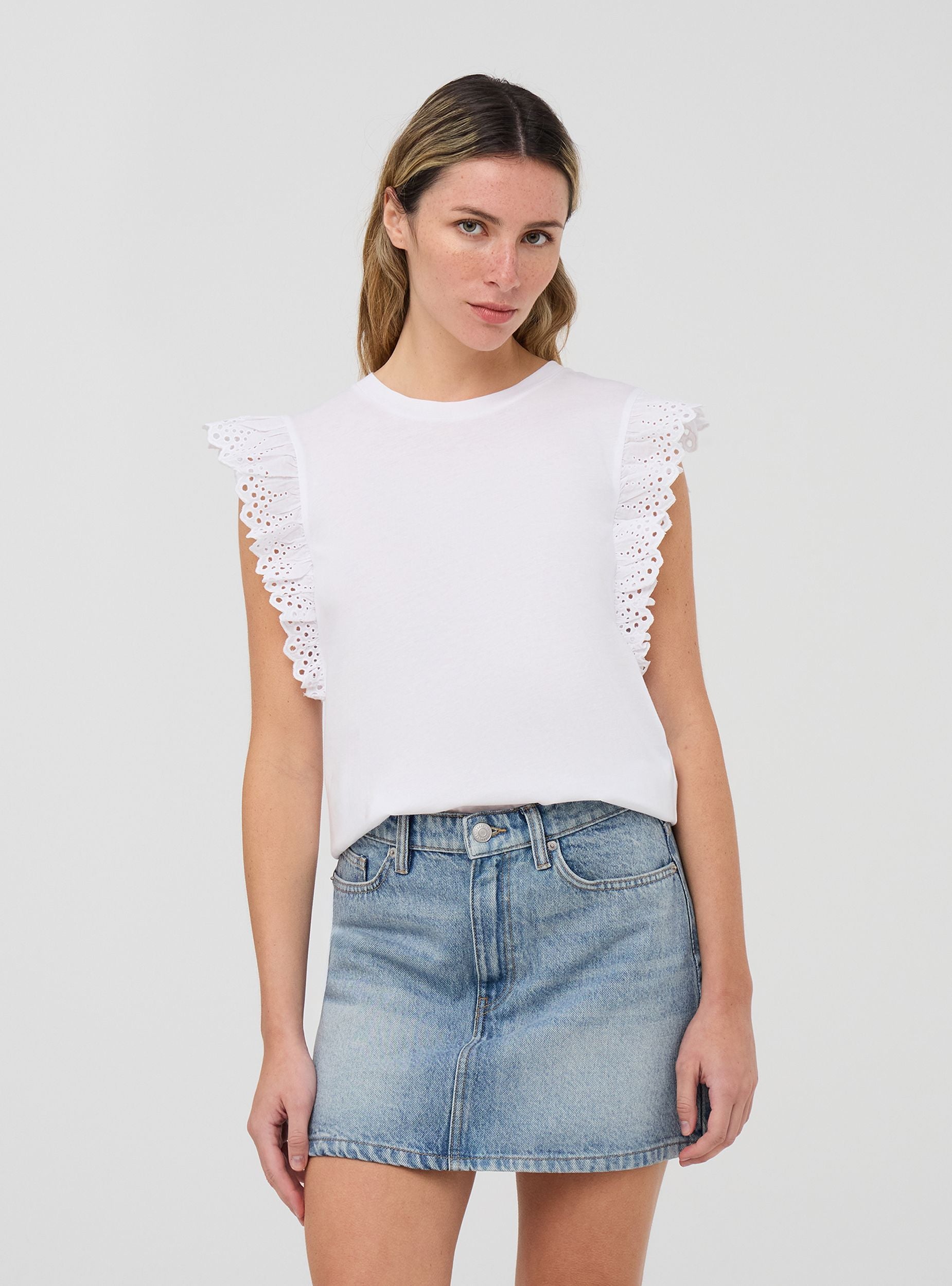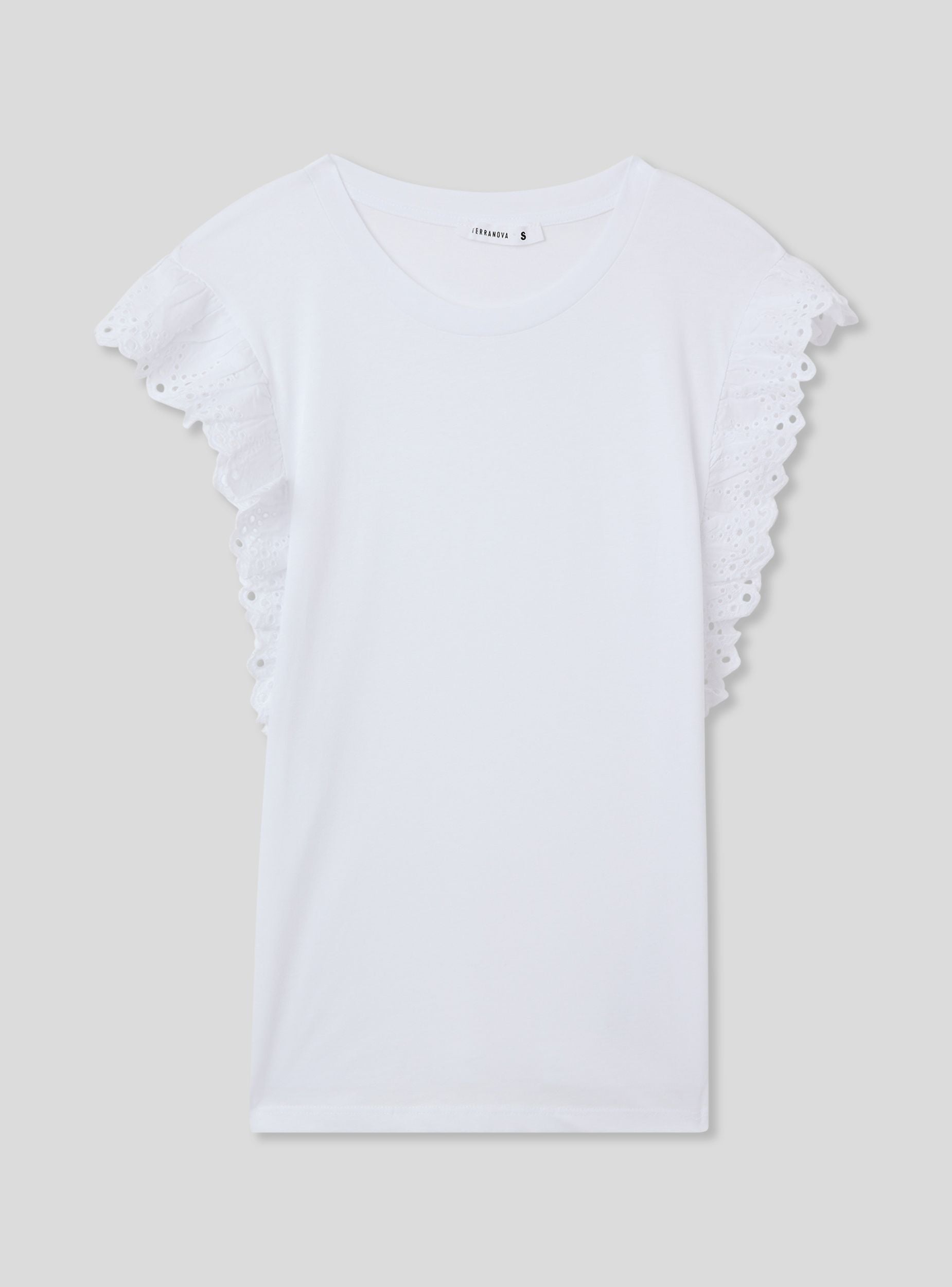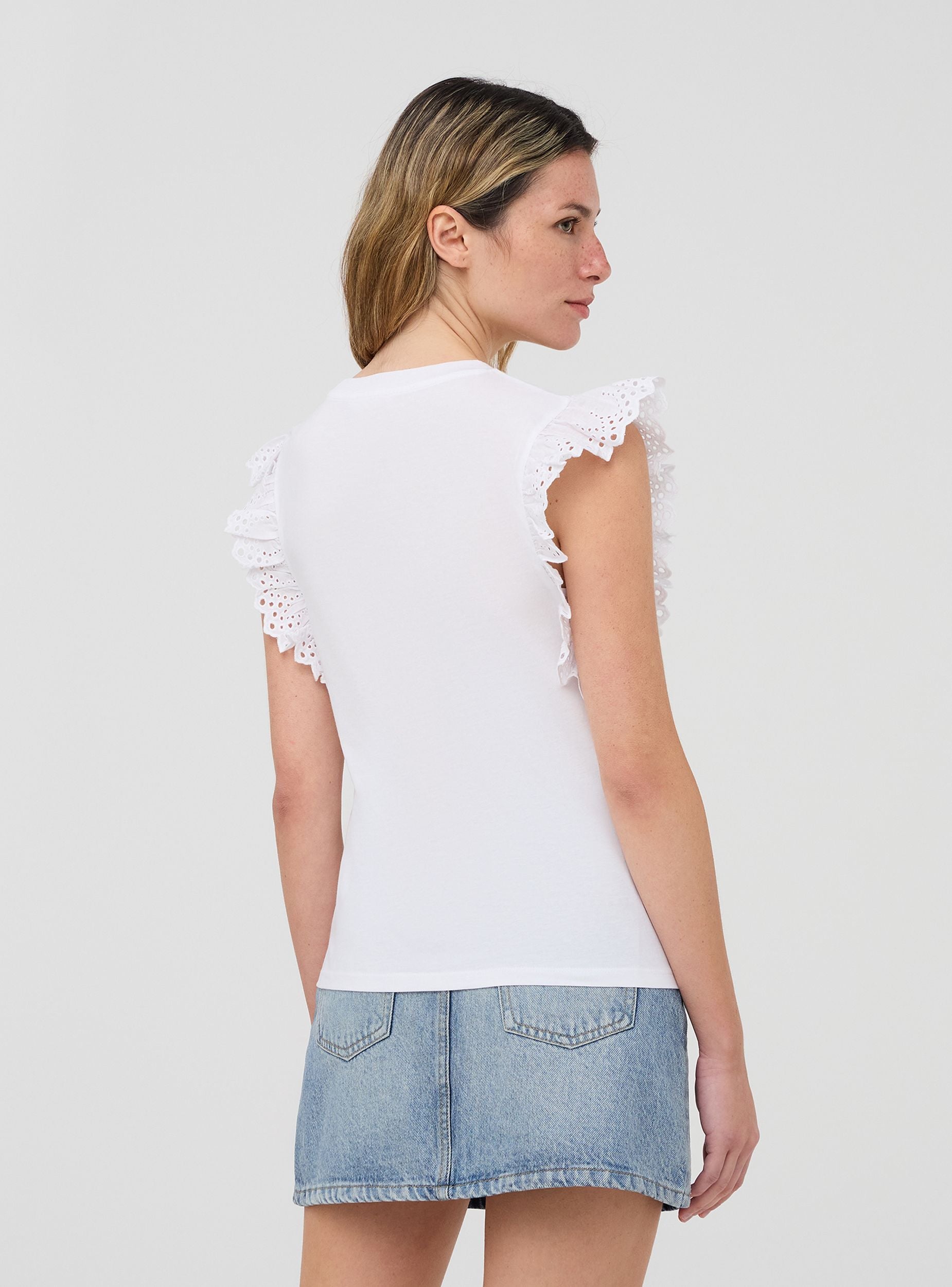 Maglietta da donna a tinta unita con maniche ad aletta. Questo modello presenta uno stile femminile e raffinato, perfetto per aggiungere un tocco di eleganza a un look casual. Ideale per essere indossata durante il tempo libero o in occasioni informali.Dettagli