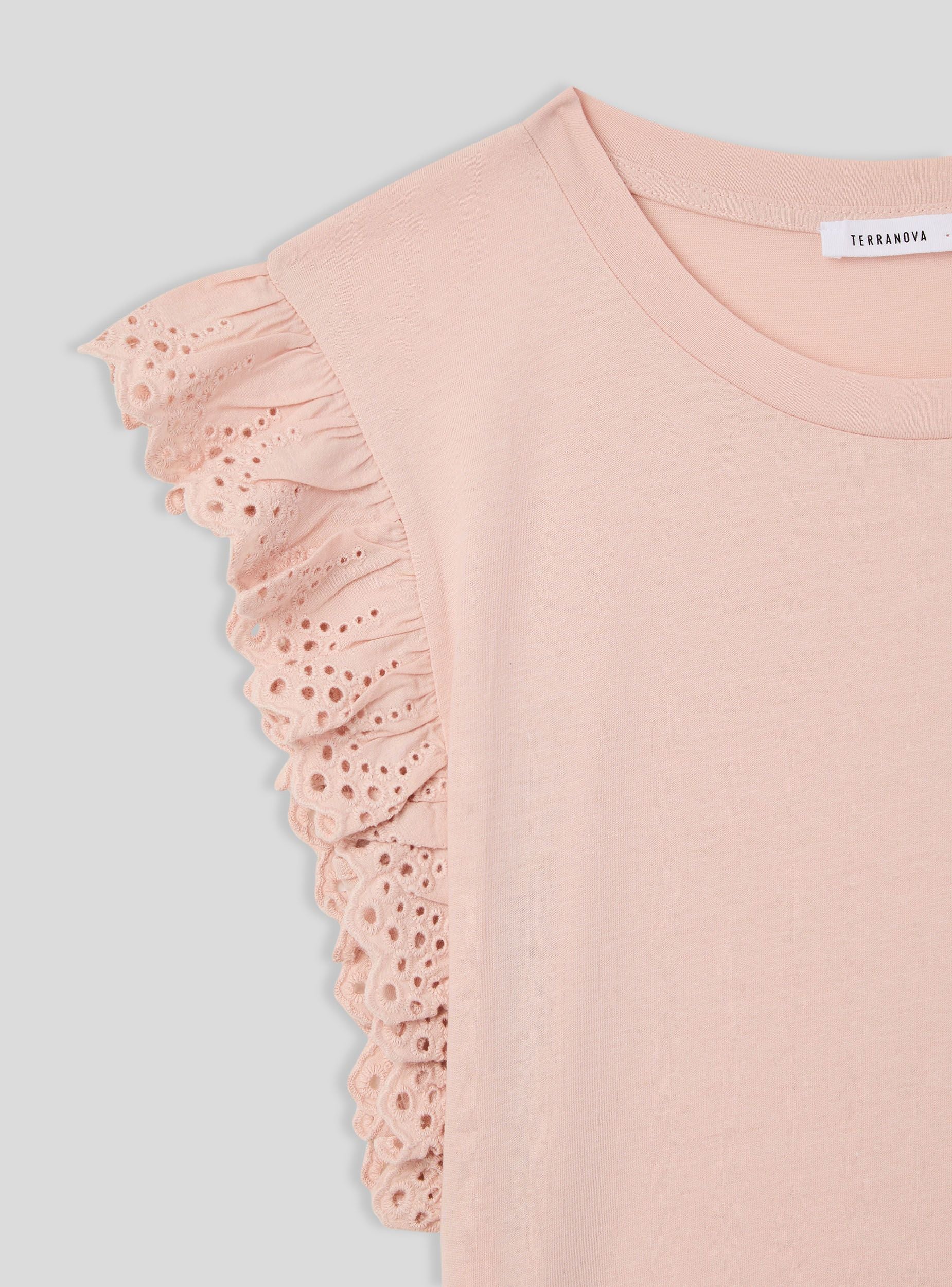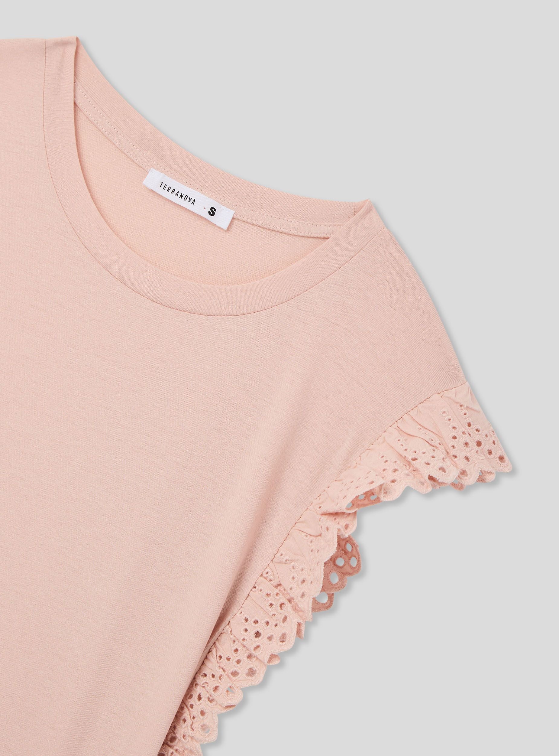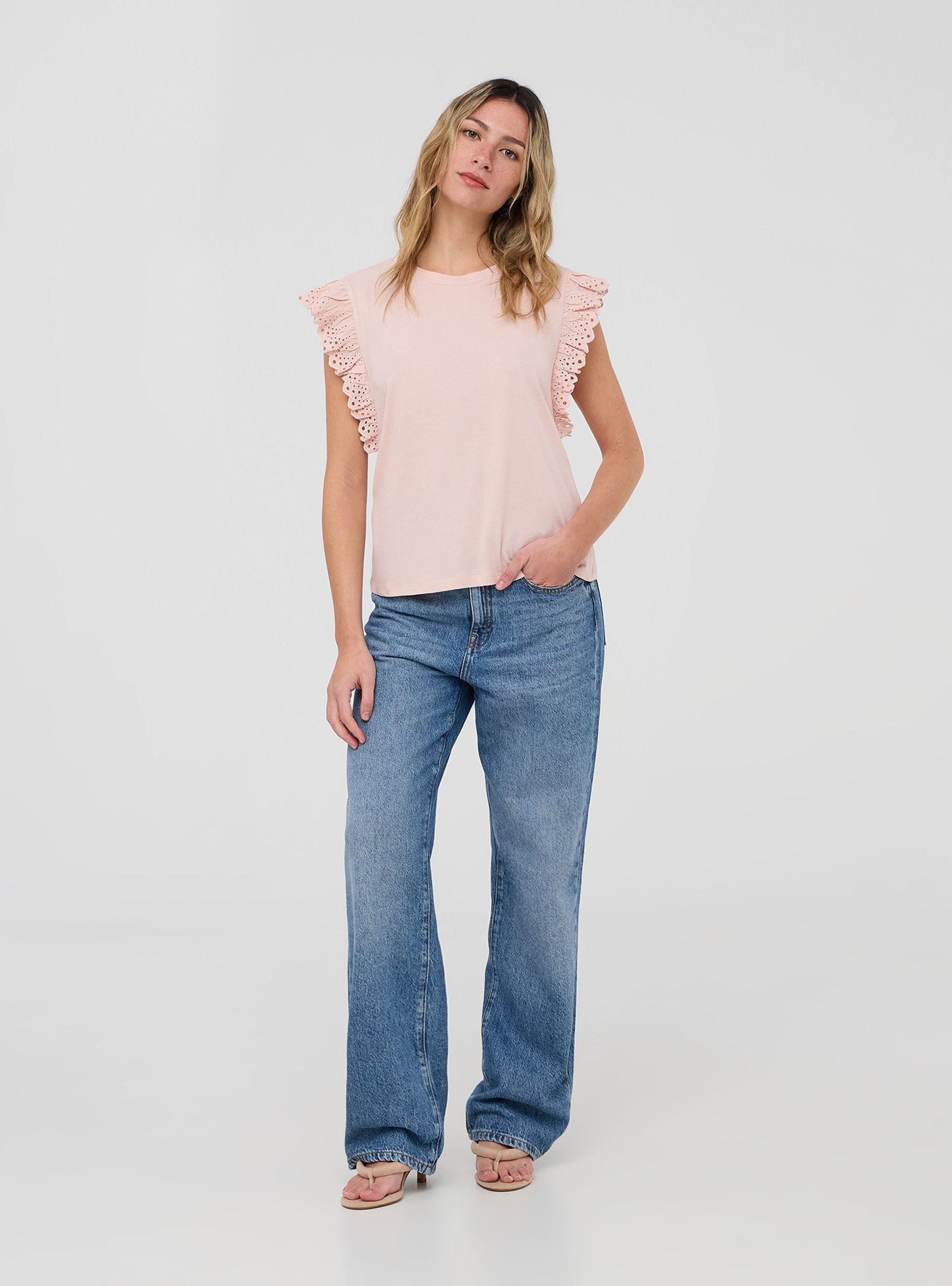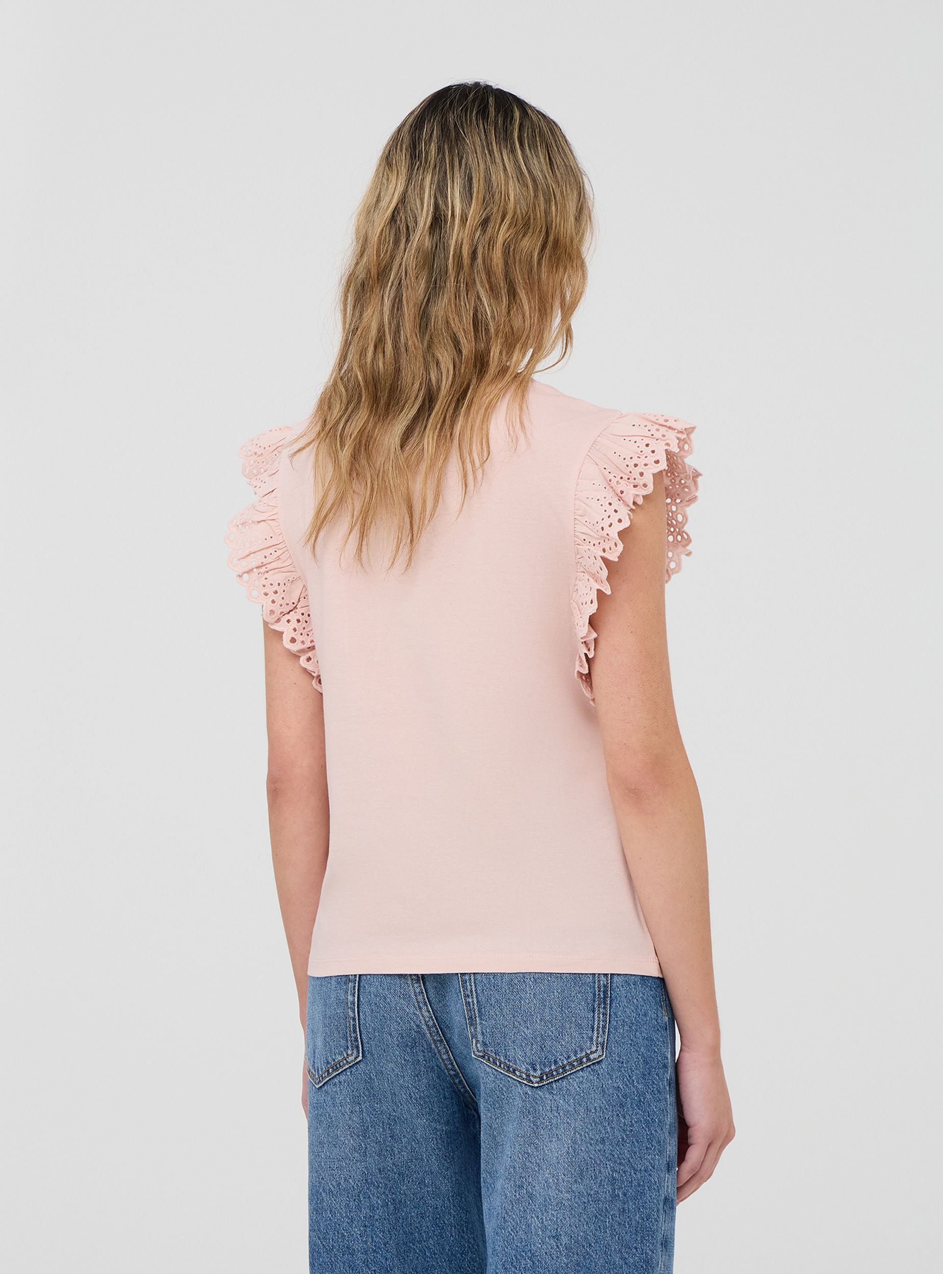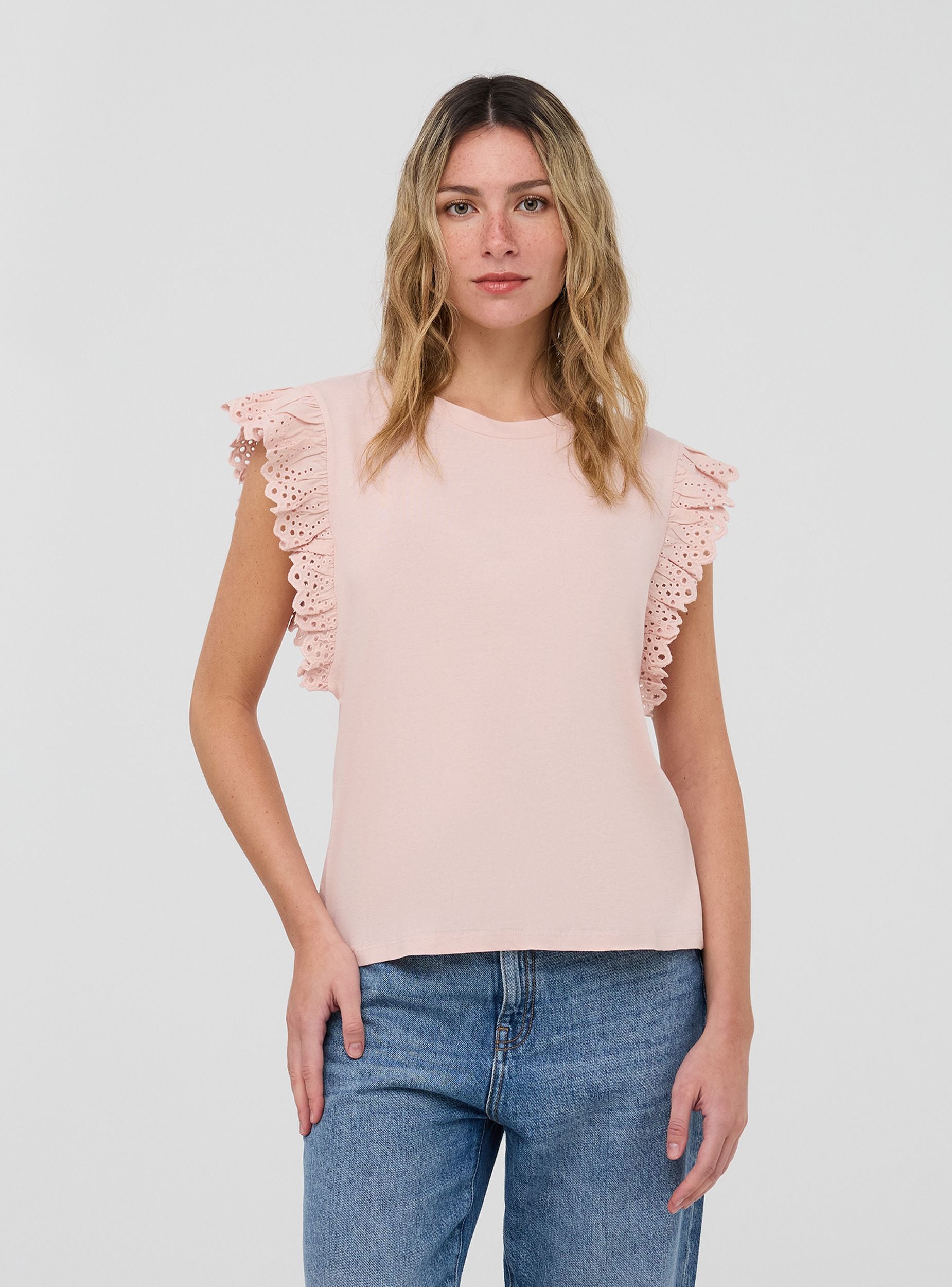Maglietta da donna a tinta unita con maniche ad aletta. Questo modello presenta uno stile femminile e raffinato, perfetto per aggiungere un tocco di eleganza a un look casual. Ideale per essere indossata durante il tempo libero o in occasioni informali.Dettagli