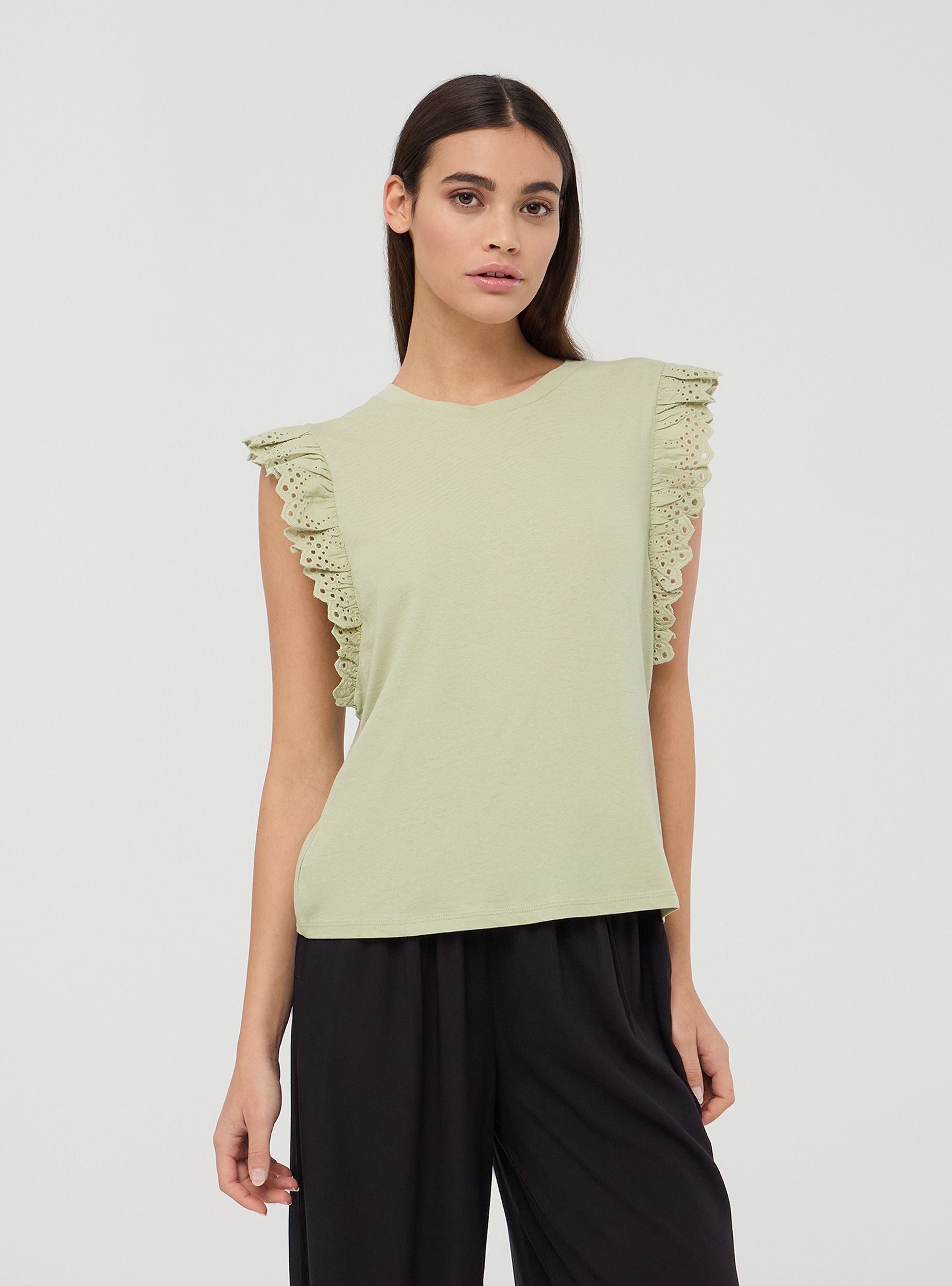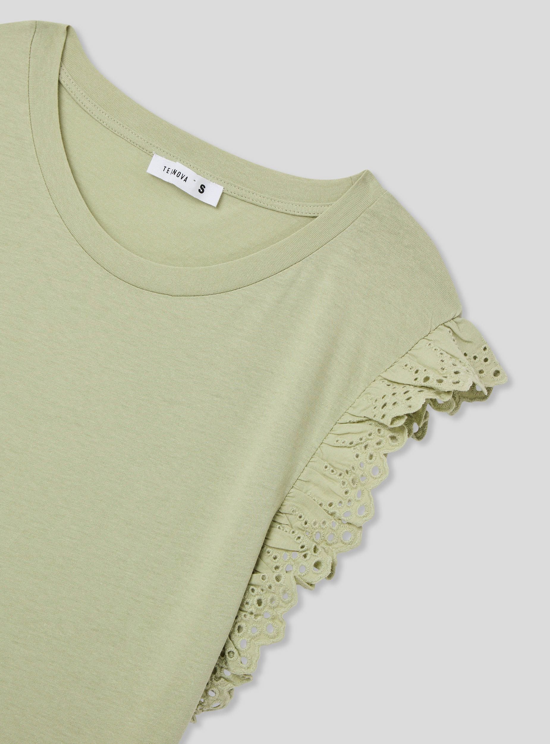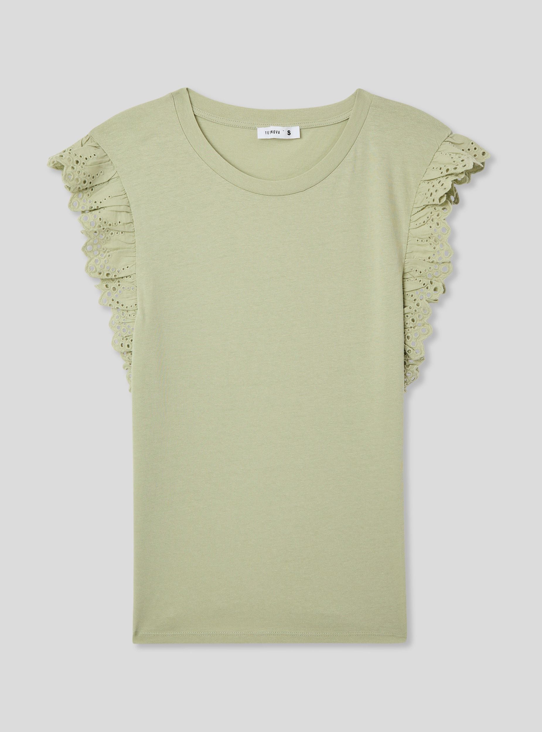 Maglietta da donna a tinta unita con maniche ad aletta. Questo modello presenta uno stile femminile e raffinato, perfetto per aggiungere un tocco di eleganza a un look casual. Ideale per essere indossata durante il tempo libero o in occasioni informali.Dettagli