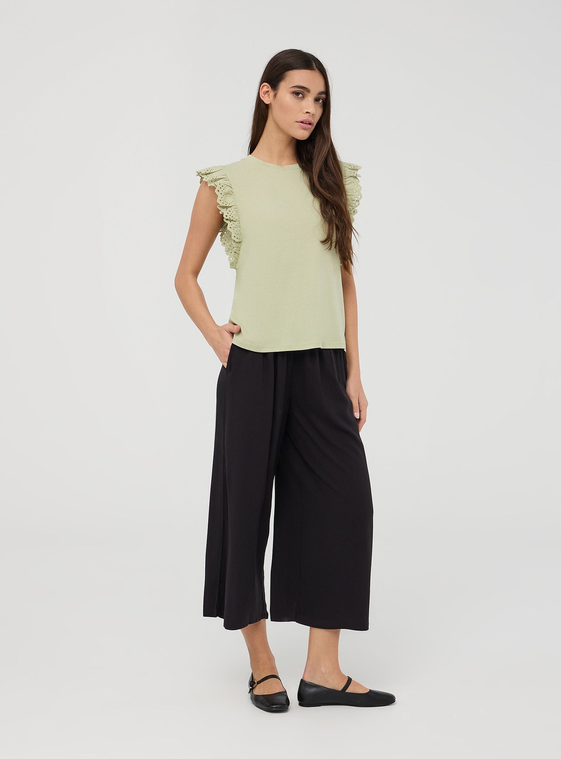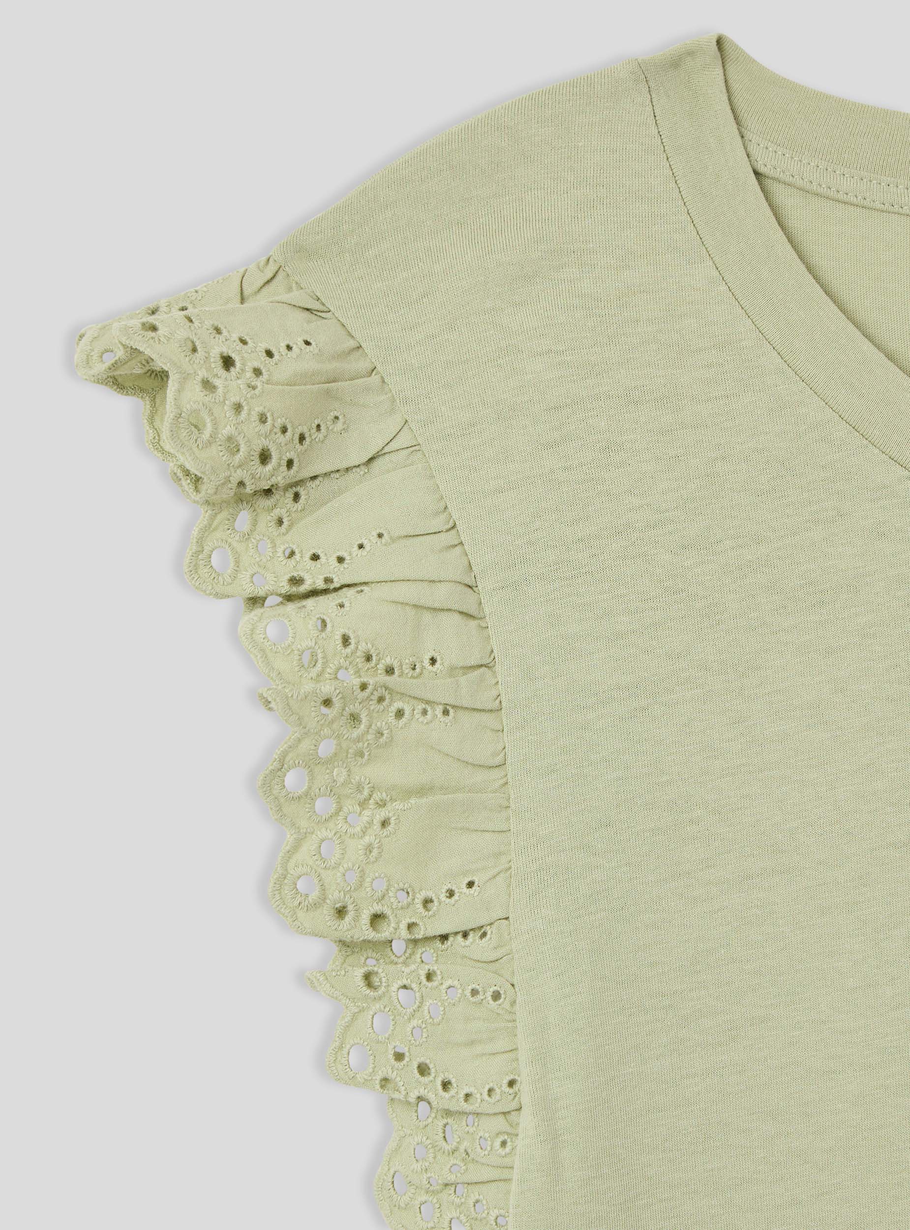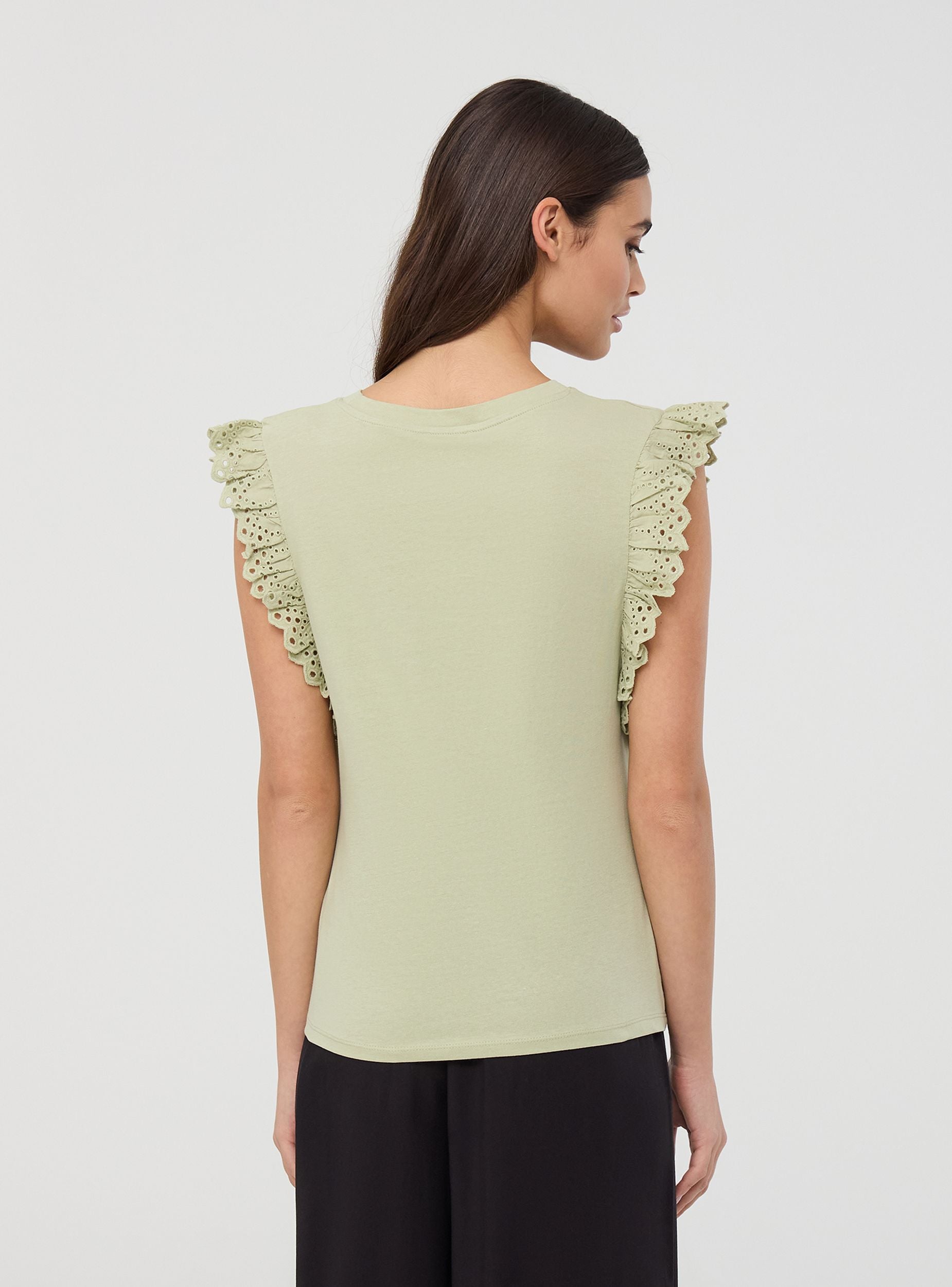 Maglietta da donna a tinta unita con maniche ad aletta. Questo modello presenta uno stile femminile e raffinato, perfetto per aggiungere un tocco di eleganza a un look casual. Ideale per essere indossata durante il tempo libero o in occasioni informali.Dettagli