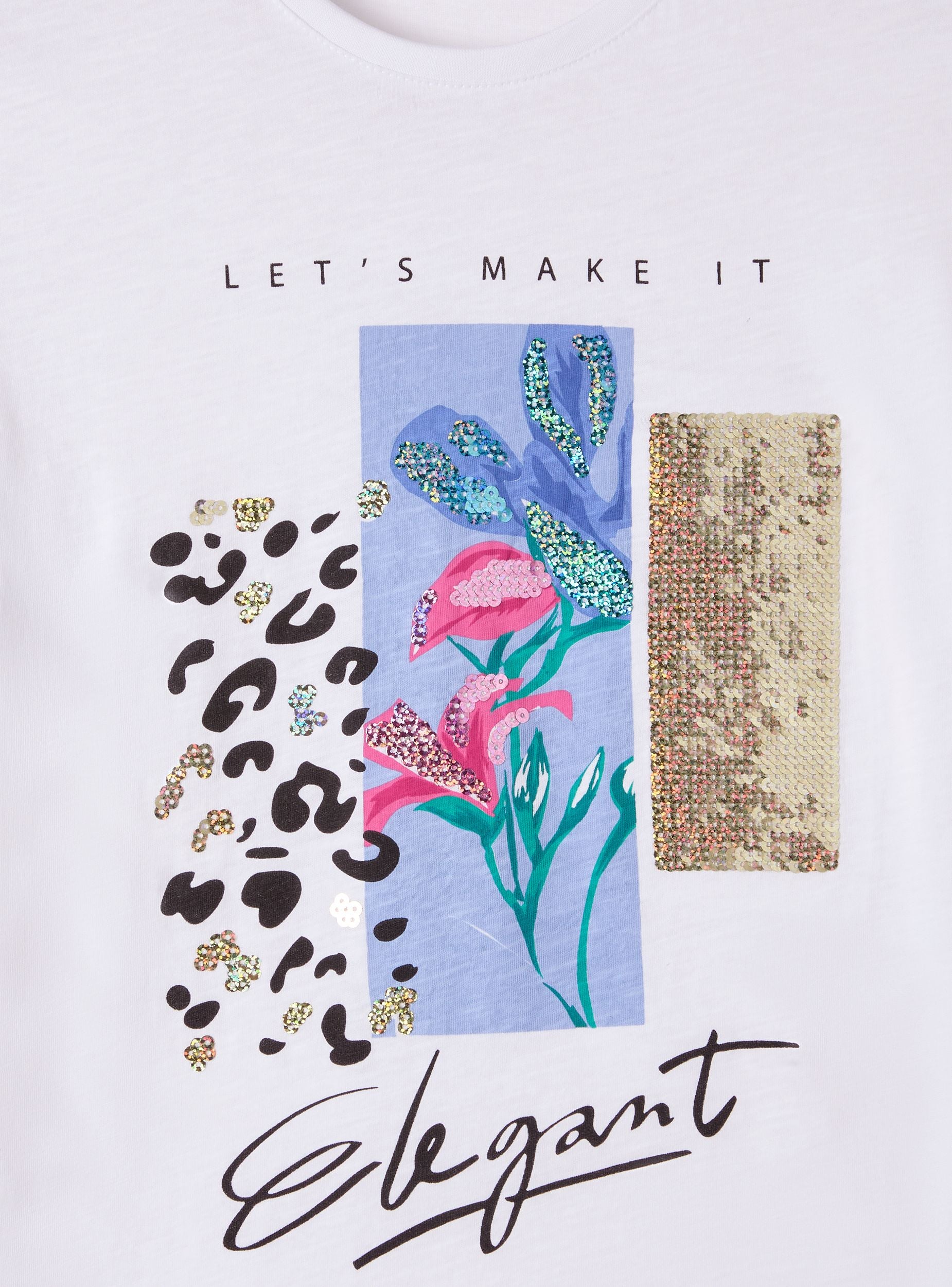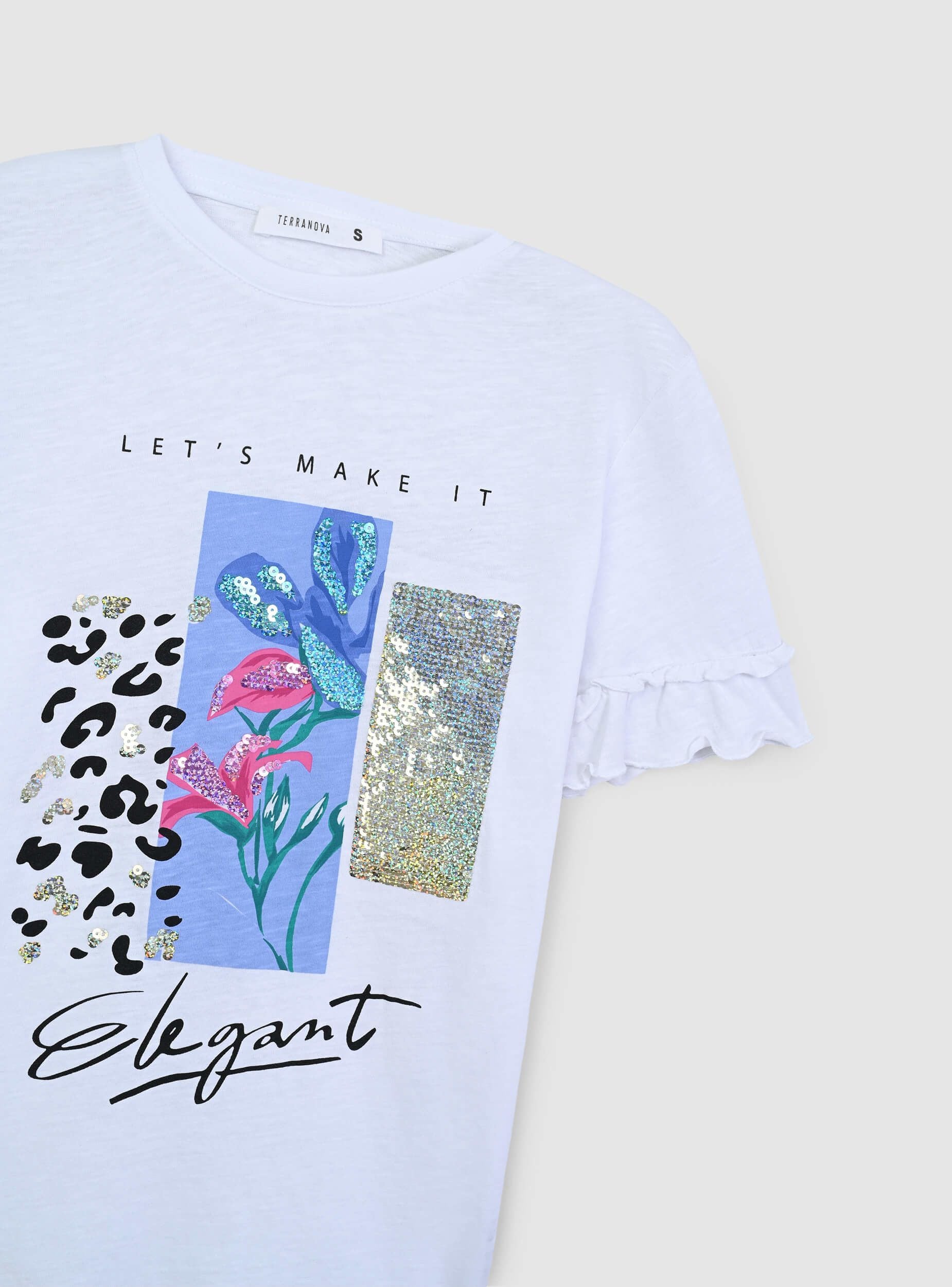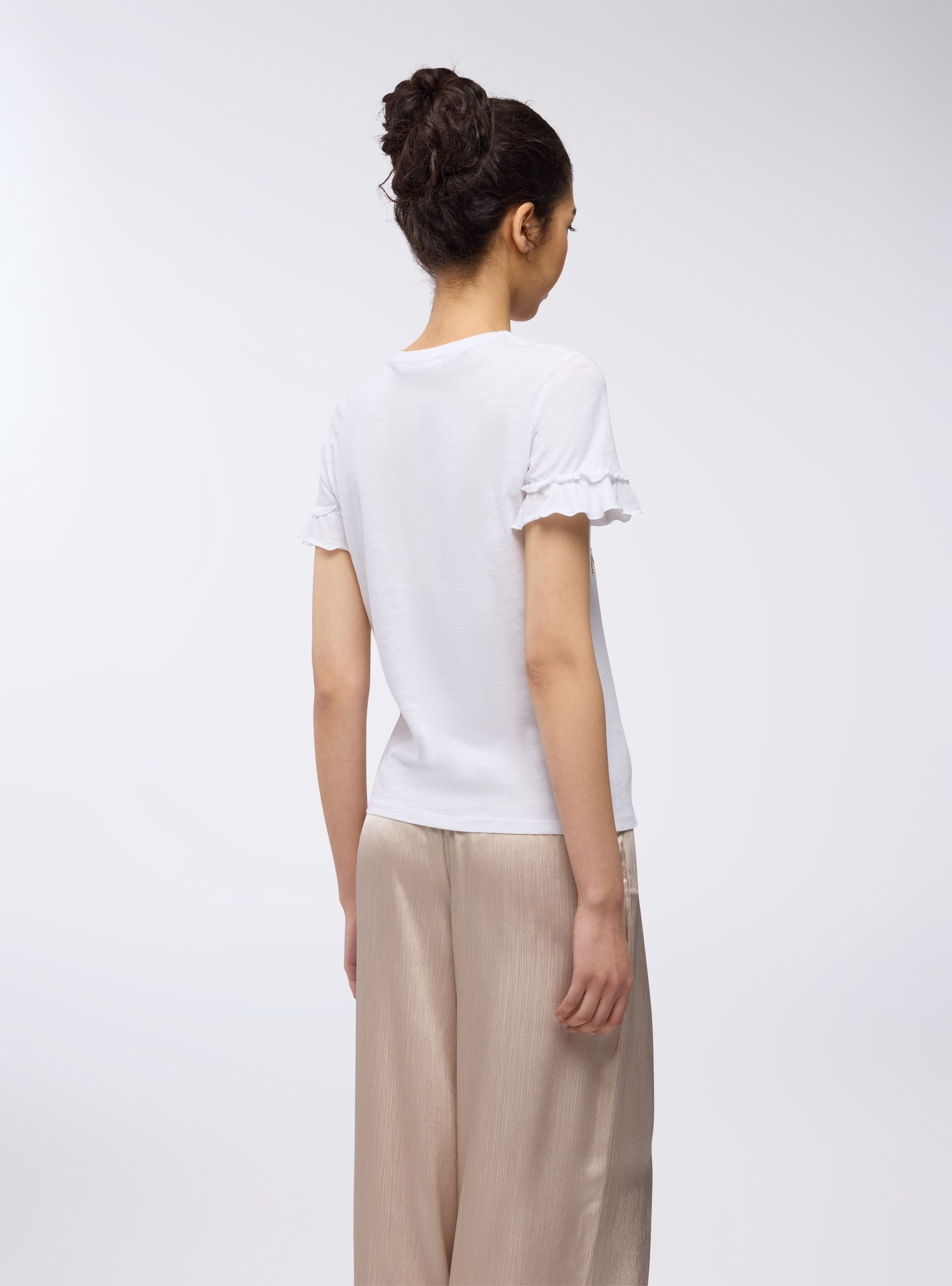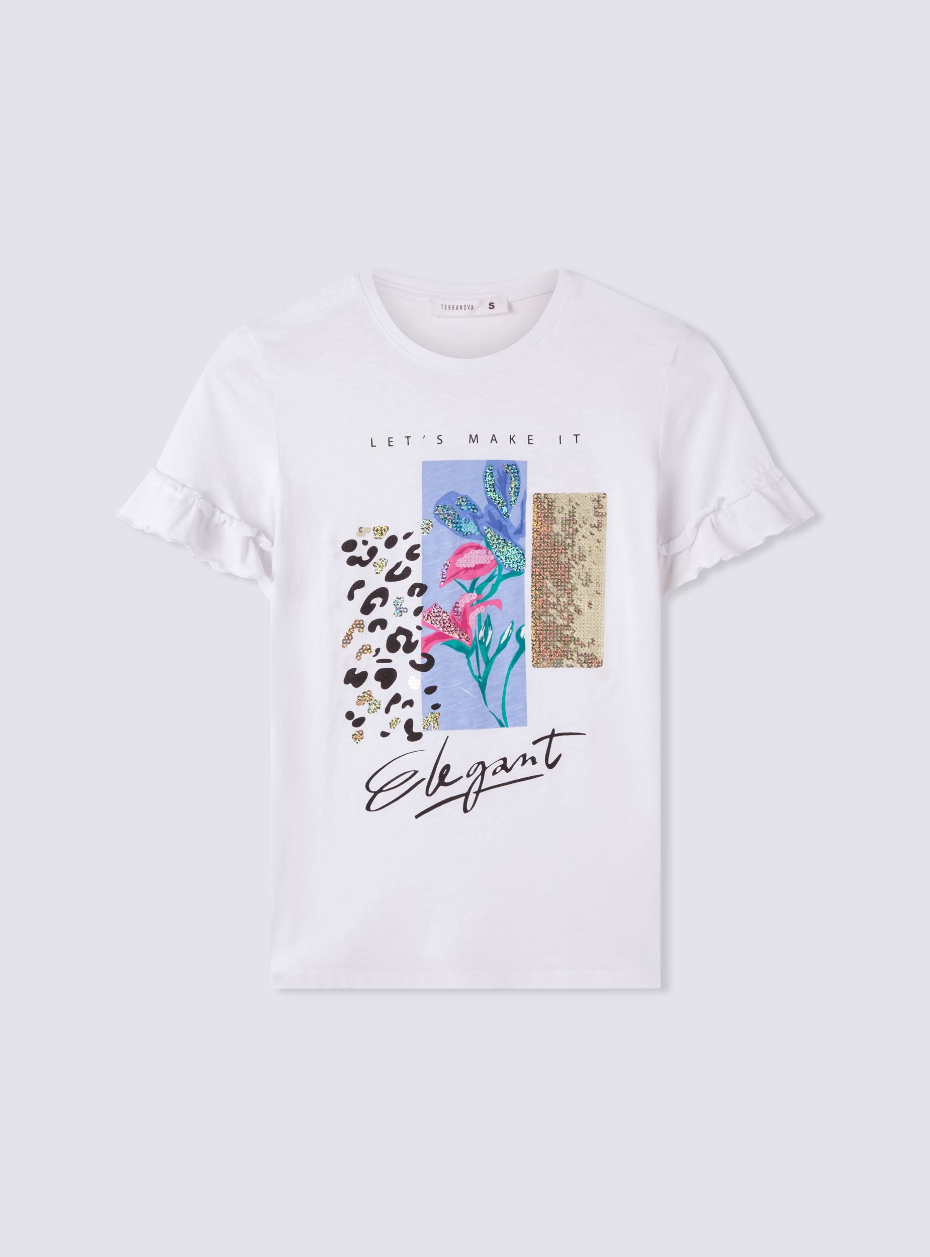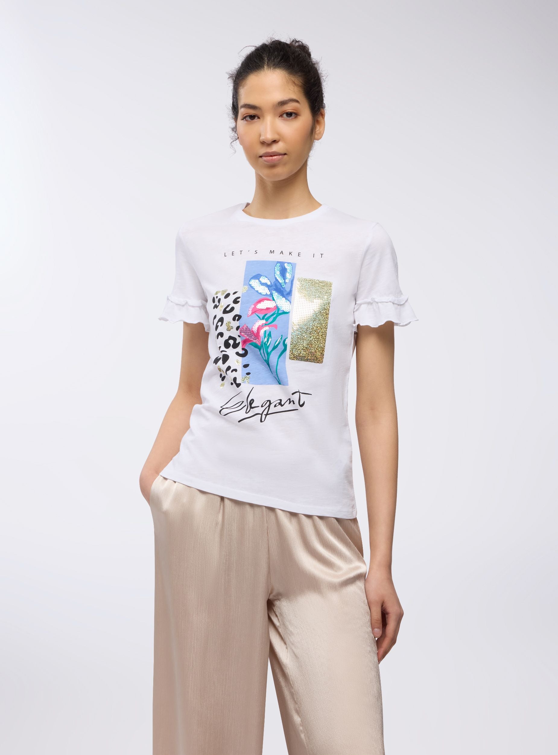 Maglietta da donna ideale per un look casual e dinamico. Caratterizzata da una vestibilità regolare, presenta maniche corte con volant e un design con applicazioni e stampe. Una scelta versatile per chi cerca comfort e stile in ogni occasione. Perfetta da abbinare con shorts o pantaloni leggeri.Dettagli