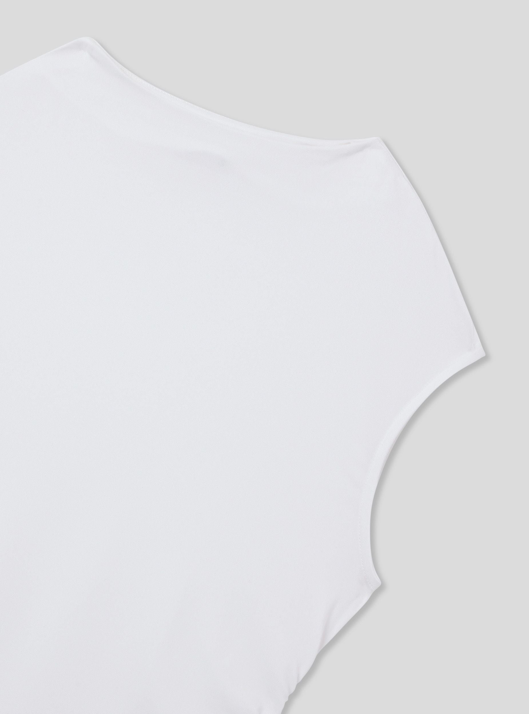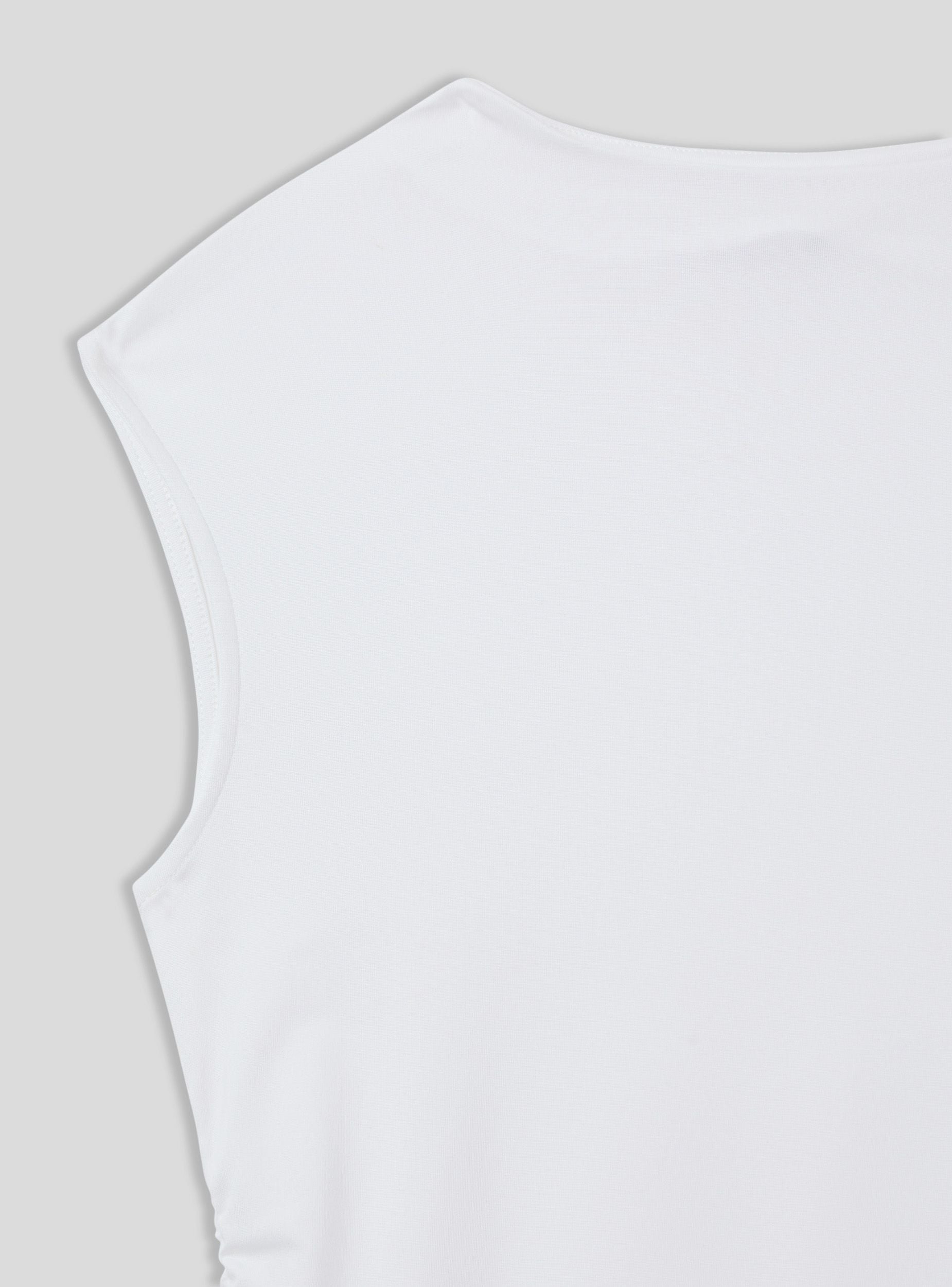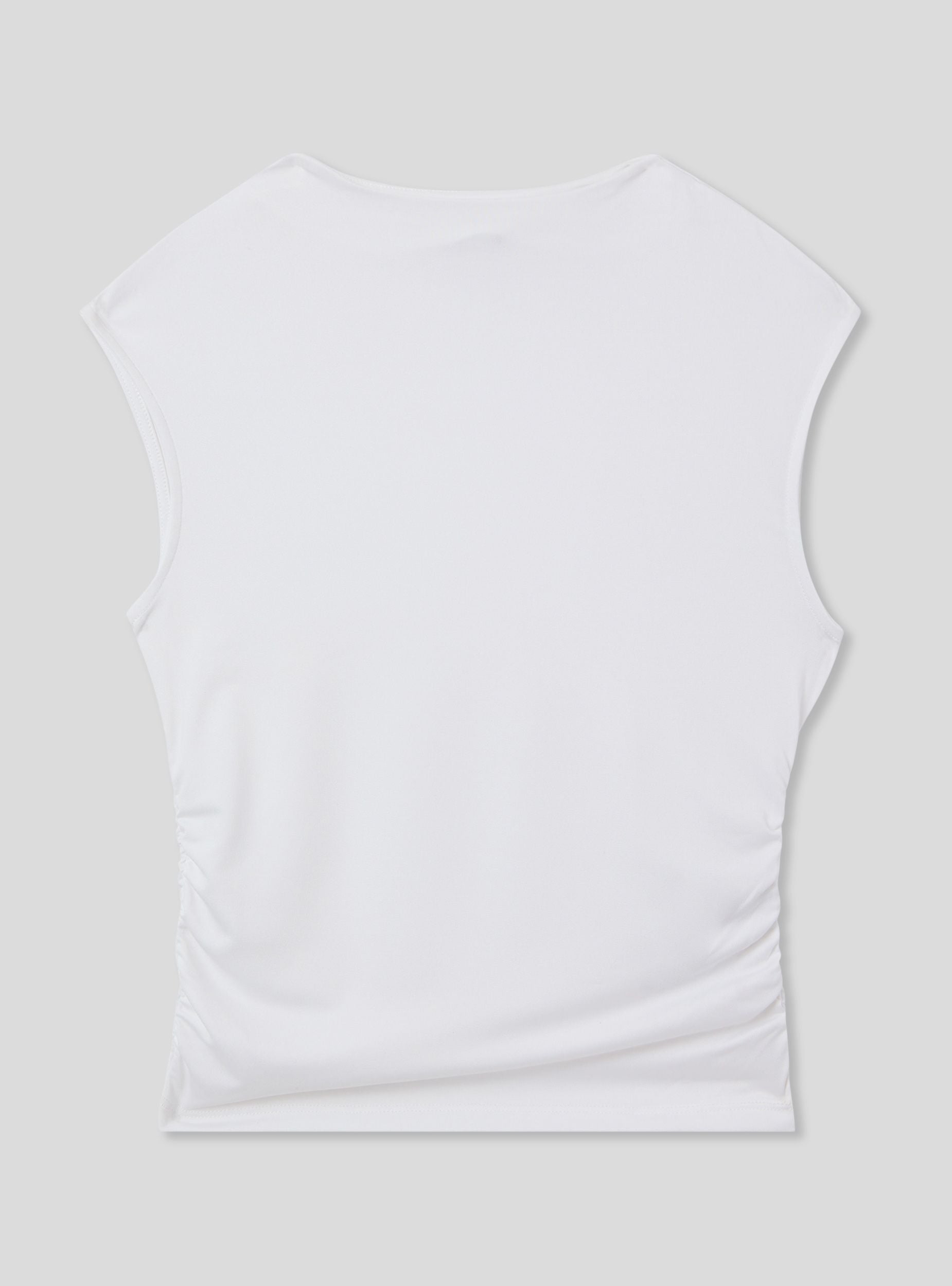 Maglietta da donna senza maniche con scollo a cratere e design a tinta unita, caratterizzata da eleganti arricciature lungo i fianchi che donano un tocco di femminilità e originalità al capo. Il collo presenta un taglio particolare che conferisce al modello uno stile moderno e versatile, adatto sia per outfit casual che per occasioni più ricercate. La vestibilità è comoda, perfetta per essere abbinata a vari stili e accessori.Dettagli