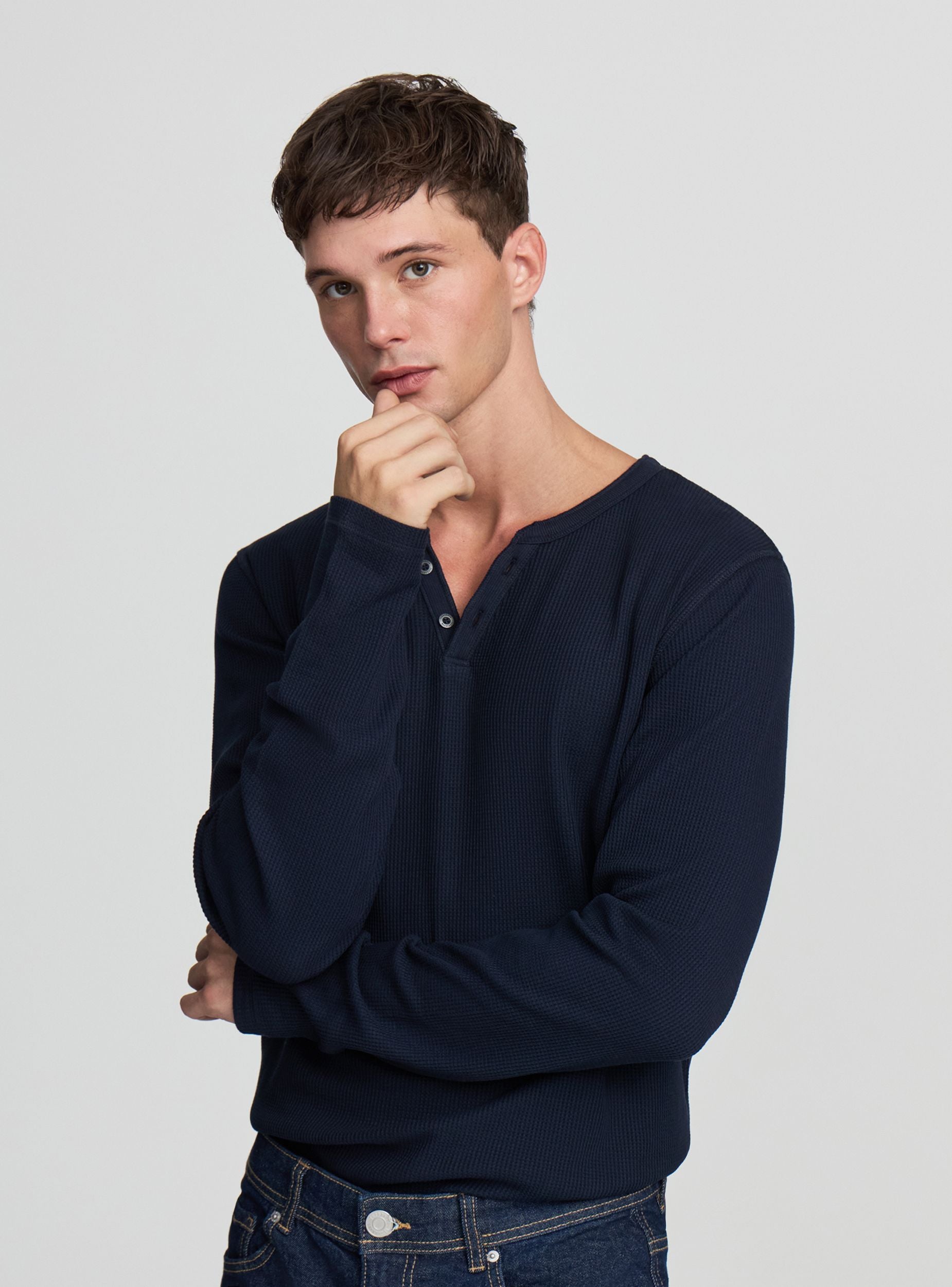 Maglietta da uomo a manica lunga con scollo serafino. Ideale per un look casual e versatile, si abbina perfettamente a jeans o pantaloni per un outfit quotidiano. La vestibilità comoda e il design tinta unita la rendono adatta a diverse occasioni, dal tempo libero alle uscite informali. Perfetta per chi cerca uno stile semplice ma curato.Dettagli