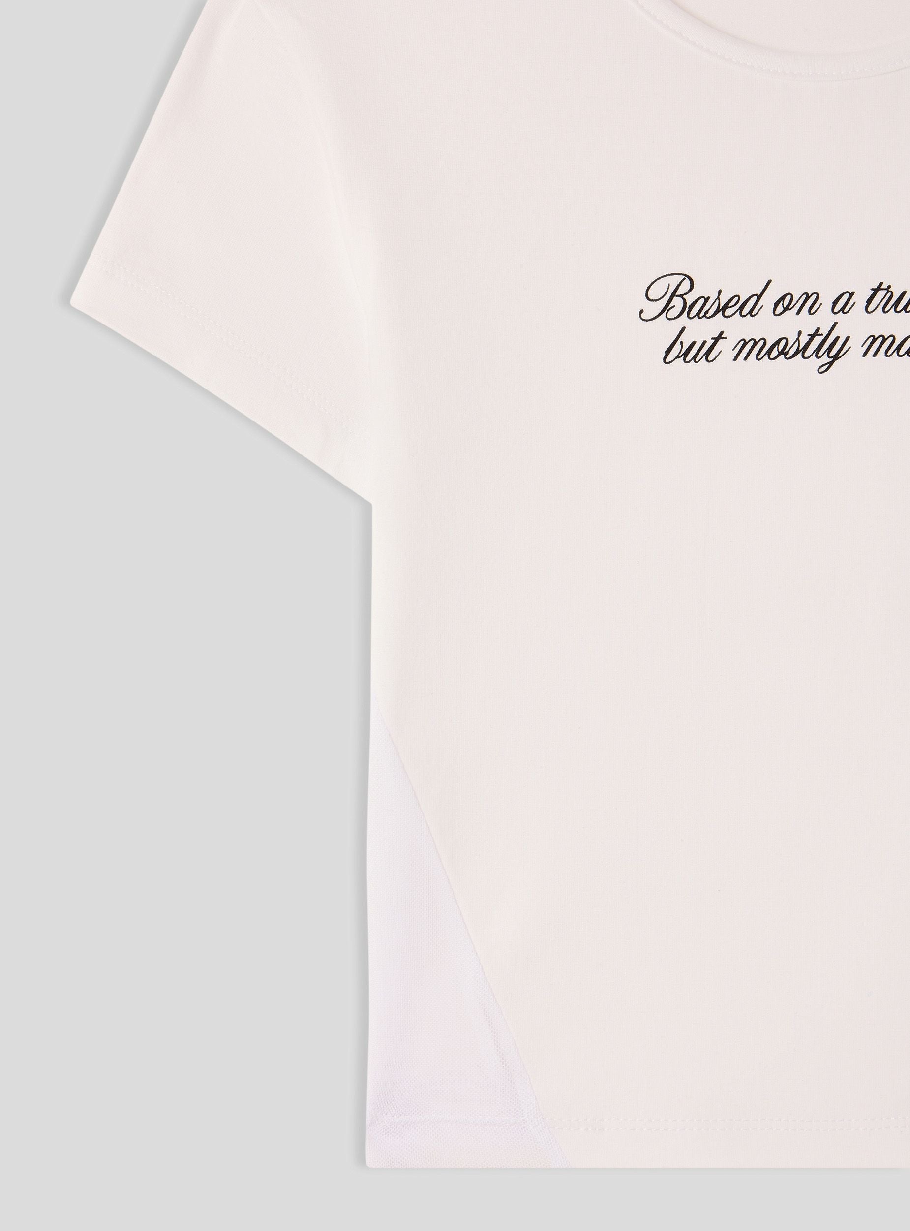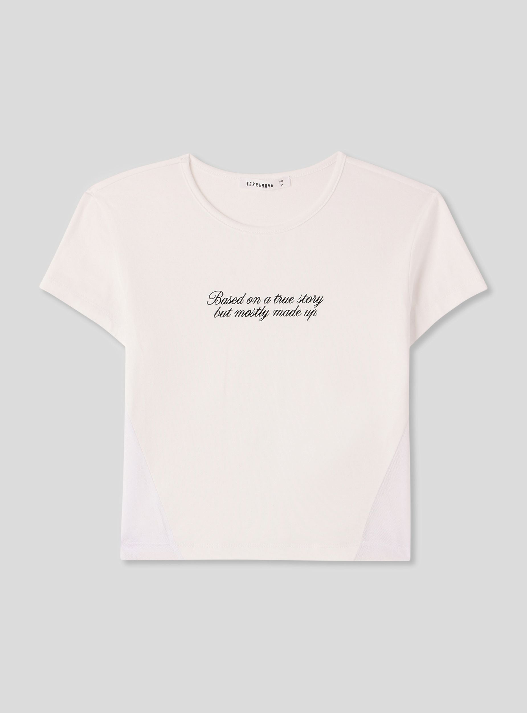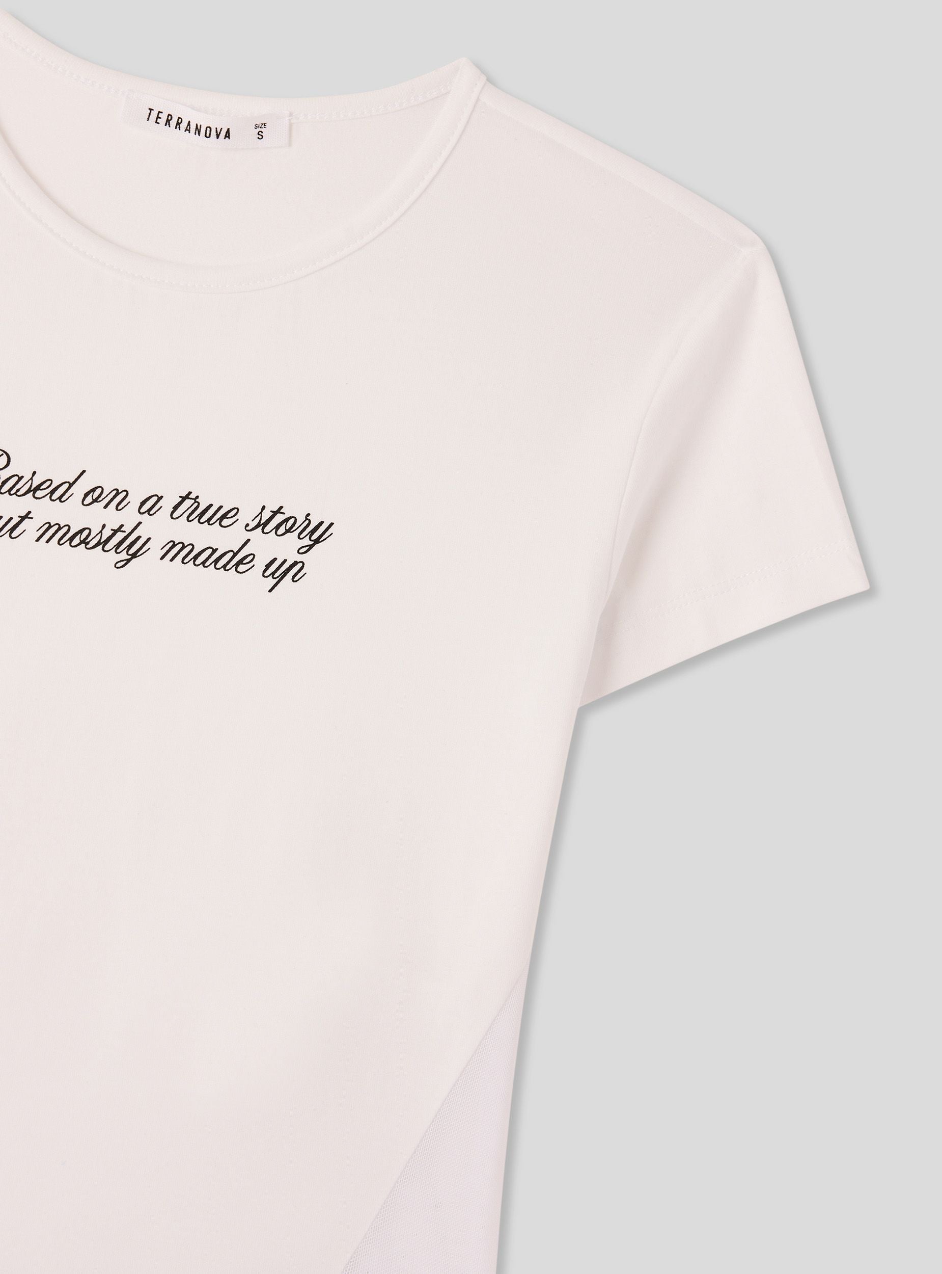 Maglietta da donna con scritta frontale e inserti laterali in tulle. Ideale per un look casual e moderno. Perfetta per abbinamenti con jeans, pantaloni o gonne, questa maglietta si distingue per il suo design versatile e confortevole. Adatta per il tempo libero e per creare outfit dinamici e alla moda.Dettagli