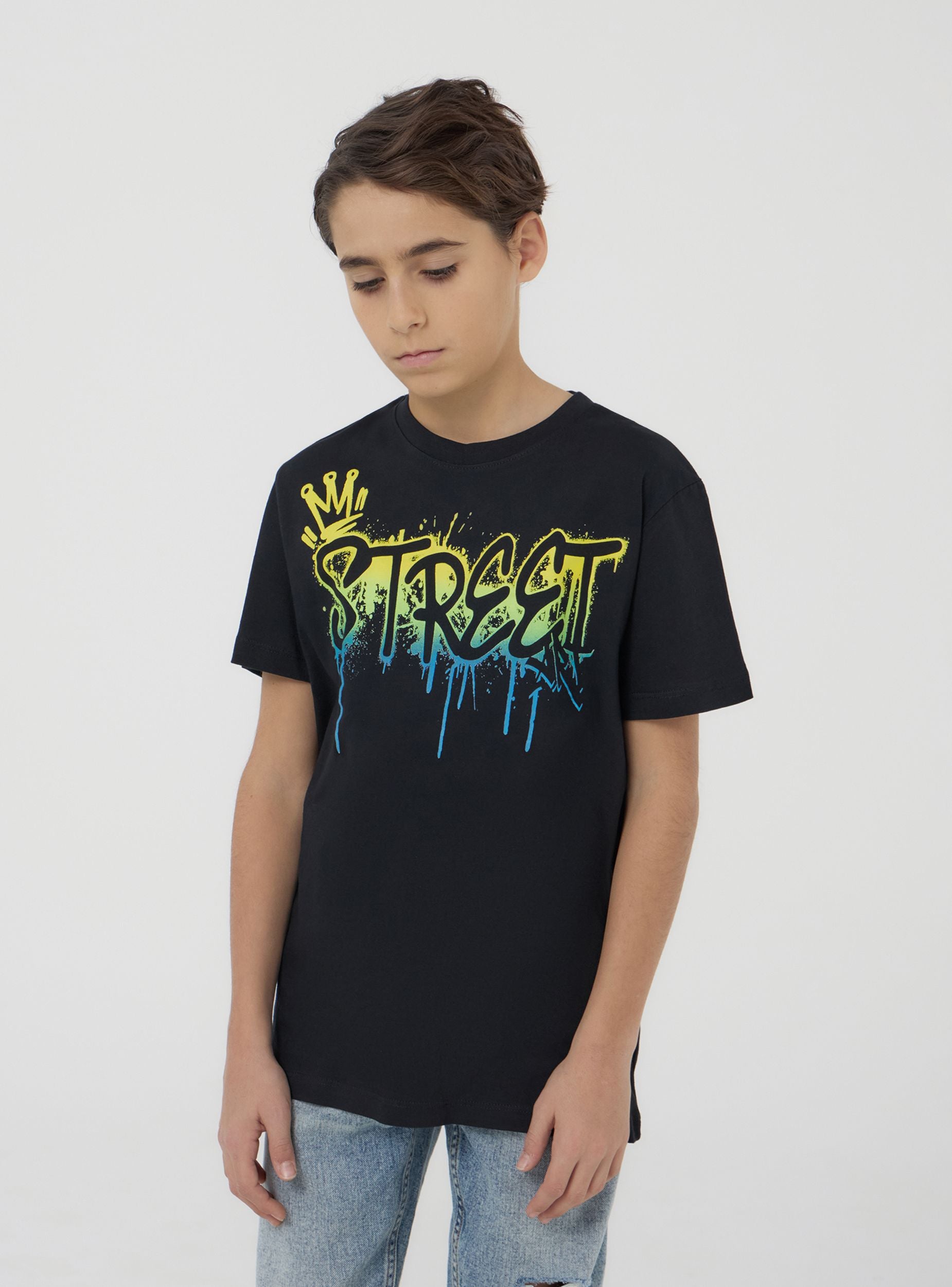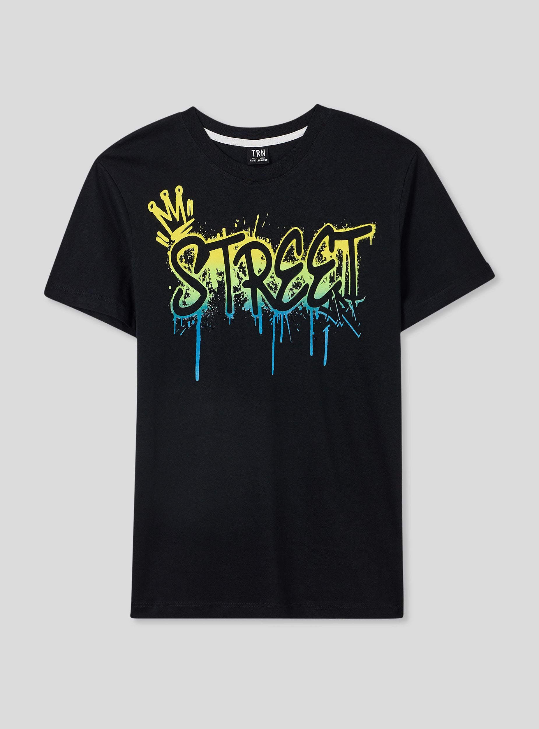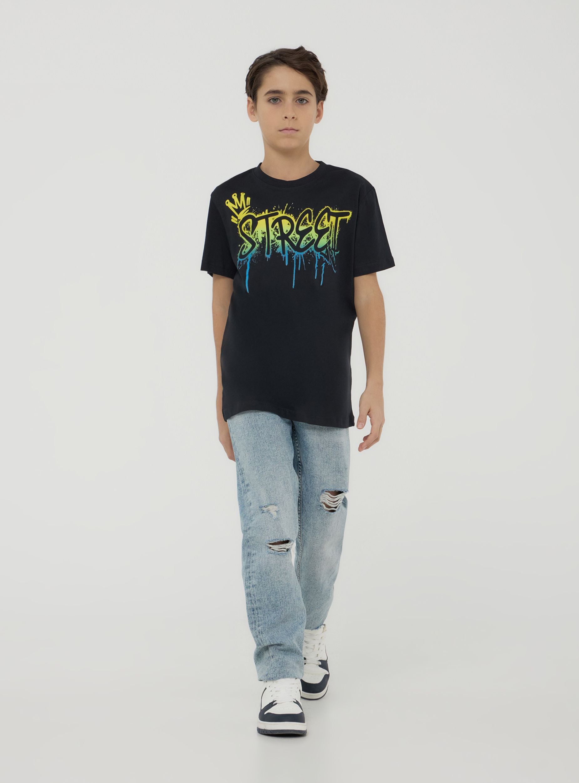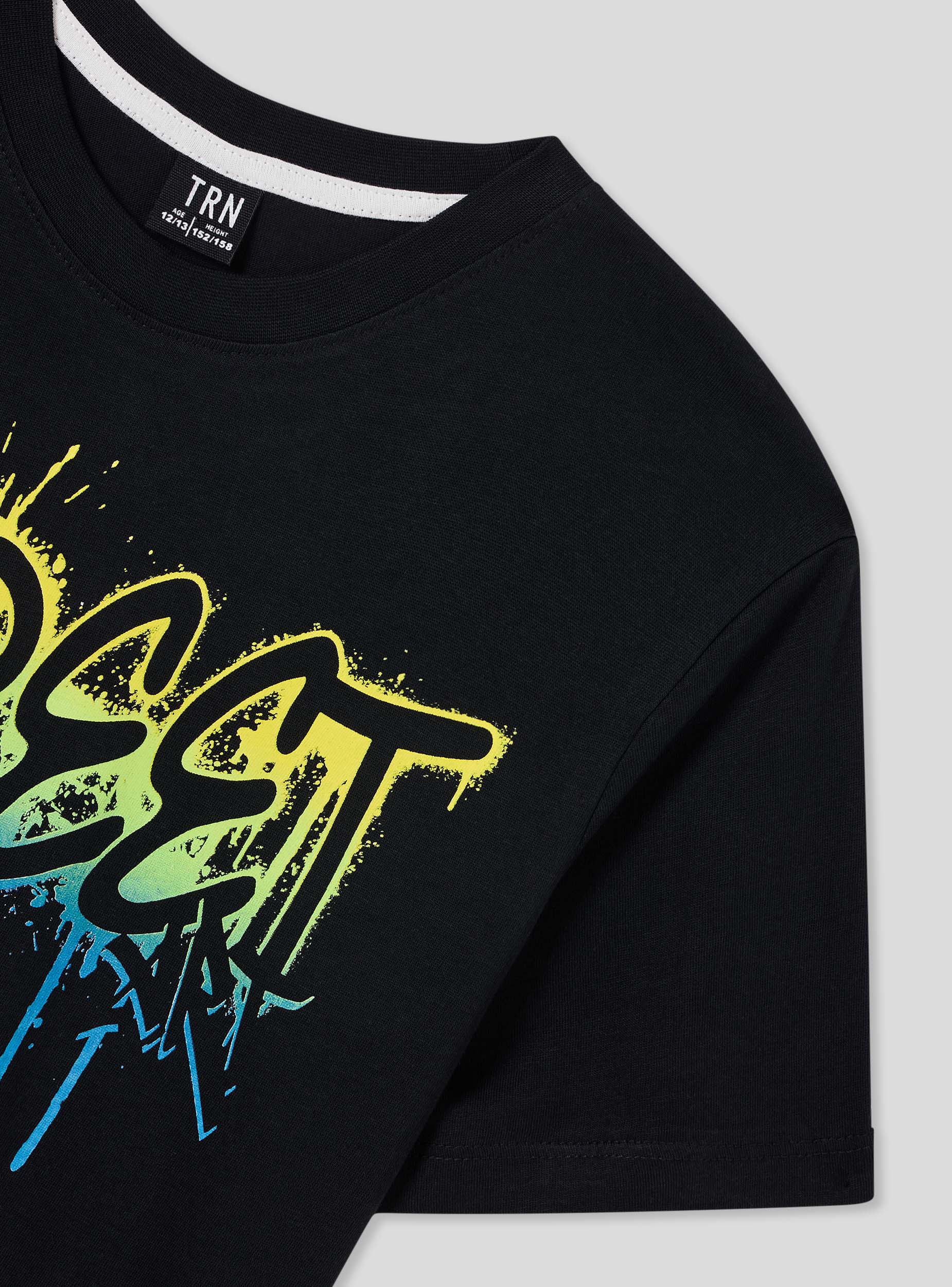 Maglietta da bambino perfetta per un look casual e originale, ideale per il tempo libero e le giornate all'aperto. Con maniche corte e girocollo, si distingue per la scritta dallo stile graffiti che aggiunge un tocco urban e dinamico al capo. Una scelta comoda e di tendenza per ogni occasione informale.Dettagli