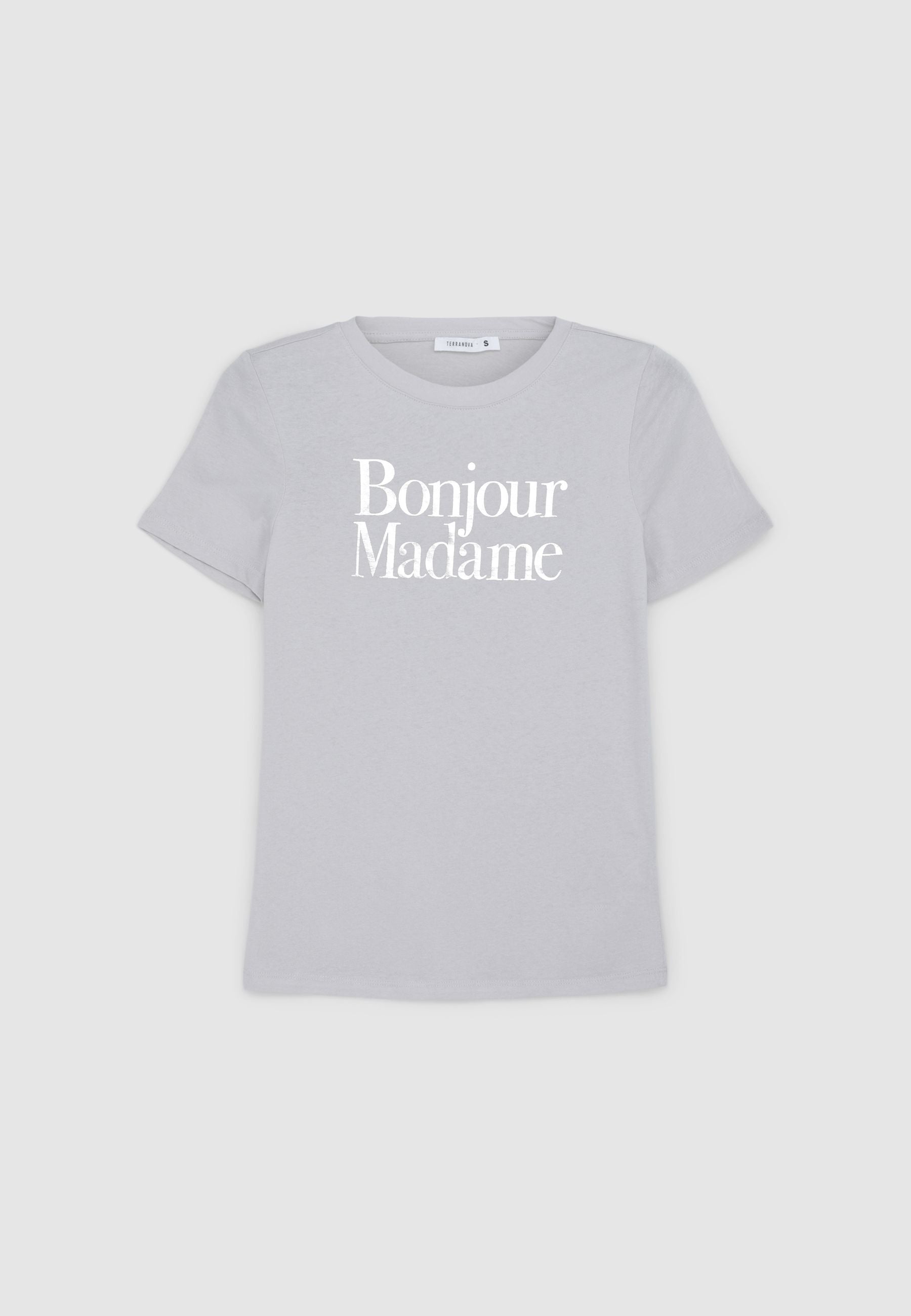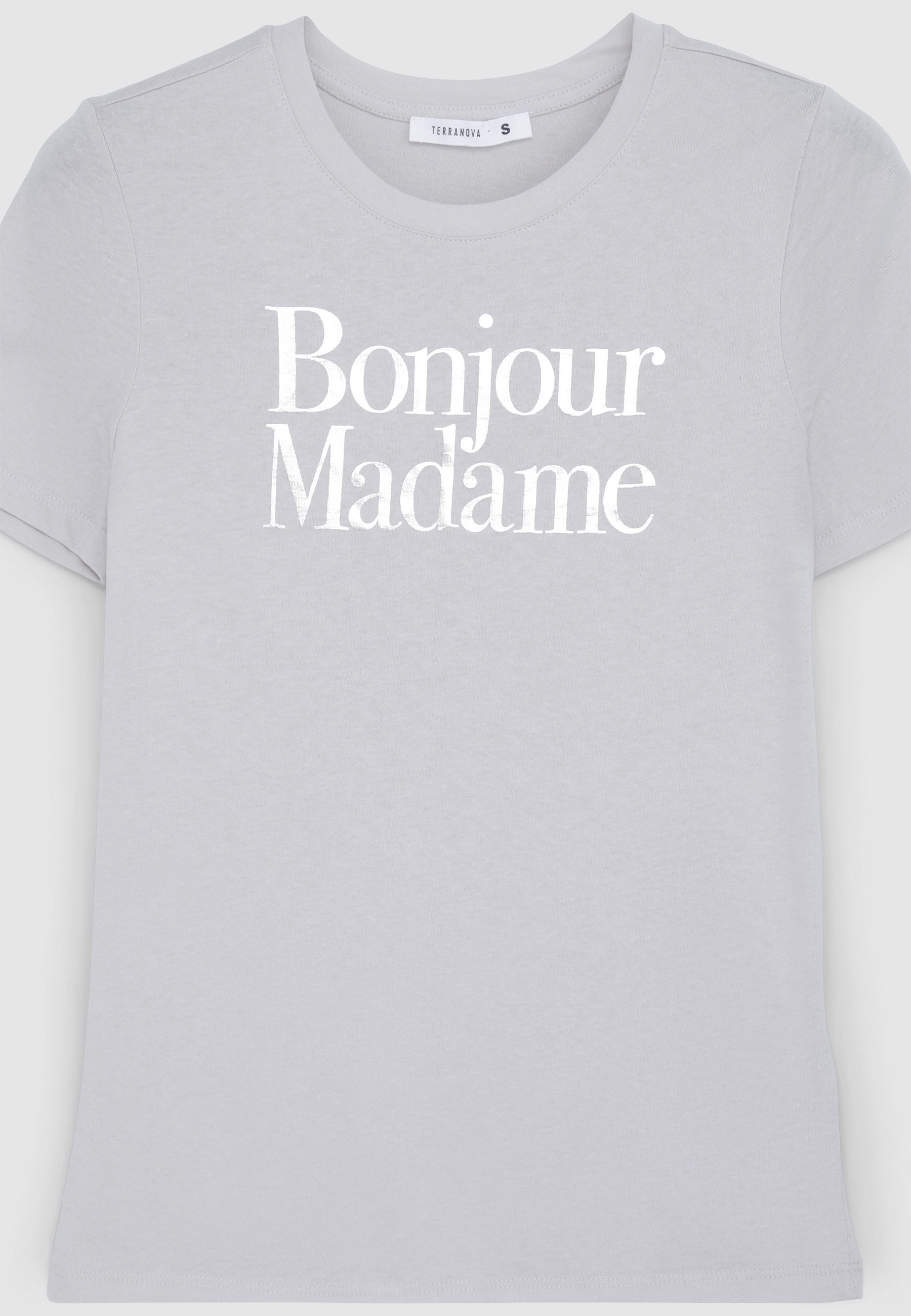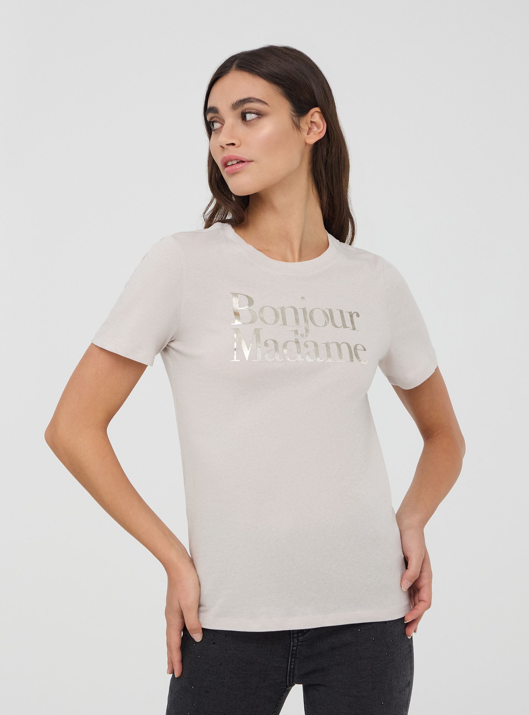 Maglietta da donna con scritta laminata sul davanti, caratterizzata da un design minimal e raffinato. Il modello presenta un girocollo e maniche corte, perfetto per un look casual ma con un tocco di eleganza grazie al dettaglio lucido della scritta. Ideale per essere abbinata sia con jeans che con pantaloni più formali per un outfit versatile.Dettagli