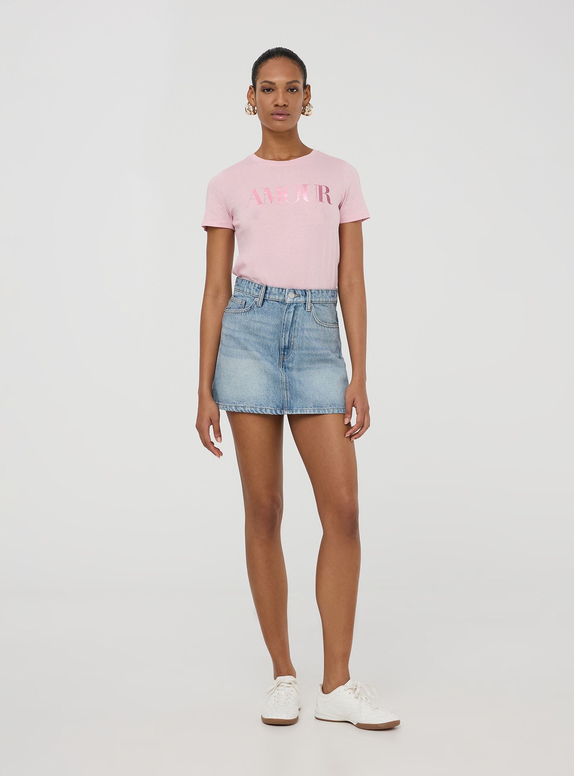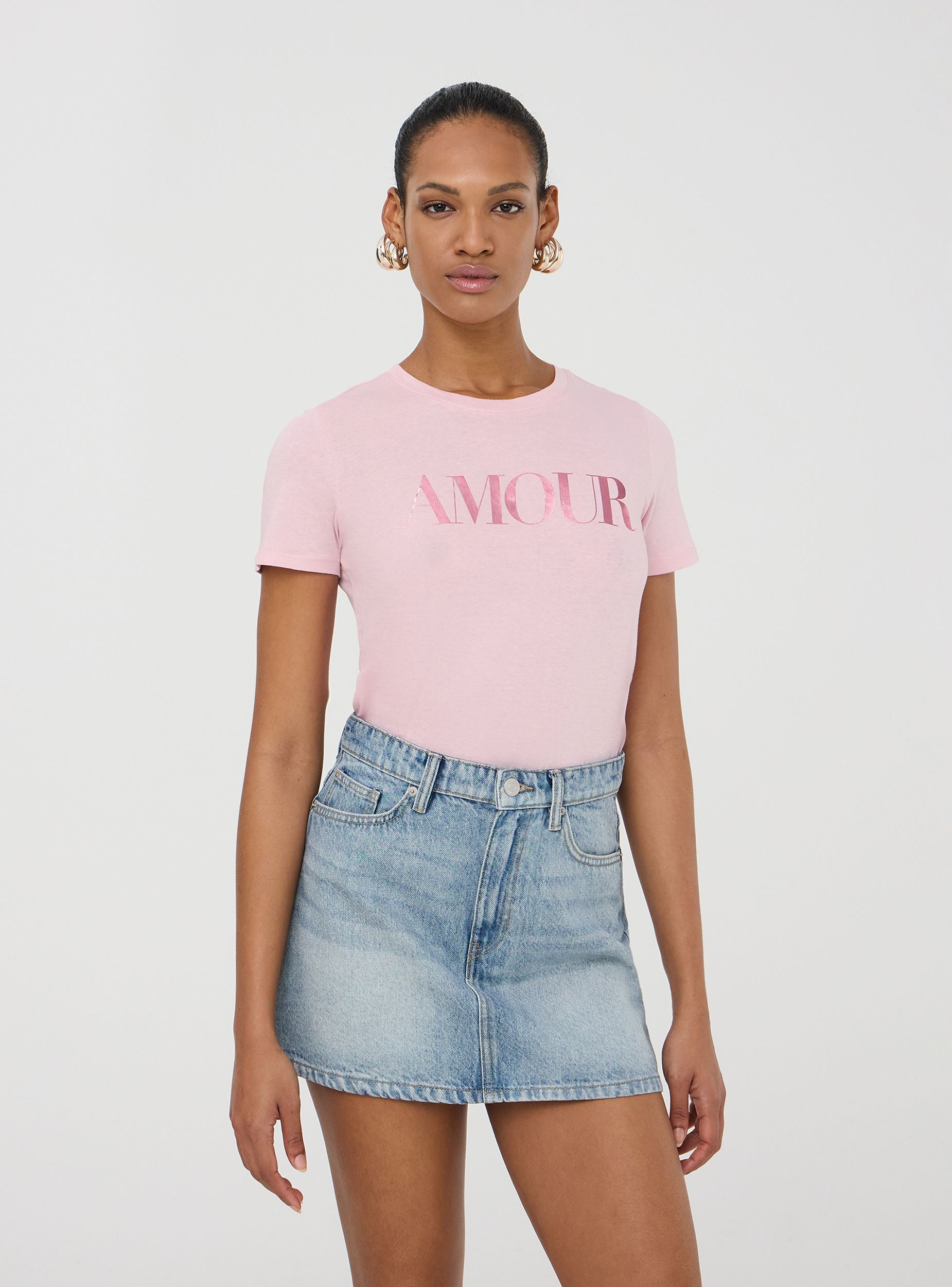 Maglietta da donna con scritta laminata sul davanti, caratterizzata da un design minimal e raffinato. Il modello presenta un girocollo e maniche corte, perfetto per un look casual ma con un tocco di eleganza grazie al dettaglio lucido della scritta. Ideale per essere abbinata sia con jeans che con pantaloni più formali per un outfit versatile.Dettagli