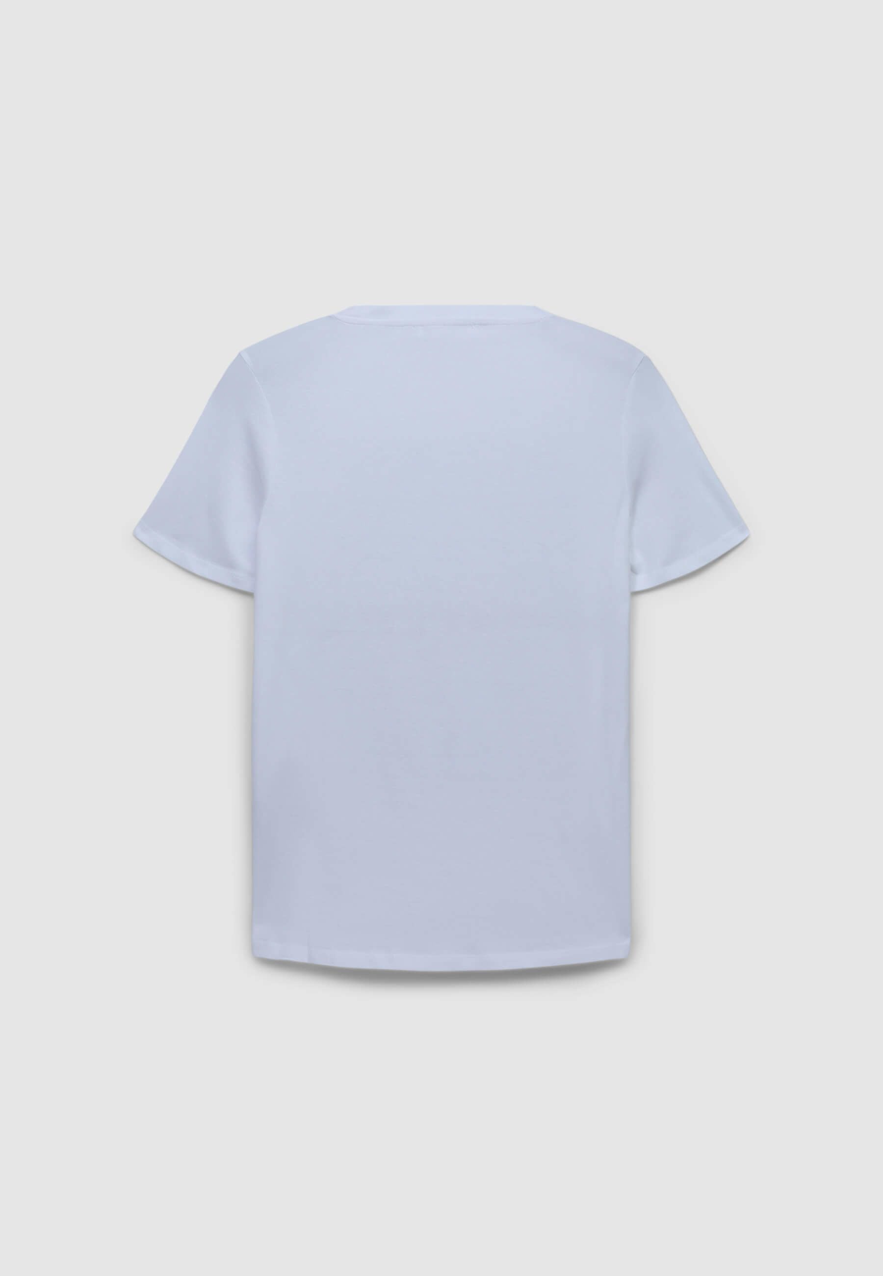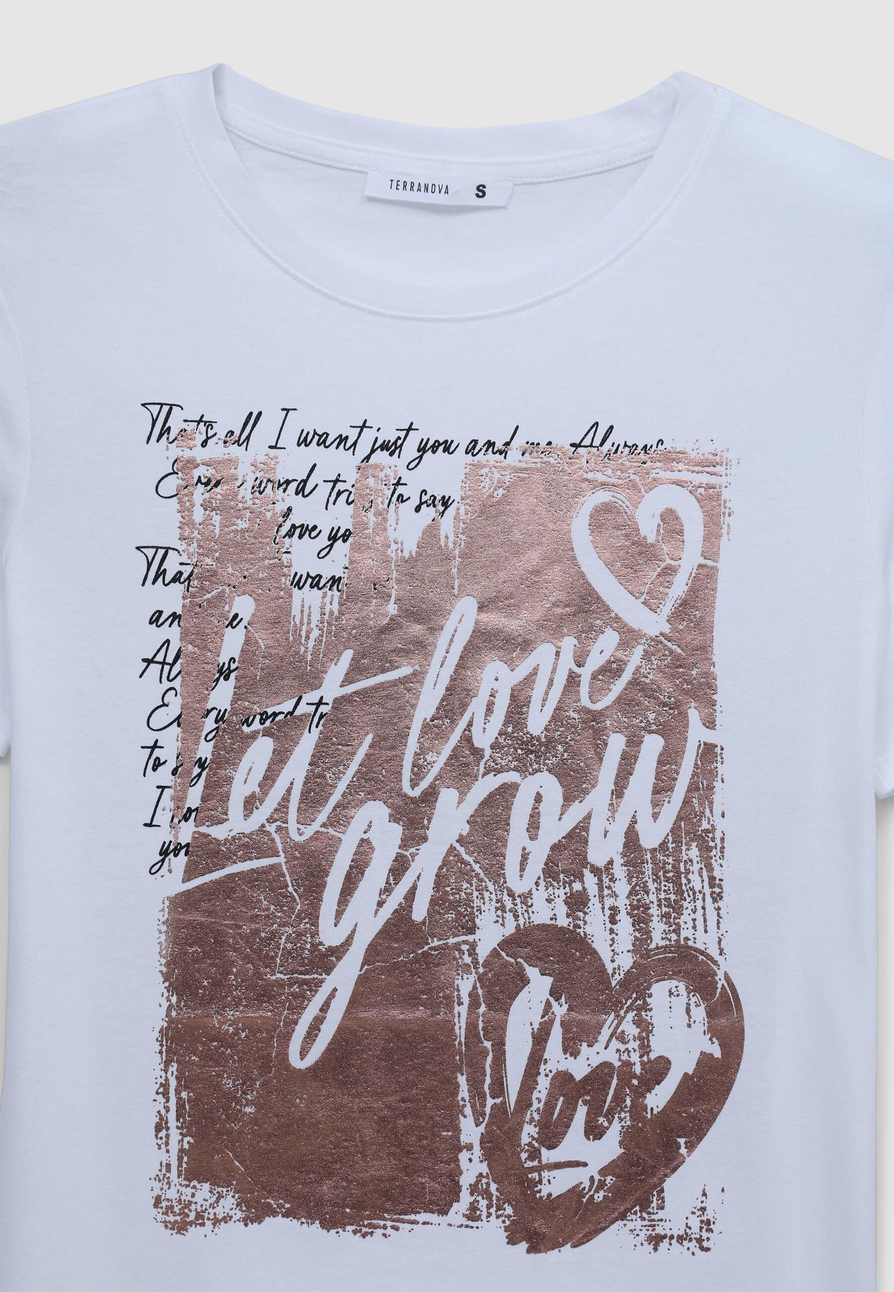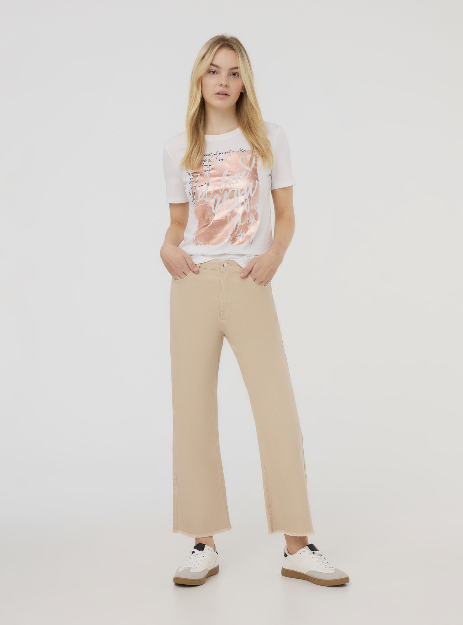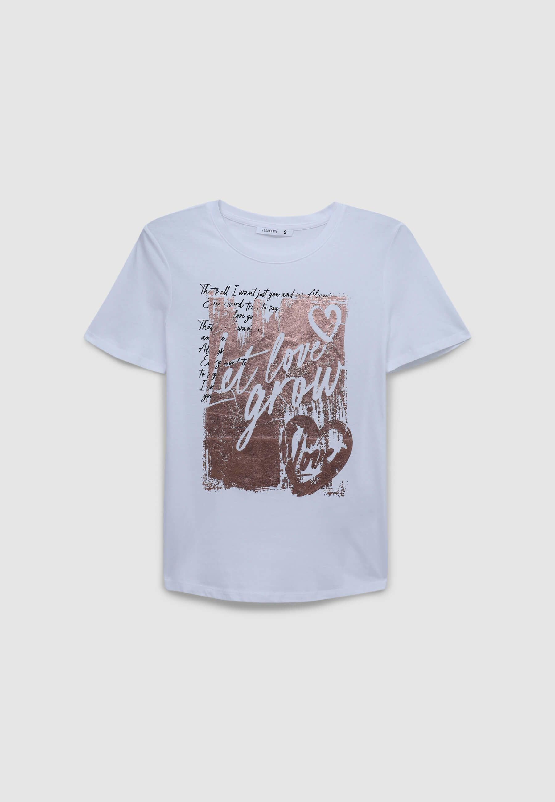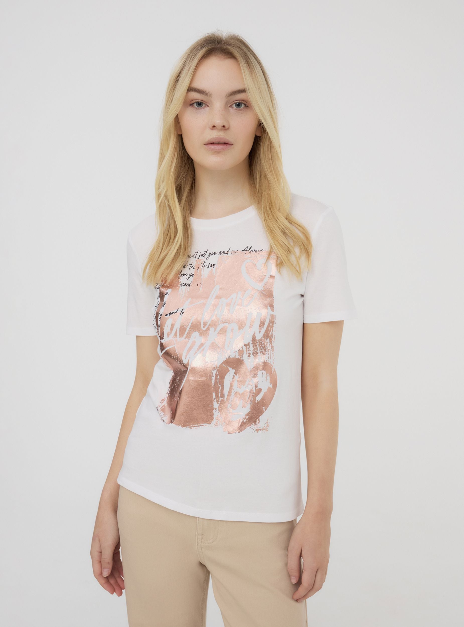Maglietta da donna con girocollo e maniche corte, caratterizzata da una stampa laminata sul davanti che dona un tocco di brillantezza al design. La stampa presenta una fantasia creativa che rende il capo ideale per chi ama esprimere la propria personalità attraverso dettagli unici. Perfetta per essere abbinata a look casual, come jeans o pantaloni leggeri, per un outfit comodo ma ricercato.Dettagli