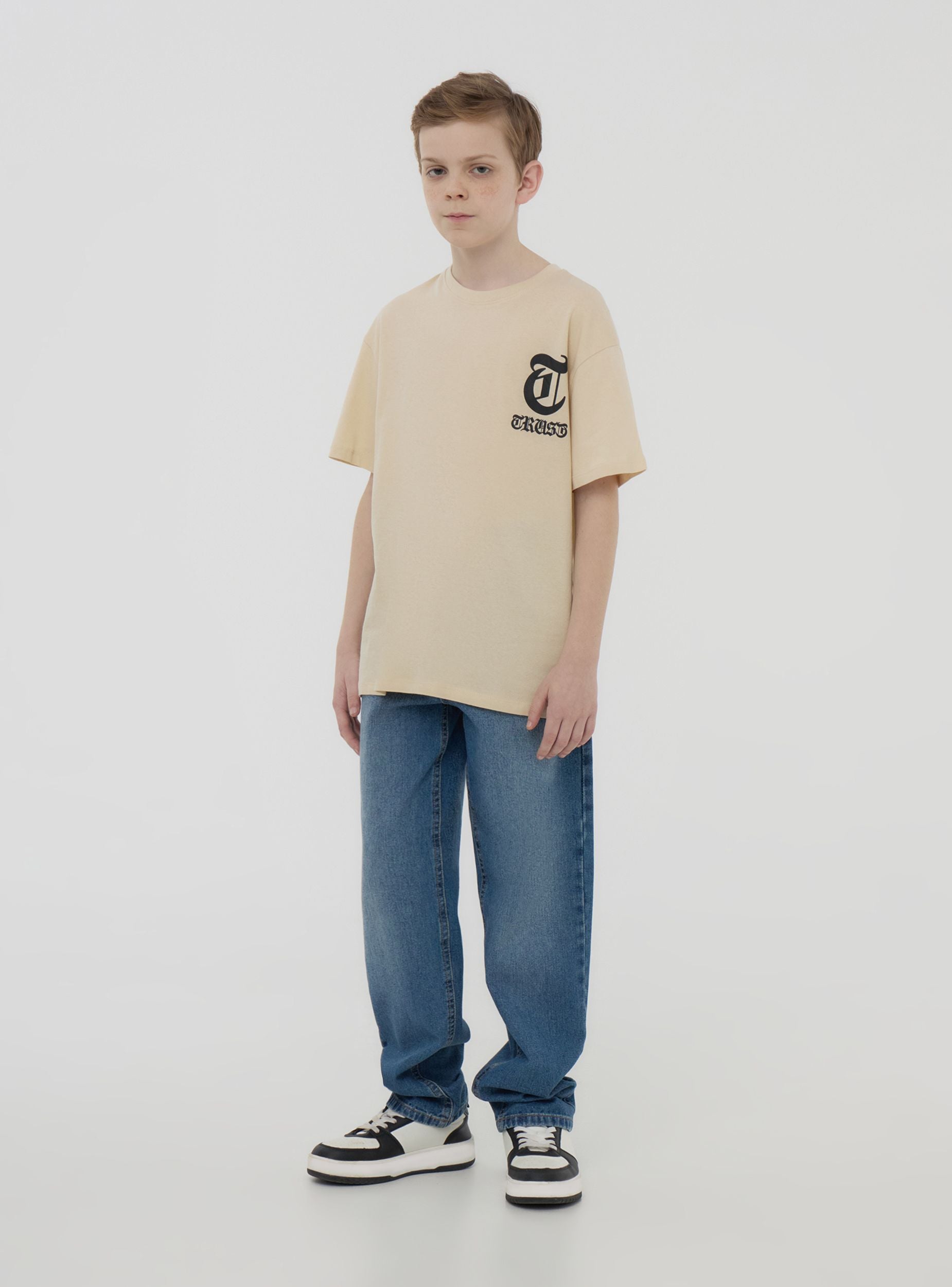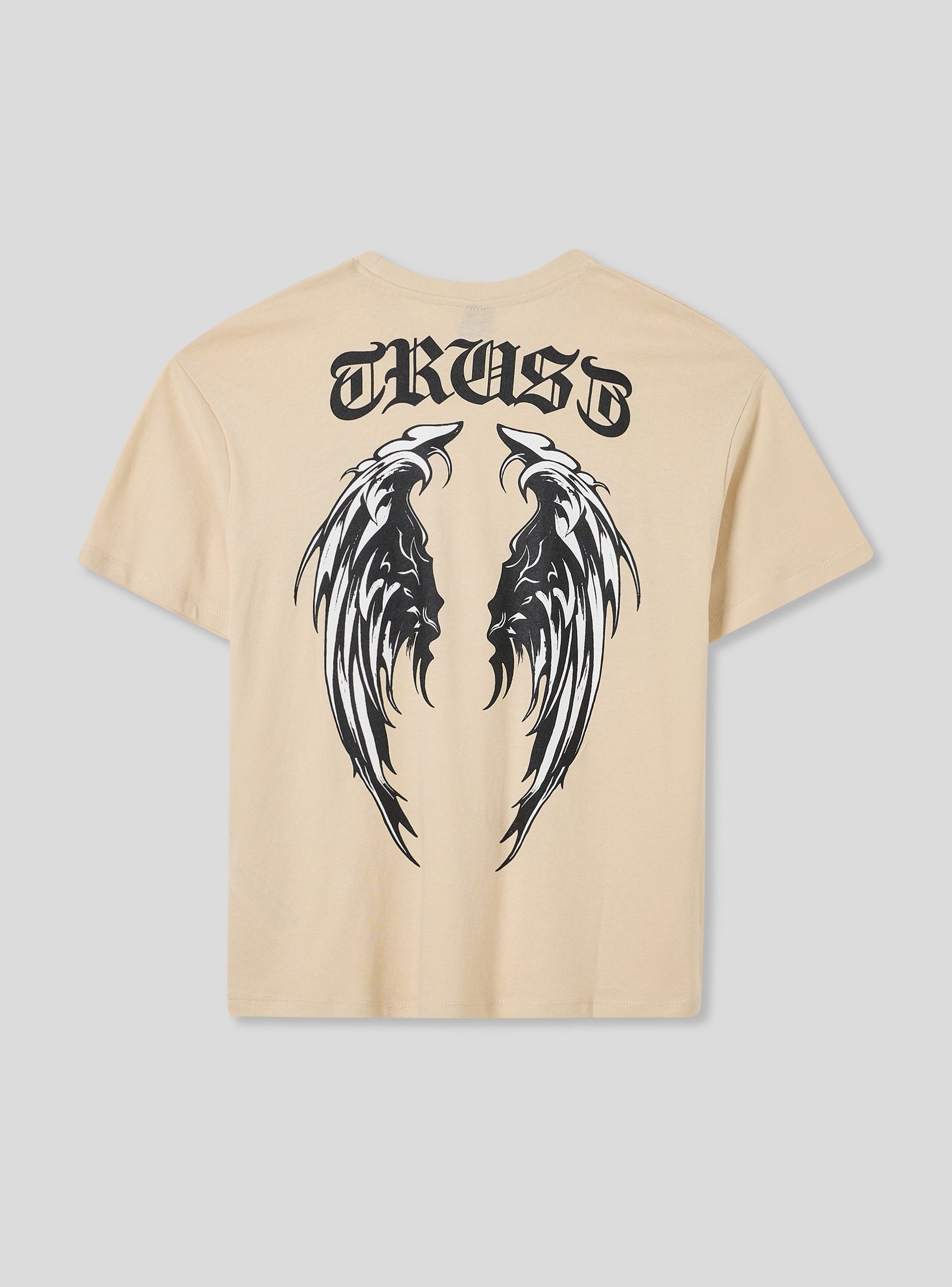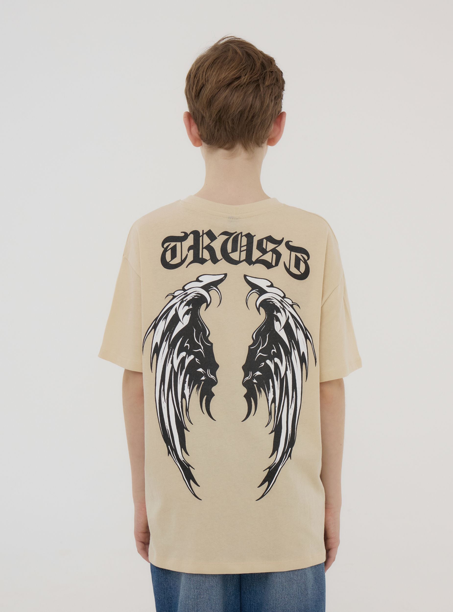 Maglietta da bambino con maniche corte e girocollo, ideale per un look urban e casual. La stampa presenta ali decorative sul retro e scritte che aggiungono un tocco distintivo e moderno. Perfetta per momenti di svago o per esprimere uno stile deciso, questa maglietta combina comfort e originalità.Dettagli