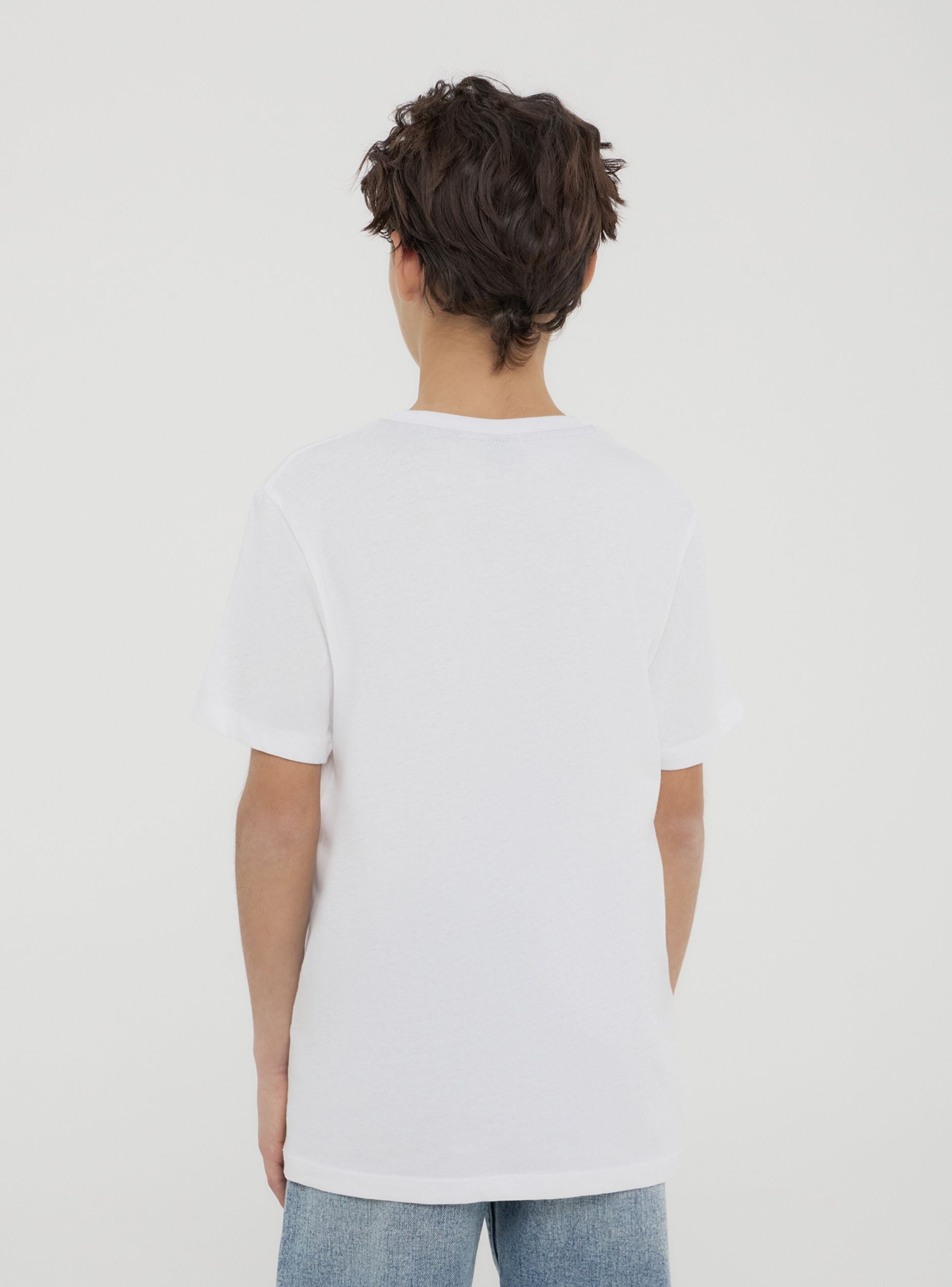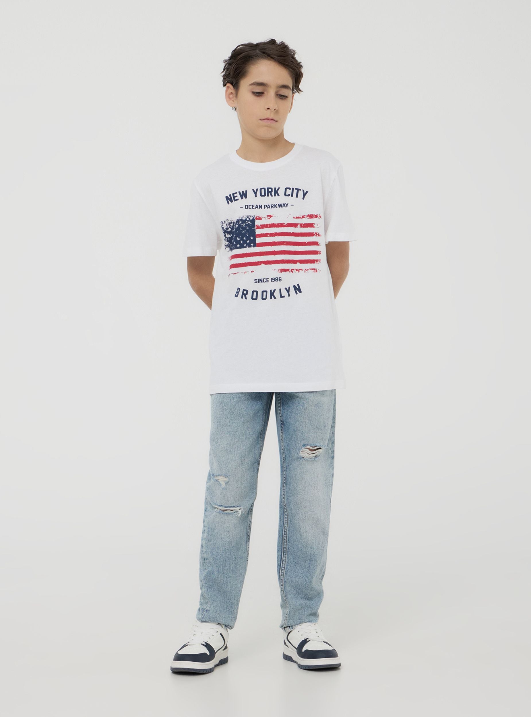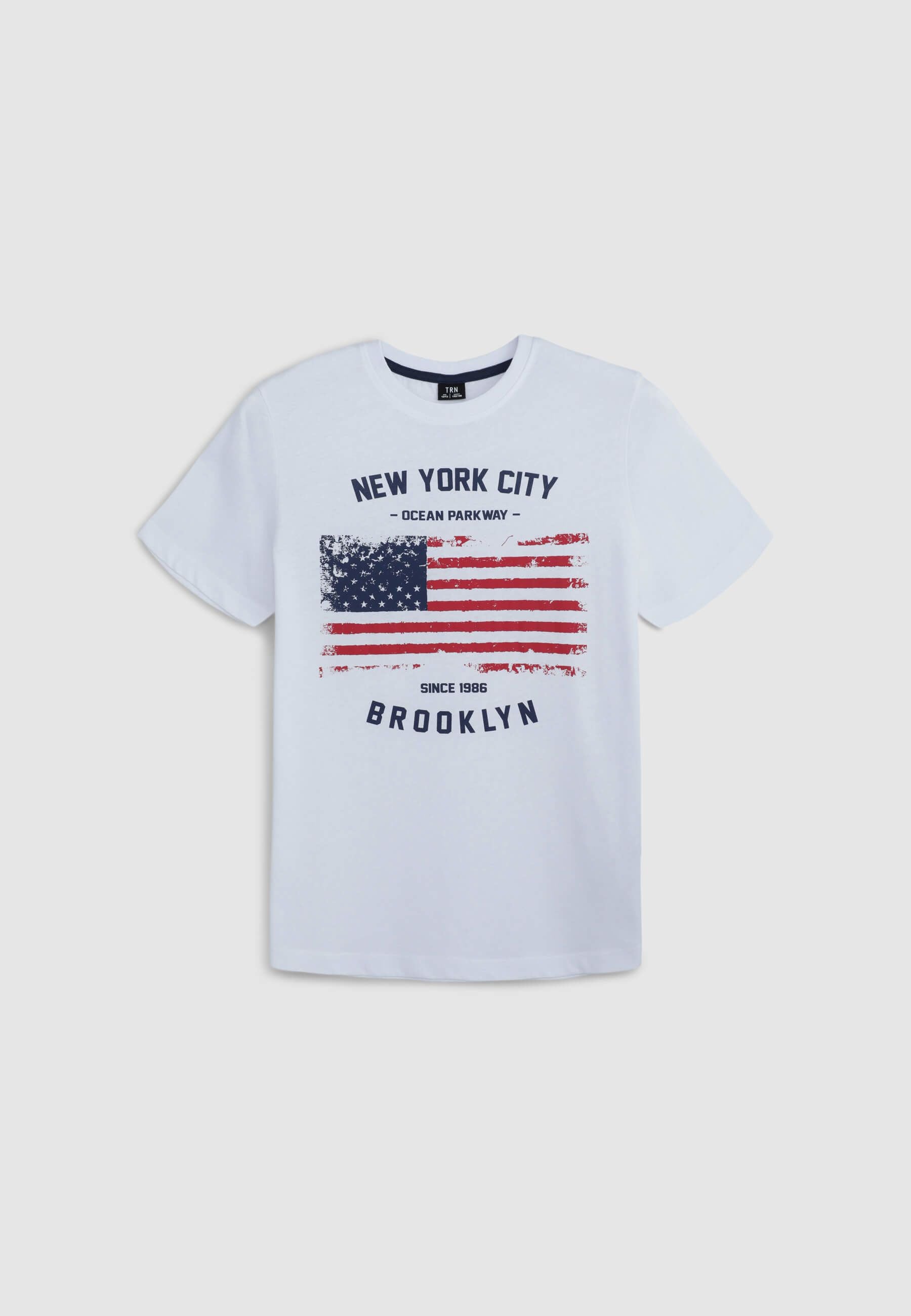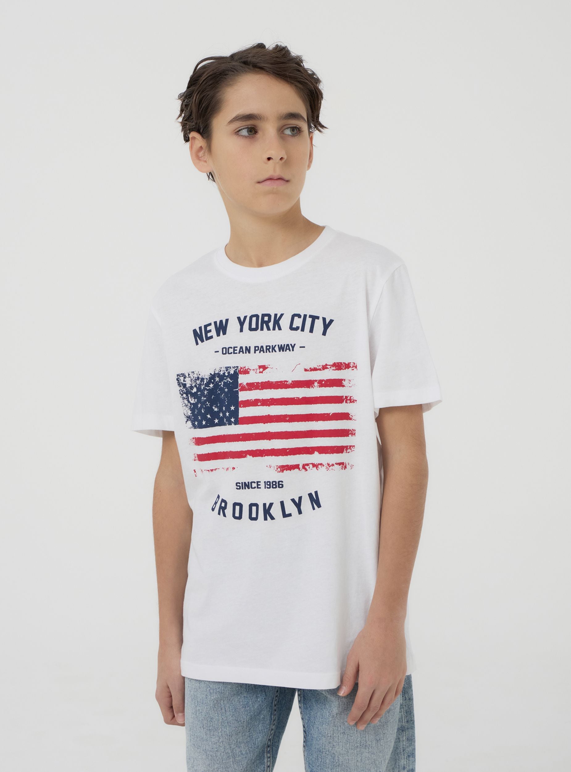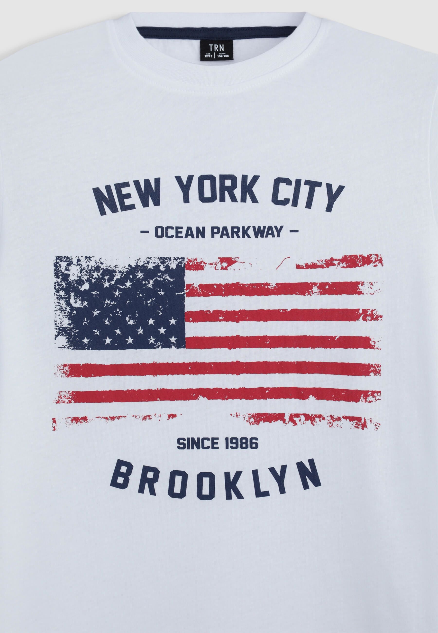Maglietta da bambino con maniche corte e girocollo, perfetta per un look casual e moderno. Presenta una stampa con bandiera al centro, accompagnata da scritte decorative. Ideale per aggiungere un tocco di originalità al guardaroba quotidiano dei più piccoli.Dettagli