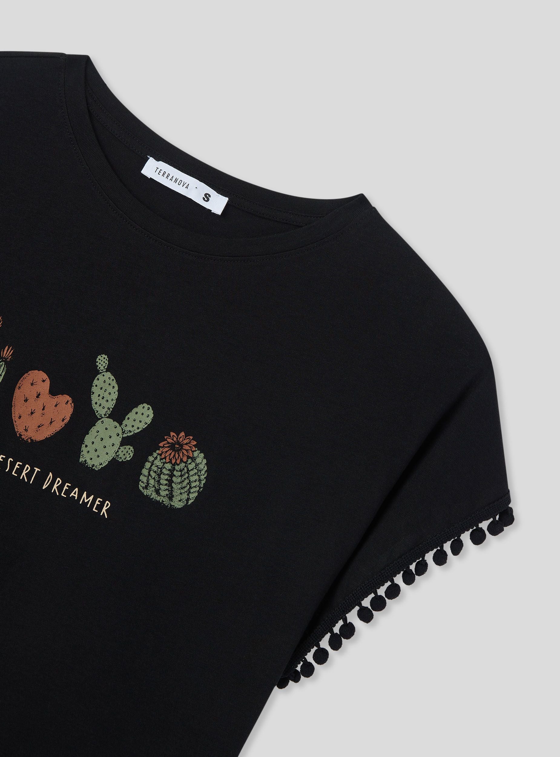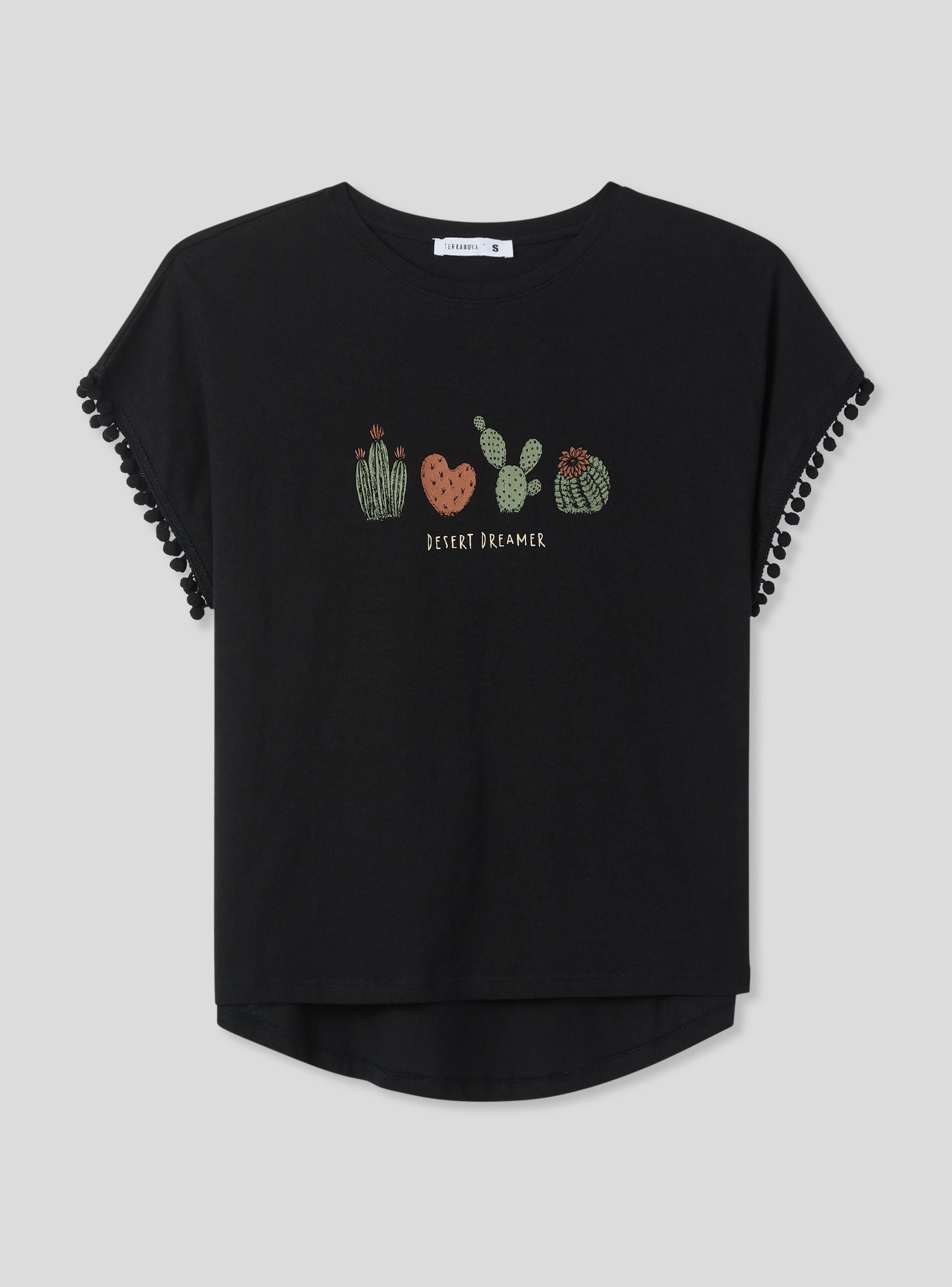 Maglietta da donna con girocollo e maniche corte, caratterizzata da una simpatica stampa con cactus e scritta al centro del petto. La grafica dona un tocco originale e allegro, perfetto per uno stile casual e rilassato. Grazie al design semplice, questa t-shirt è ideale per essere abbinata a jeans o pantaloni per un look quotidiano comodo e alla moda.Dettagli