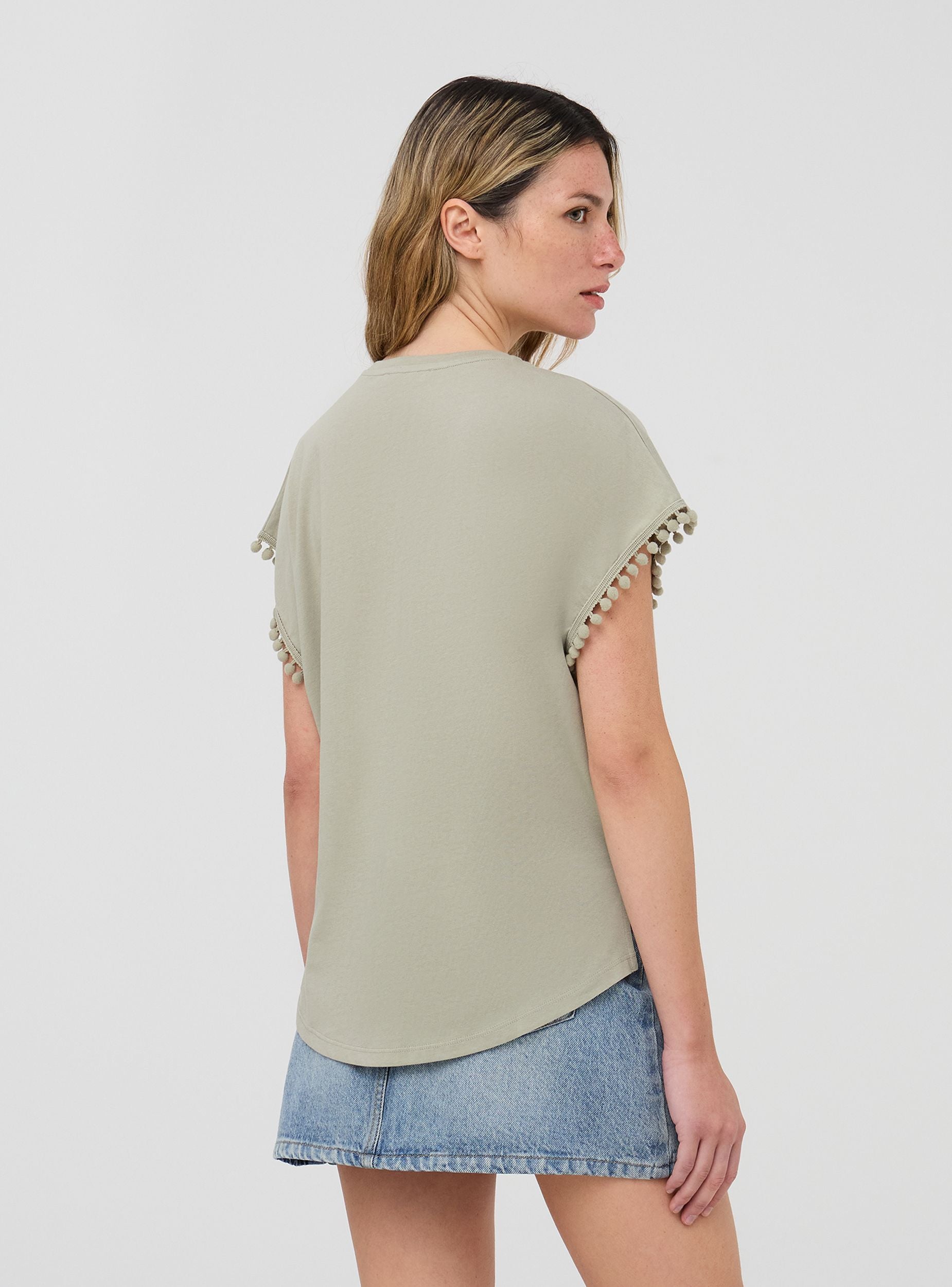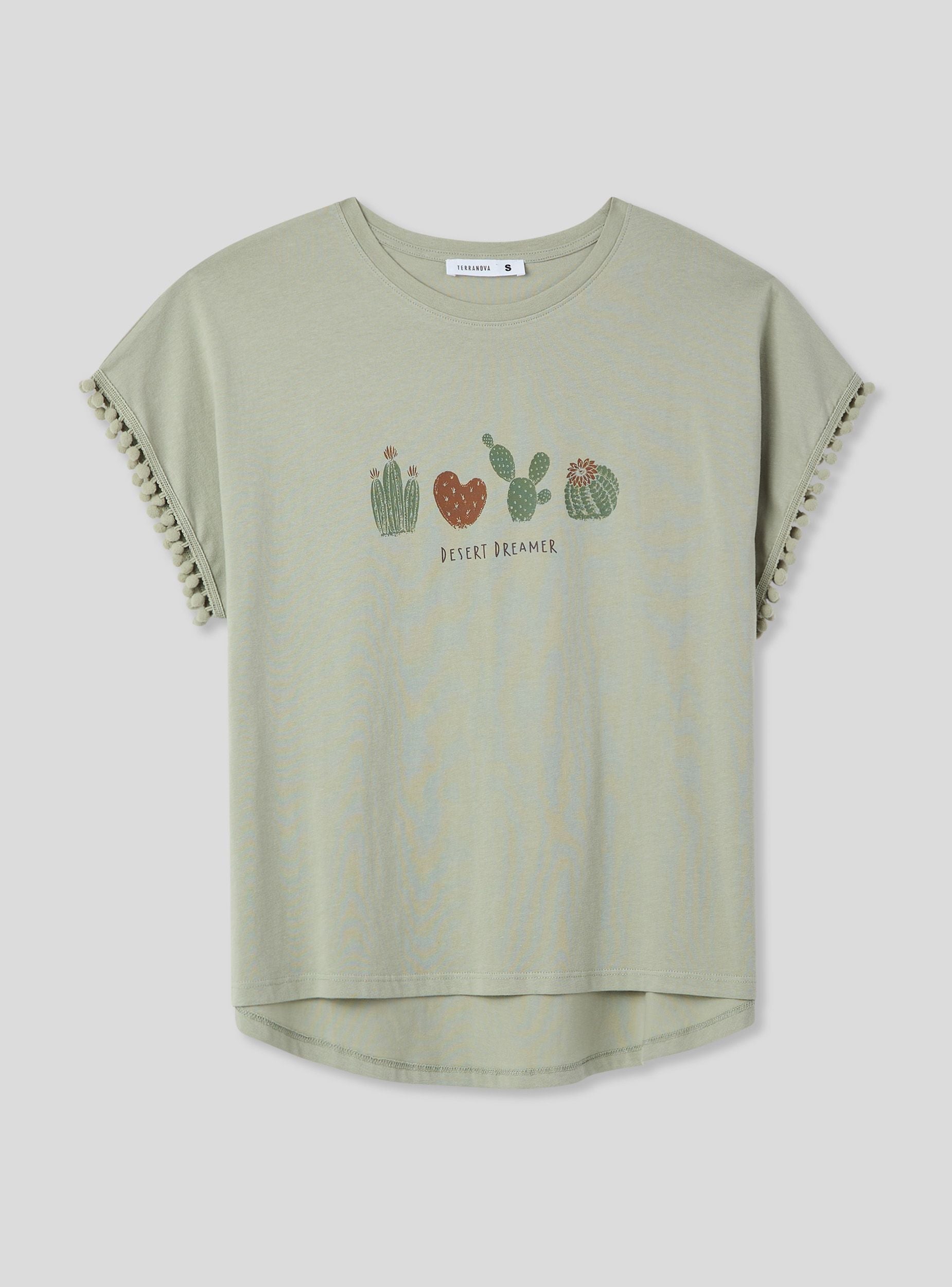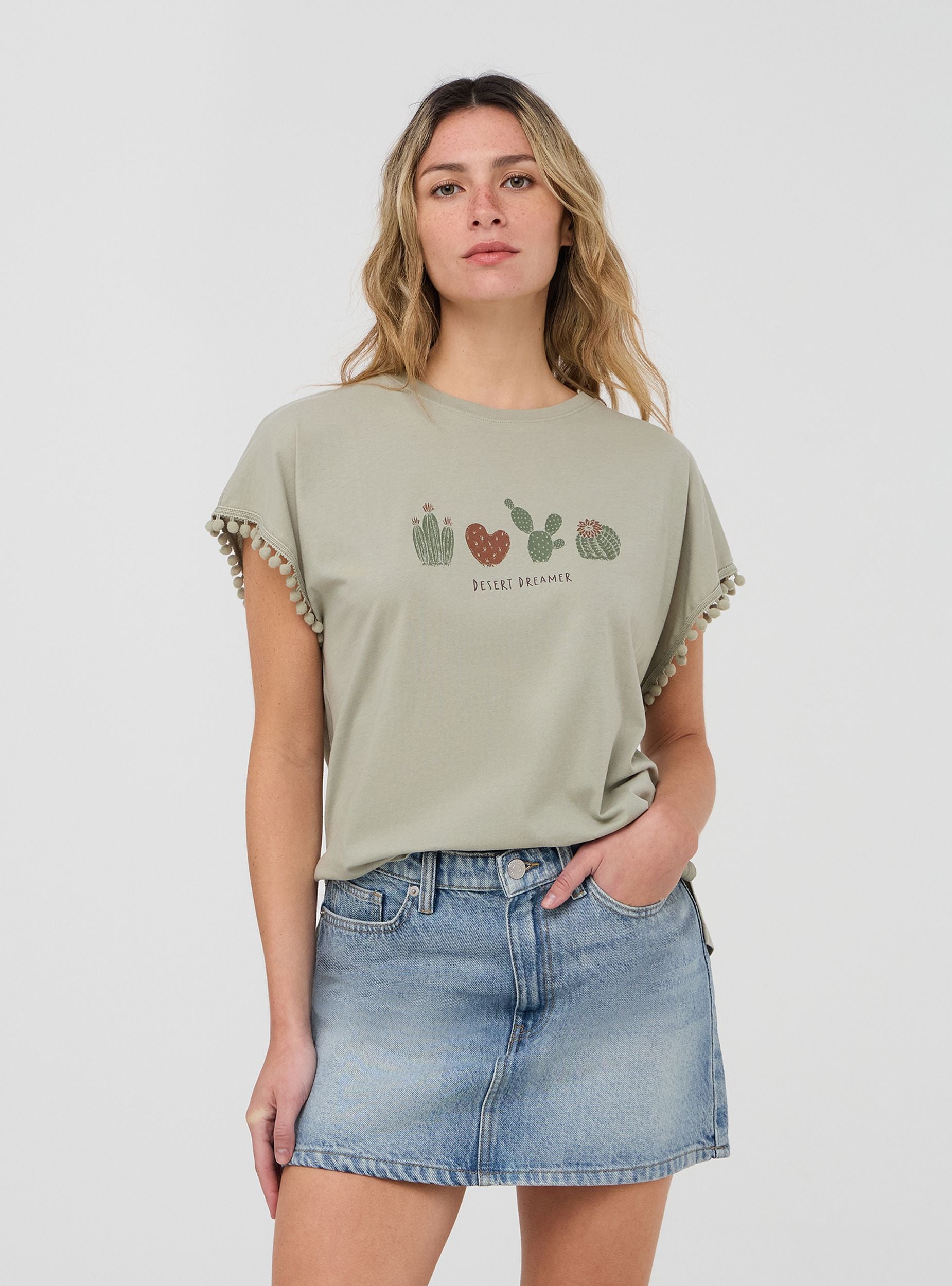 Maglietta da donna con girocollo e maniche corte, caratterizzata da una simpatica stampa con cactus e scritta al centro del petto. La grafica dona un tocco originale e allegro, perfetto per uno stile casual e rilassato. Grazie al design semplice, questa t-shirt è ideale per essere abbinata a jeans o pantaloni per un look quotidiano comodo e alla moda.Dettagli