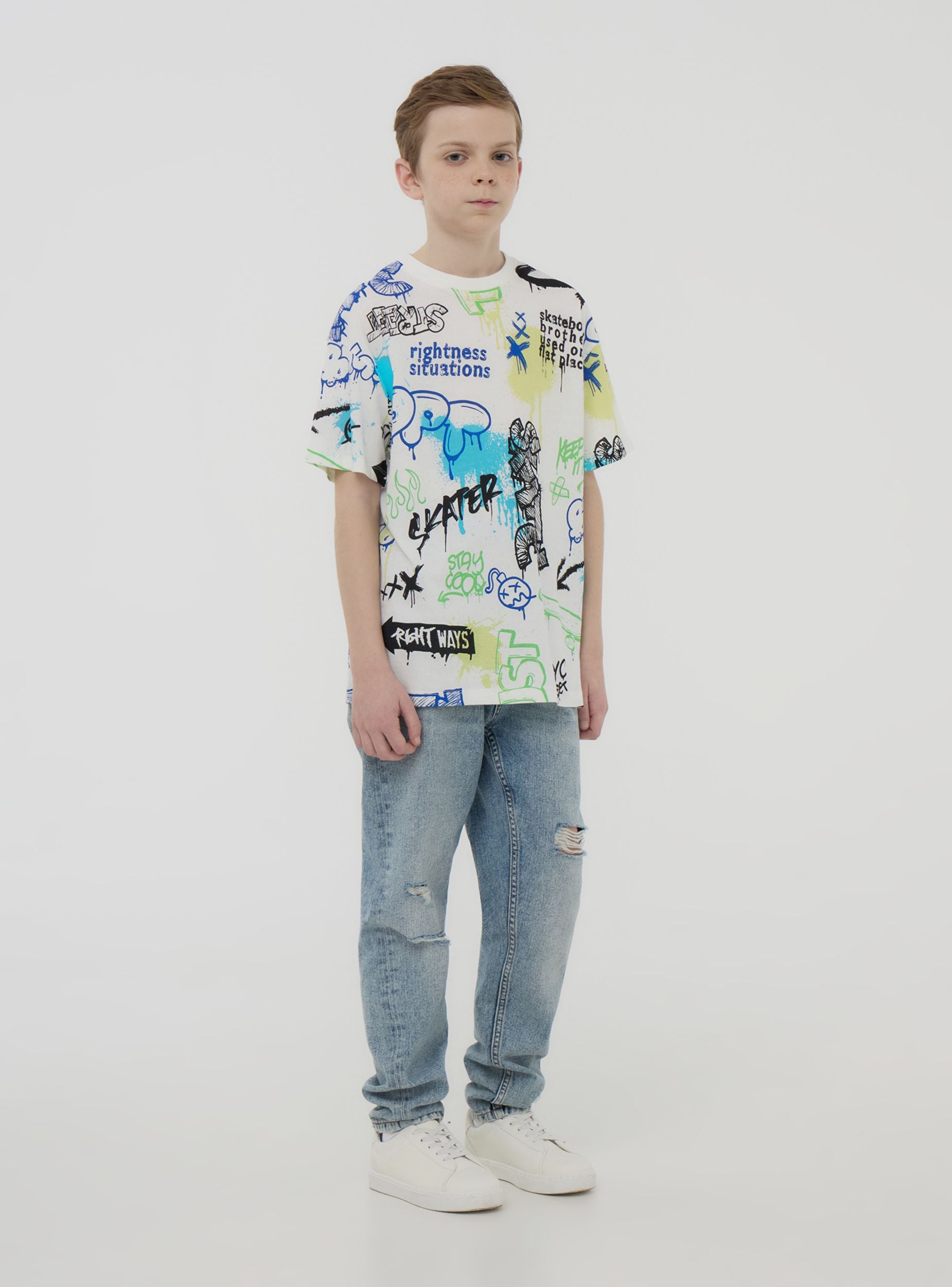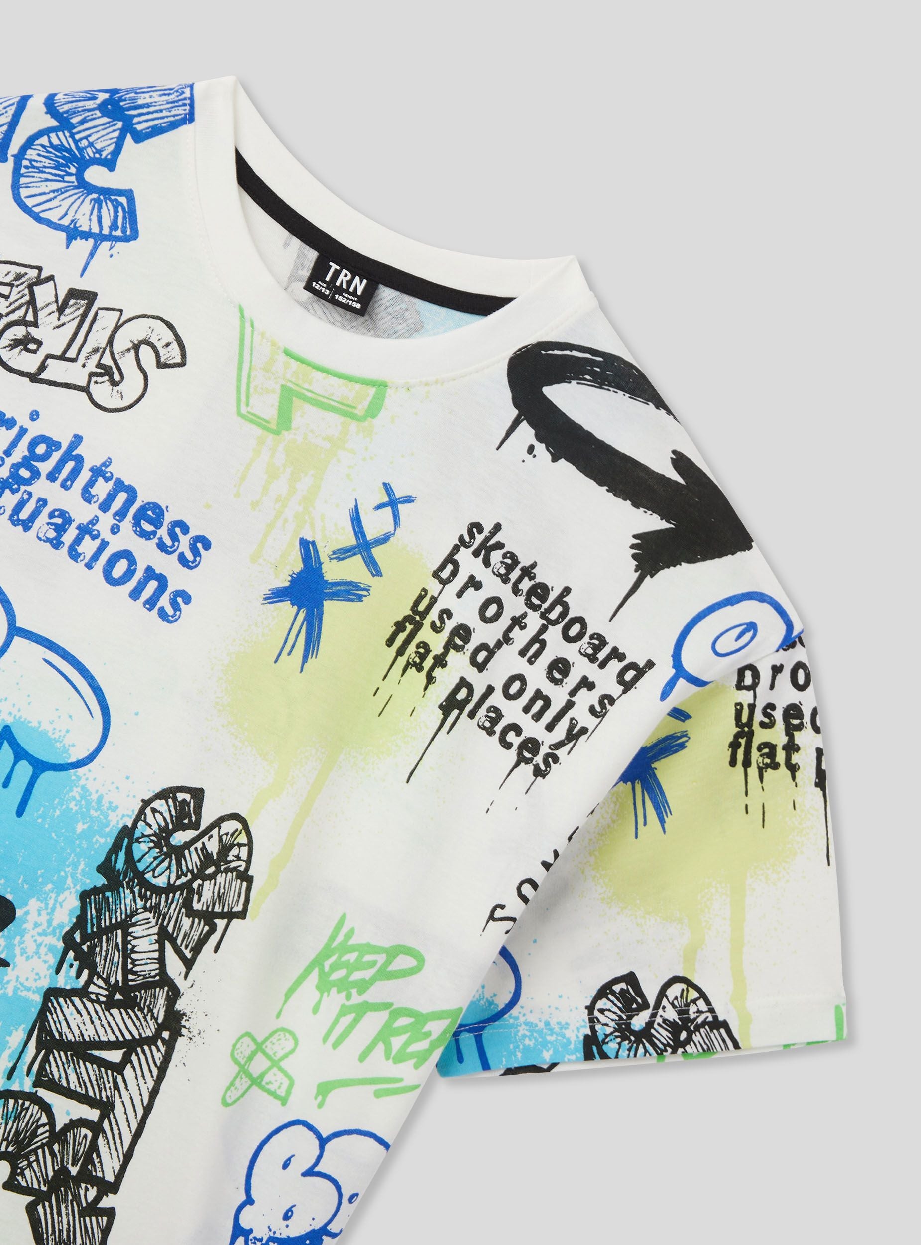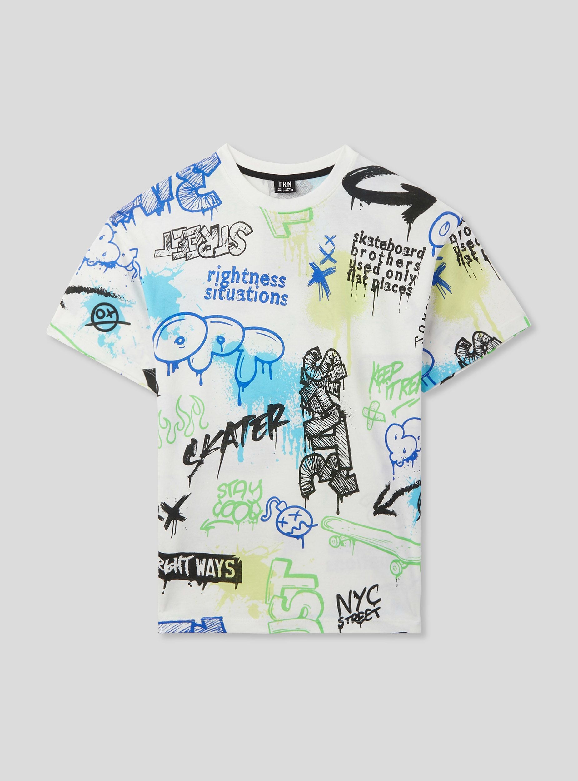 Maglietta da bambino con maniche corte e girocollo, caratterizzata da una vivace stampa all-over in stile graffiti. Perfetta per un look urban e moderno, questa maglietta offre un design energico e originale, ideale per i piccoli amanti dello streetwear e dello stile metropolitano.Dettagli