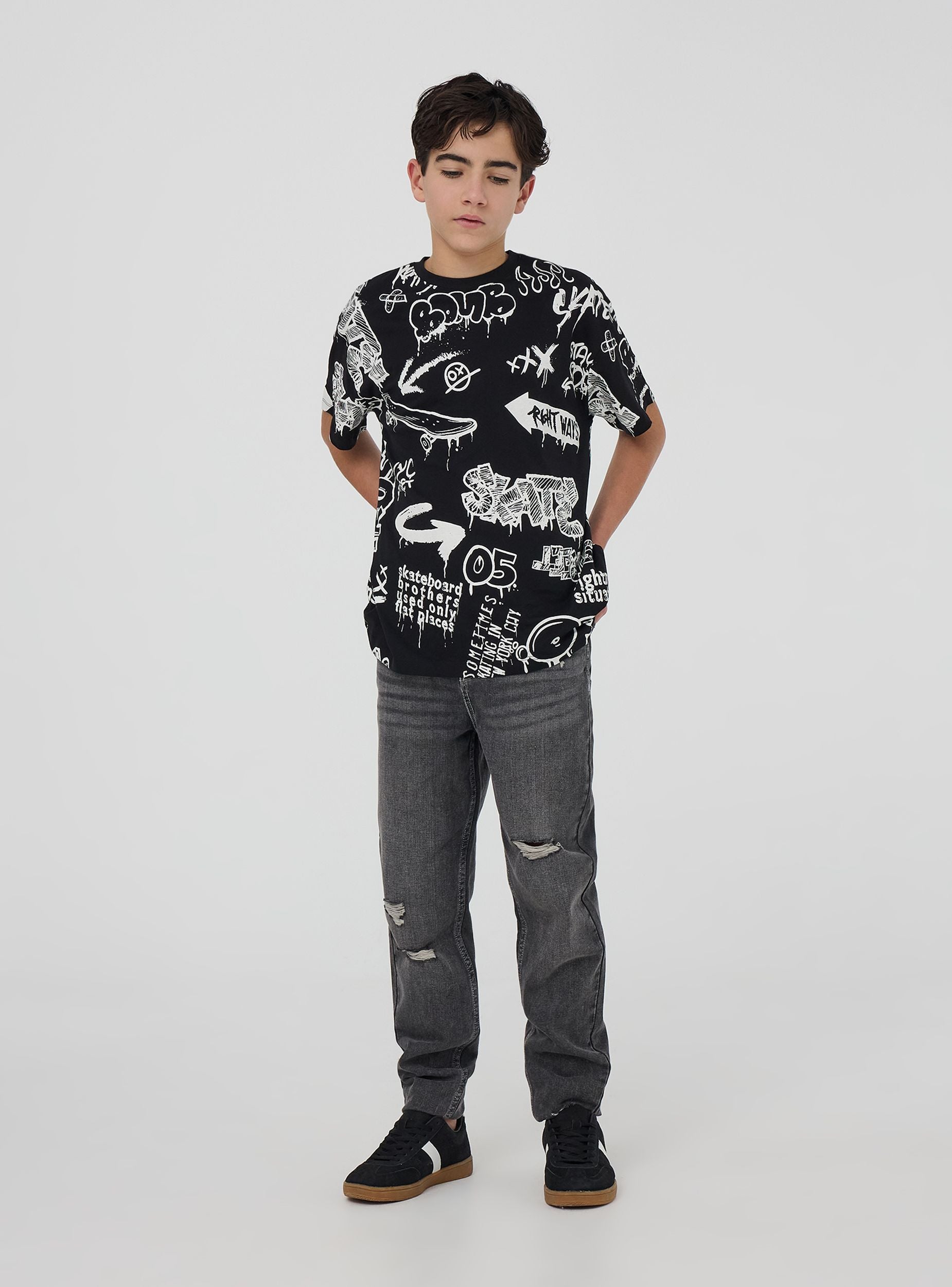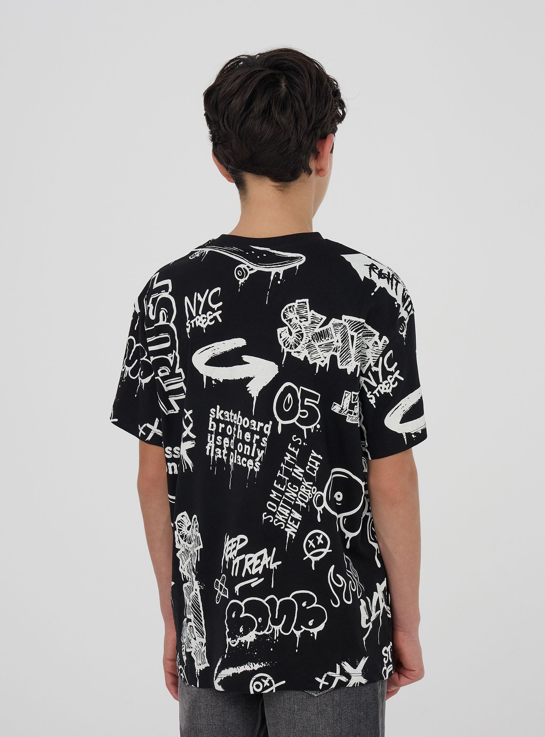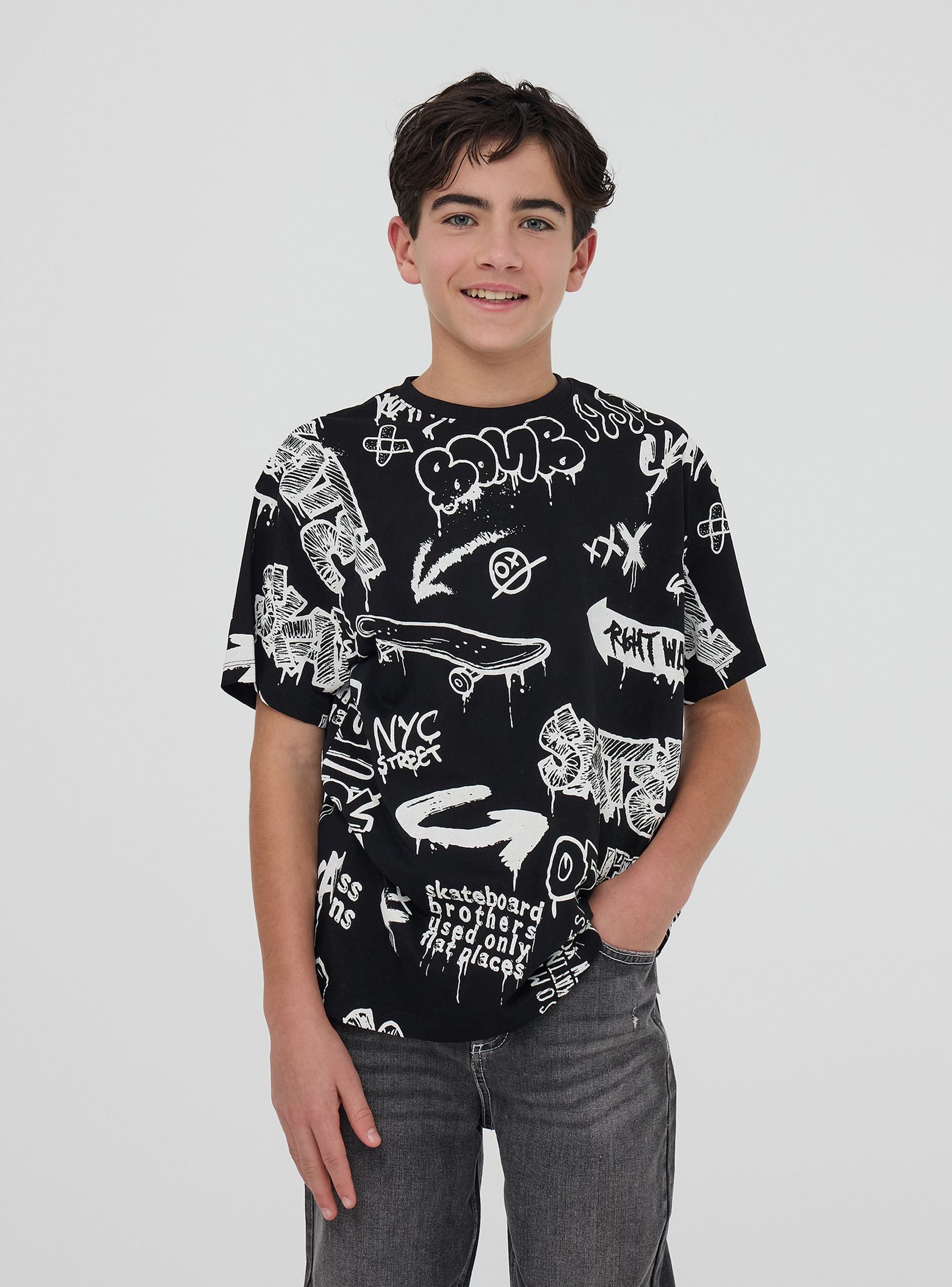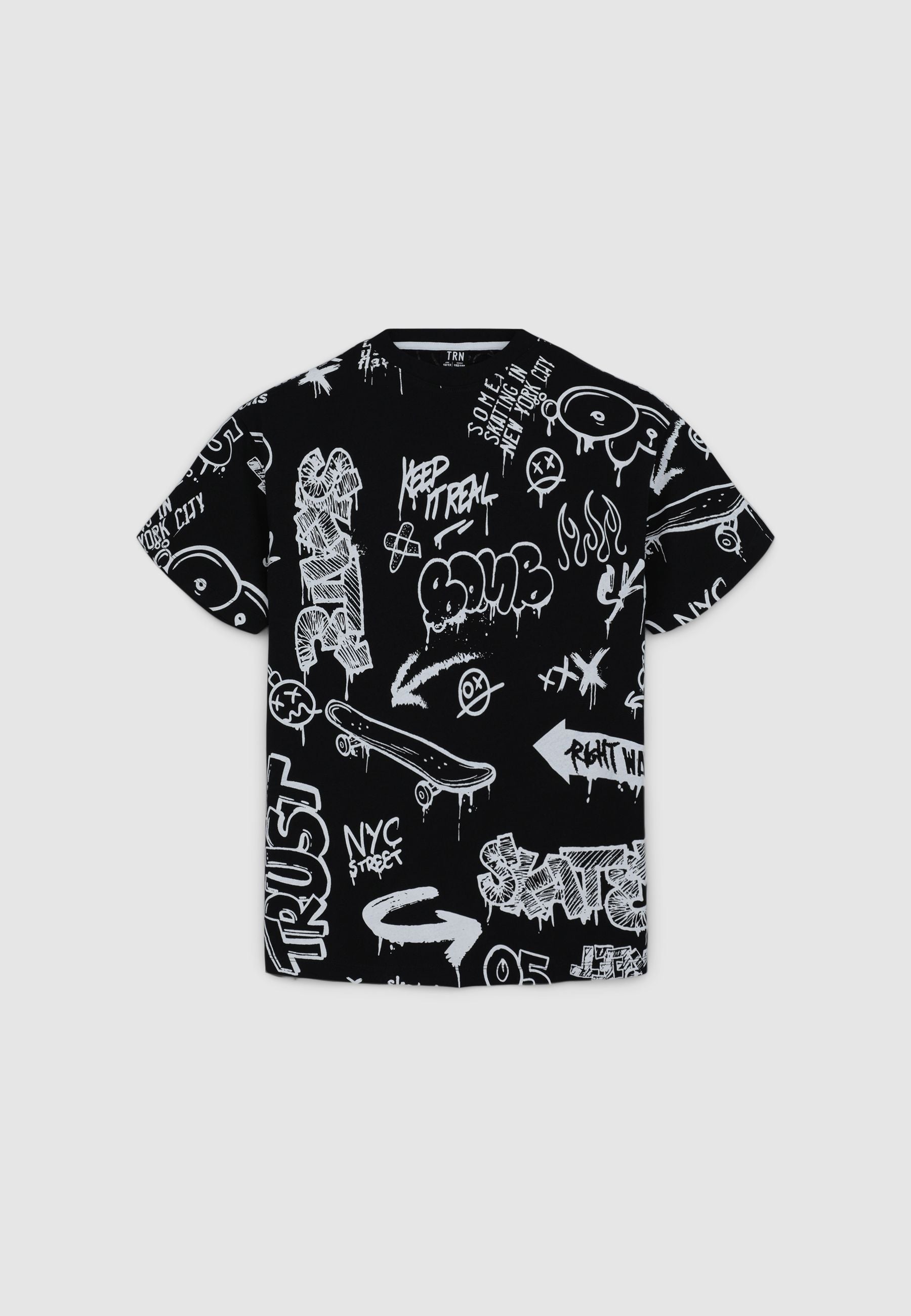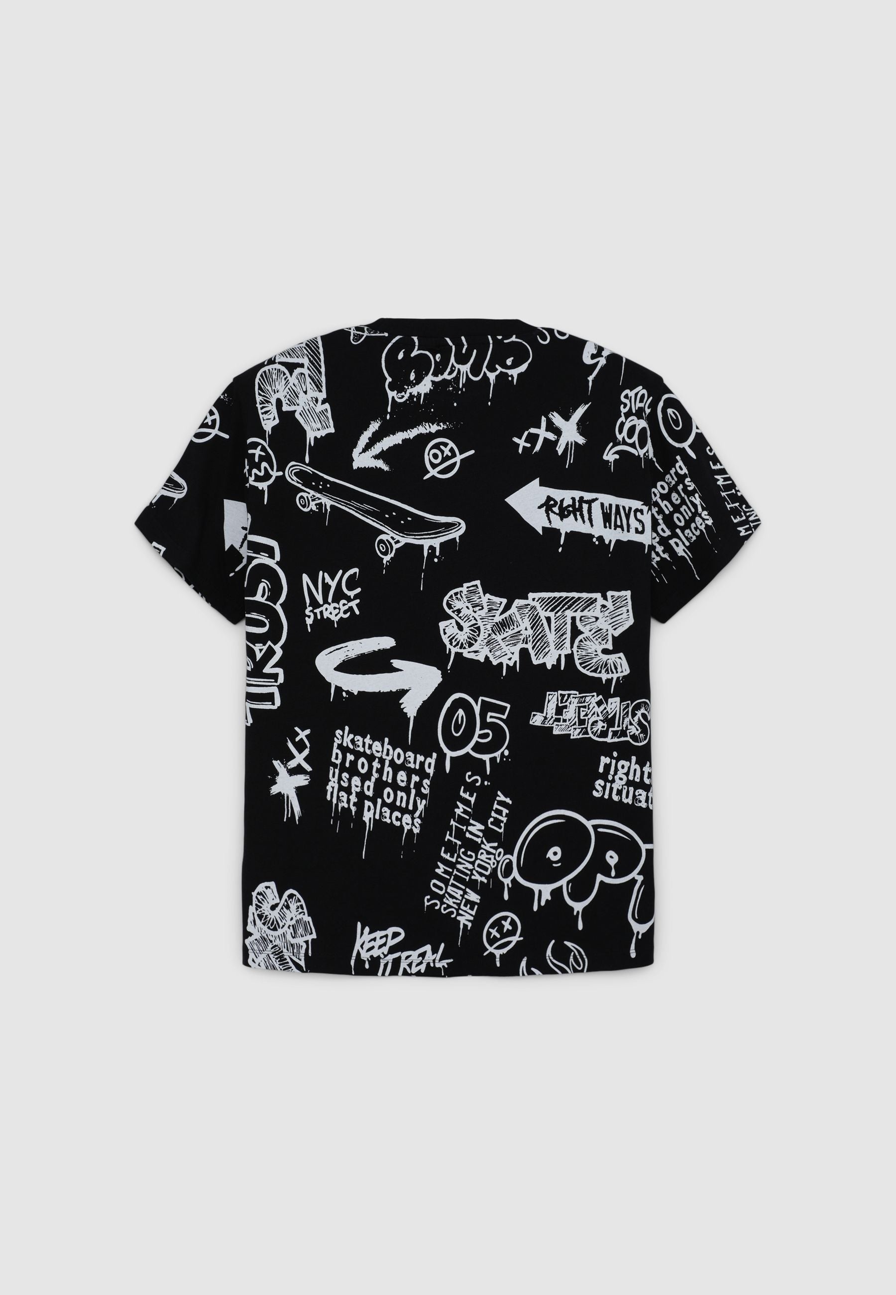 Maglietta da bambino con maniche corte e girocollo, caratterizzata da una vivace stampa all-over in stile graffiti. Perfetta per un look urban e moderno, questa maglietta offre un design energico e originale, ideale per i piccoli amanti dello streetwear e dello stile metropolitano.Dettagli