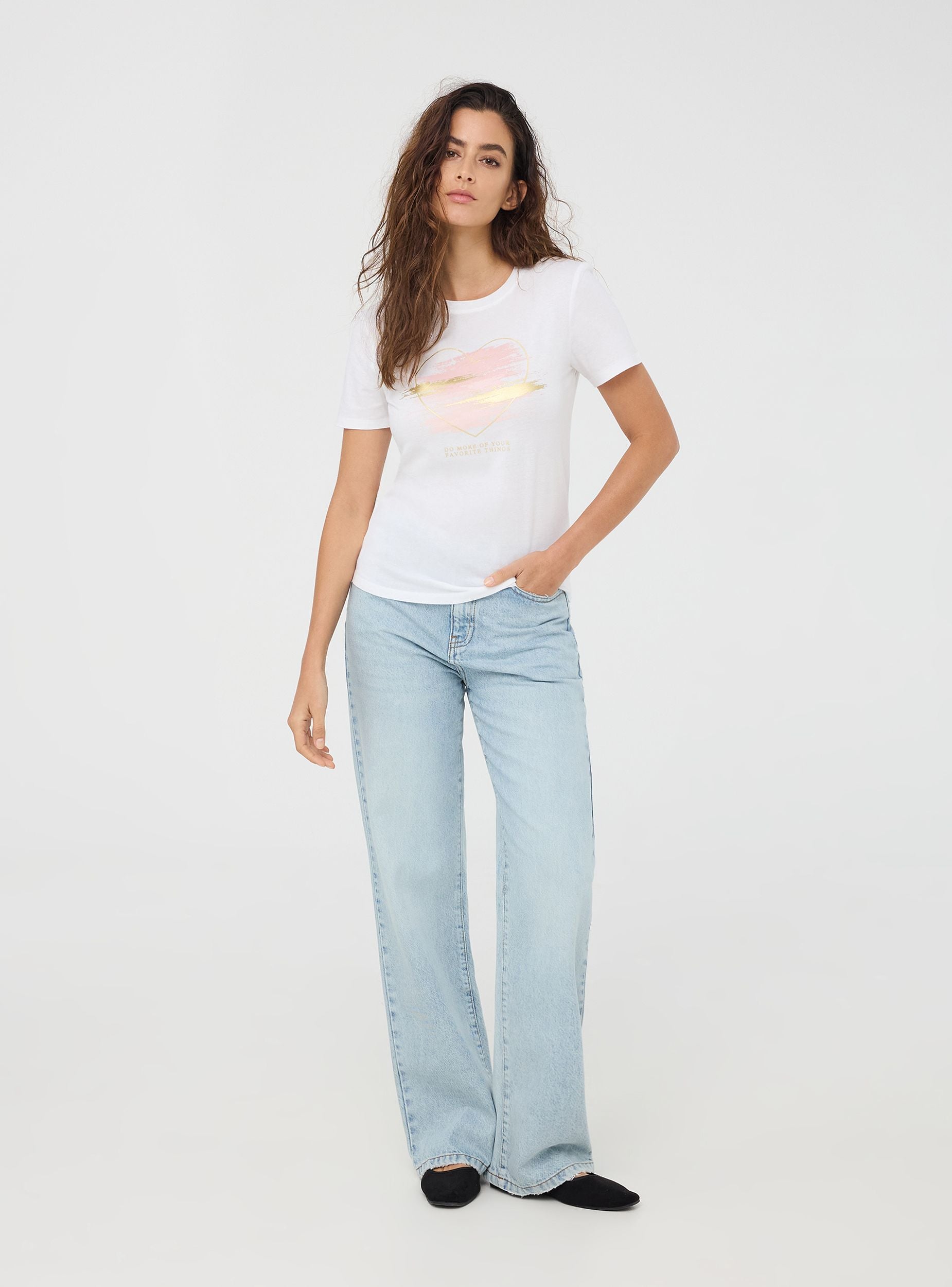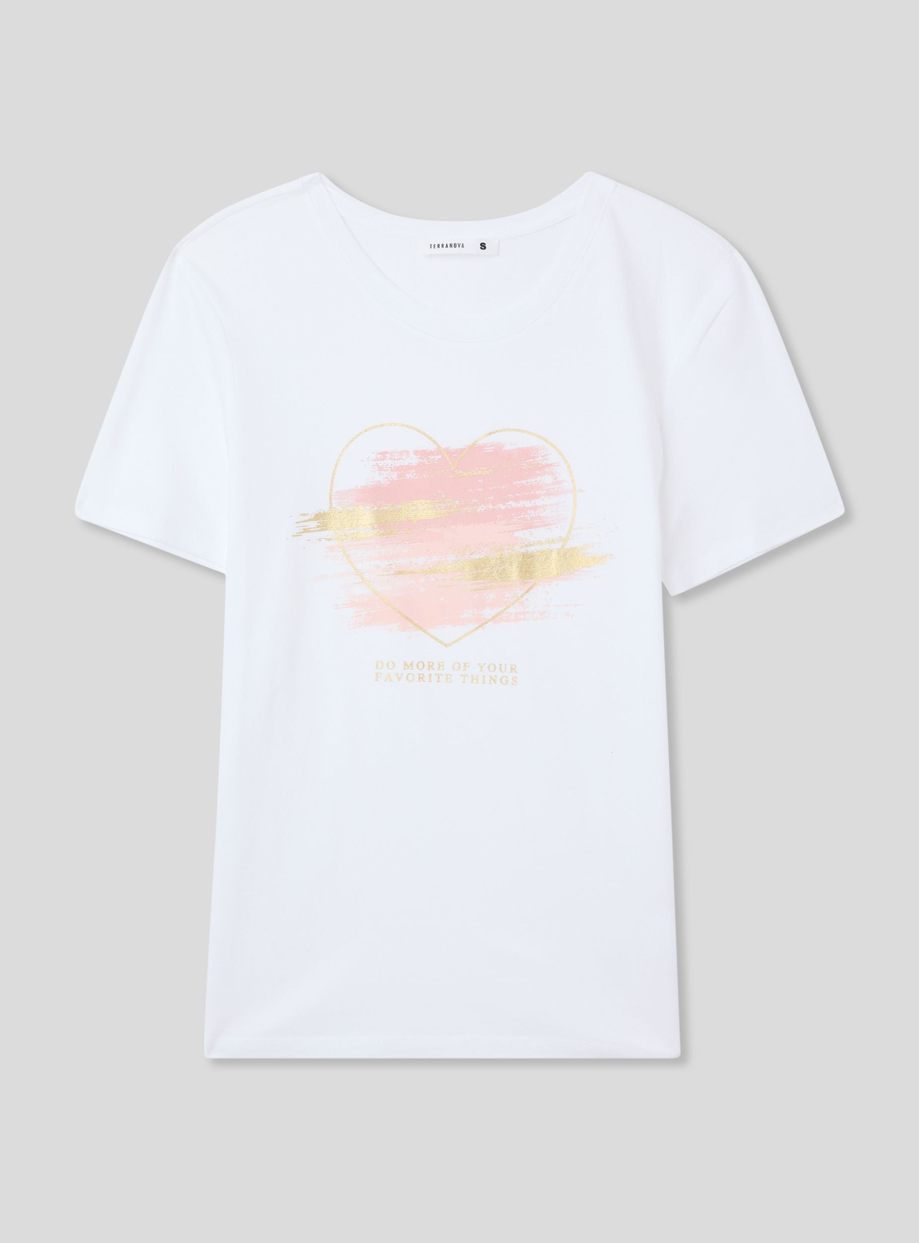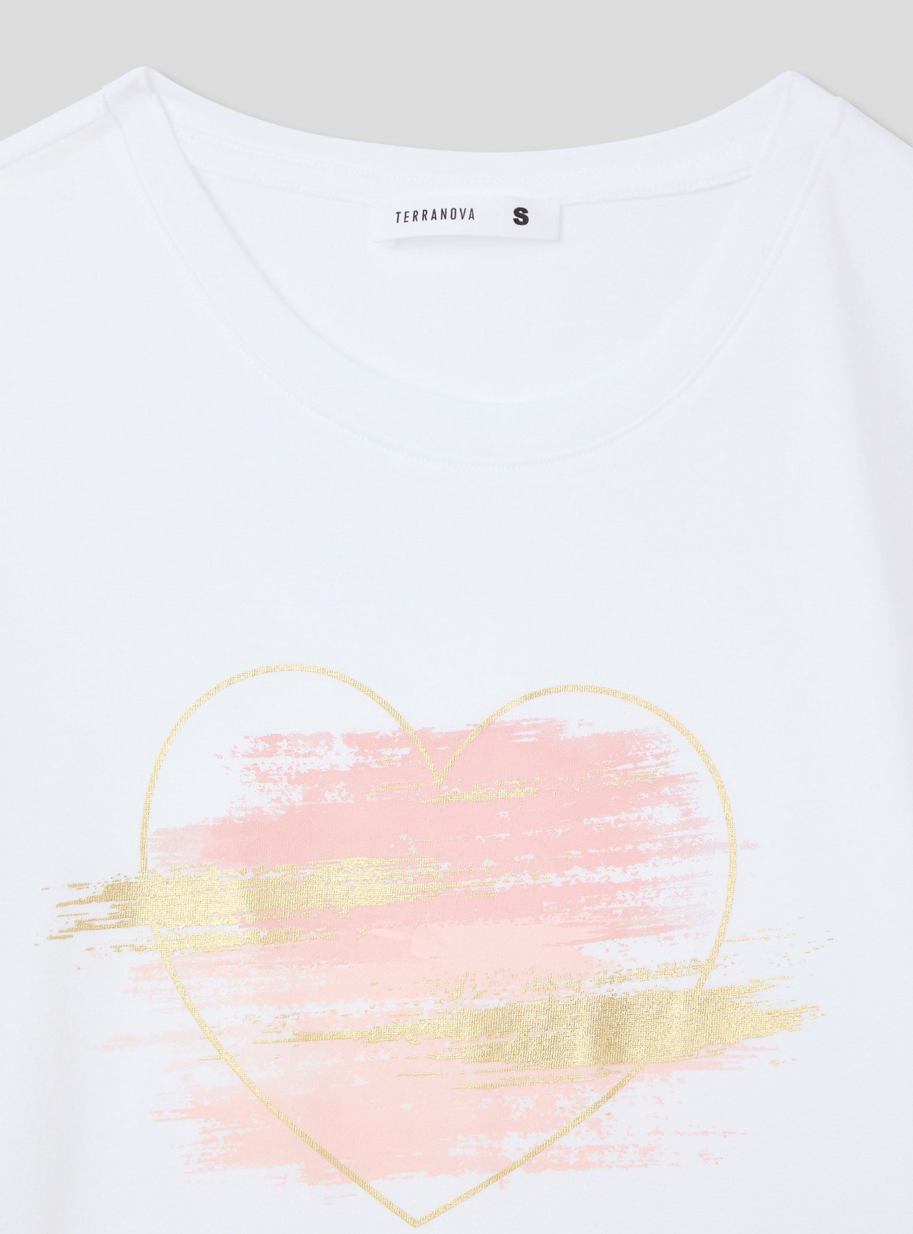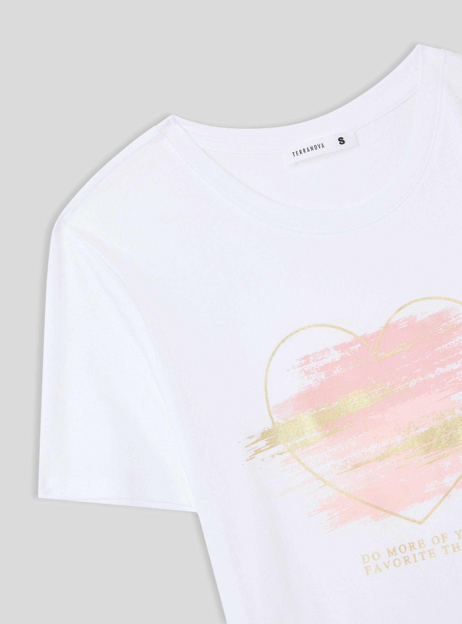 Maglietta da donna con girocollo e maniche corte, caratterizzata da una stampa laminata che aggiunge un tocco brillante e moderno al design. Il motivo a cuori stilizzati dona un aspetto romantico e delicato, perfetto per un look casual ma con un dettaglio che cattura l'attenzione. Questa t-shirt si abbina facilmente a jeans, shorts o gonne per creare outfit versatili e femminili.Dettagli