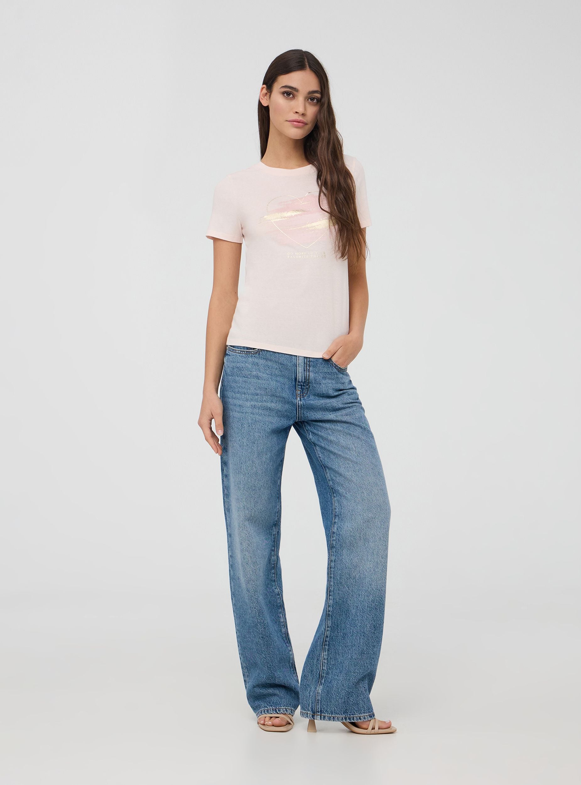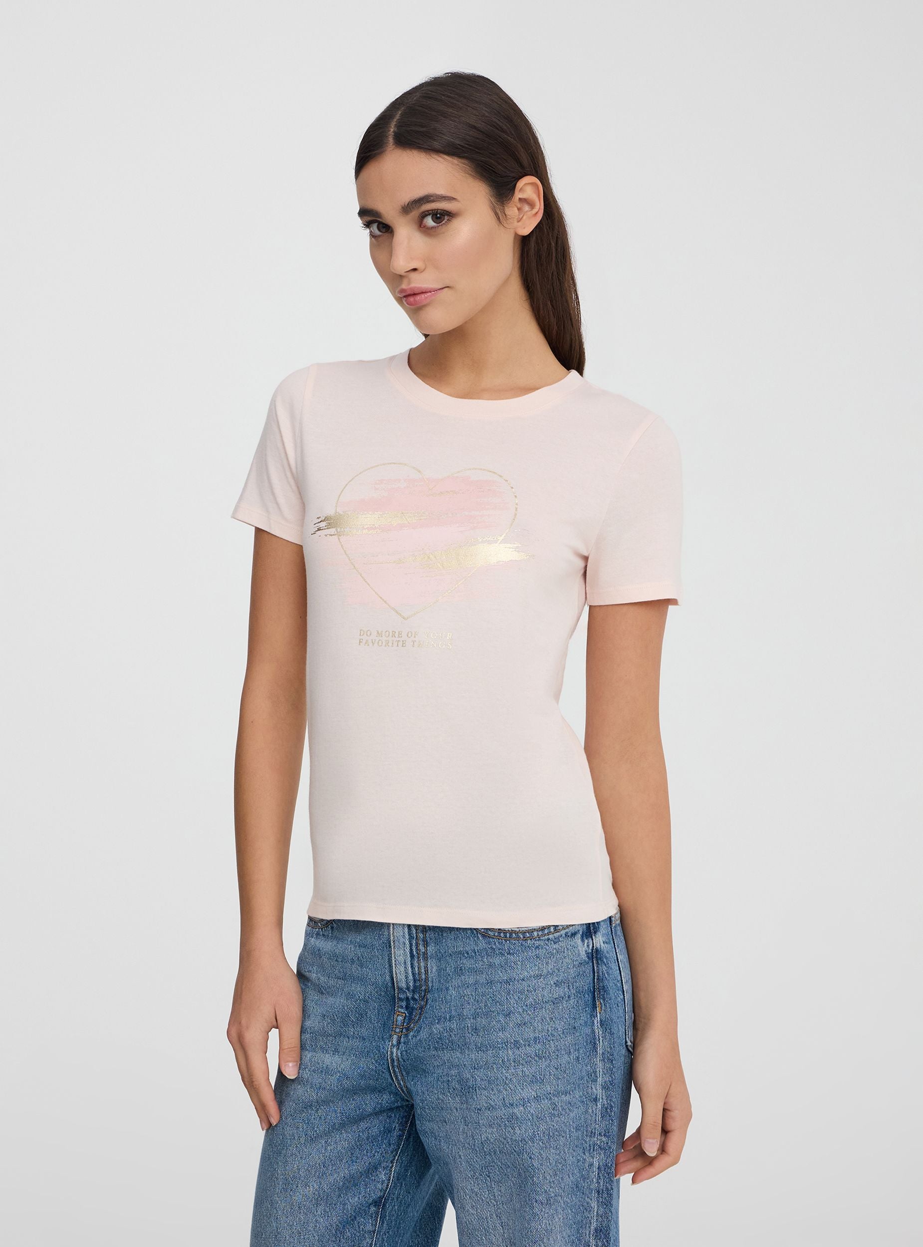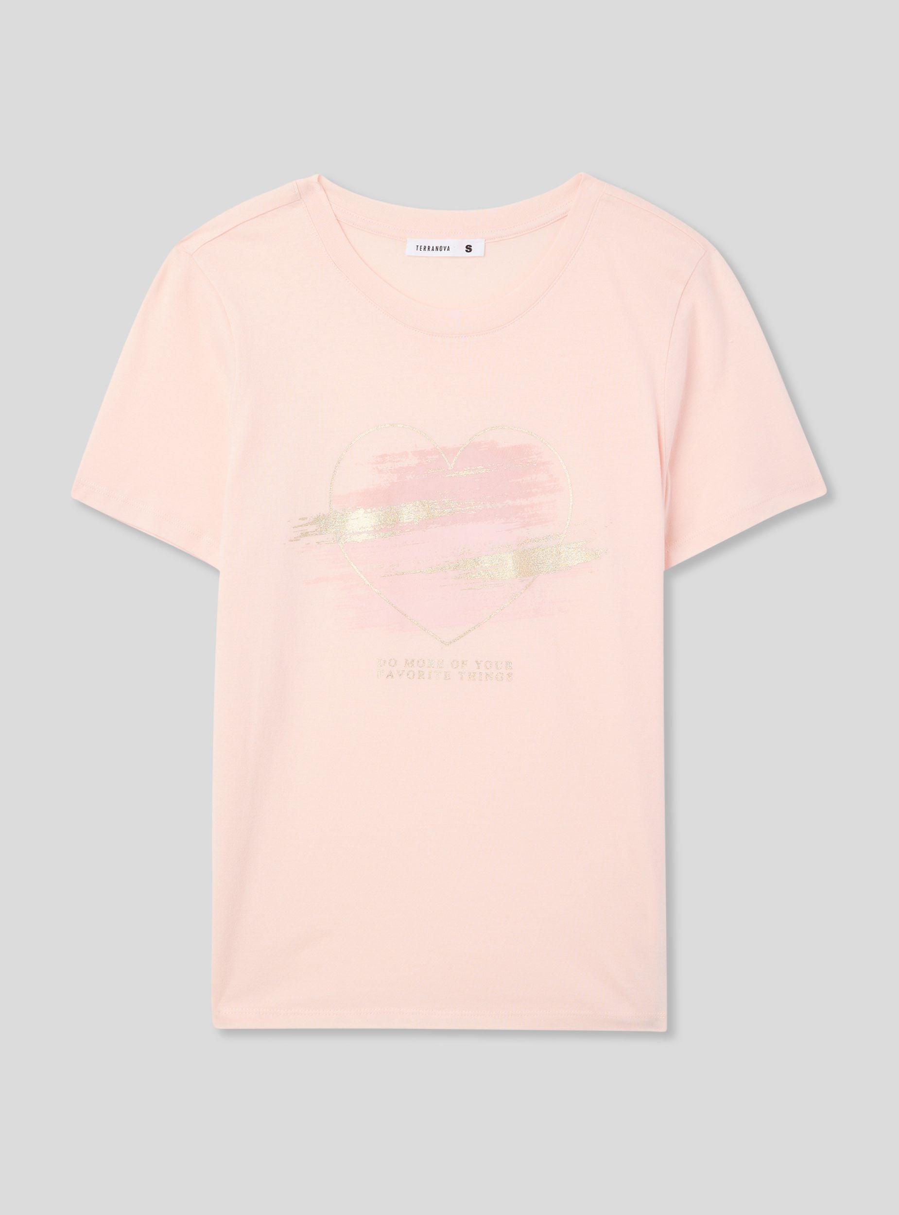 Maglietta da donna con girocollo e maniche corte, caratterizzata da una stampa laminata che aggiunge un tocco brillante e moderno al design. Il motivo a cuori stilizzati dona un aspetto romantico e delicato, perfetto per un look casual ma con un dettaglio che cattura l'attenzione. Questa t-shirt si abbina facilmente a jeans, shorts o gonne per creare outfit versatili e femminili.Dettagli