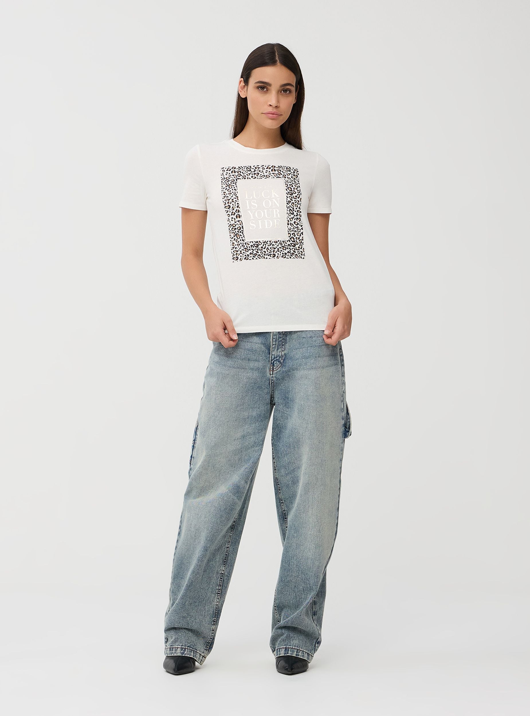 Maglietta da donna con maniche corte e girocollo. La parte frontale presenta una stampa rettangolare con motivo maculato e una scritta centrale "Luck is on your side". Ideale per un look casual e versatile.Dettagli