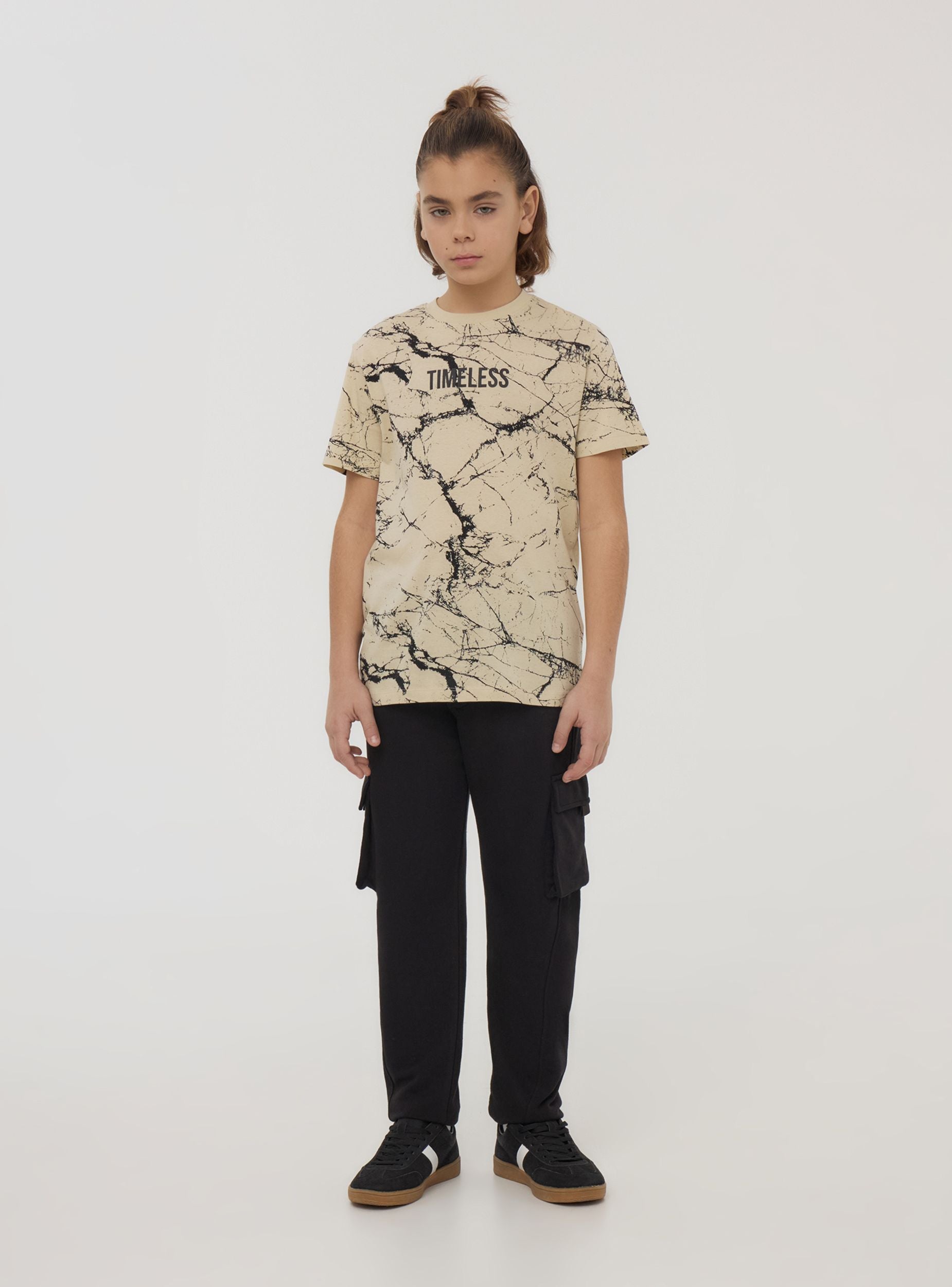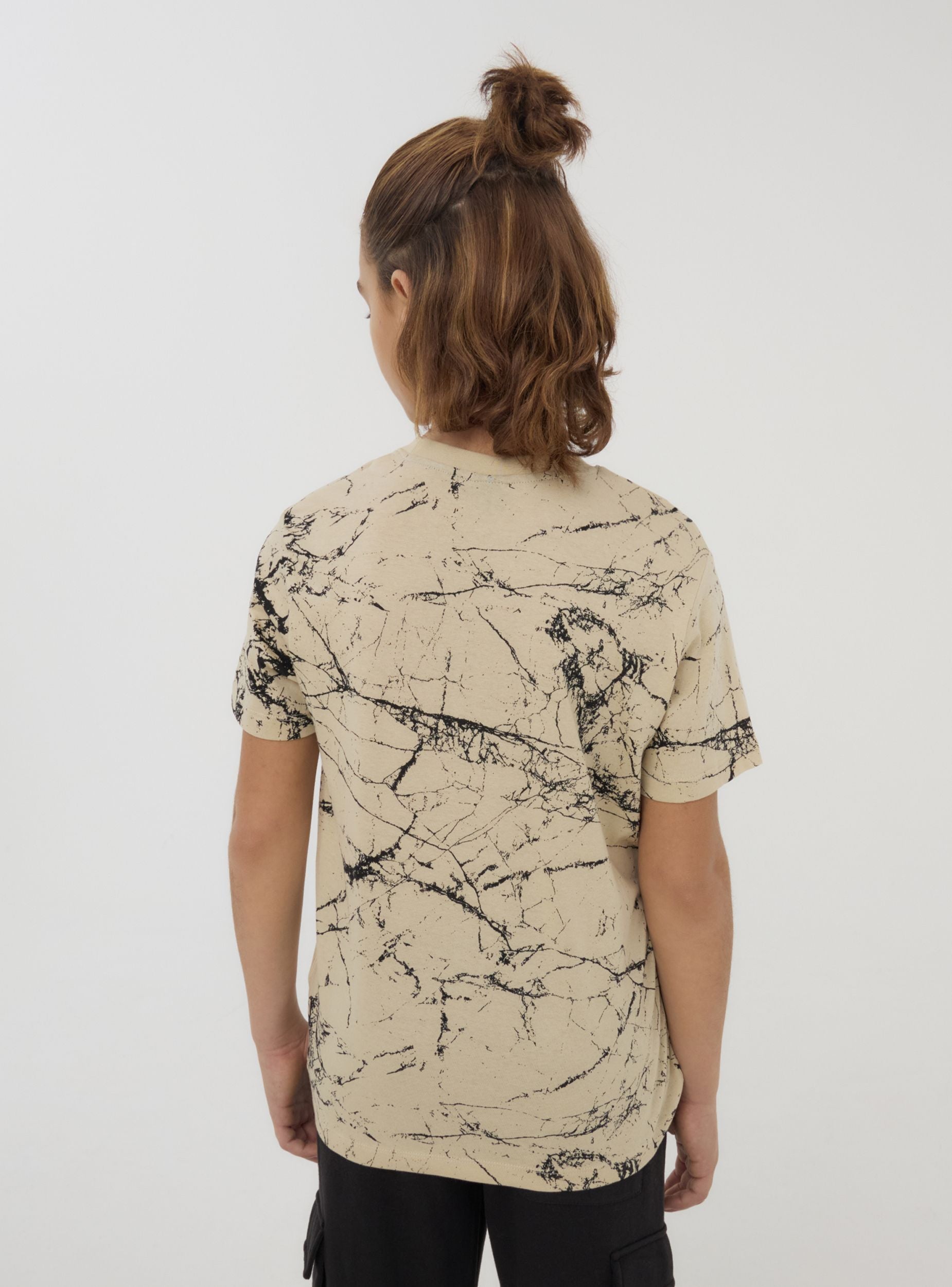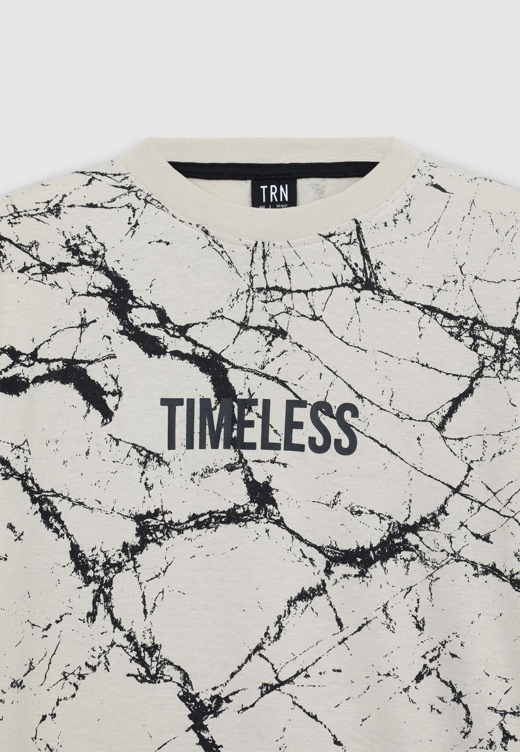 Maglietta da bambino perfetta per il tempo libero, ideale per un look moderno e originale. Con maniche corte e girocollo, presenta una scritta sul petto e una stampa effetto marmorizzato all over, che dona uno stile unico e dinamico. Ideale per chi cerca un capo casual con un tocco di personalità distintiva.Dettagli