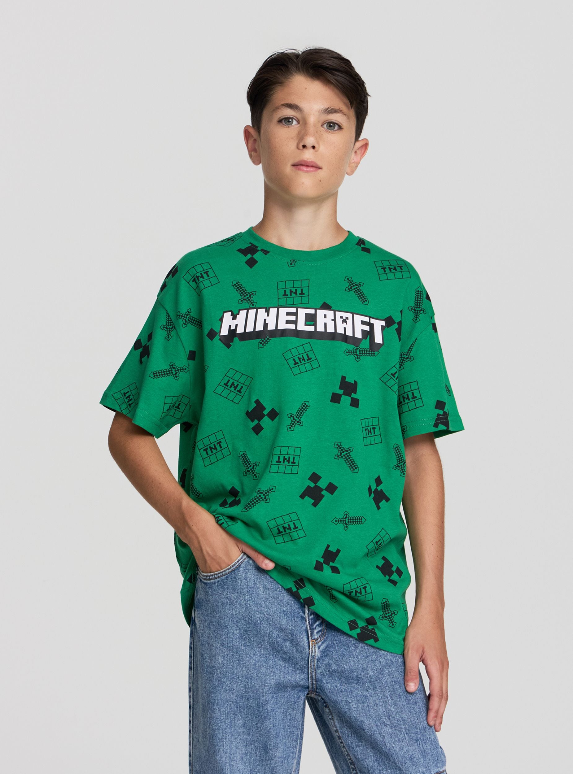 Maglietta da bambino con stampa Minecraft®, ideale per i giovani appassionati del famoso videogioco. Presenta una vestibilità comoda e maniche corte, perfetta per il tempo libero e le giornate casual. La stampa vivace e accattivante aggiunge un tocco di originalità, rendendola un capo versatile per abbinamenti con jeans o pantaloncini.Dettagli