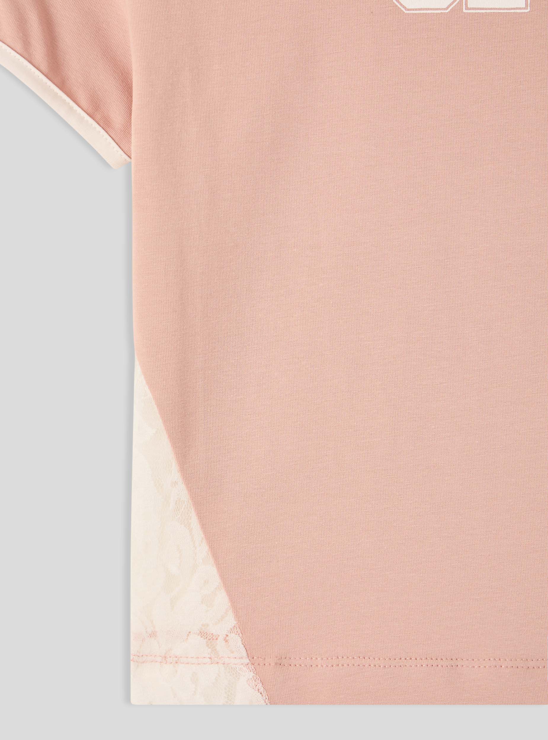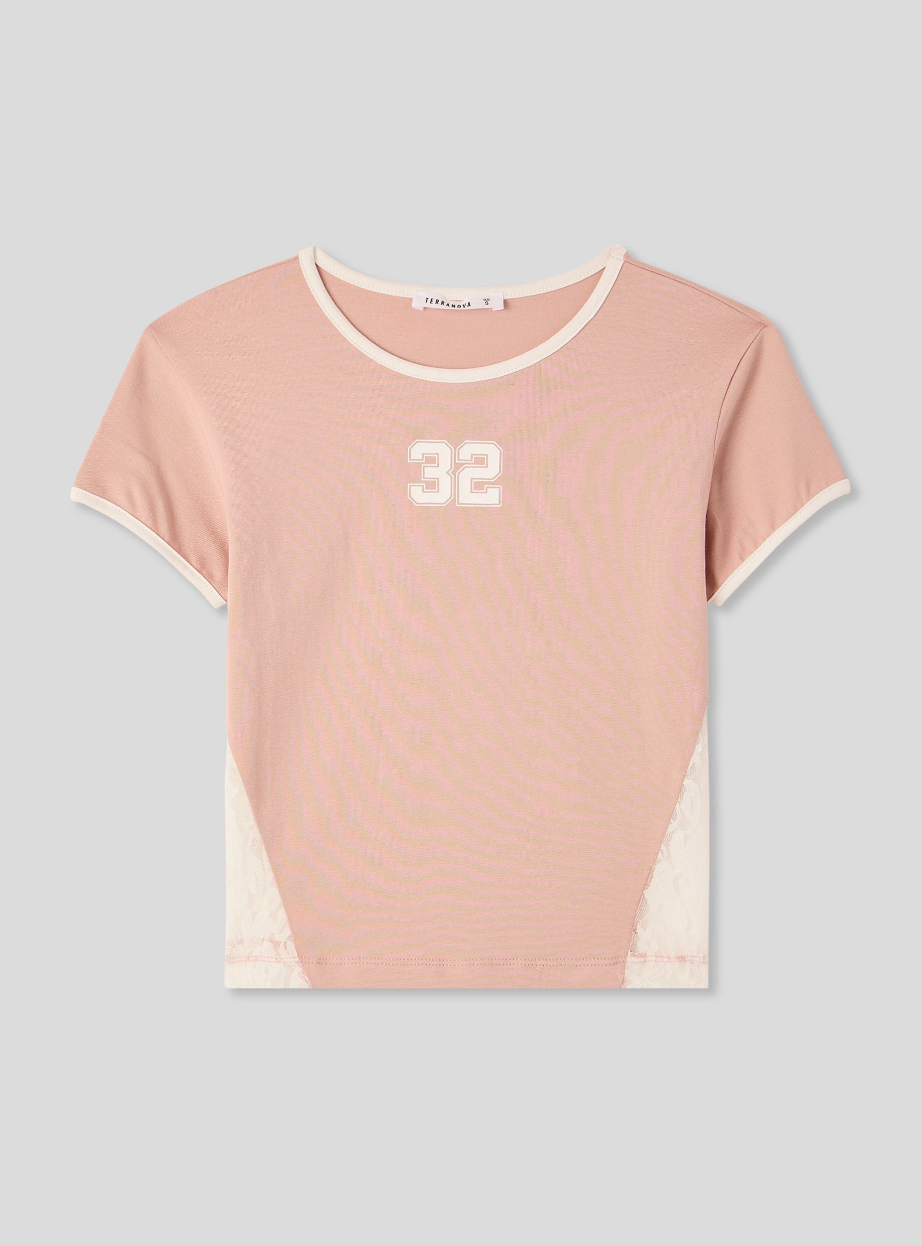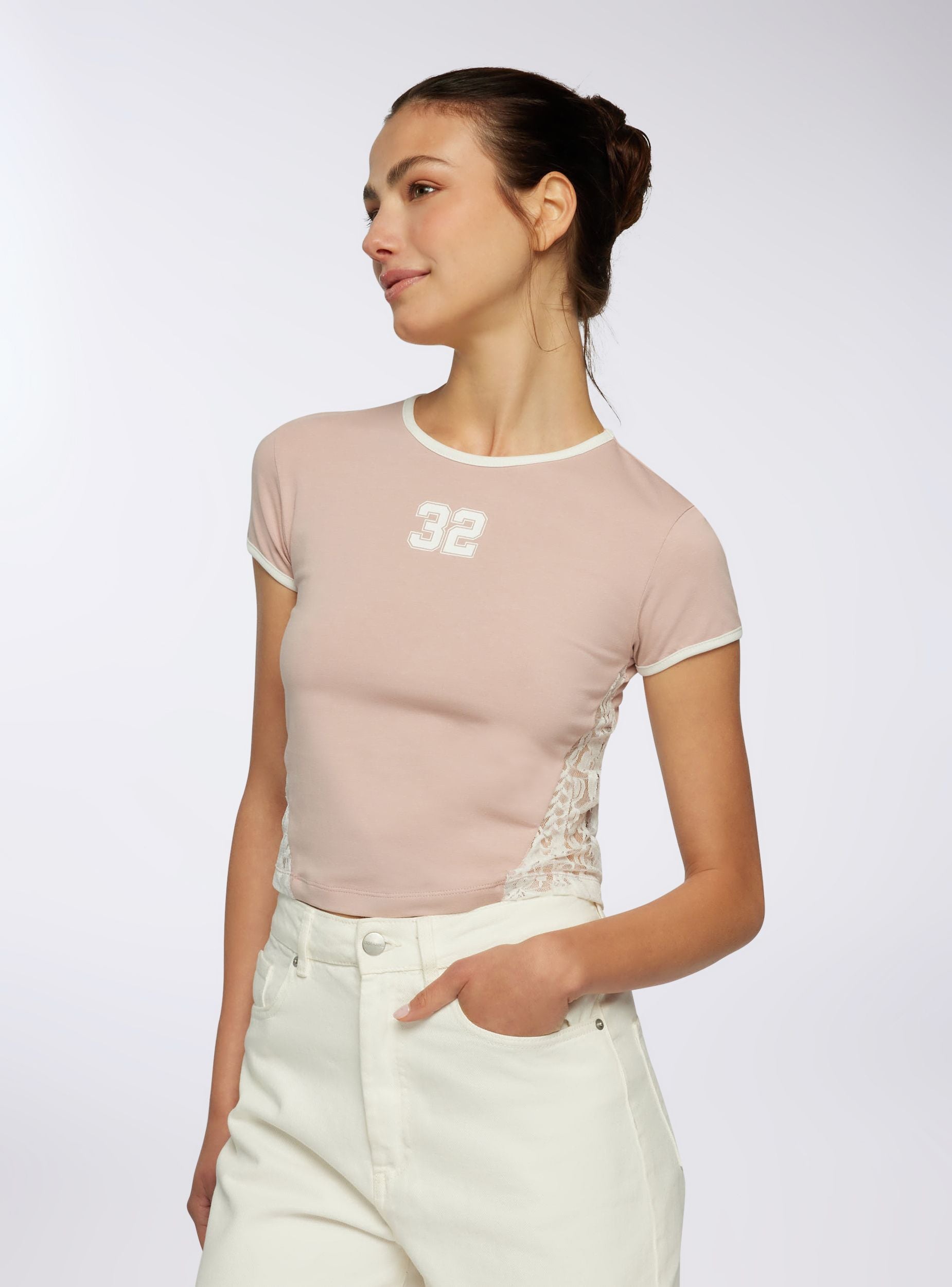 Maglietta da donna con stampa numero sul petto e dettagli di inserti in pizzo laterali. Ideale per un look sportivo ma ricercato. Perfetta per essere abbinata a jeans o pantaloni jogger, questa maglietta offre un design moderno e versatile. La vestibilità regolare garantisce comfort durante tutta la giornata, mentre il dettaglio del numero aggiunge un tocco di originalità. Ideale per il tempo libero e le uscite informali.Dettagli