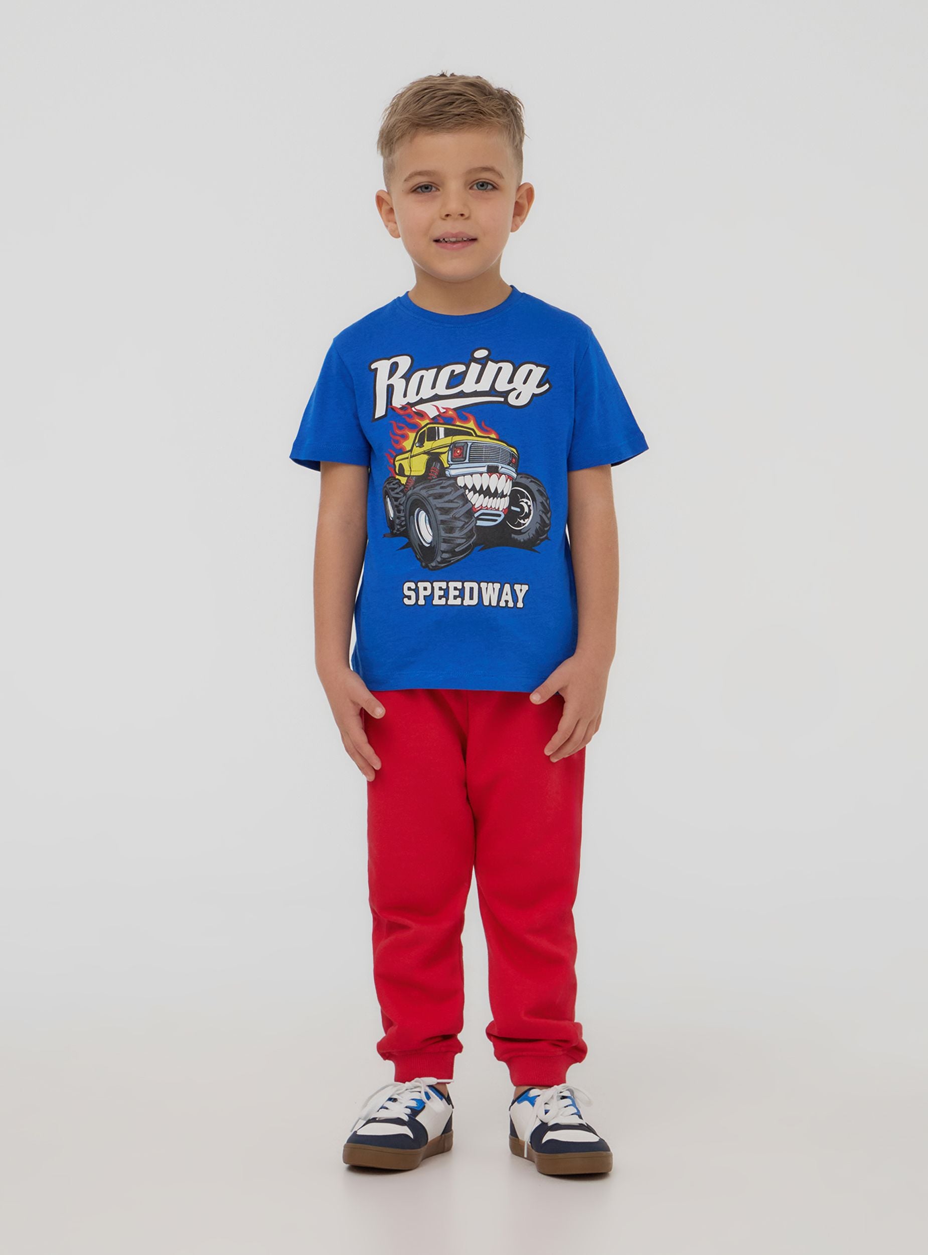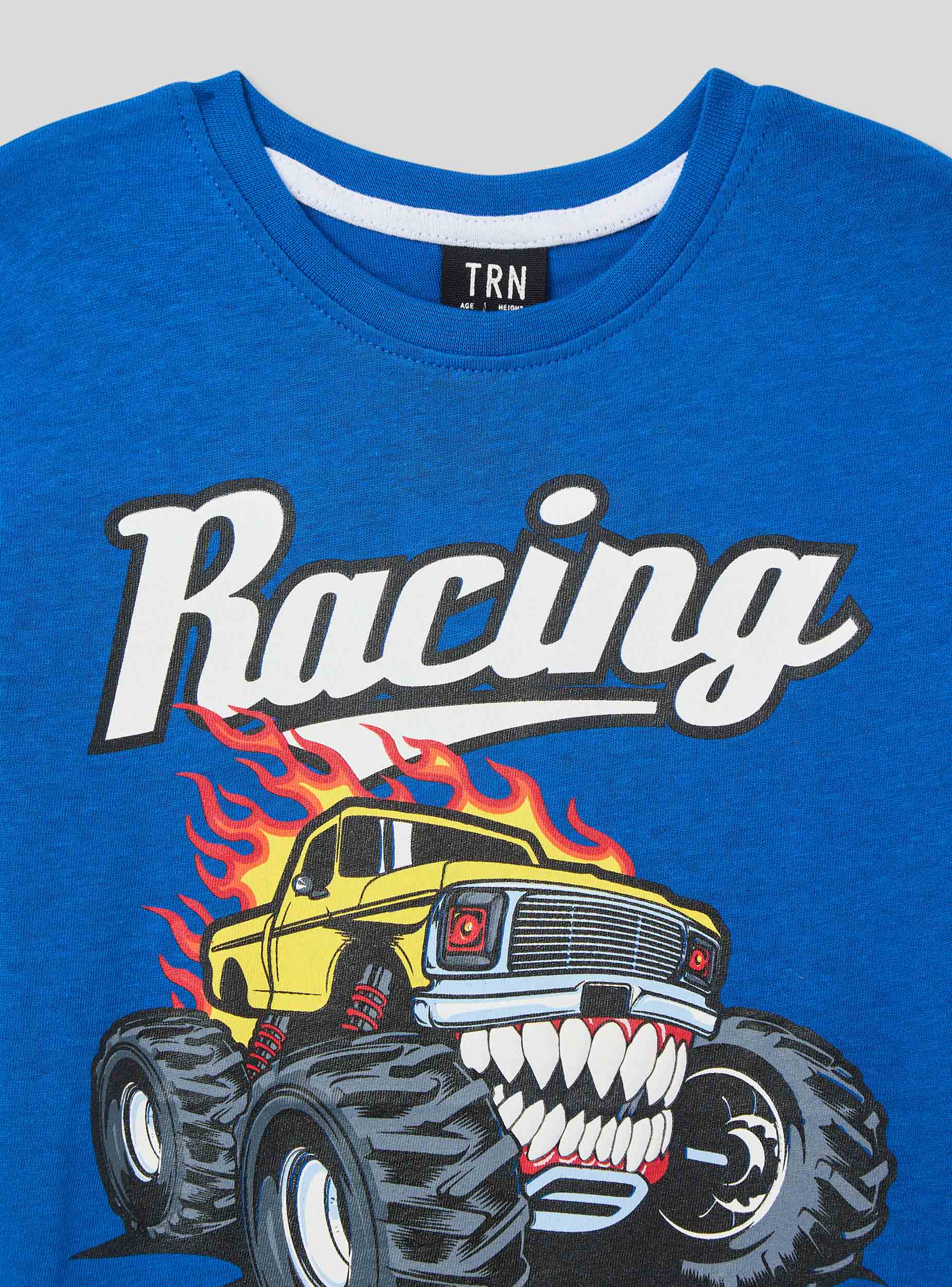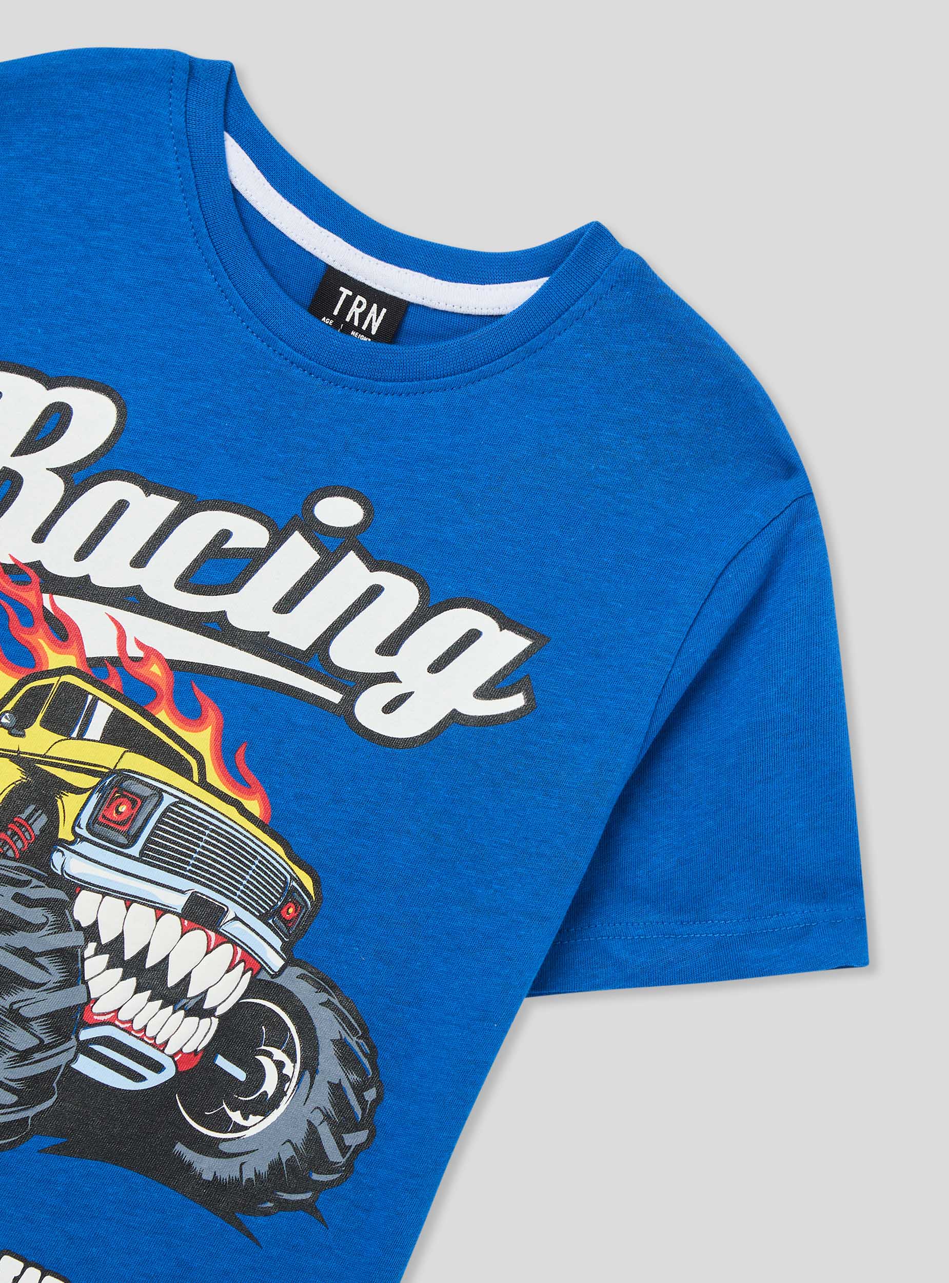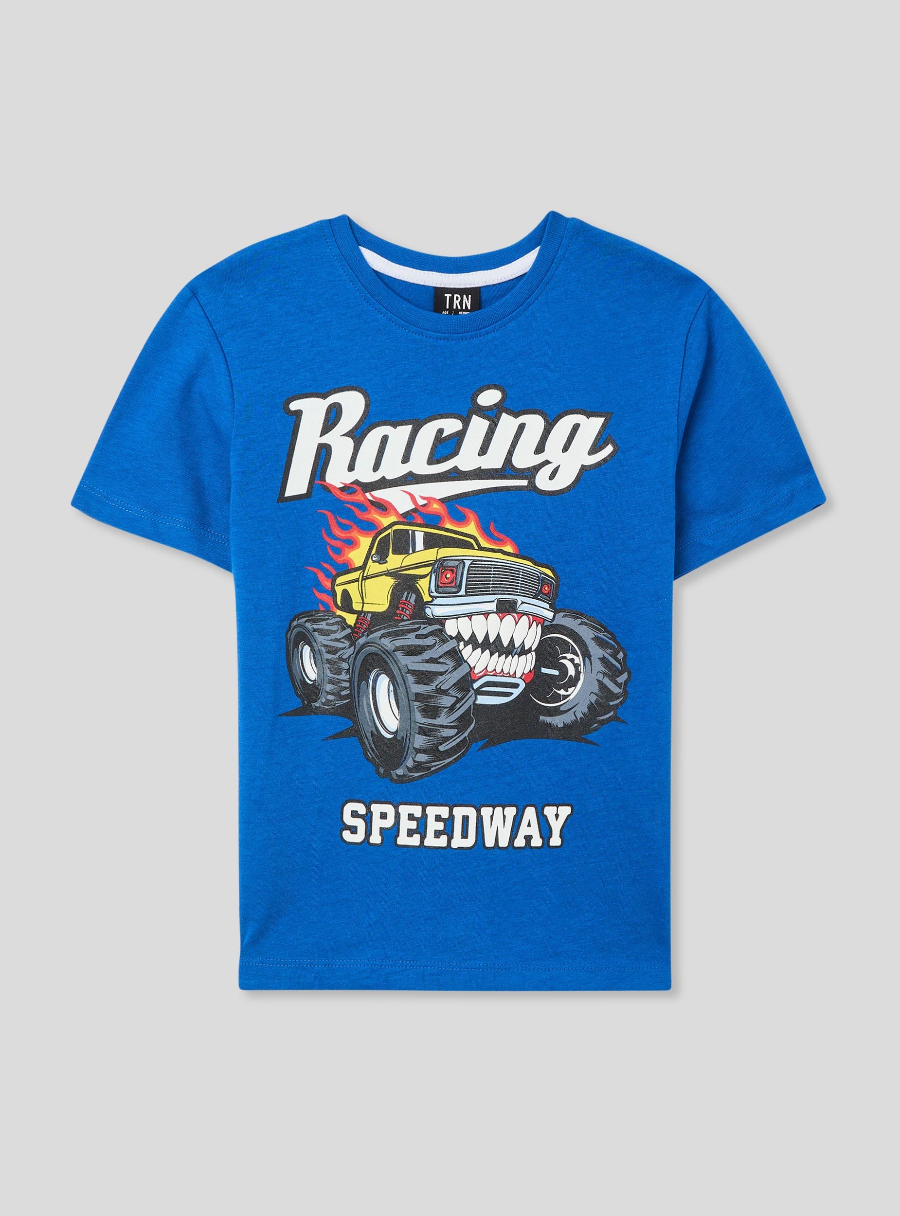 Maglietta da bimbo a maniche corte con girocollo, perfetta per piccoli appassionati di avventura e velocità. La vivace stampa racing con il tema delle gare e dei monster truck aggiunge un tocco dinamico e divertente all'outfit. Ideale per le giornate di gioco e svago, è un capo pratico e versatile, facilmente abbinabile a jeans o shorts per un look energico e sportivo che non passa inosservato.Dettagli