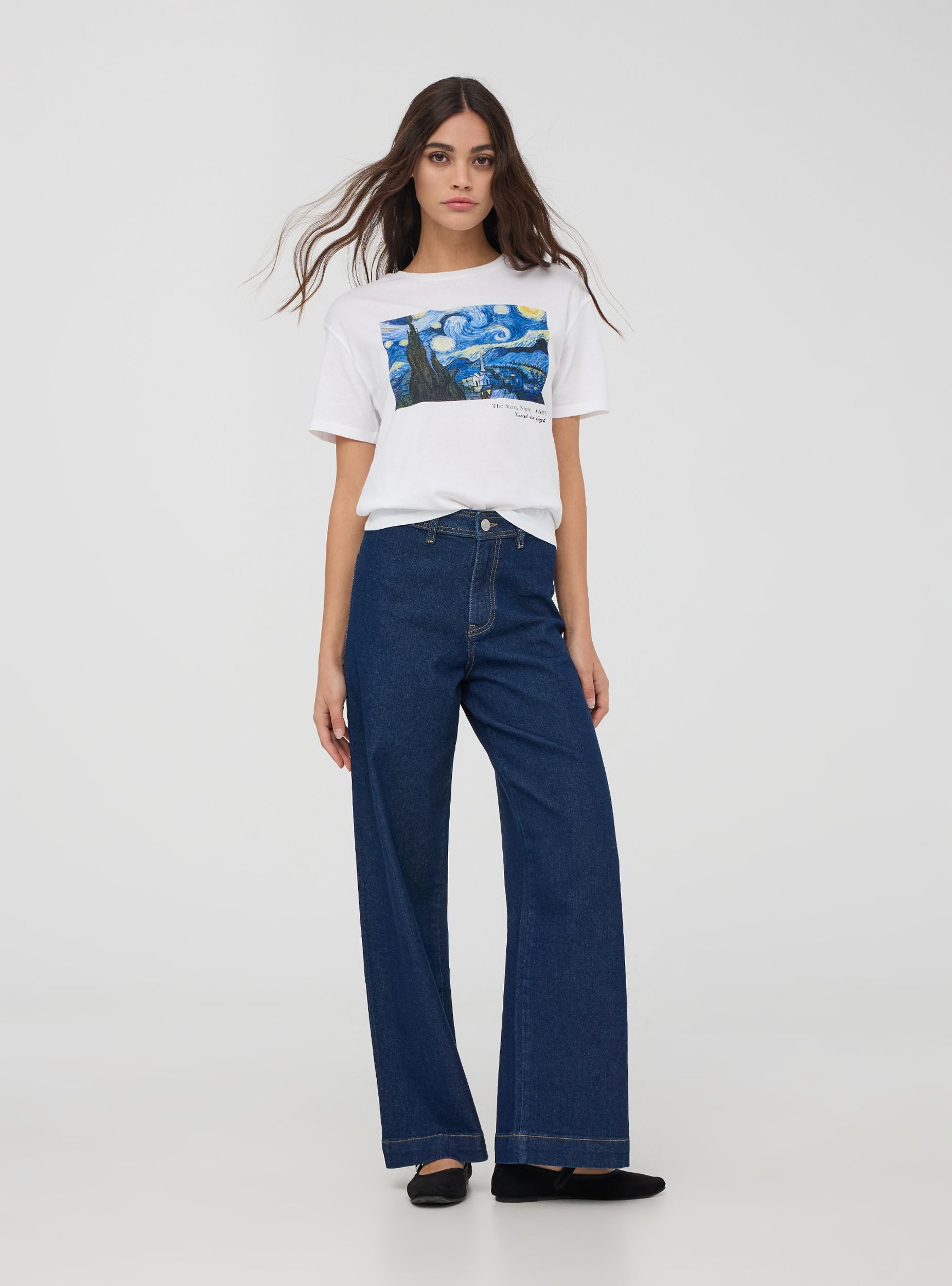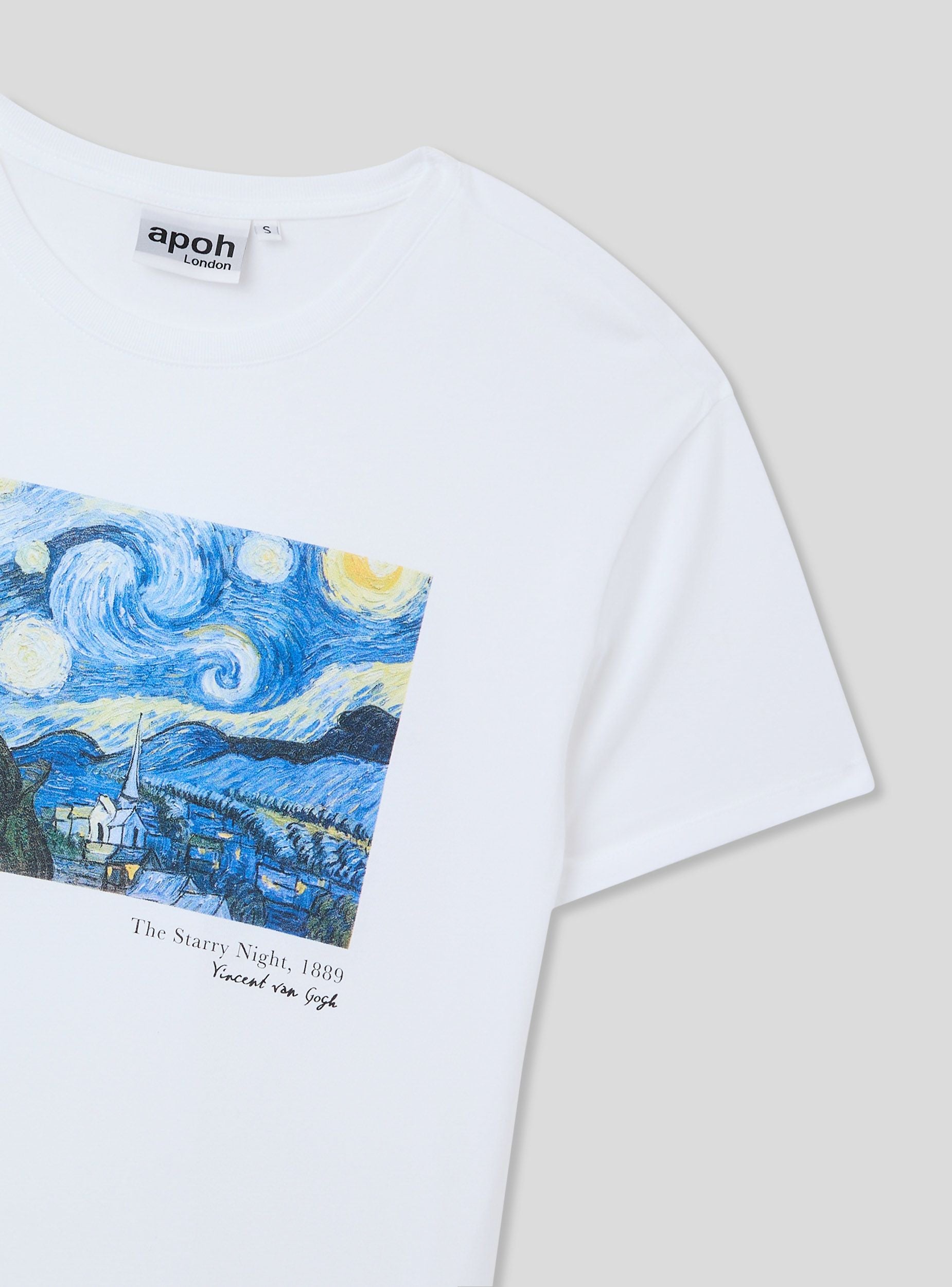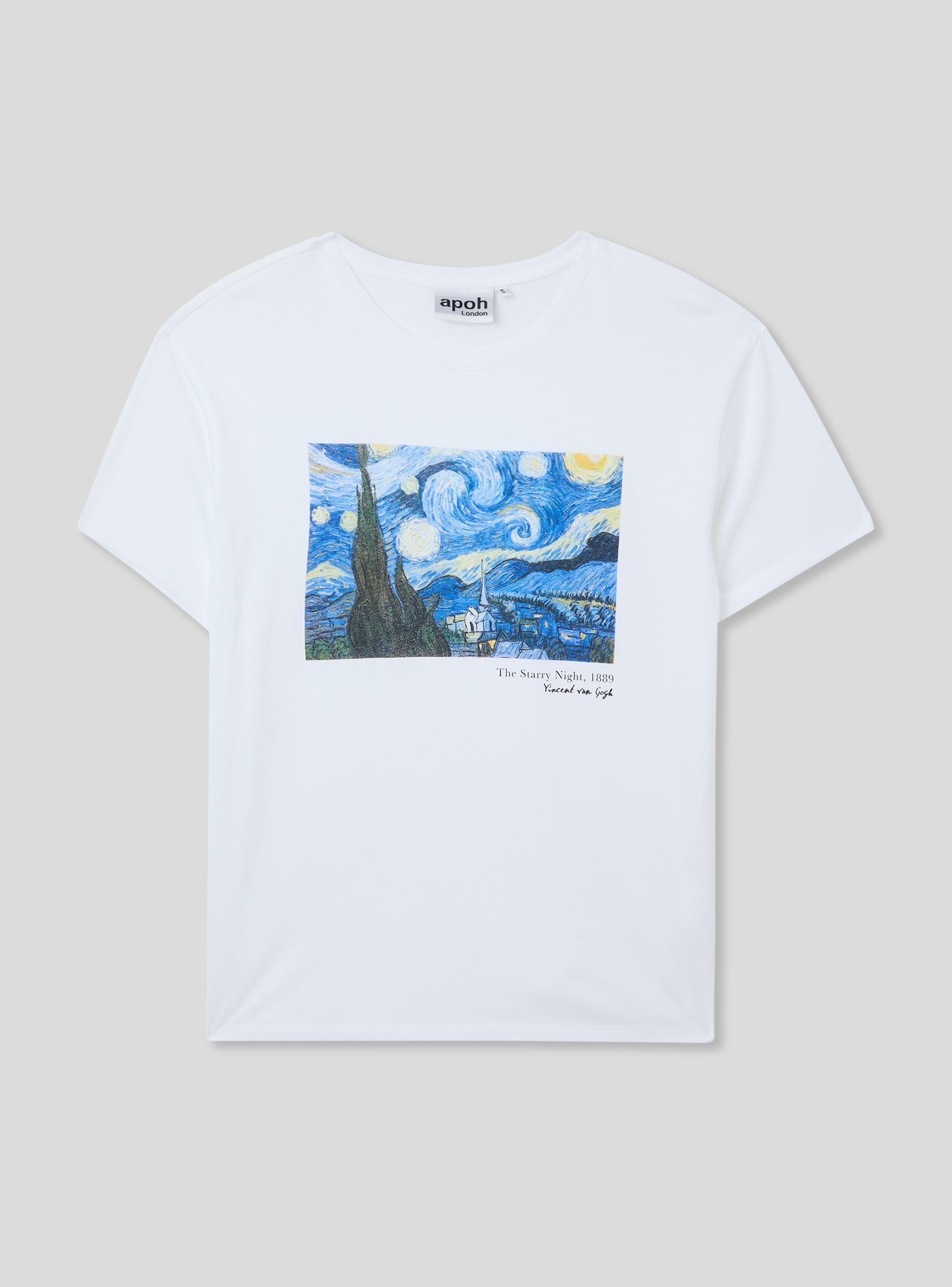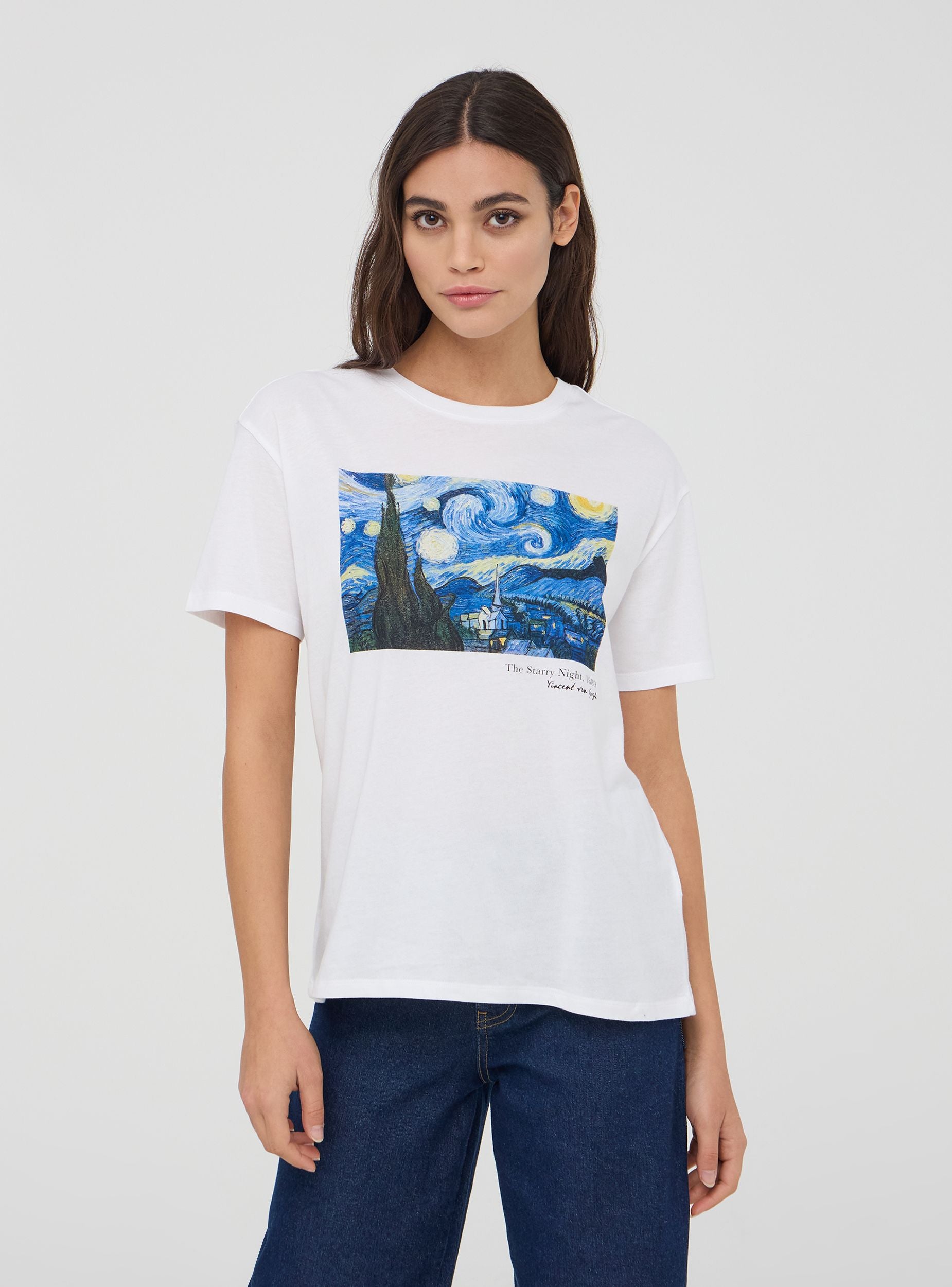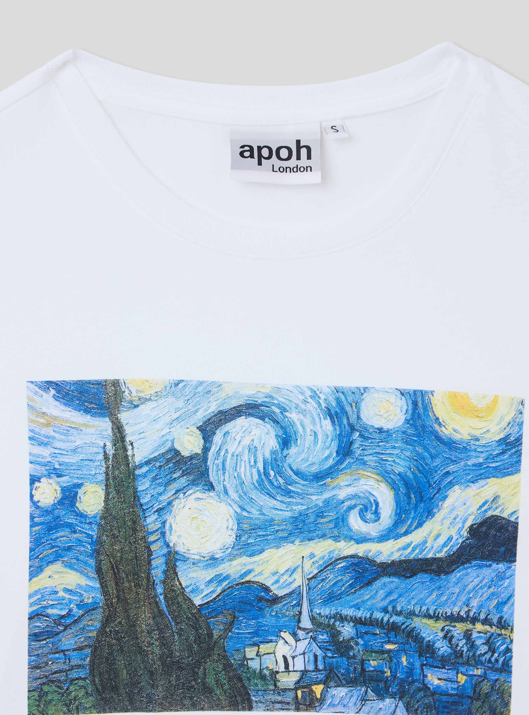 Maglietta da donna a maniche corte realizzata in cotone 100% con stampa di un celebre quadro di Vincent Van Gogh. Questa t-shirt è ideale per arricchire il tuo outfit quotidiano con uno stile unico e ricercato. Il modello girocollo e la vestibilità ampia garantiscono comfort e versatilità rendendola un capo perfetto per outfit casual o layering sofisticati.Dettagli