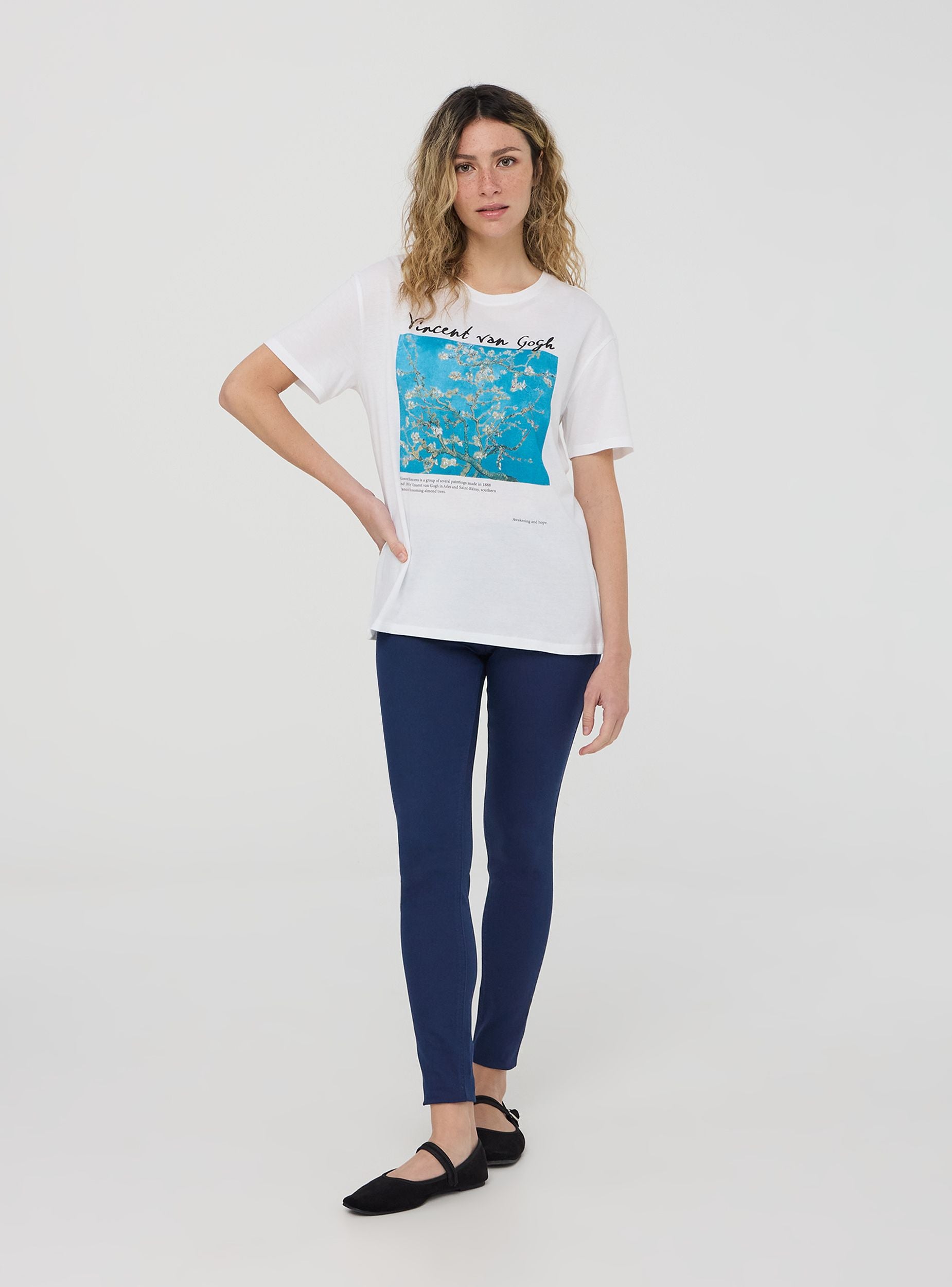 Maglietta da donna a maniche corte realizzata in cotone 100% con stampa di un celebre quadro di Vincent Van Gogh. Questa t-shirt è ideale per arricchire il tuo outfit quotidiano con uno stile unico e ricercato. Il modello girocollo e la vestibilità ampia garantiscono comfort e versatilità rendendola un capo perfetto per outfit casual o layering sofisticati.Dettagli