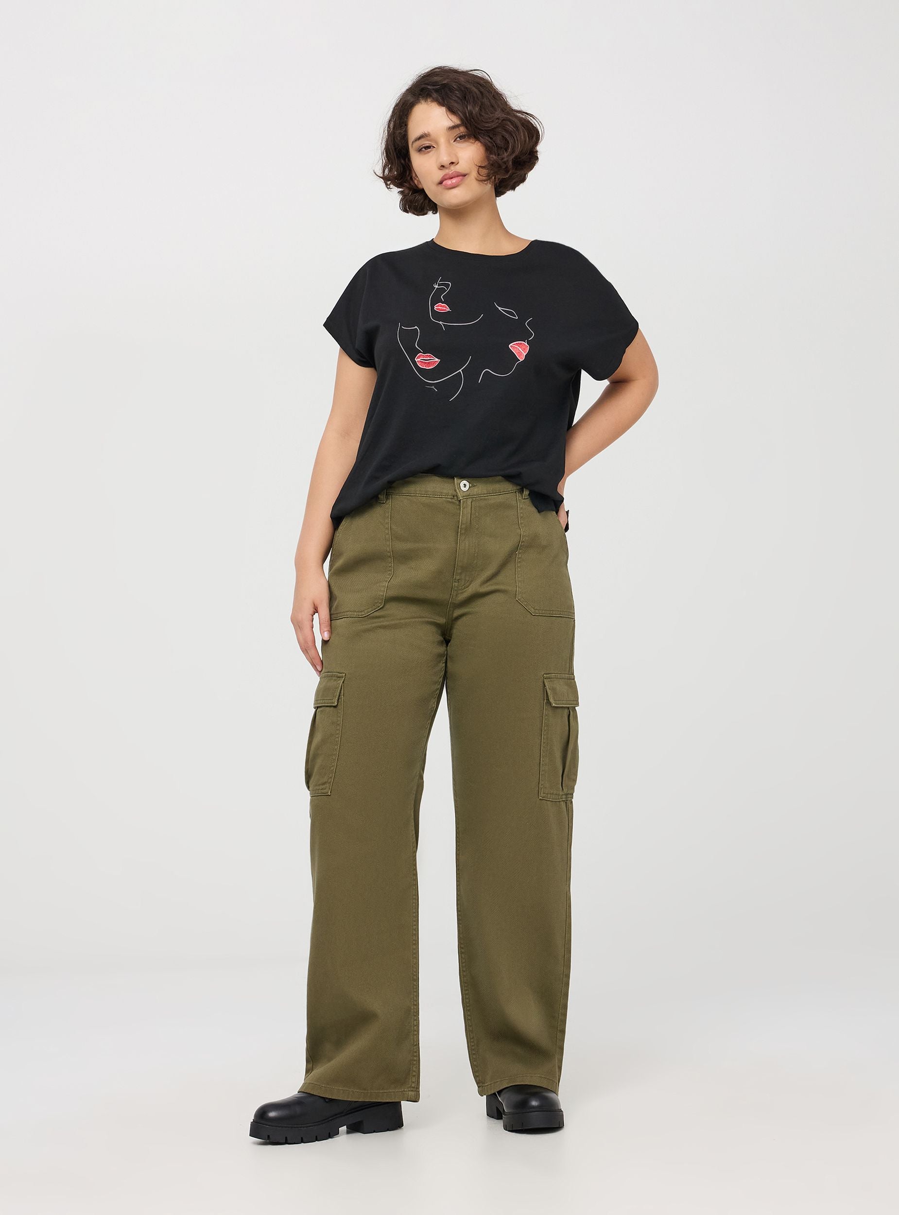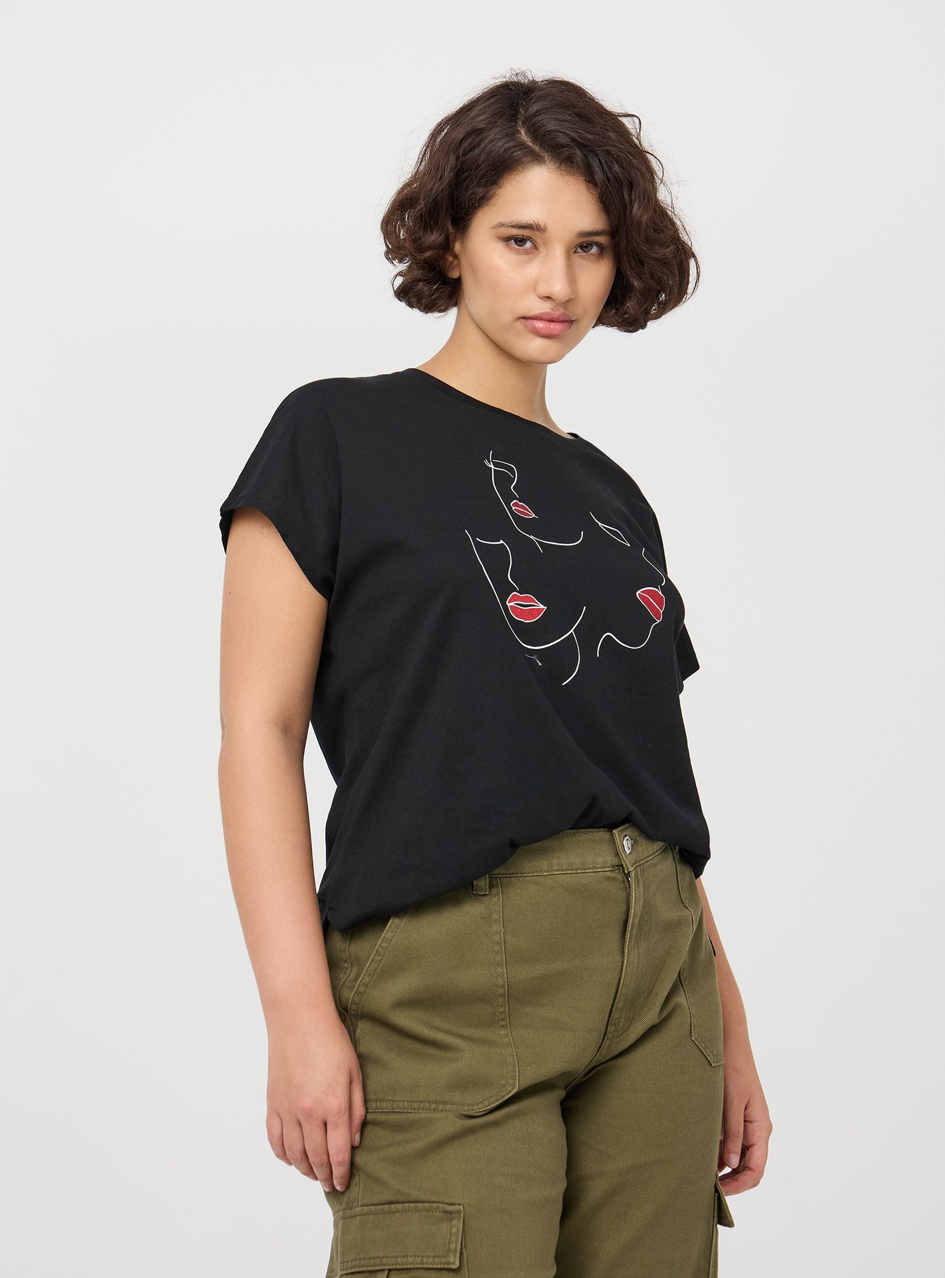 Maglietta da donna con maniche corte e girocollo. Presenta una stampa frontale con contorni di volti e labbra evidenziate. Ideale per un look casual e alla moda. La maglietta è perfetta da abbinare a jeans o pantaloni per un outfit quotidiano.Dettagli