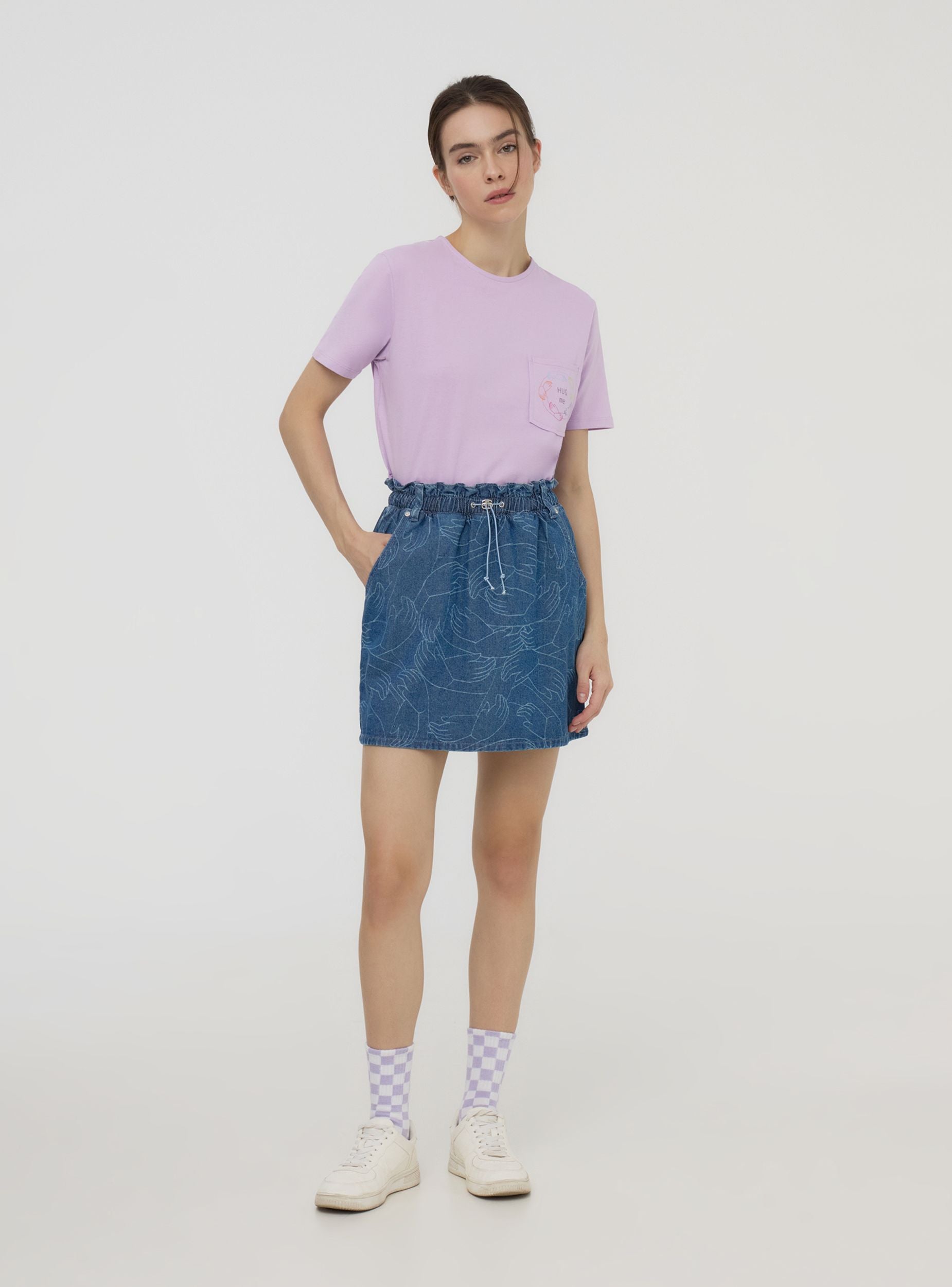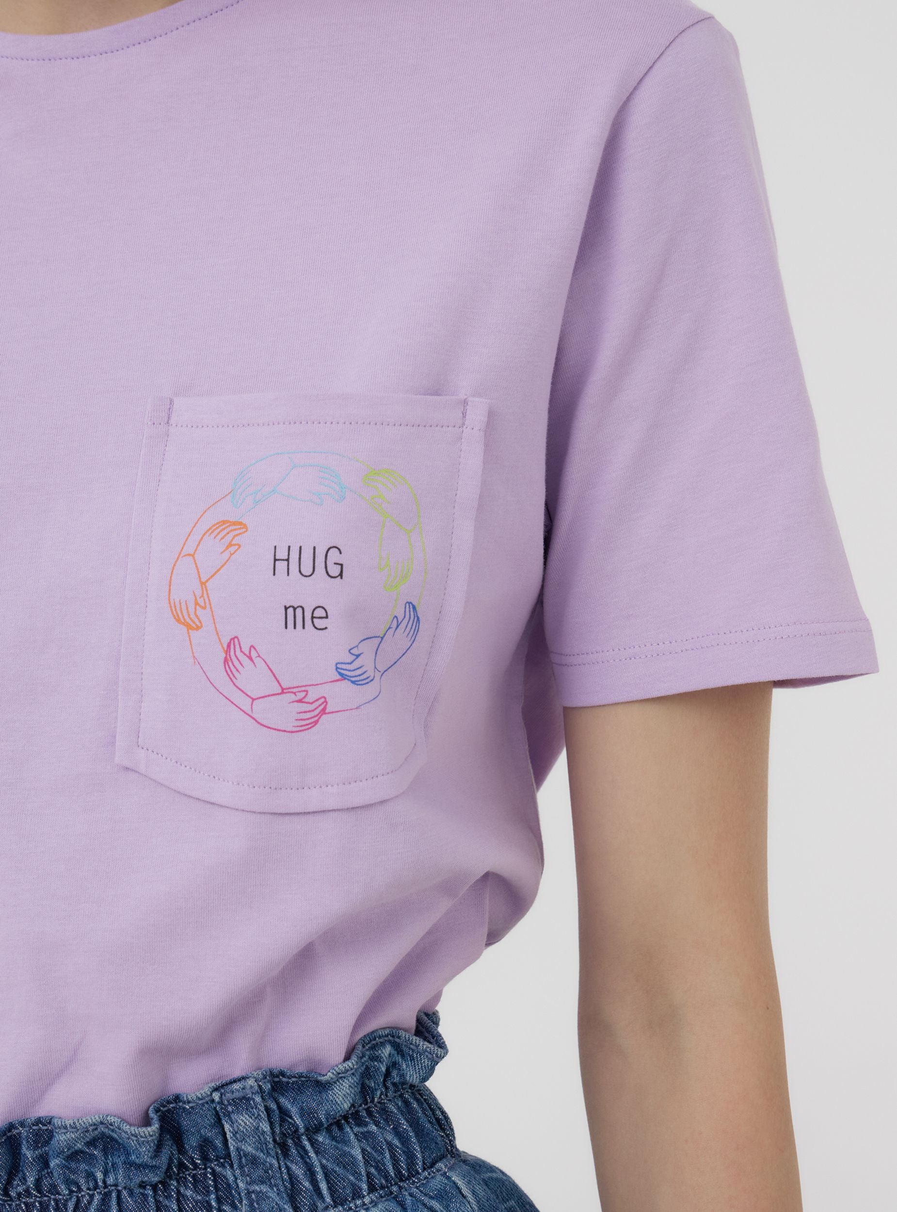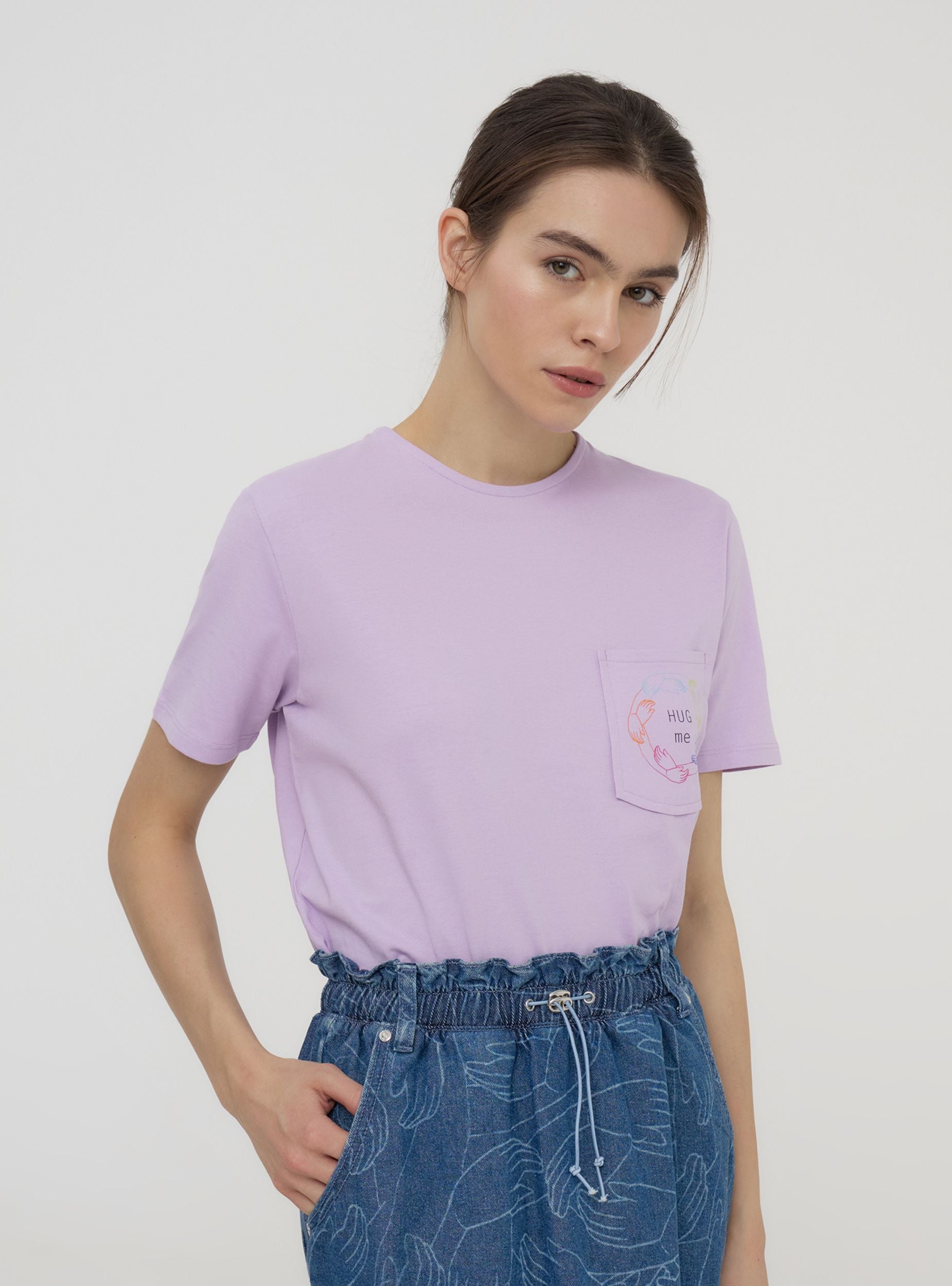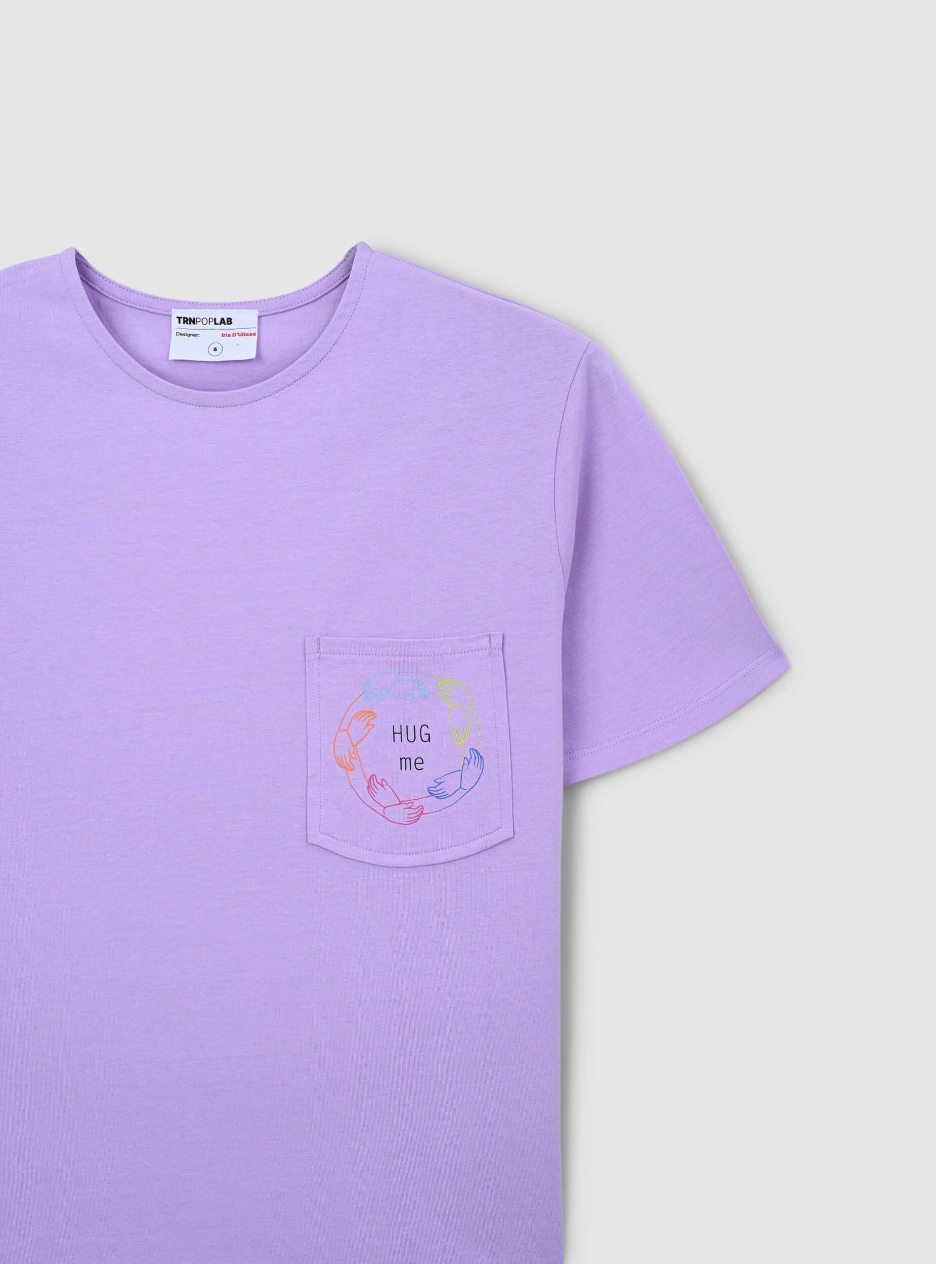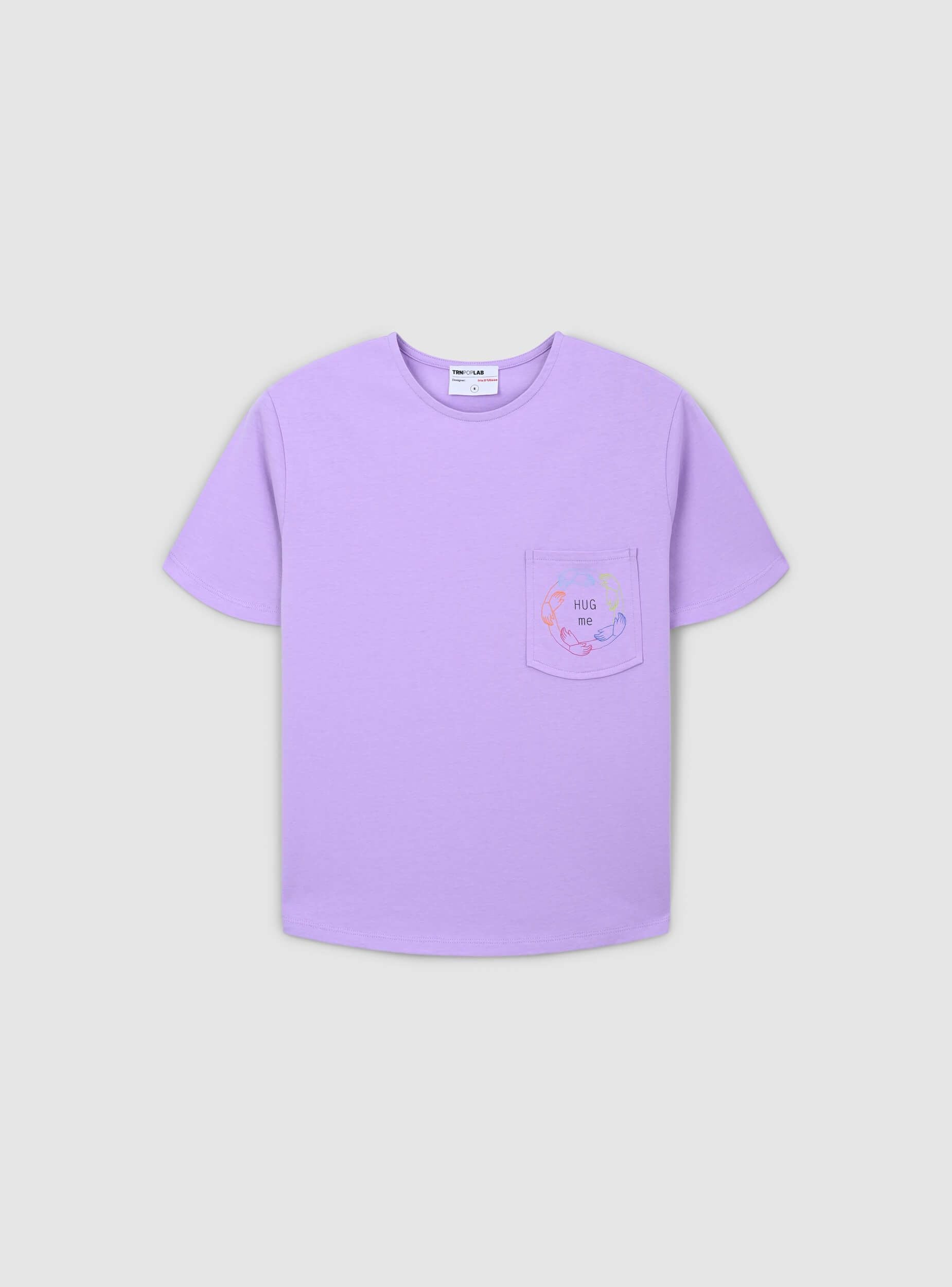 Maglietta da donna con un design semplice e rilassato. Presenta un taschino applicato sul lato sinistro del petto, decorato con una piccola stampa che riporta la frase "Hug me" e un motivo stilizzato. Il taglio della maglietta è morbido, con maniche corte e girocollo. La parte posteriore è priva di decorazioni, mantenendo uno stile essenziale e casual, perfetto per l'uso quotidiano. Questo articolo fa parte del progetto TRNPOPLAB nato dalla collaborazione con NABA Milano. Gli studenti di fashion design hanno dato vita a collezioni ispirate ai trend più cool del momento. E ora vedranno le loro creazioni prendere vita e arrivare direttamente nelle tue mani!Dettagli
