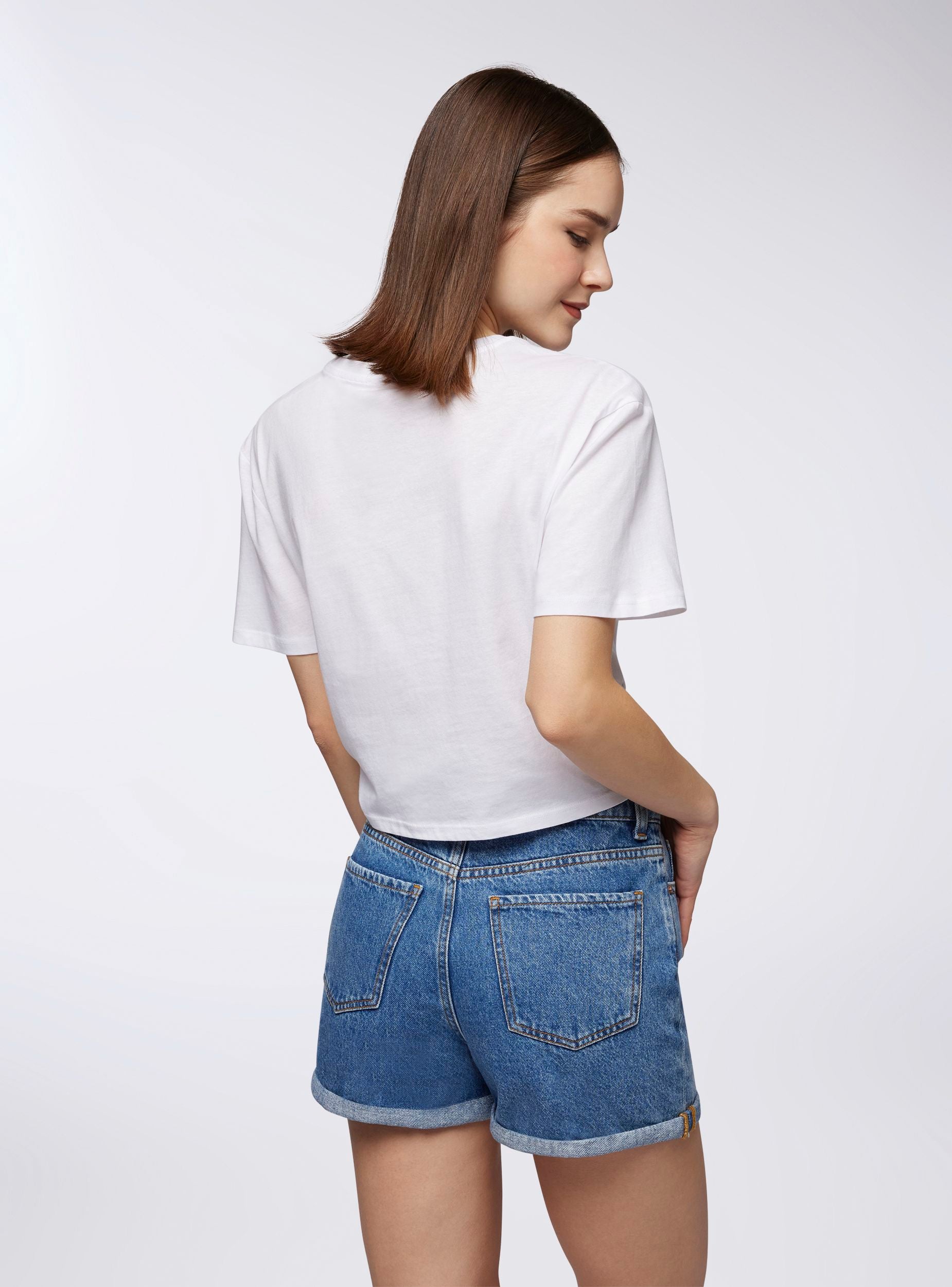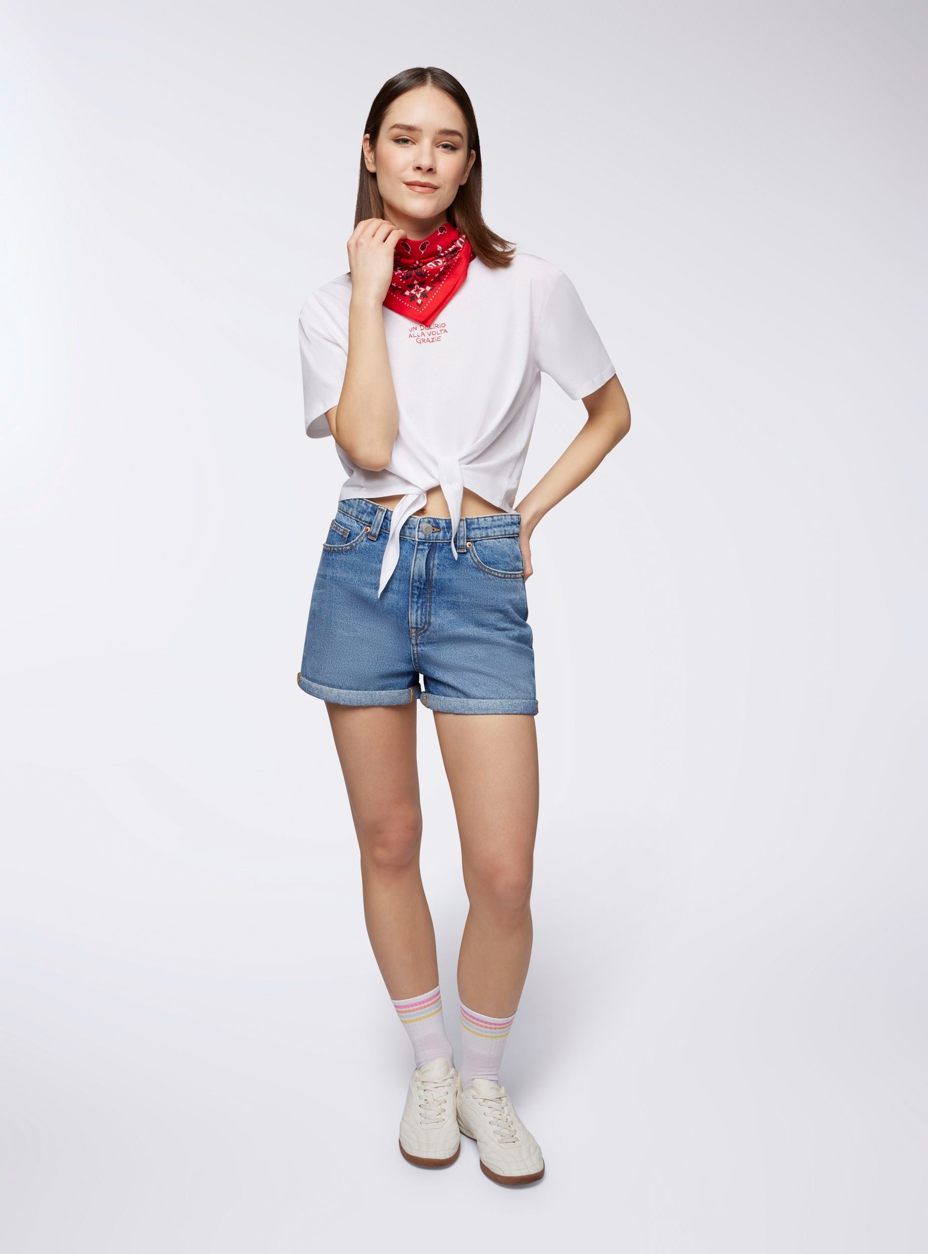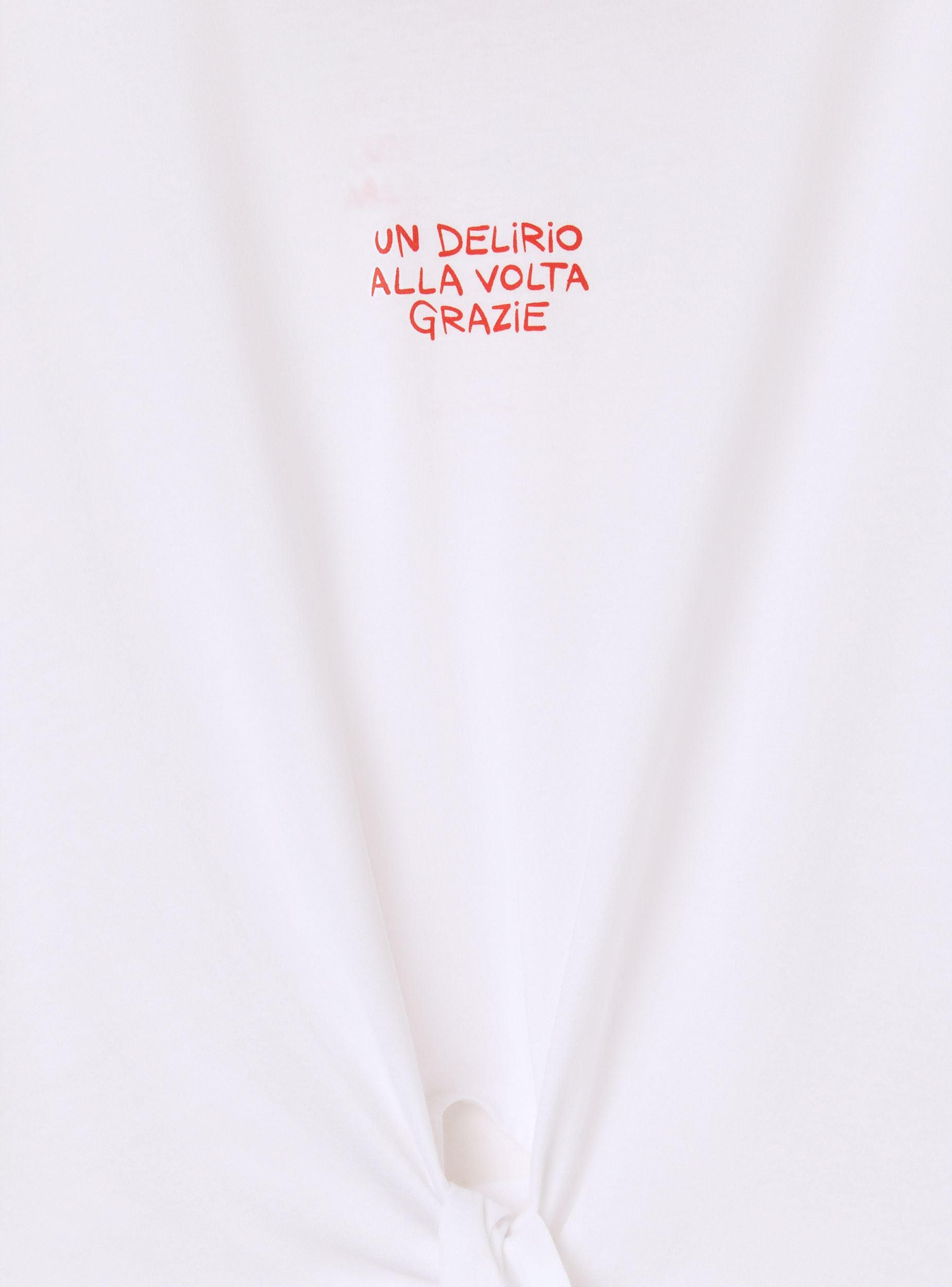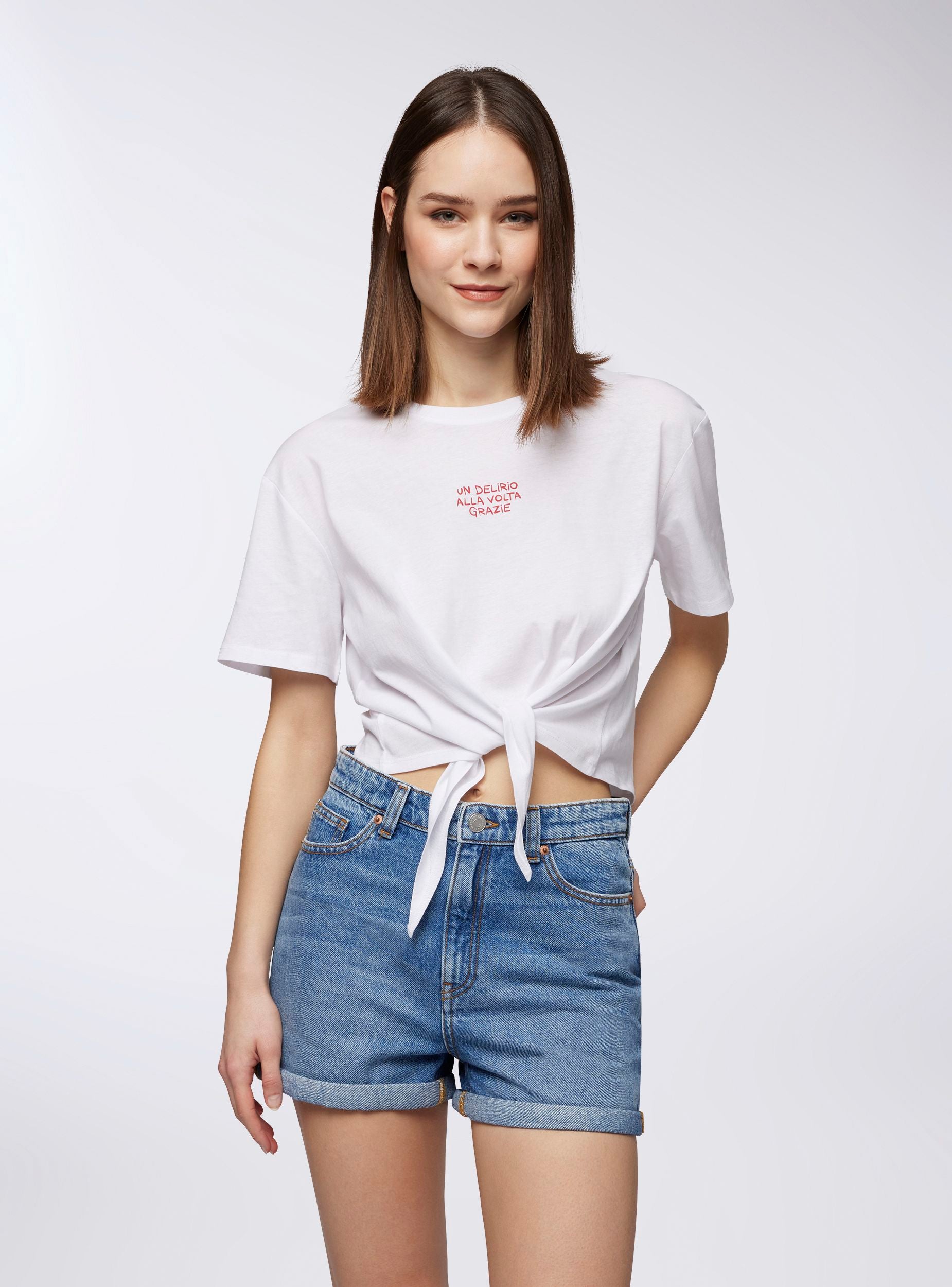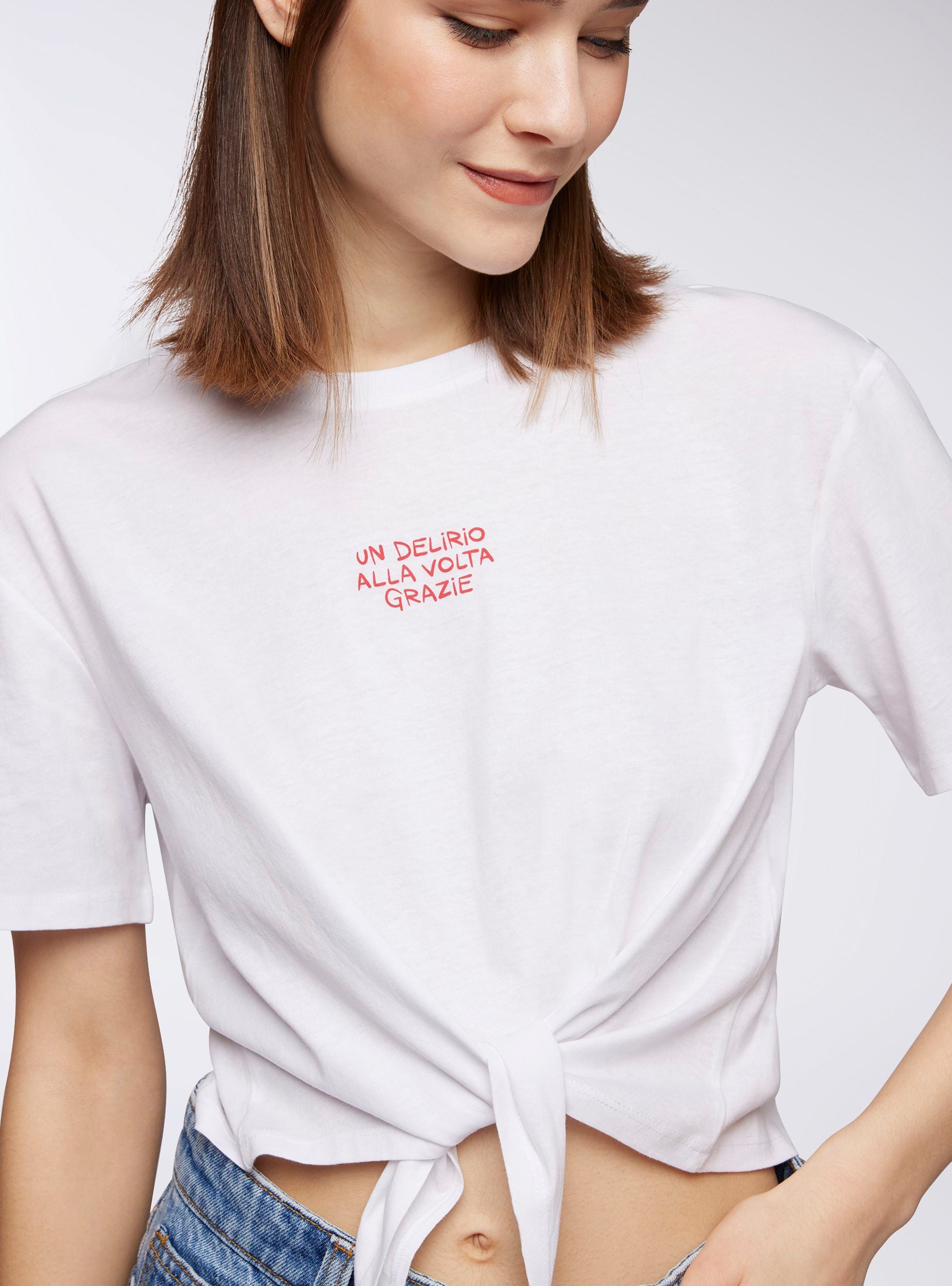 Maglietta da donna dal design moderno e rilassato, con vestibilità ampia e taglio crop per un look fresco e dinamico. Le maniche corte e il girocollo assicurano comfort, mentre la scritta simpatica aggiunge un tocco di personalità. Il nodo sul davanti dona un dettaglio trendy. Perfetta da abbinare a jeans a vita alta, shorts o gonne, ideale per il tempo libero e le uscite informali.Dettagli