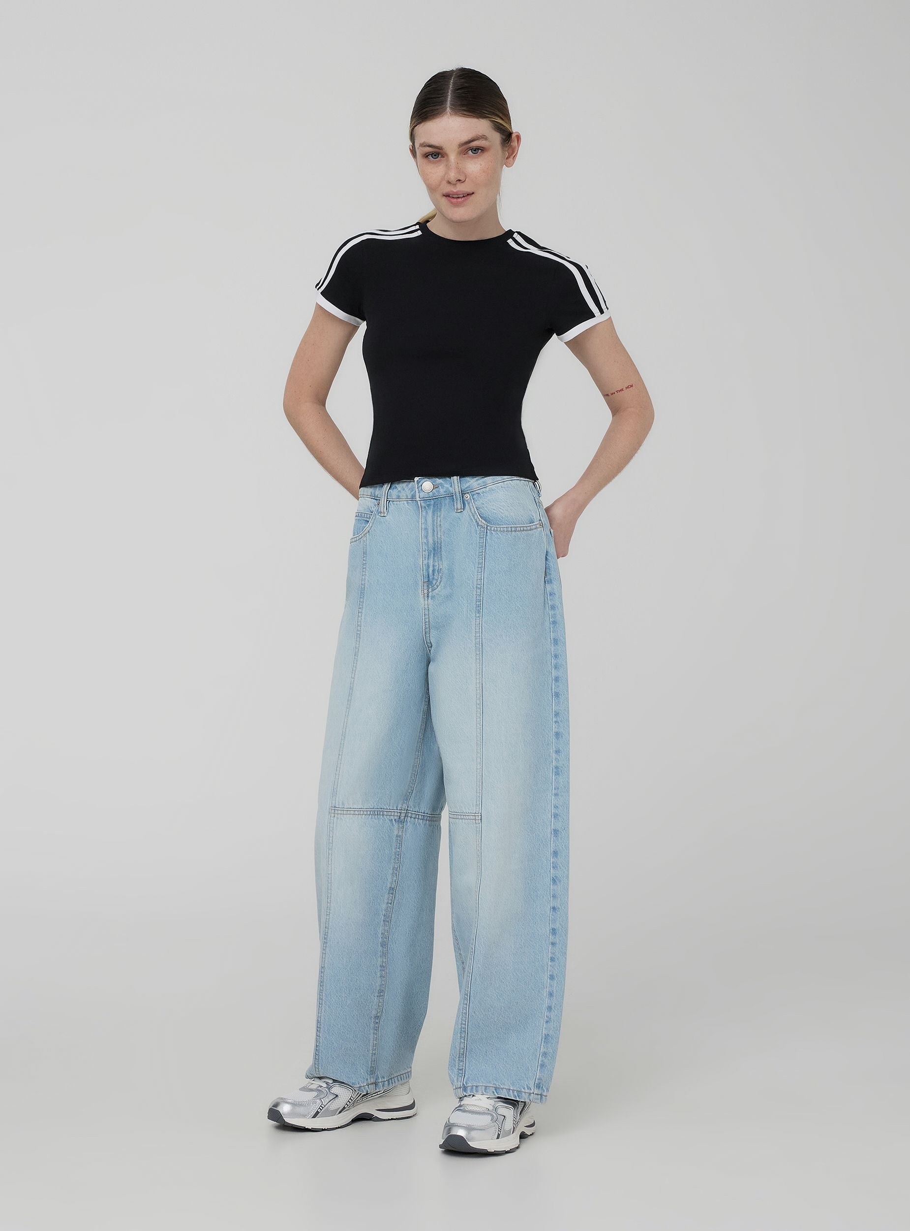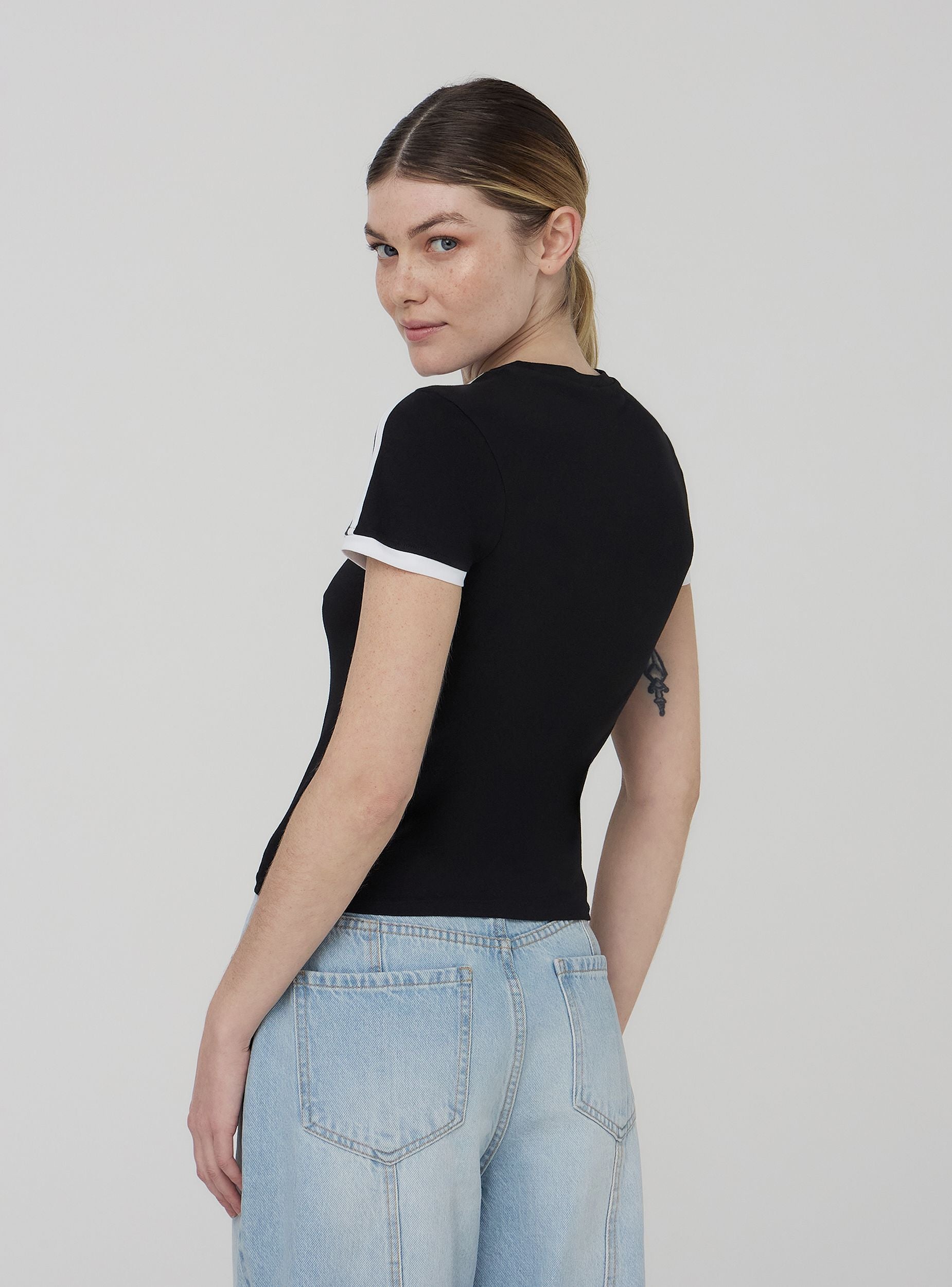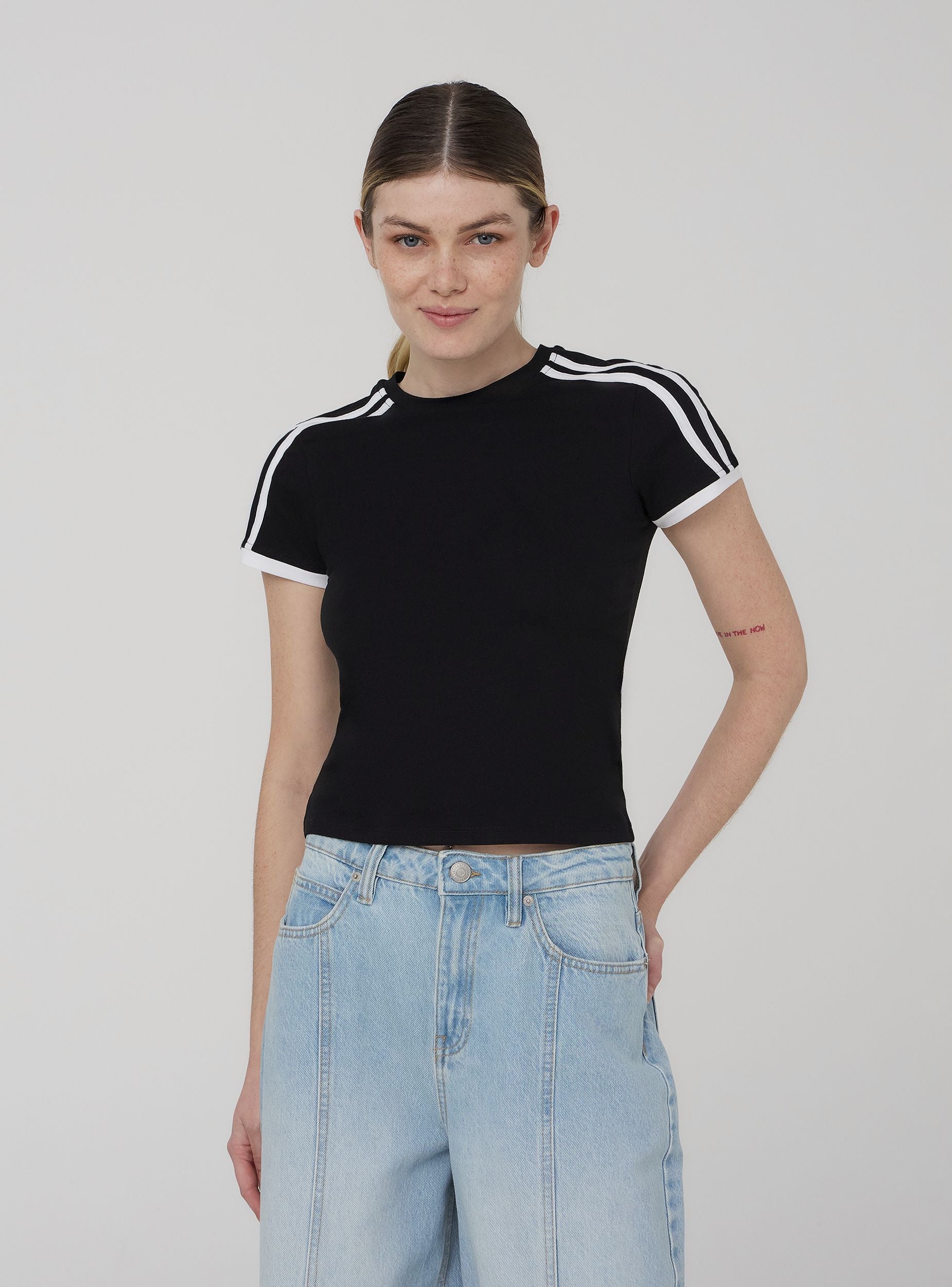 Maglietta da donna dal taglio crop, con girocollo e maniche corte. Il dettaglio delle bande applicate sulle maniche aggiunge un tocco sportivo e dinamico, rendendo il capo perfetto per un look casual ma grintoso. Ideale da abbinare con un paio di jeans a vita alta o leggings sportivi per un outfit comodo e trendy. Per un look più streetwear, puoi completare l'insieme con sneakers e una giacca oversize, mentre per un tocco più estivo, puoi abbinarla con shorts e sandali.Dettagli