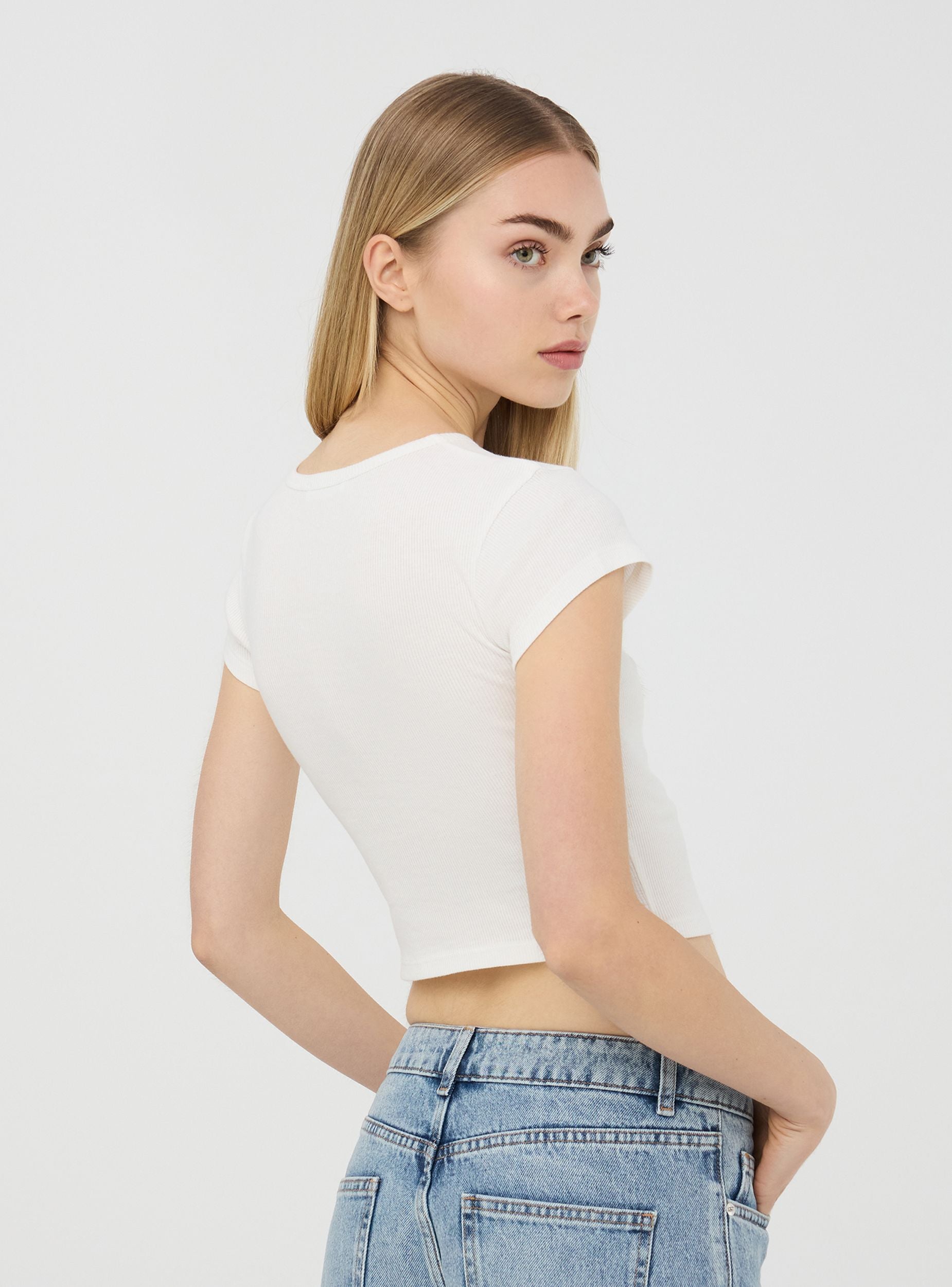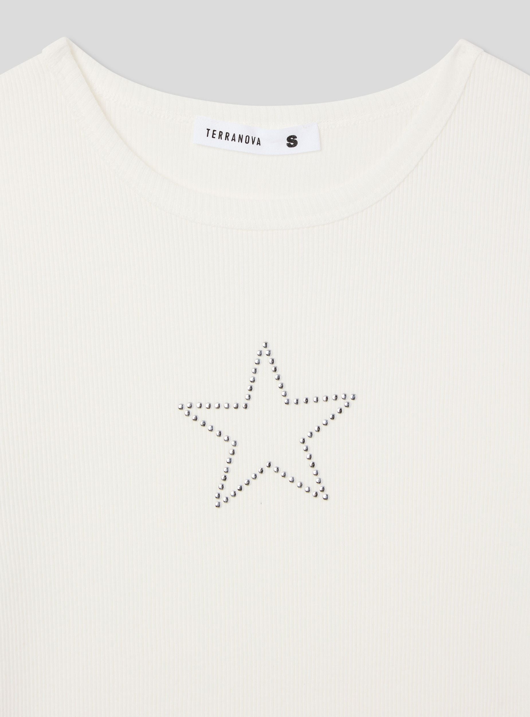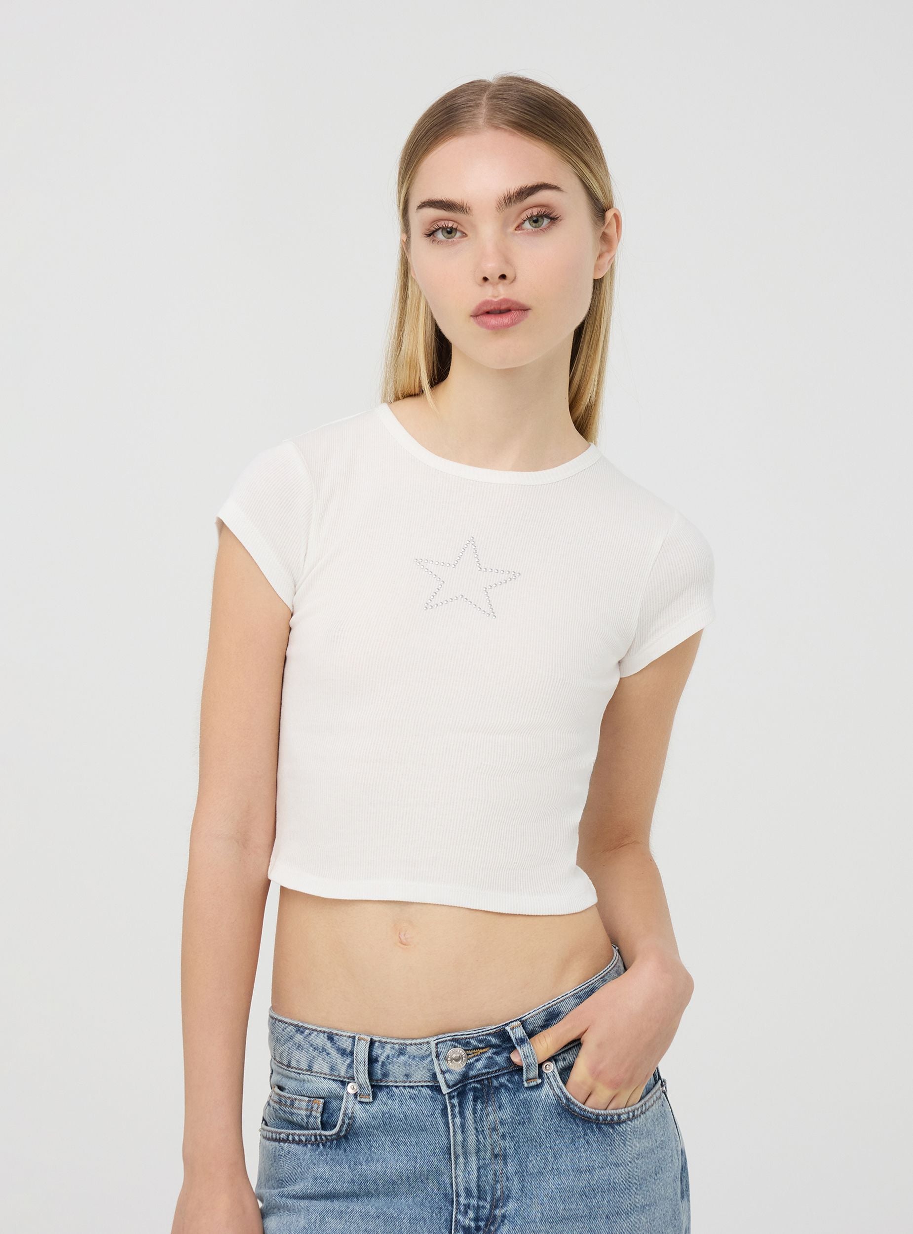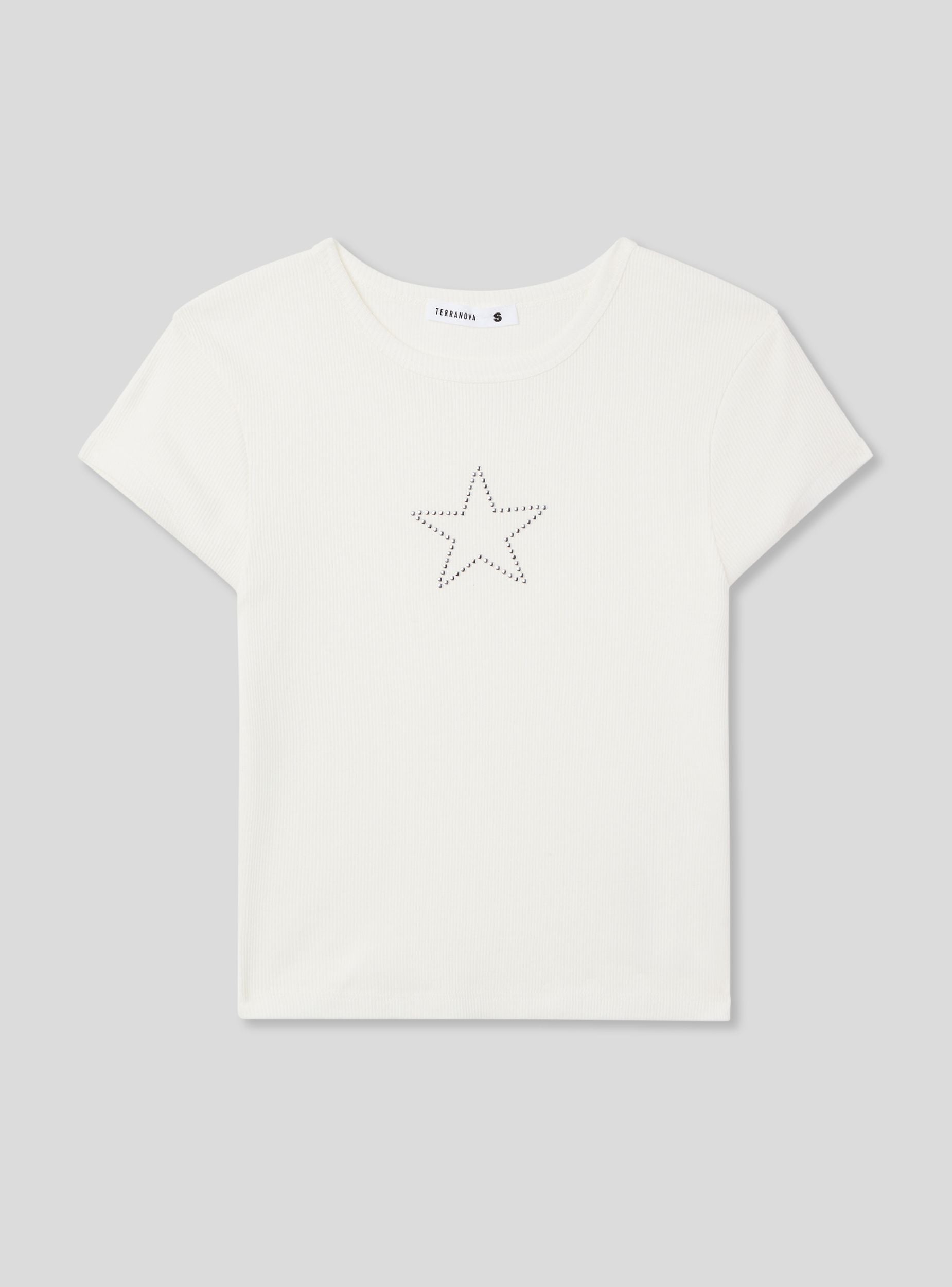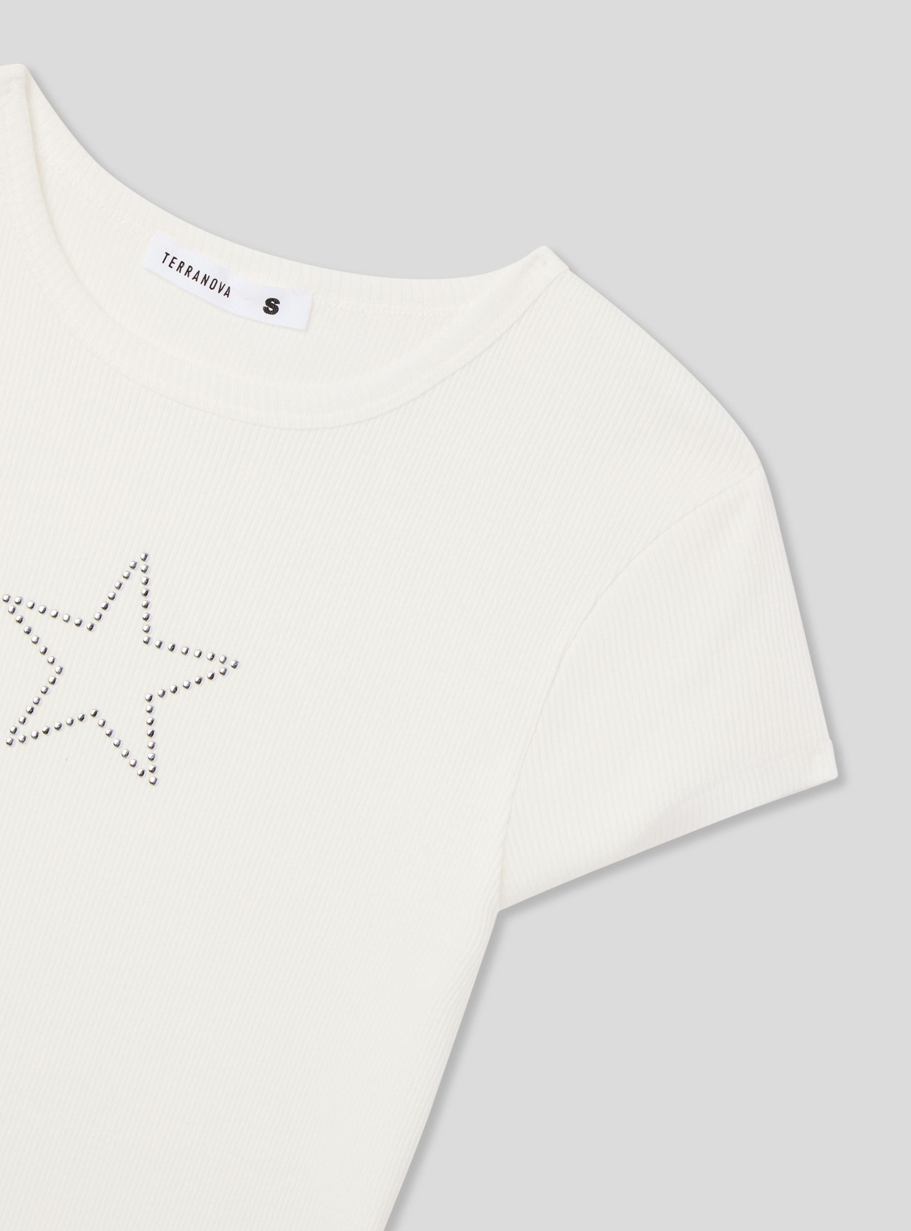 Maglietta da donna crop, caratterizzata da un design moderno e casual. Sul davanti spicca una stella decorata con piccole borchie, che dona un tocco grintoso e distintivo al capo. Il girocollo e le maniche corte completano il look, rendendo questa maglietta perfetta per essere abbinata a jeans a vita alta o a gonne per un outfit giovane e di tendenza.Dettagli