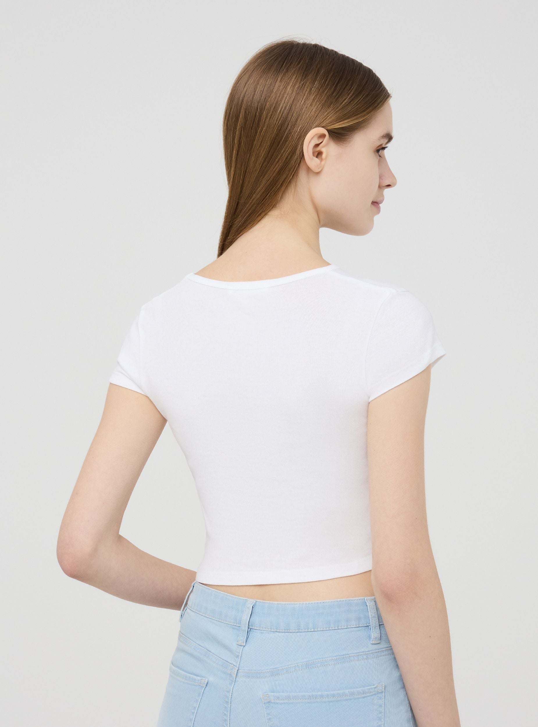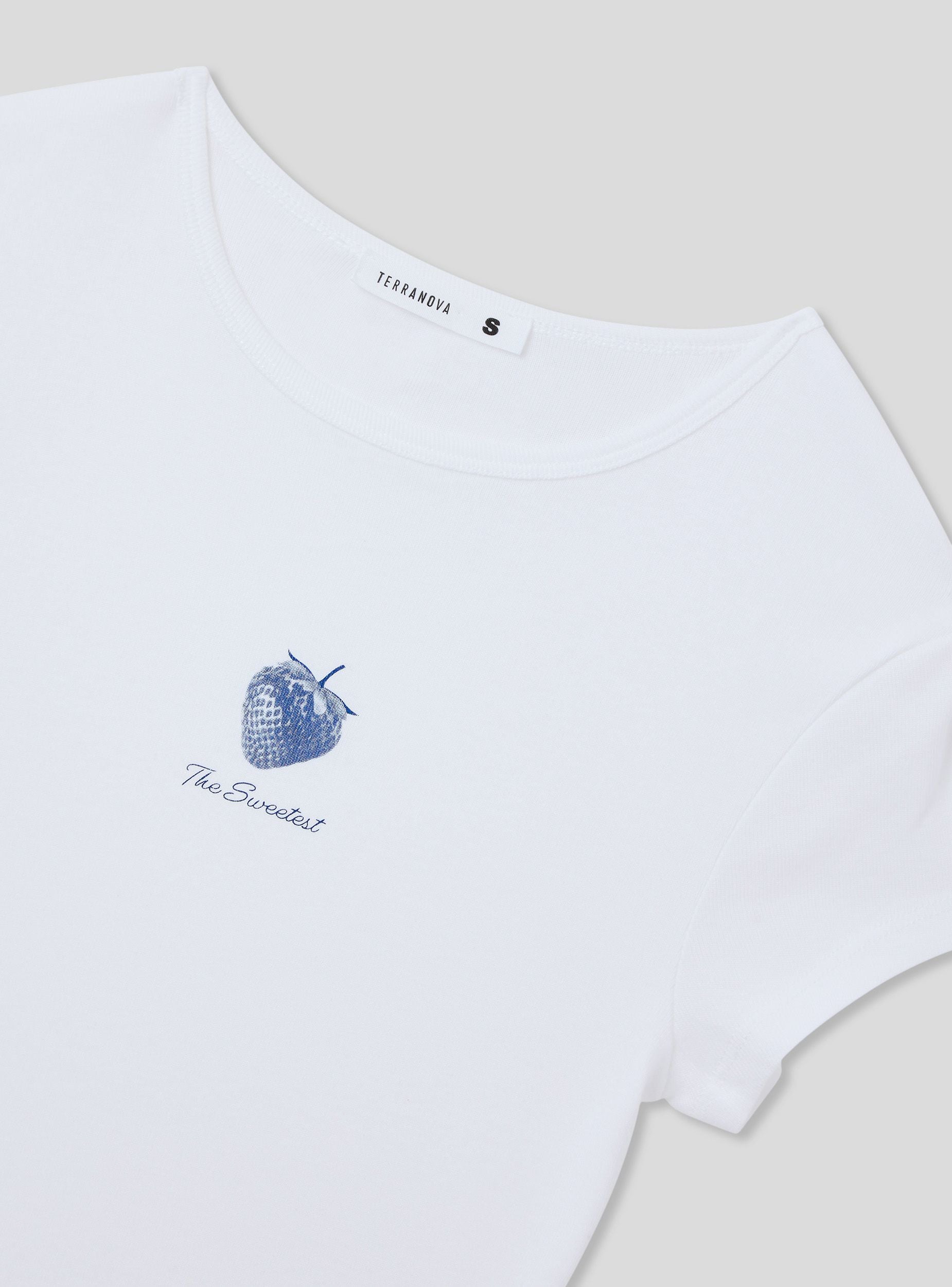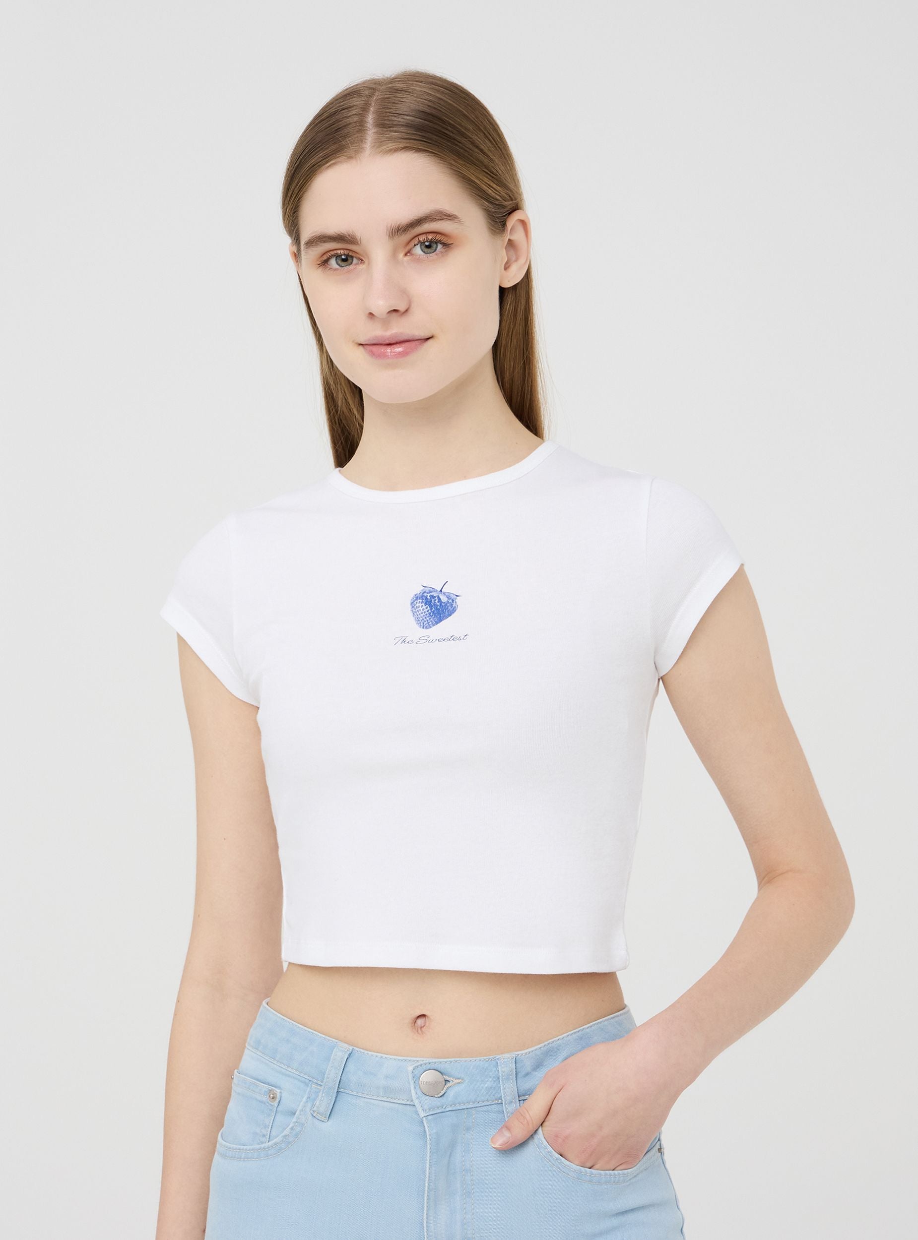 Maglietta da donna crop con girocollo e maniche corte, caratterizzata da una piccola stampa decorativa accompagnata da una scritta minimalista sul davanti. Il taglio corto aggiunge un tocco casual e moderno, perfetto per un look estivo disinvolto. Ideale per abbinamenti con pantaloni a vita alta o gonne per un outfit fresco e di tendenza.Dettagli