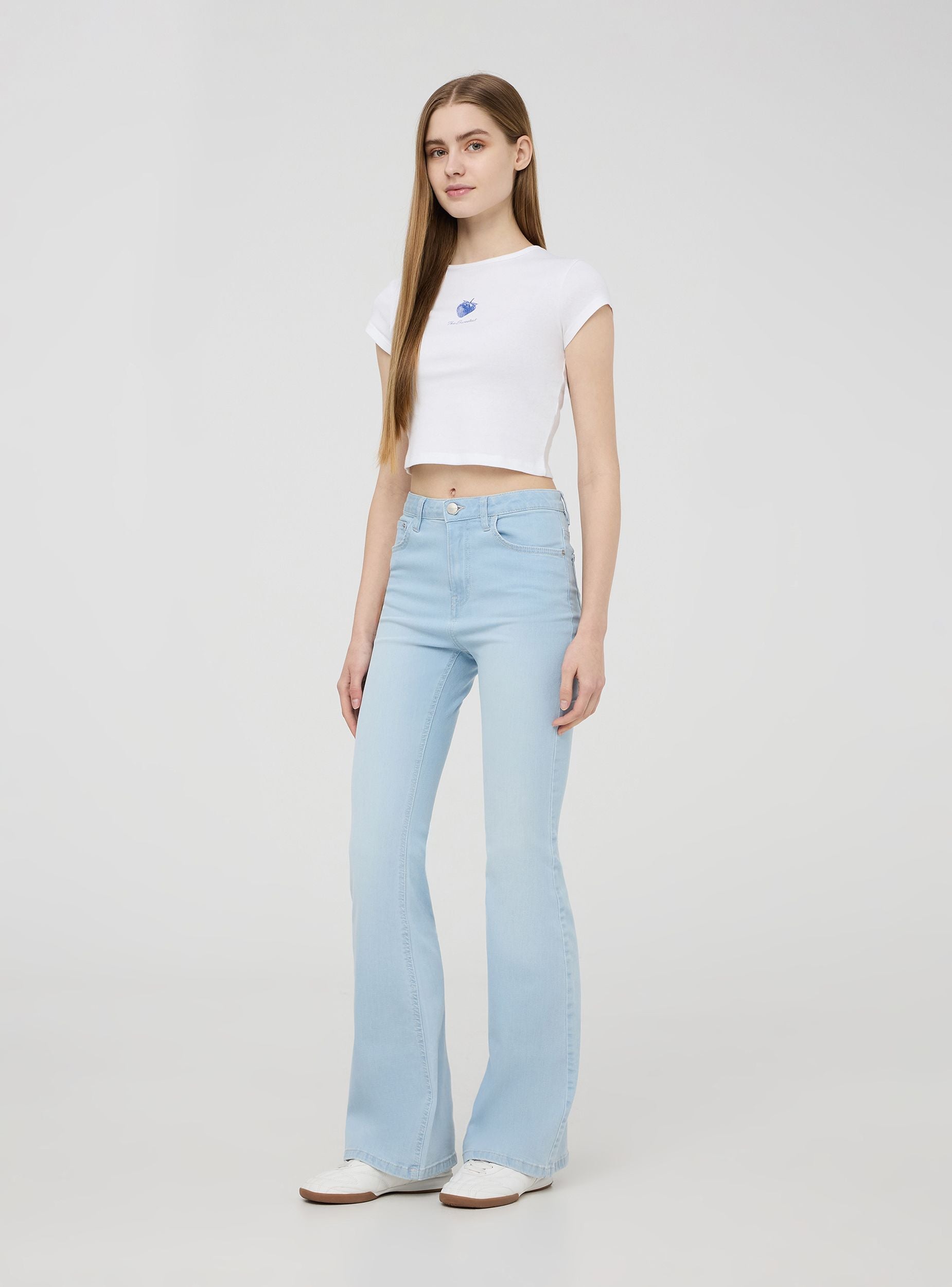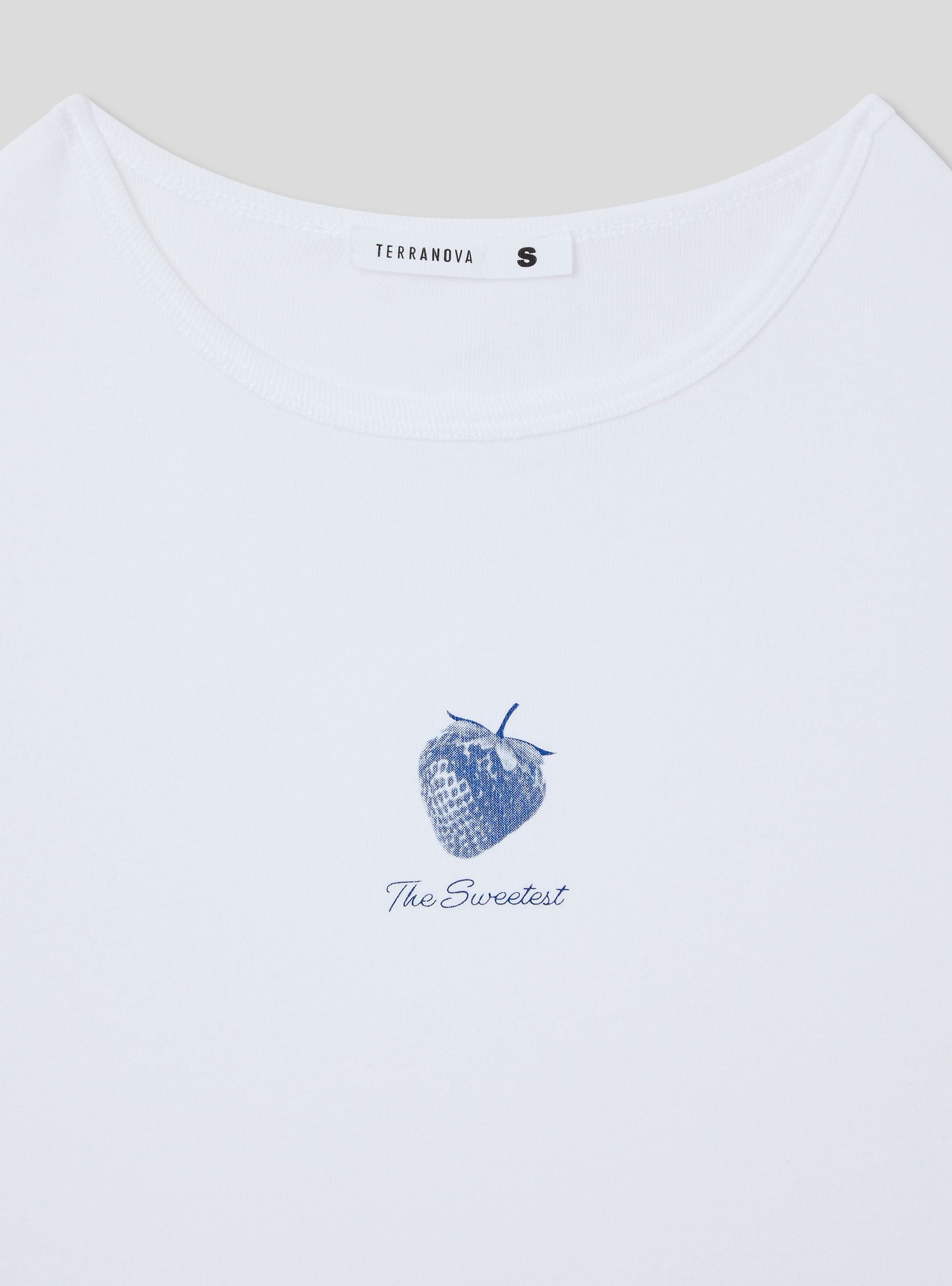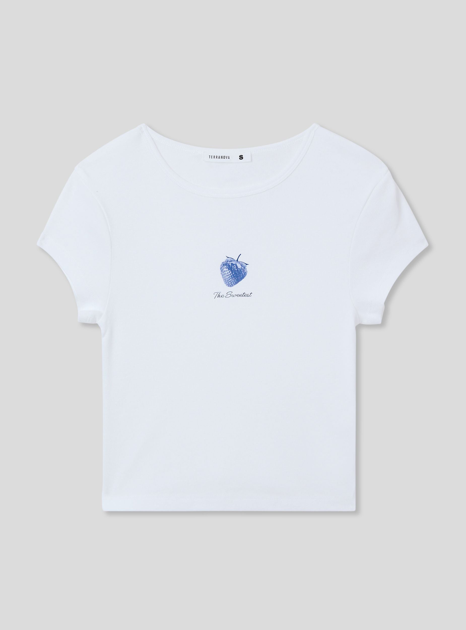 Maglietta da donna crop con girocollo e maniche corte, caratterizzata da una piccola stampa decorativa accompagnata da una scritta minimalista sul davanti. Il taglio corto aggiunge un tocco casual e moderno, perfetto per un look estivo disinvolto. Ideale per abbinamenti con pantaloni a vita alta o gonne per un outfit fresco e di tendenza.Dettagli