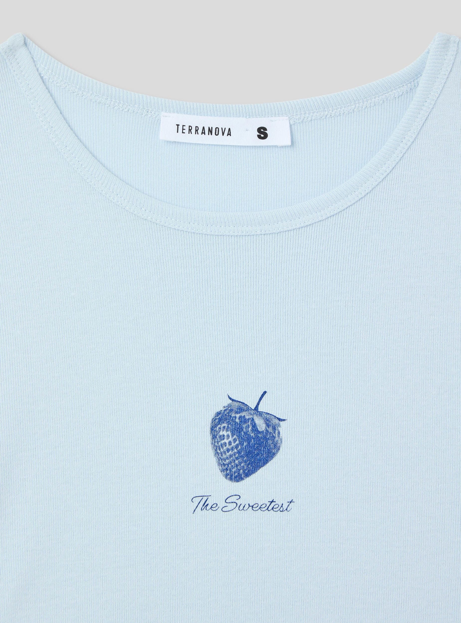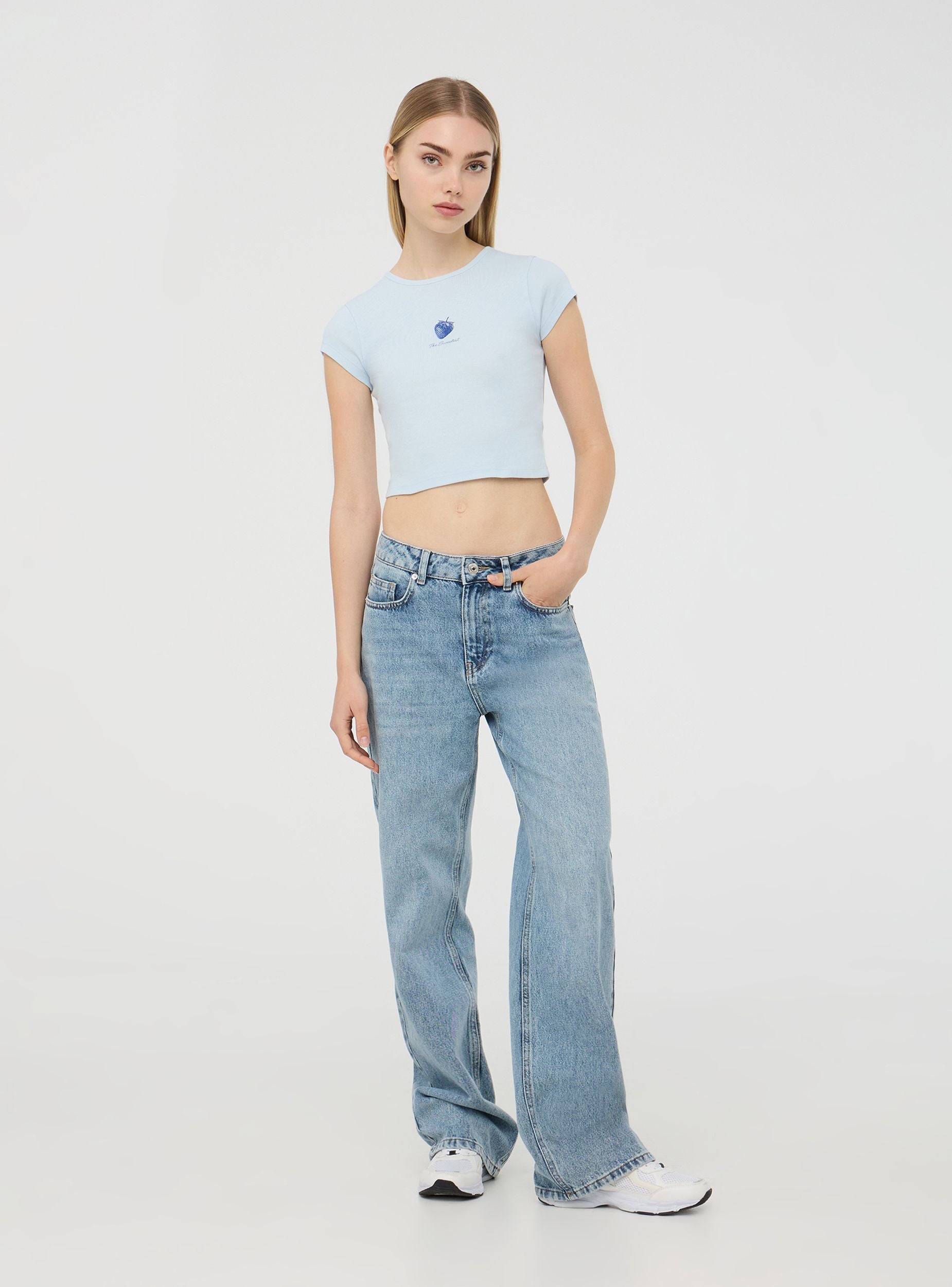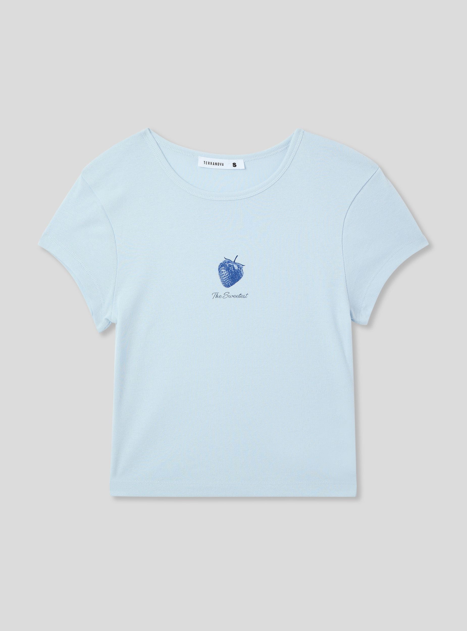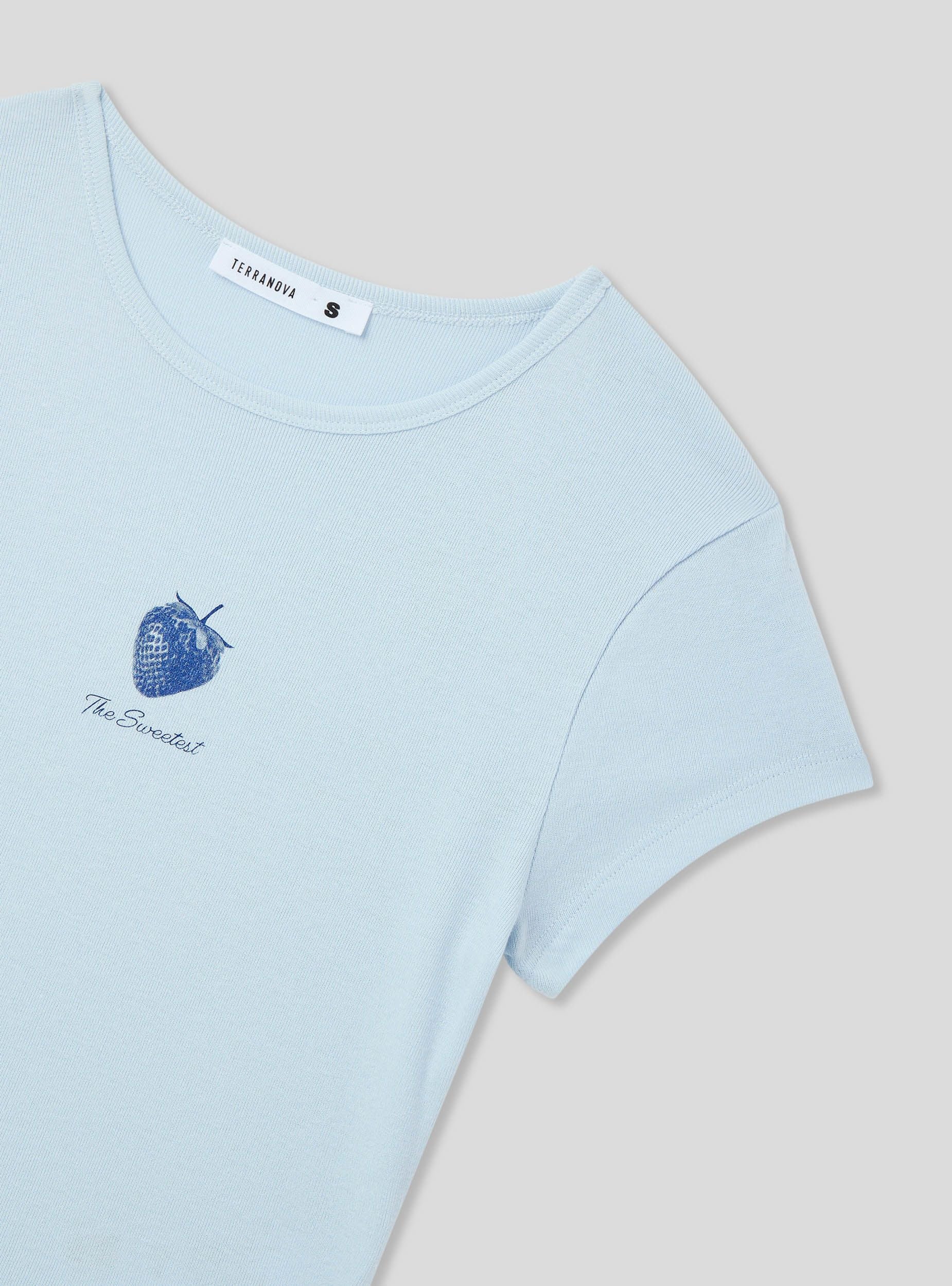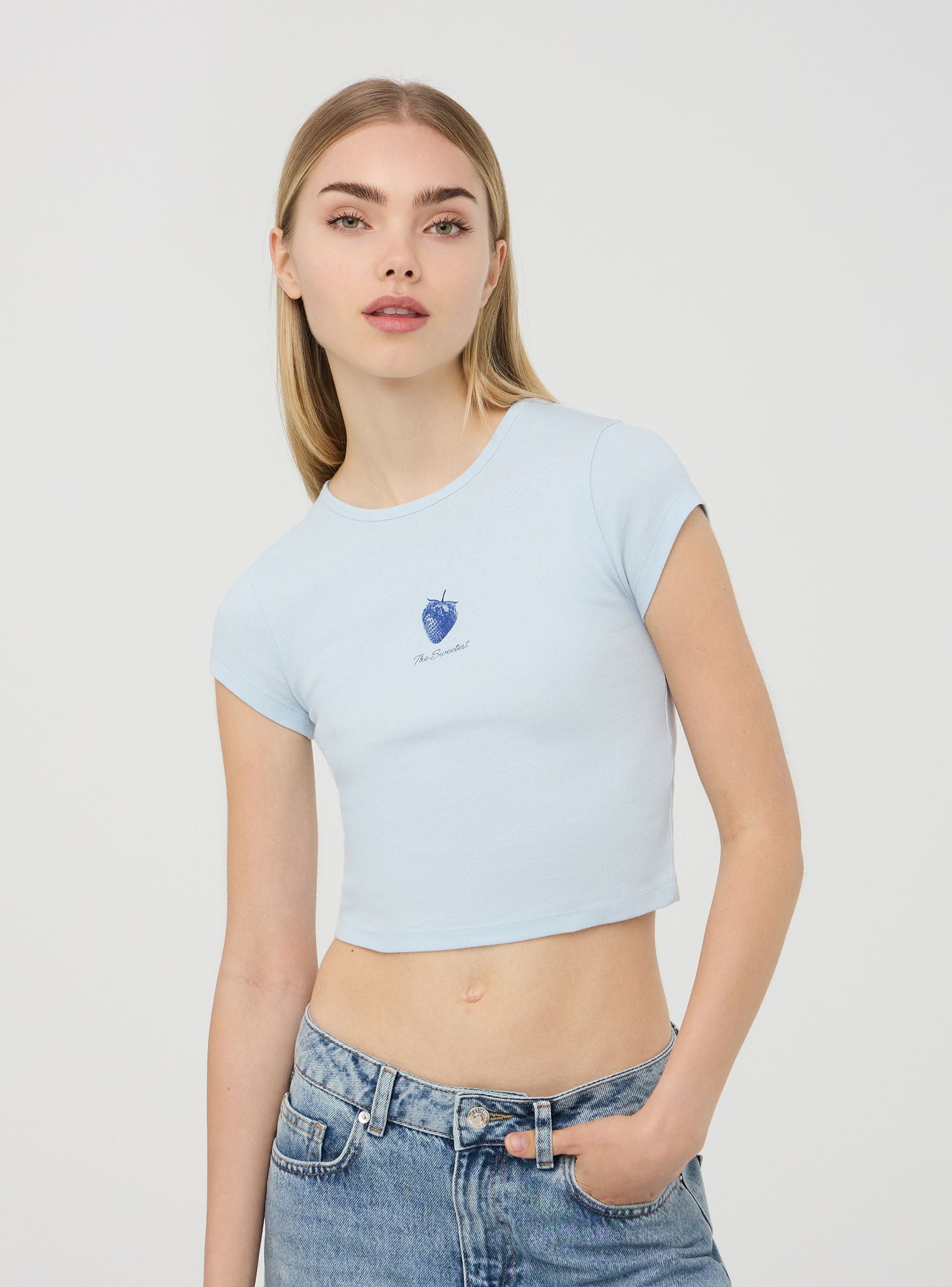 Maglietta da donna crop con girocollo e maniche corte, caratterizzata da una piccola stampa decorativa accompagnata da una scritta minimalista sul davanti. Il taglio corto aggiunge un tocco casual e moderno, perfetto per un look estivo disinvolto. Ideale per abbinamenti con pantaloni a vita alta o gonne per un outfit fresco e di tendenza.Dettagli