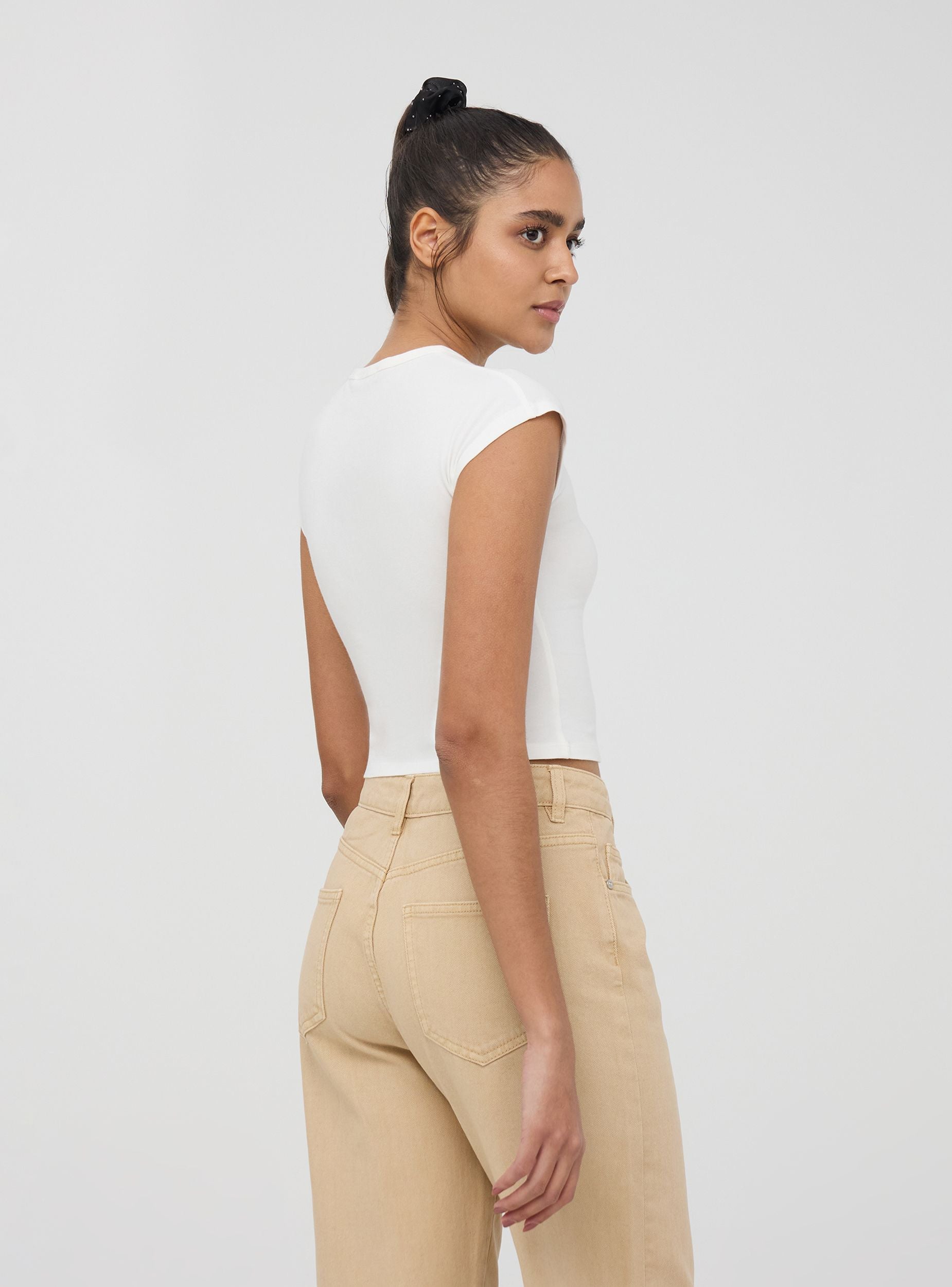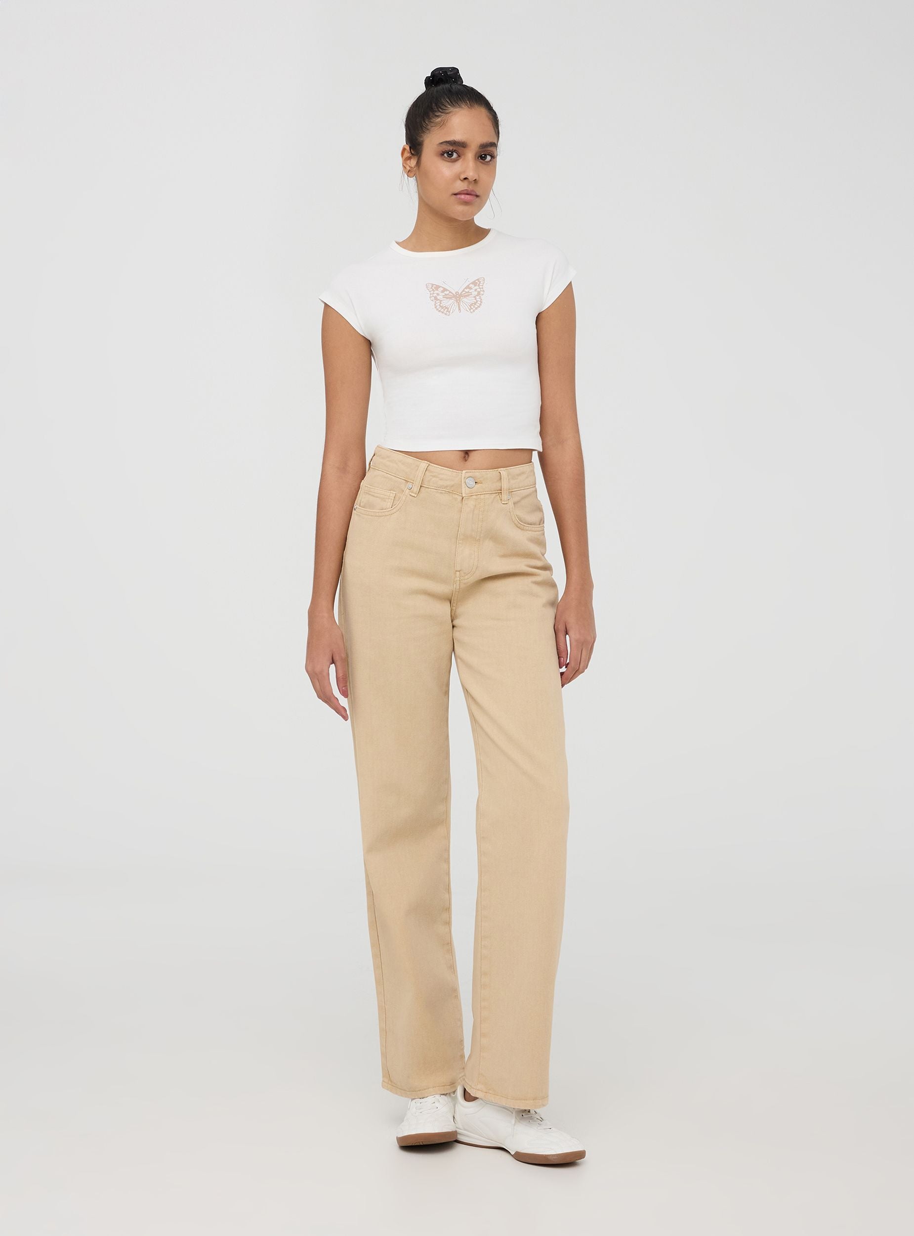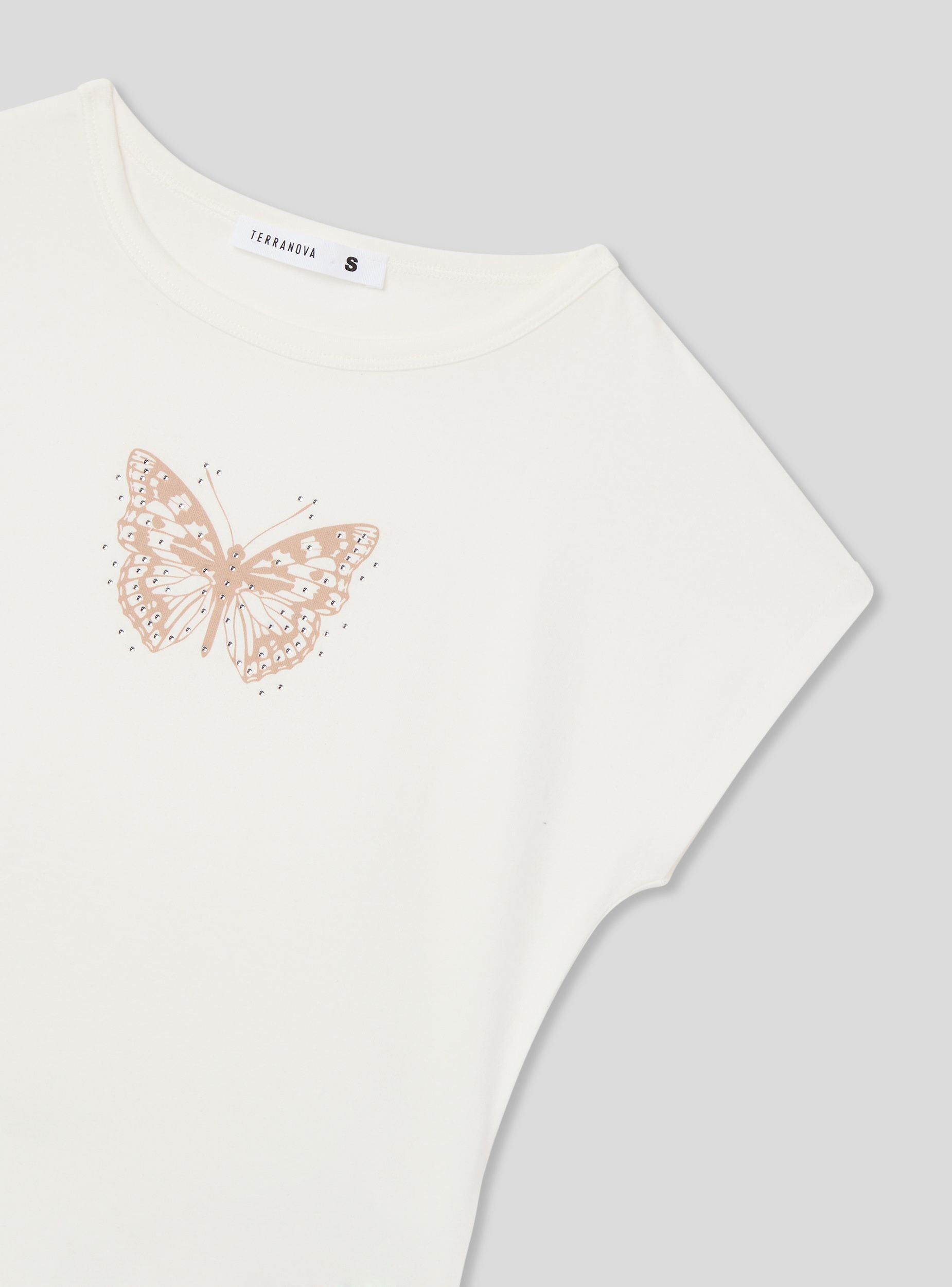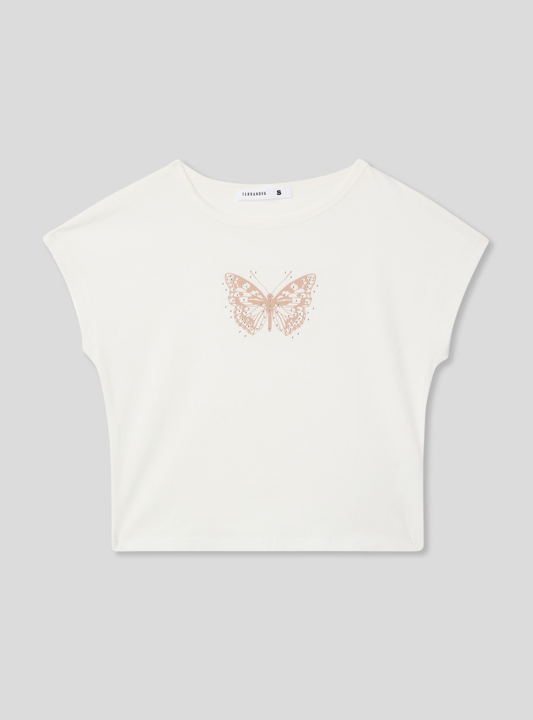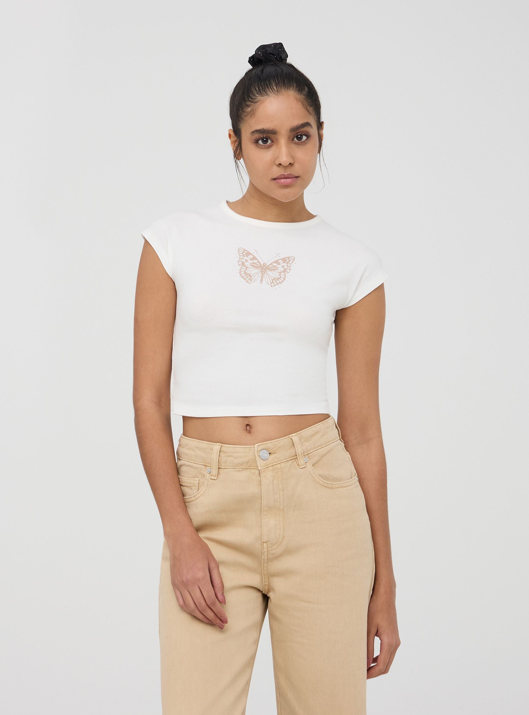 Maglietta da donna crop con un design accattivante caratterizzato da una stampa di farfalla sul fronte. La farfalla è impreziosita da applicazioni di strass che aggiungono un tocco brillante al capo, rendendolo unico. Le maniche corte donano comodità e freschezza, mentre il taglio corto la rende perfetta per abbinamenti trendy e casual, evidenziando la silhouette in modo stiloso. Questo modello unisce dettagli delicati a una vestibilità contemporanea.Dettagli