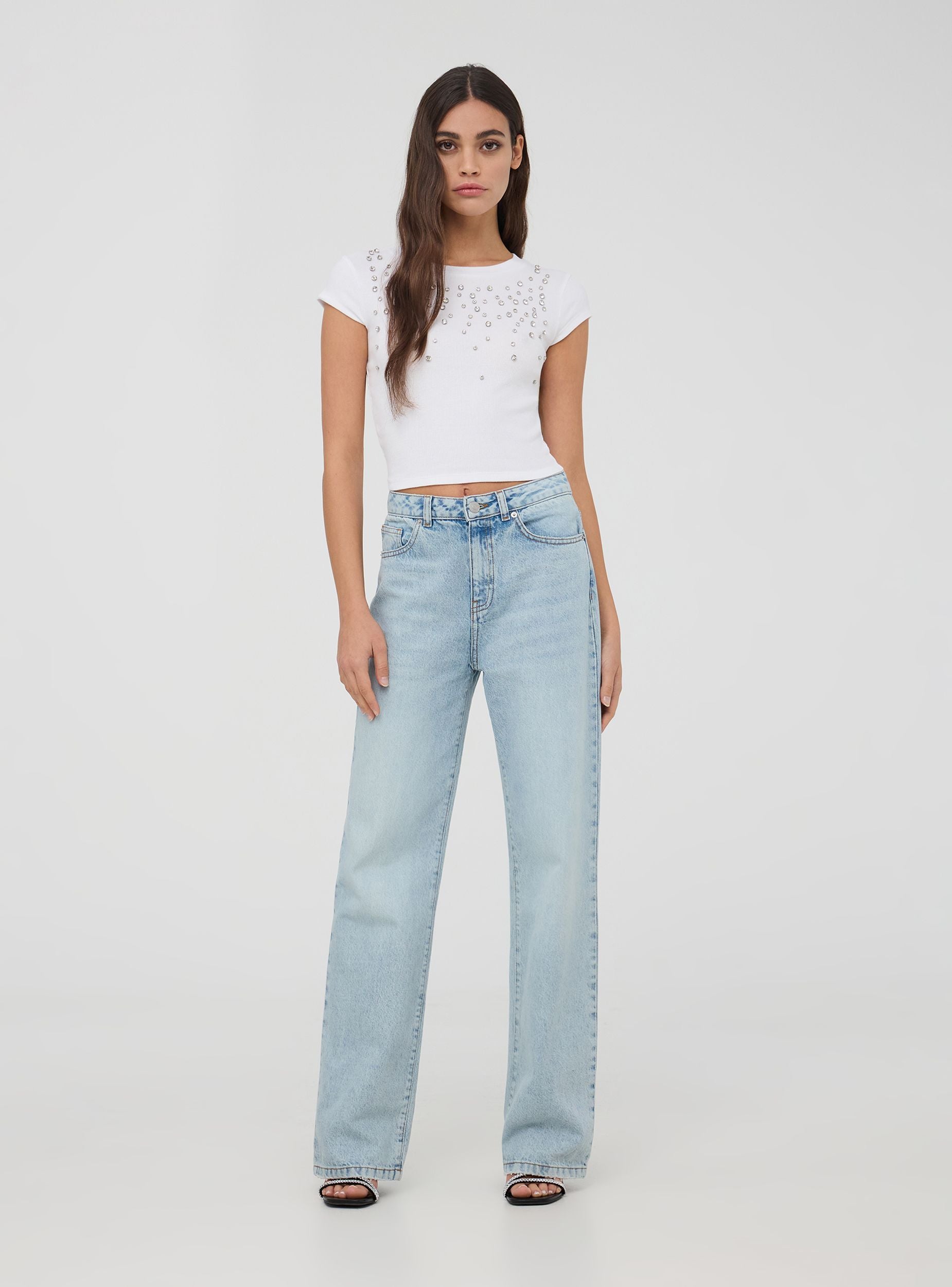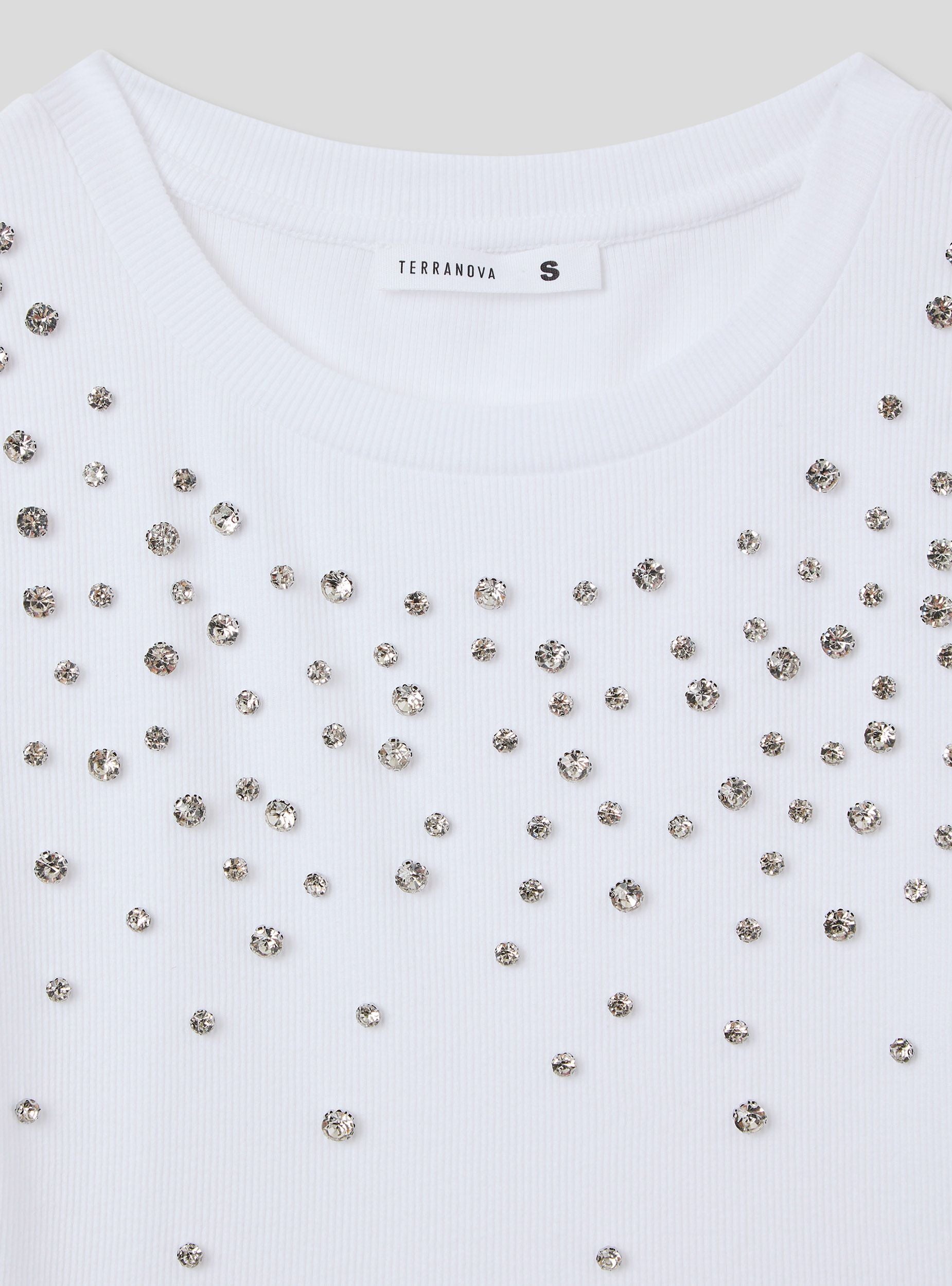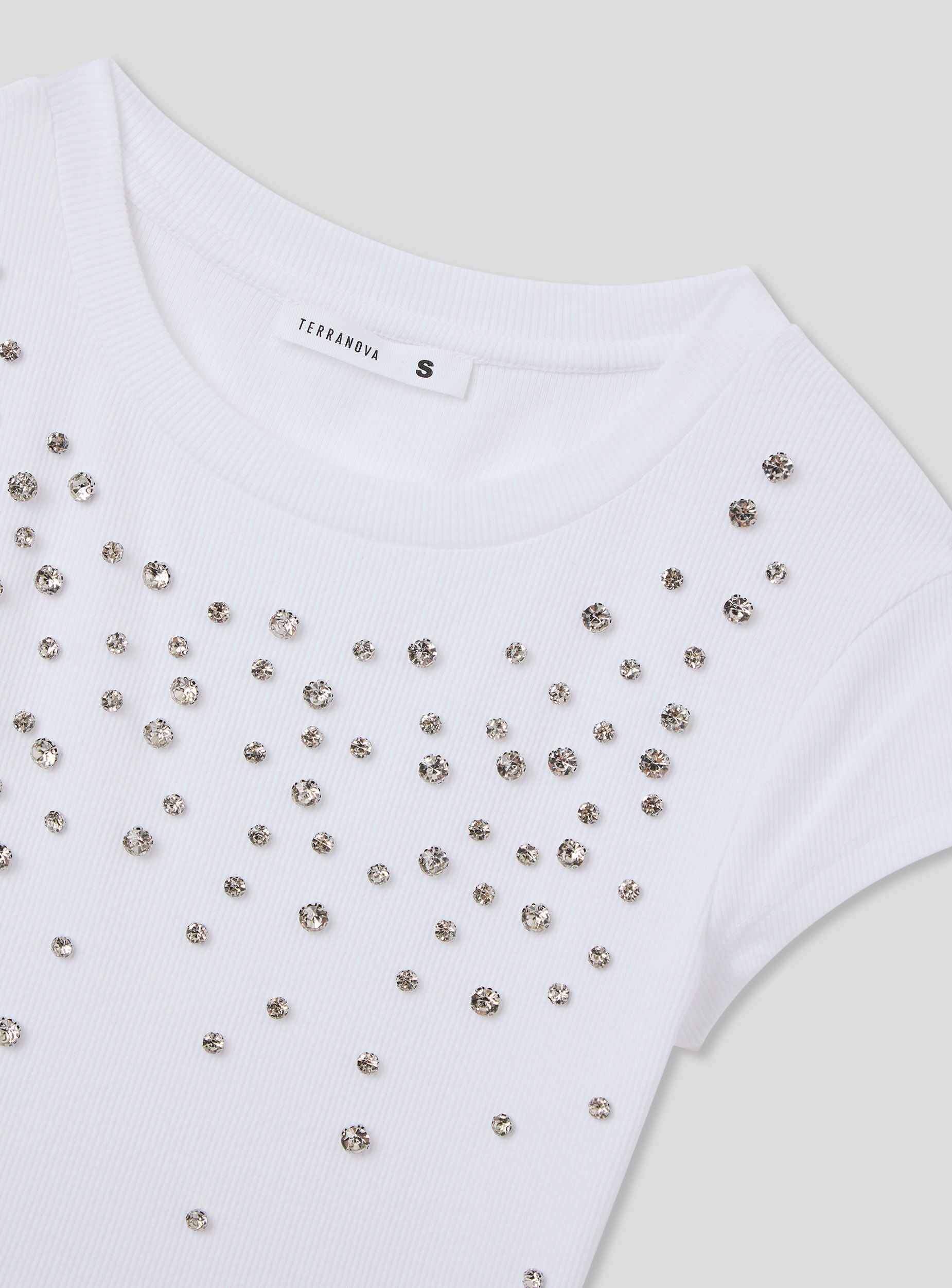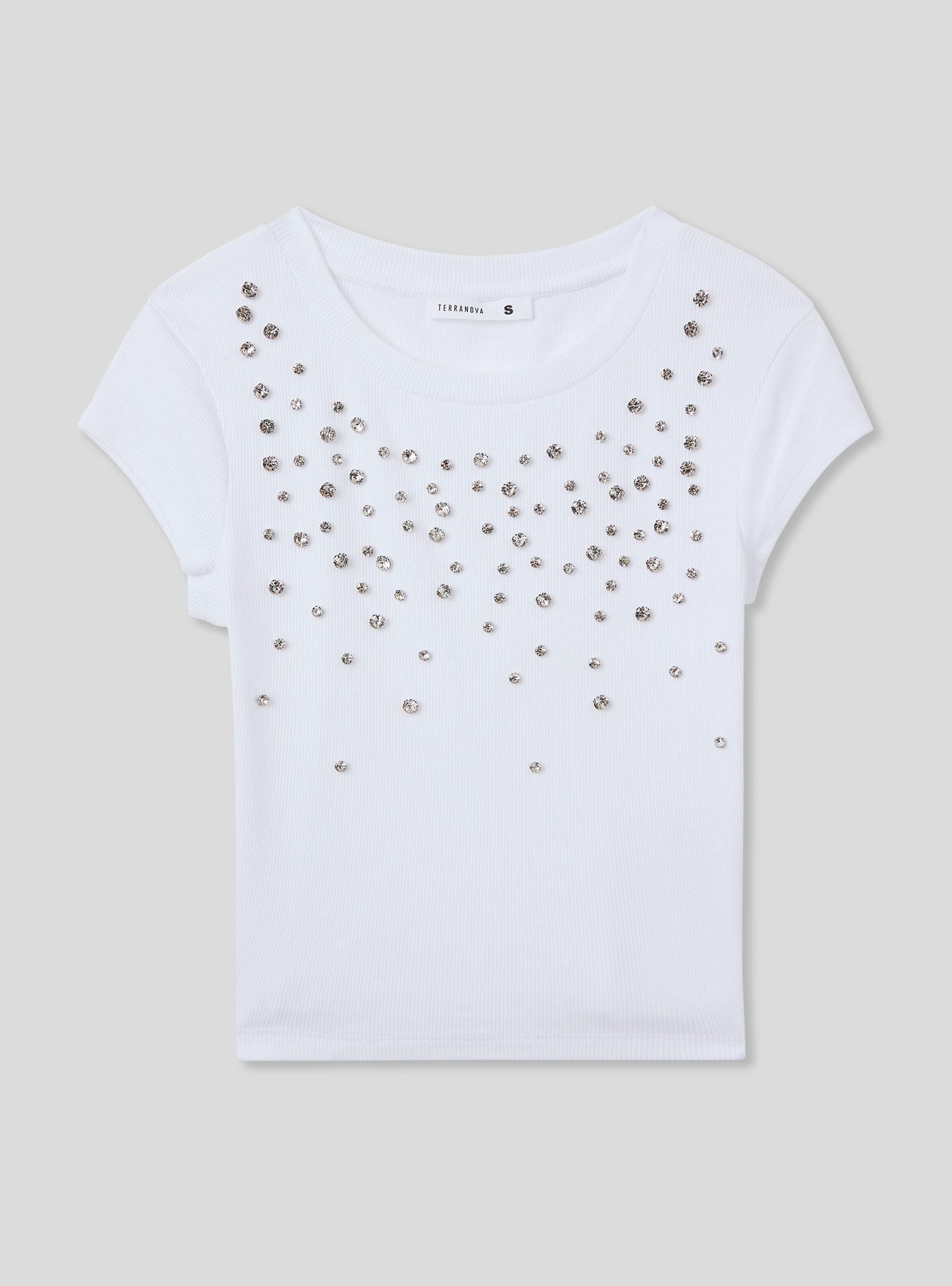 Maglietta da donna crop dal design moderno con girocollo e maniche corte, caratterizzata da applicazioni decorative che donano un tocco di luce e originalità al capo. Il taglio corto e la vestibilità confortevole la rendono perfetta per creare outfit freschi e casual, aggiungendo un elemento chic e raffinato grazie alle decorazioni.Dettagli