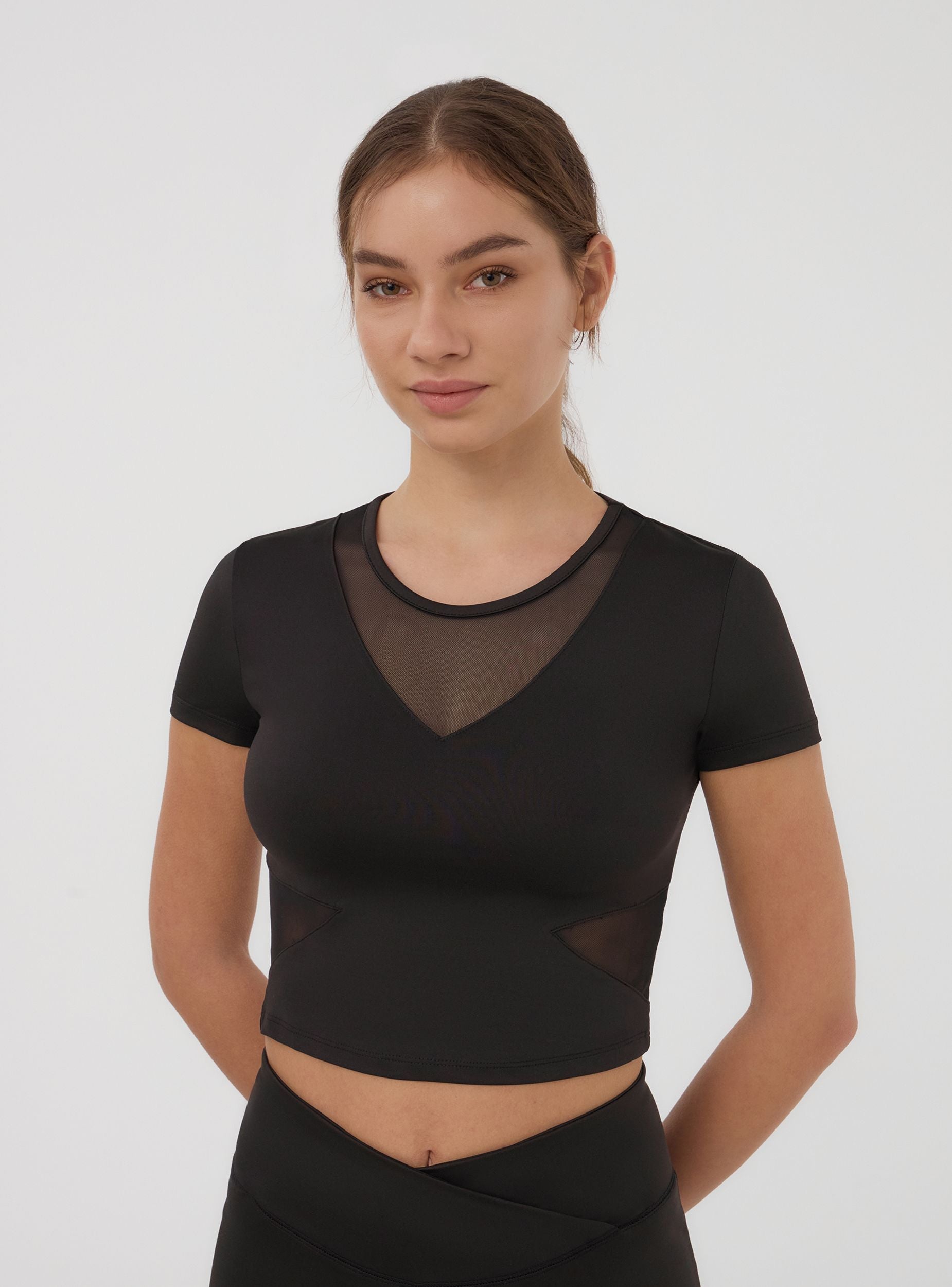 Maglietta sportiva da donna a tinta unita, pensata per il massimo comfort e per ottime performance. Realizzata in microfibra, offre un'ottima vestibilità. Il design è arricchito da inserti con trasparenze nella parte frontale, creando un effetto dinamico e moderno. Le maniche corte e il taglio crop garantiscono libertà di movimento, rendendo questa maglietta ideale per l’allenamento. Linea Active.Dettagli
