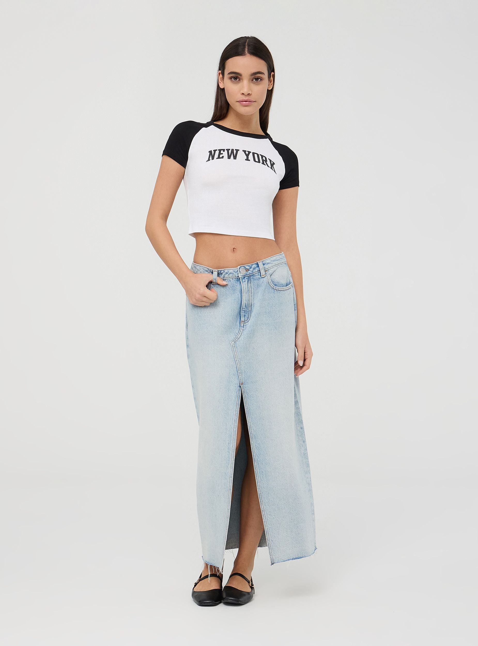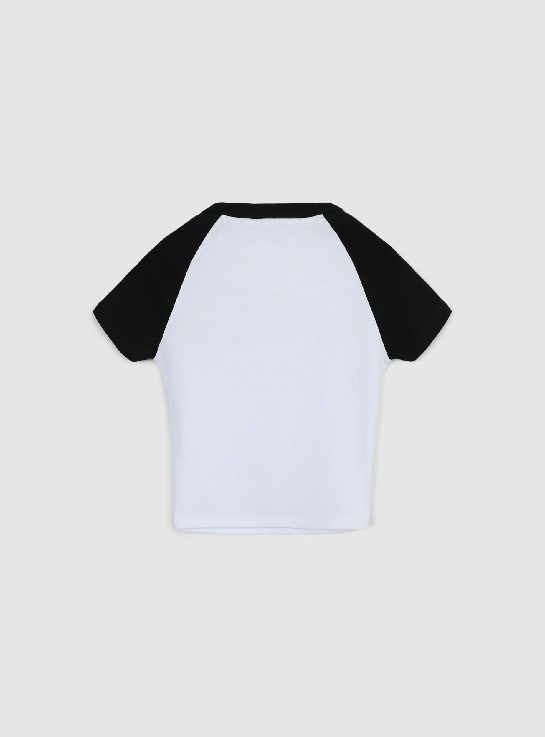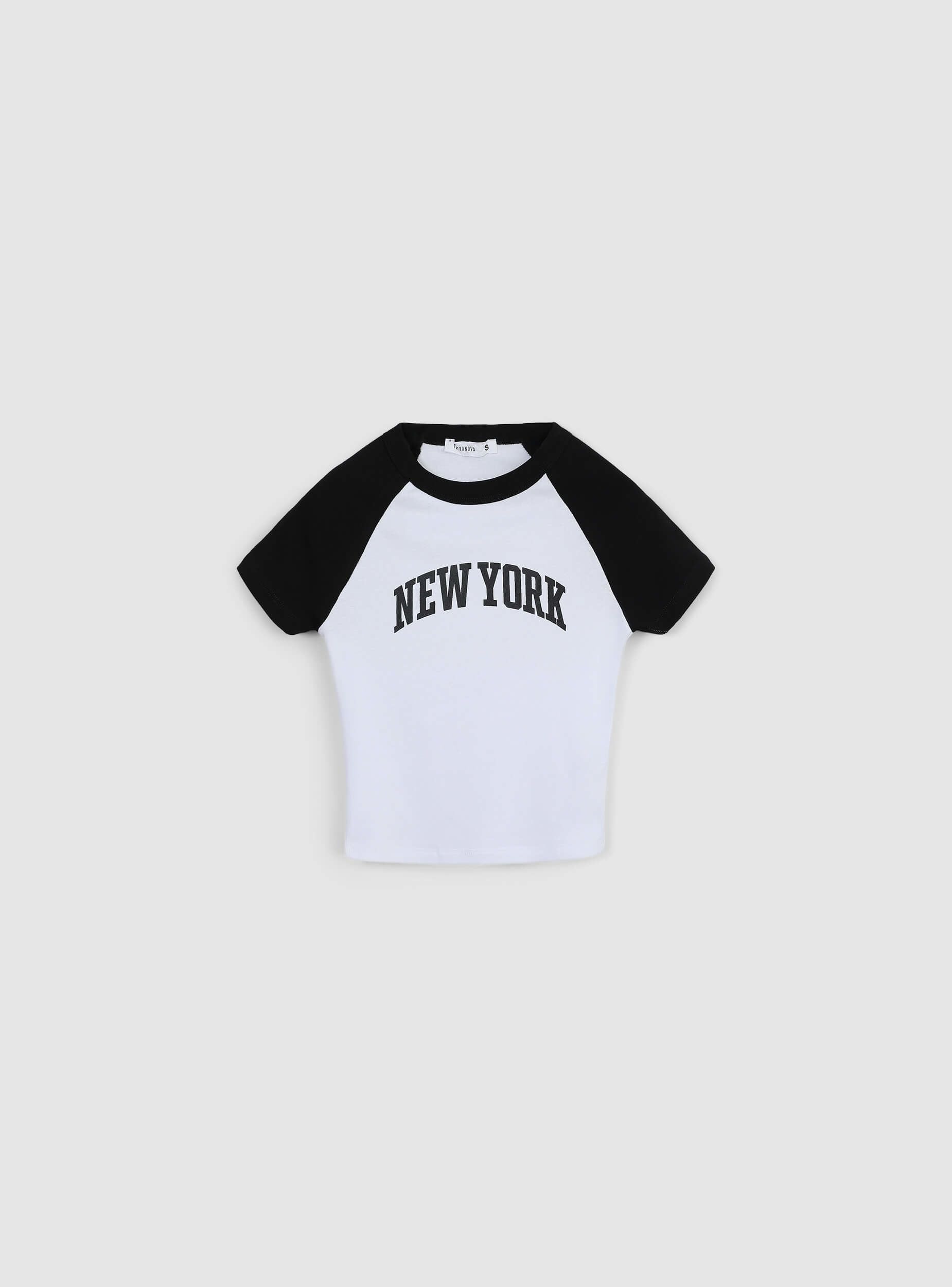 Maglietta da donna crop dallo stile sportivo, caratterizzata da maniche corte raglan che conferiscono un look dinamico e moderno. Il girocollo aggiunge un tocco essenziale, mentre la stampa college sul fronte, con la scritta "New York", dona un'aria giovanile e casual. Il taglio crop rende questo capo perfetto per abbinamenti alla moda, offrendo un'interpretazione fresca e di tendenza dell'abbigliamento ispirato al mondo universitario.Dettagli