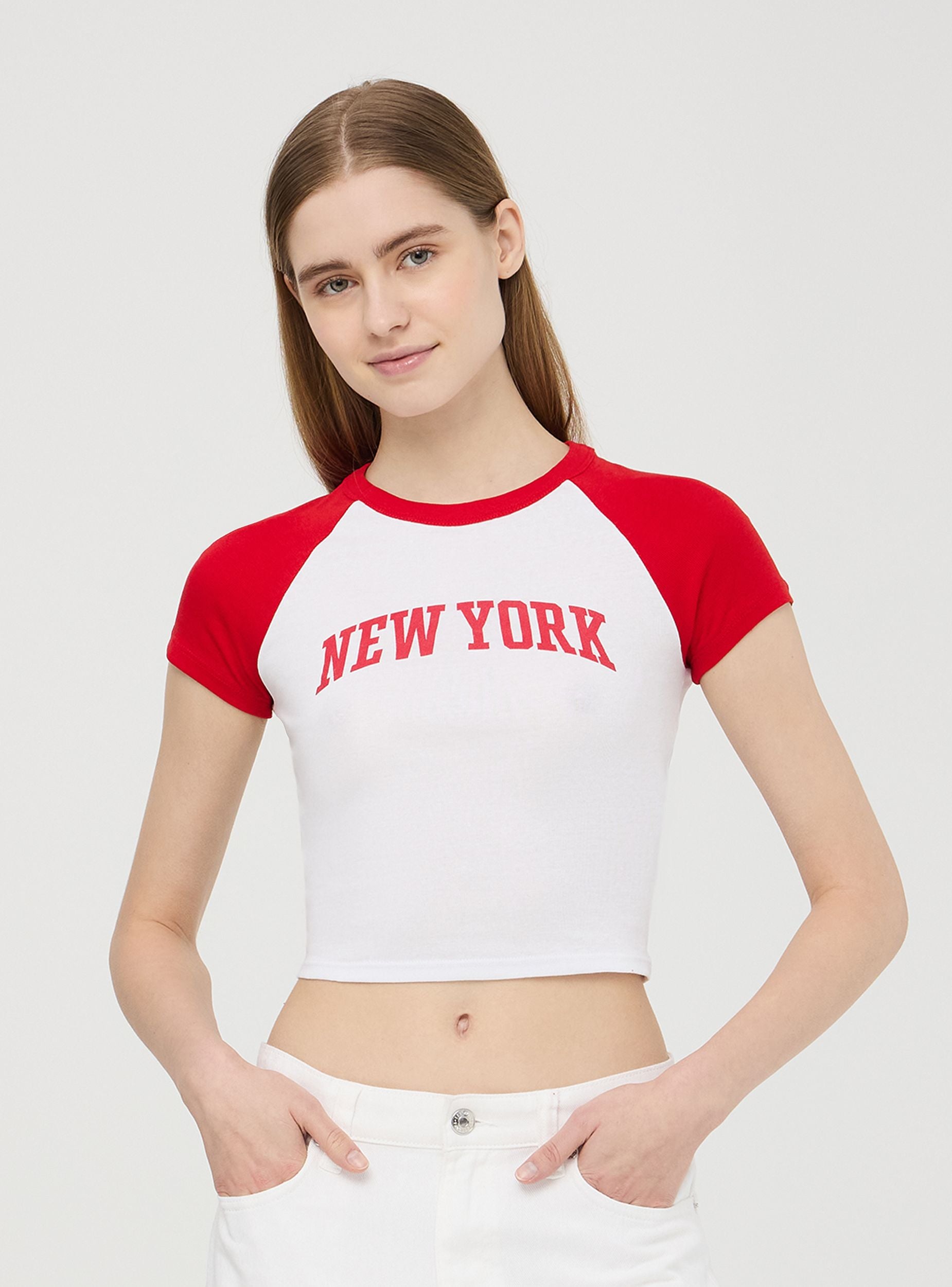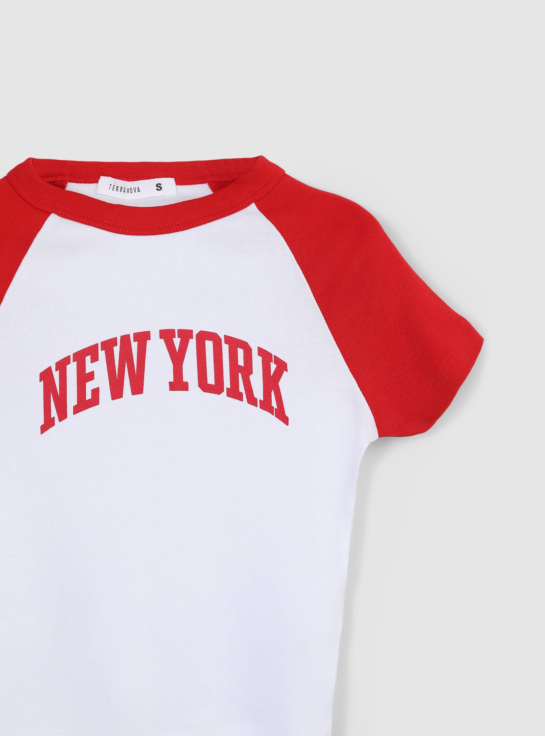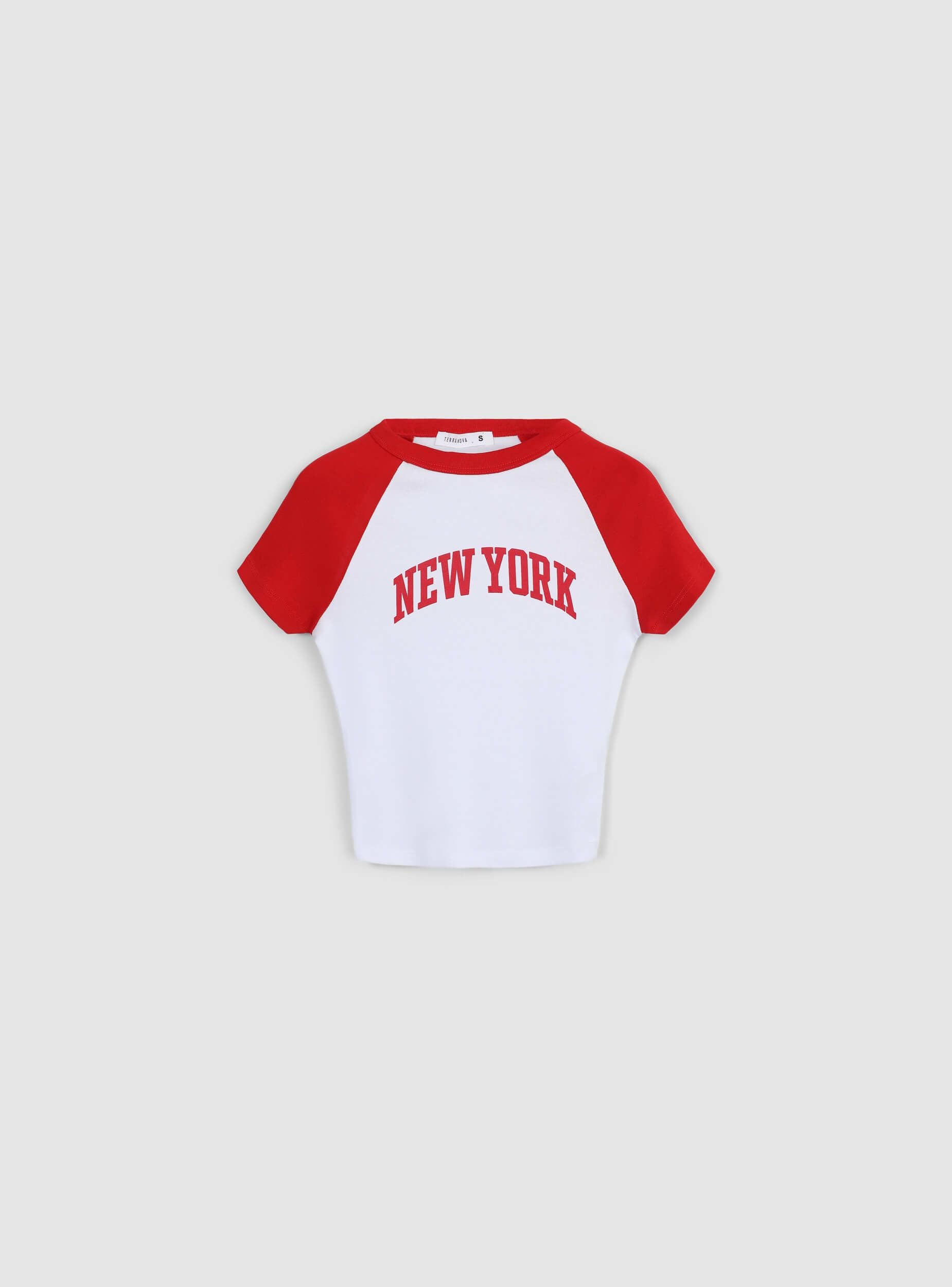 Maglietta da donna crop dallo stile sportivo, caratterizzata da maniche corte raglan che conferiscono un look dinamico e moderno. Il girocollo aggiunge un tocco essenziale, mentre la stampa college sul fronte, con la scritta "New York", dona un'aria giovanile e casual. Il taglio crop rende questo capo perfetto per abbinamenti alla moda, offrendo un'interpretazione fresca e di tendenza dell'abbigliamento ispirato al mondo universitario.Dettagli