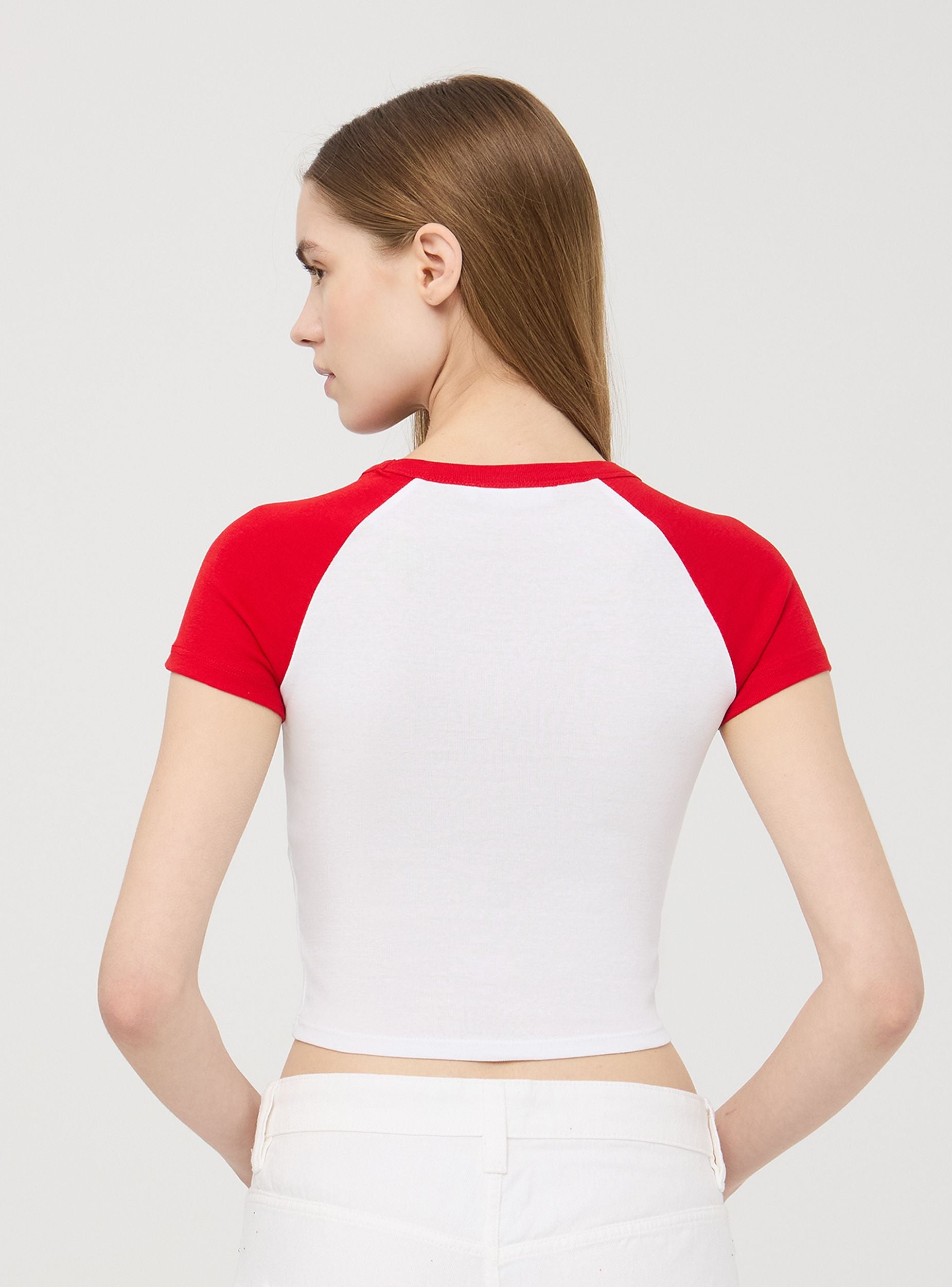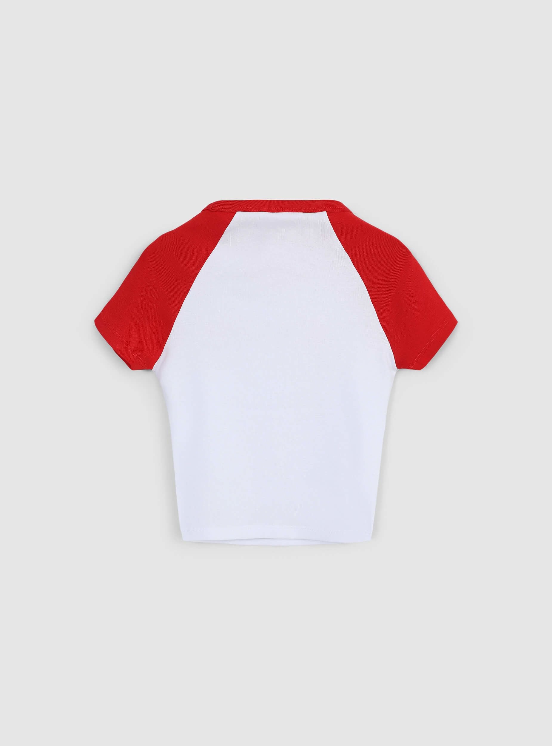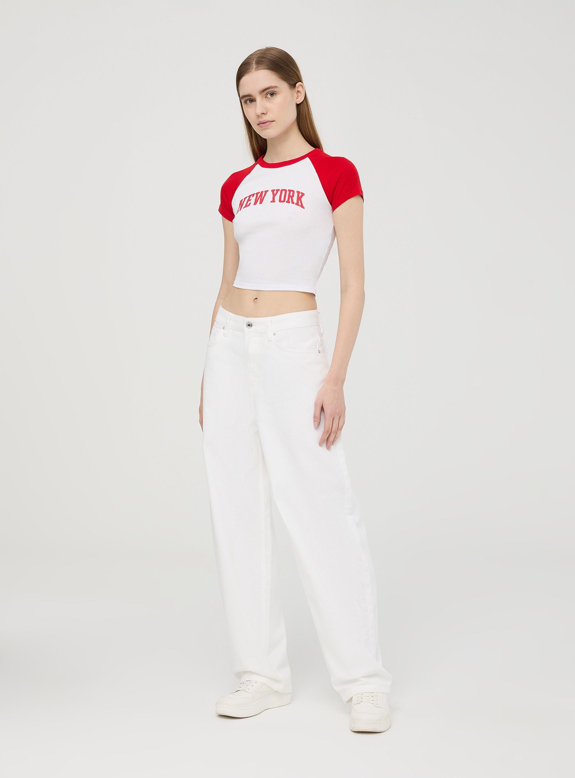 Maglietta da donna crop dallo stile sportivo, caratterizzata da maniche corte raglan che conferiscono un look dinamico e moderno. Il girocollo aggiunge un tocco essenziale, mentre la stampa college sul fronte, con la scritta "New York", dona un'aria giovanile e casual. Il taglio crop rende questo capo perfetto per abbinamenti alla moda, offrendo un'interpretazione fresca e di tendenza dell'abbigliamento ispirato al mondo universitario.Dettagli