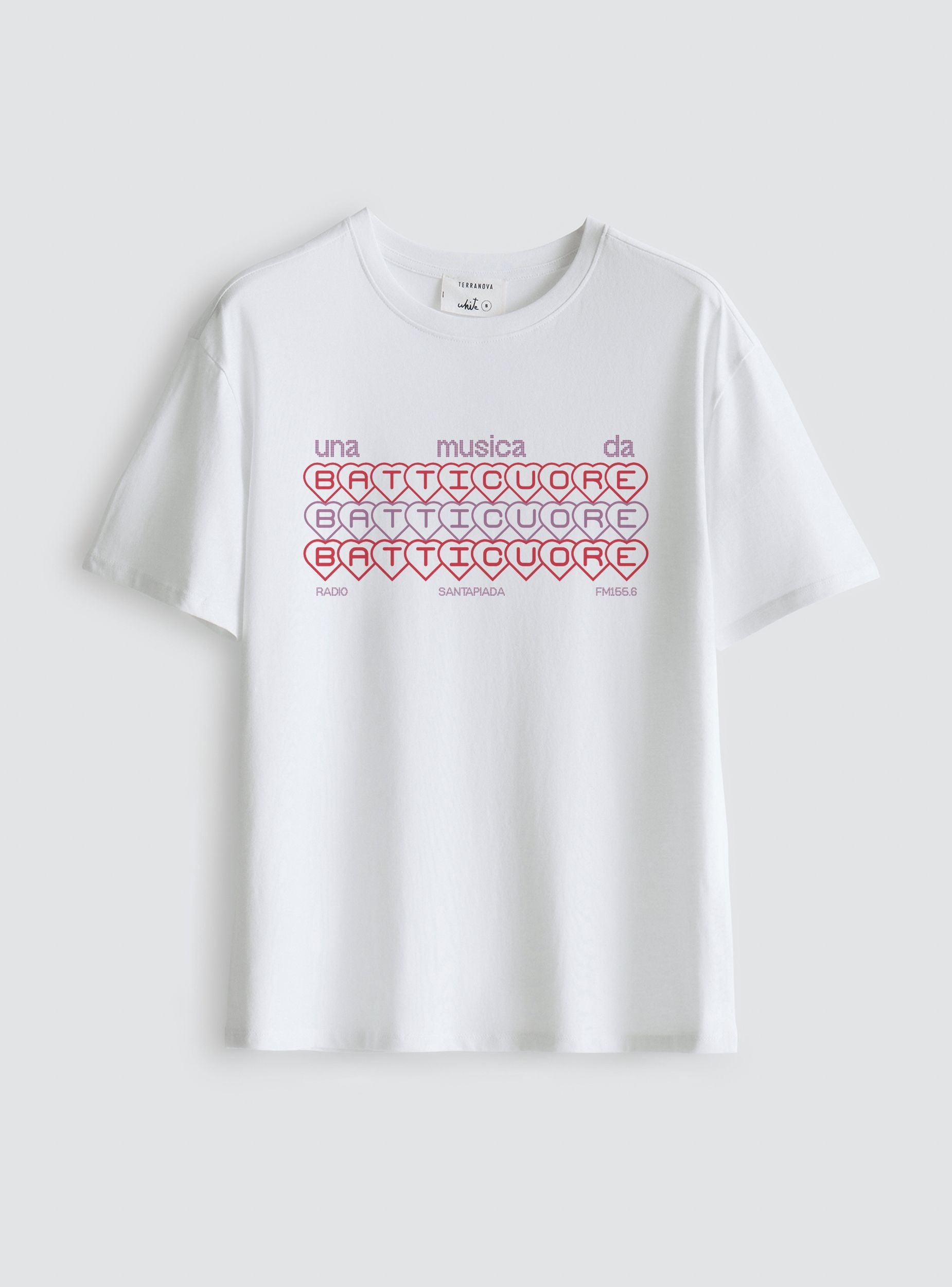 Maglietta da donna a maniche corte con girocollo e stampa frontale a tema musicale. Il motivo “Batticuore” ripetuto su tre righe con grafica a cuore richiama l’energia della musica estiva e la vibrazione delle emozioni. Perfetta da indossare nei momenti di svago, per look casual dal mood pop e divertente.Dettagli