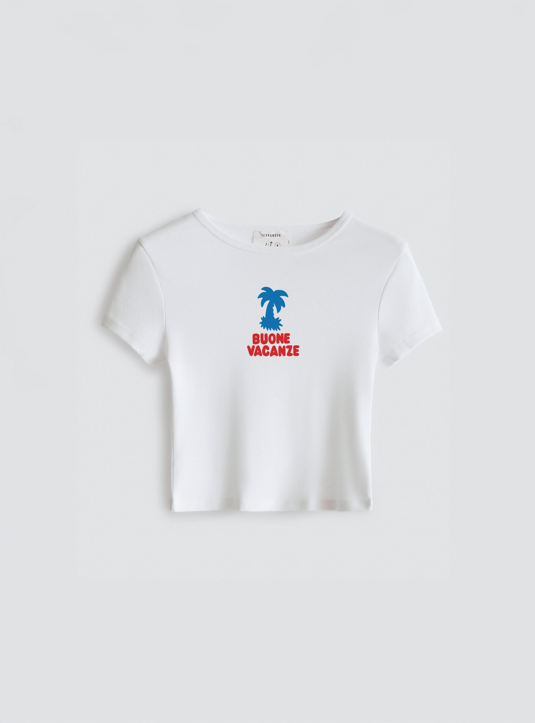Maglietta da donna crop con maniche corte e girocollo, perfetta per accompagnare look freschi e spensierati. La stampa frontale con palma e scritta “Buone vacanze” aggiunge un tocco ironico e vacanziero. Da abbinare a shorts in denim o gonne leggere per outfit da spiaggia o tempo libero.Dettagli