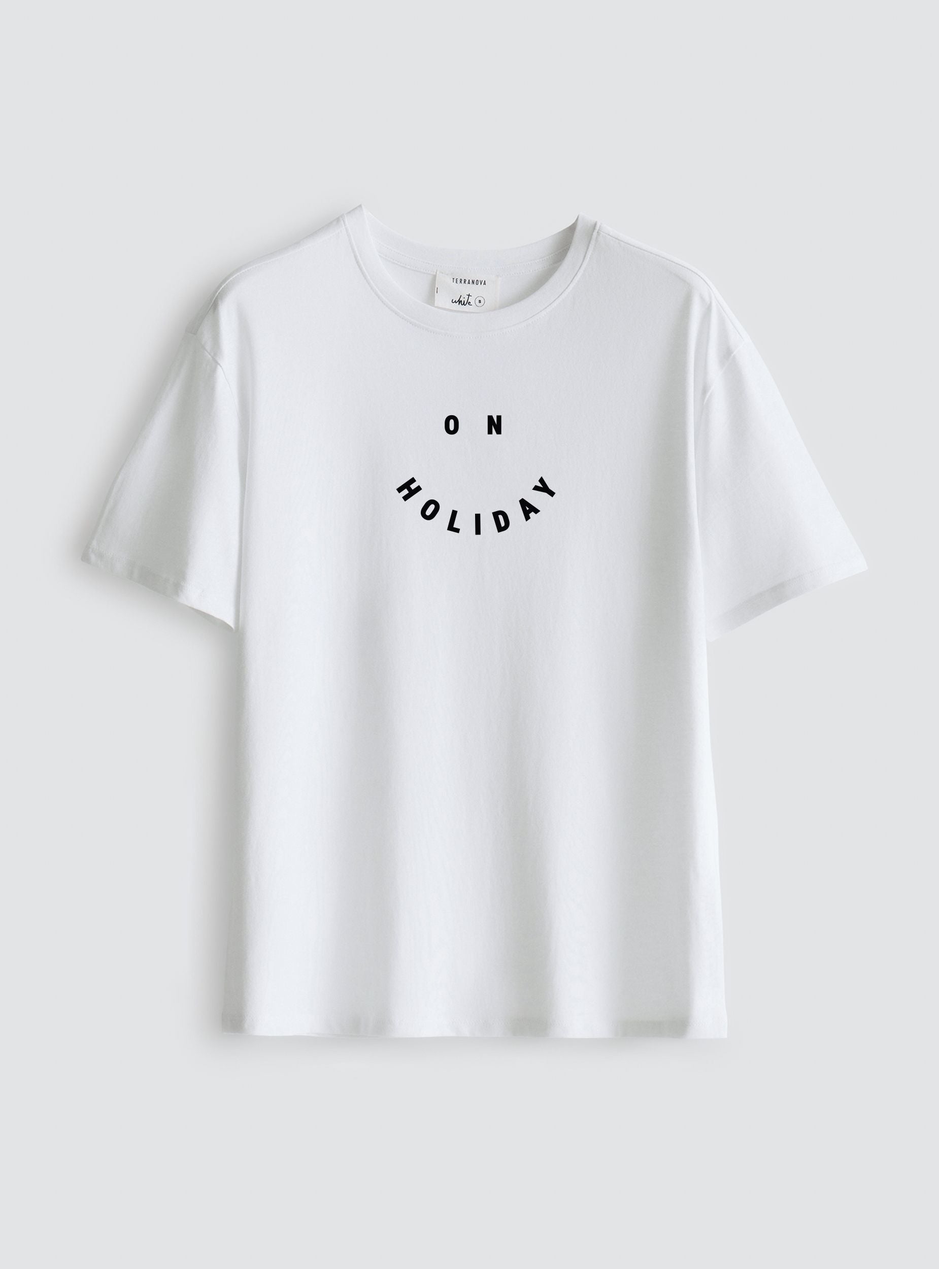 Maglietta da donna a maniche corte con girocollo e stampa "On Holiday" dal design minimal. Perfetta per outfit da tempo libero, vacanze e giornate all’aria aperta. Si abbina facilmente a shorts, jeans o gonne per un look fresco e spensierato dallo stile rilassato.Dettagli