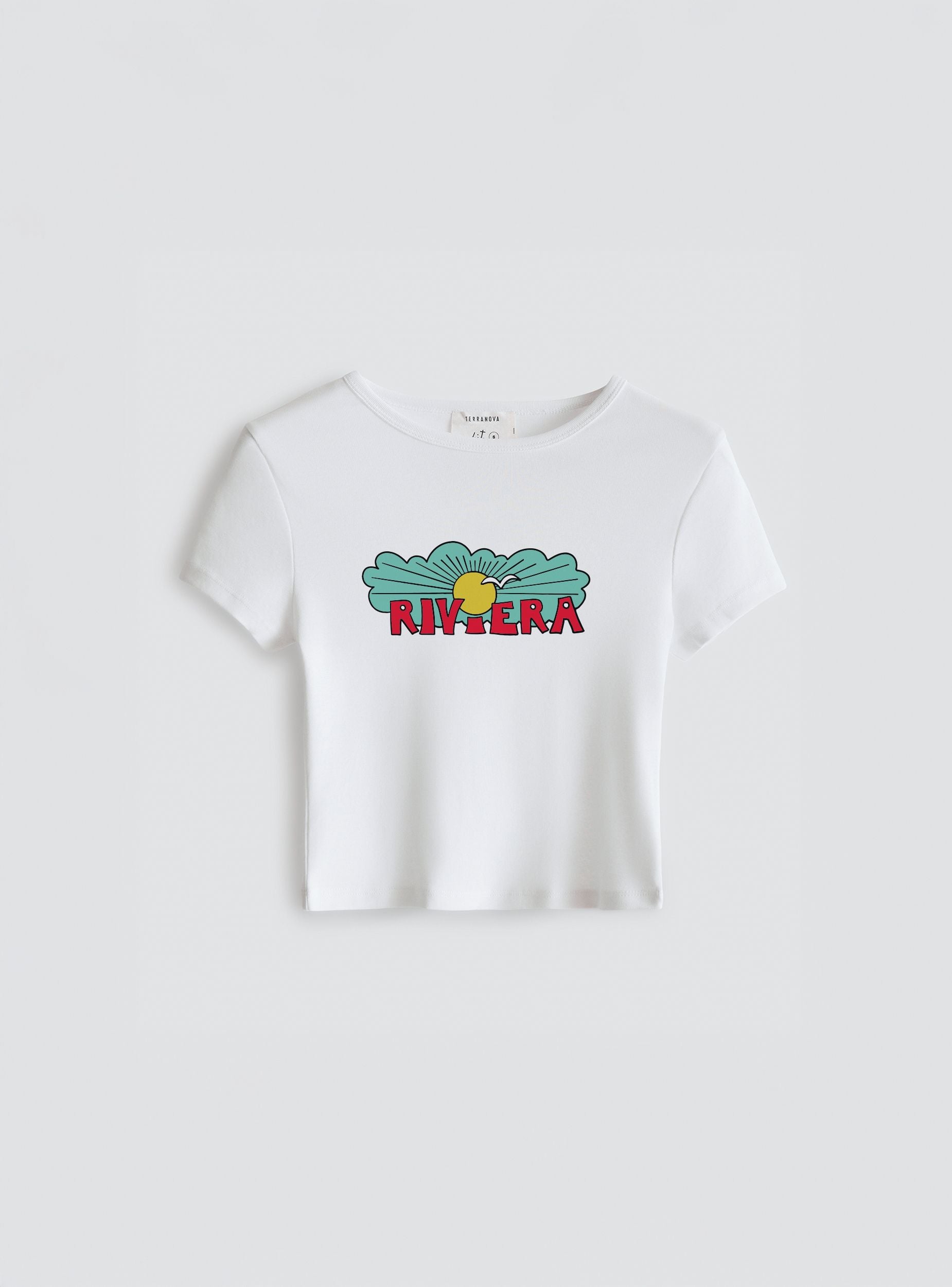 Maglietta da donna crop con maniche corte e girocollo, perfetta per look rilassati e dal sapore estivo. La stampa frontale con scritta “Riviera” e illustrazione stilizzata richiama l’atmosfera solare delle vacanze italiane. Ideale con shorts in denim o pantaloni ampi per un outfit da spiaggia o aperitivo.Dettagli