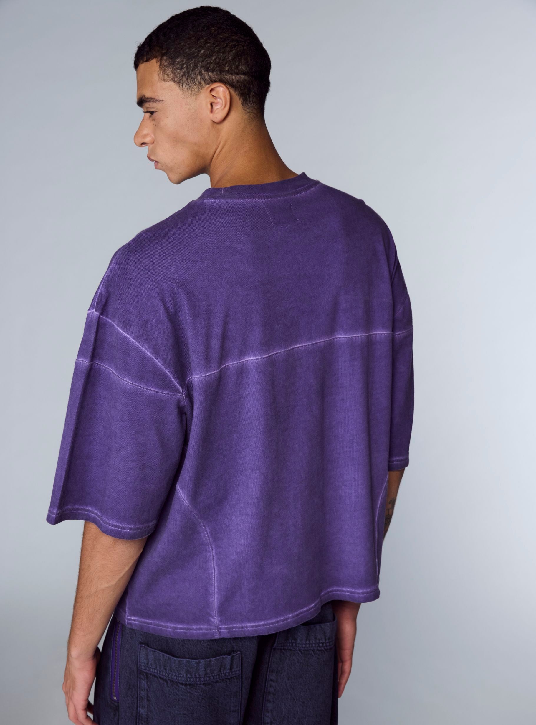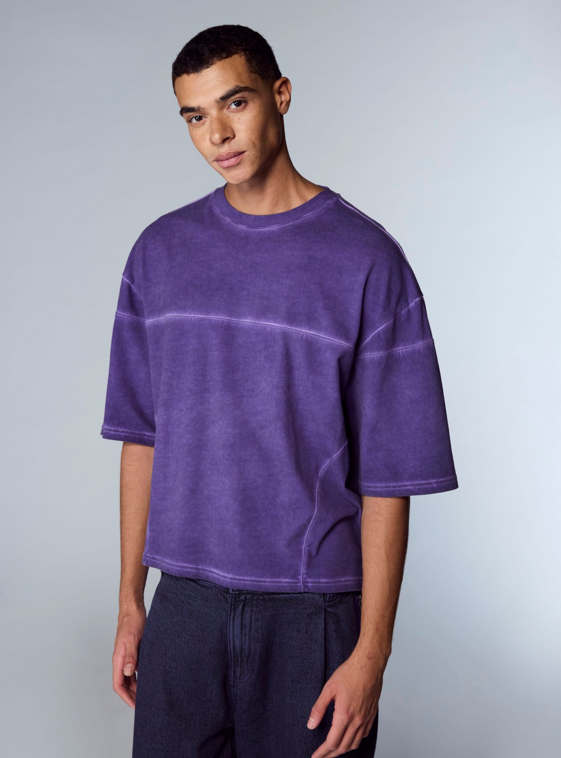 Maglietta da uomo a maniche corte con girocollo, caratterizzata da lavaggio acid wash in tinta unita e cuciture a vista che creano un effetto grafico. Vestibilità comoda e taglio over, ideale per look urbani con jeans o pantaloni cargo. Si indossa con facilità sotto giacche leggere o felpe, perfetta per il tempo libero e le uscite in città. Questo articolo fa parte del progetto TRNPOPLAB nato dalla collaborazione con NABA Milano. Gli studenti di fashion design hanno dato vita a collezioni ispirate ai trend più cool del momento. E ora vedranno le loro creazioni prendere vita e arrivare direttamente nelle tue mani!Dettagli